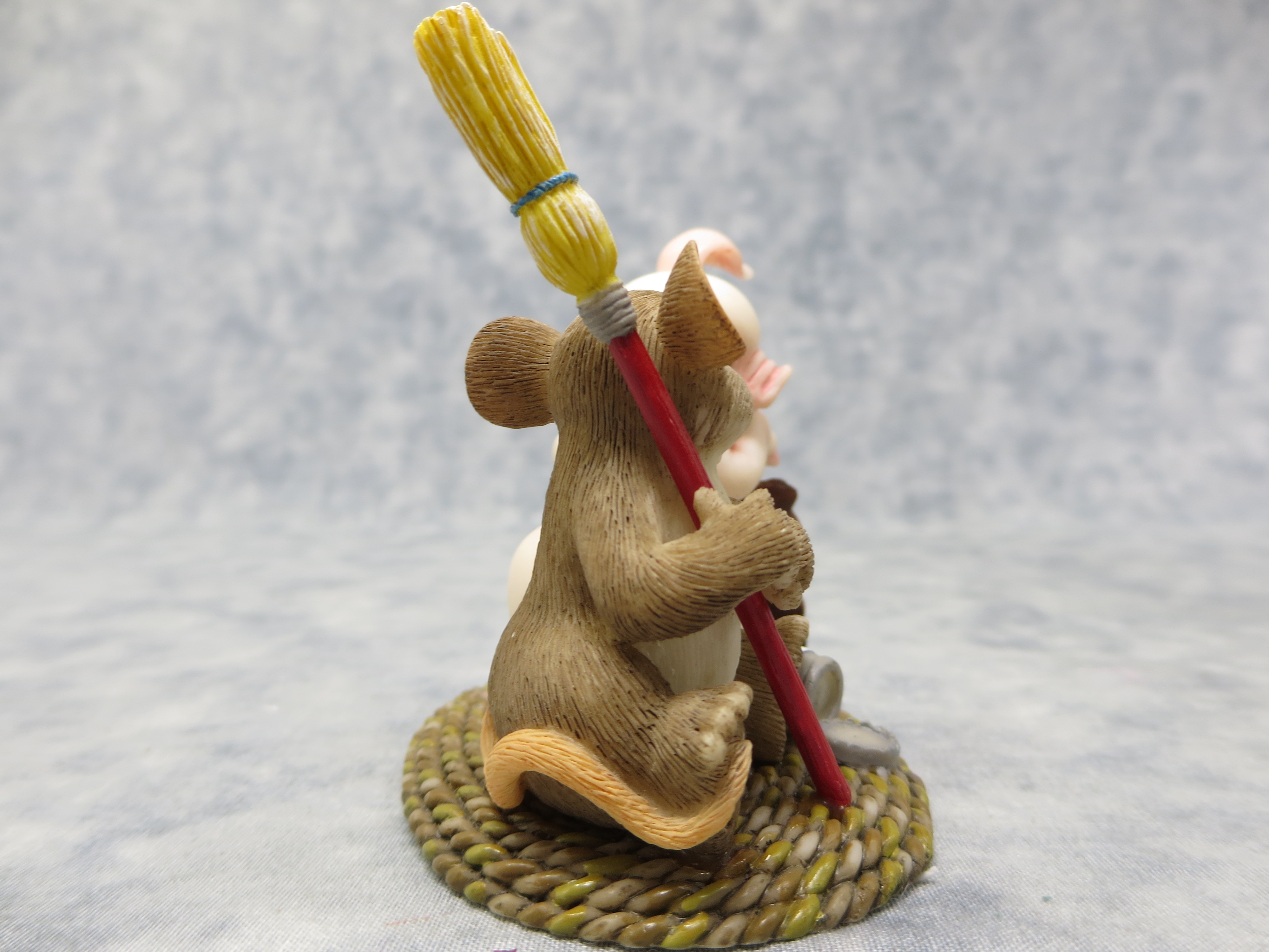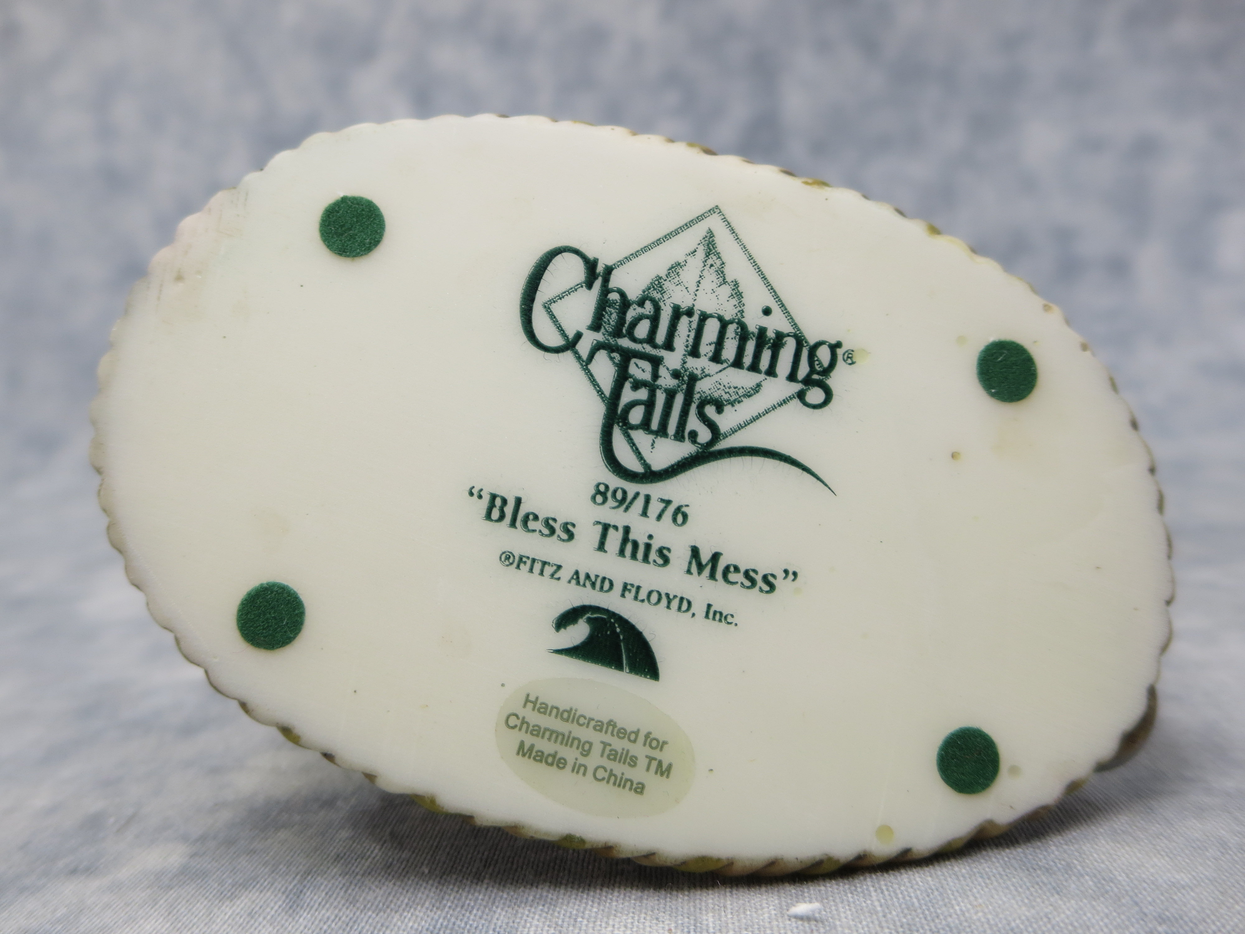 October 28, 2025 - Charming Tails Collection. 'Bless This Mess' Figurine, 3-1/2 inches wide by 3 inches tall. Sculpted in resin. Designed by Dean Griff. Produced by Fitz and Floyd (now produced by Enesco).