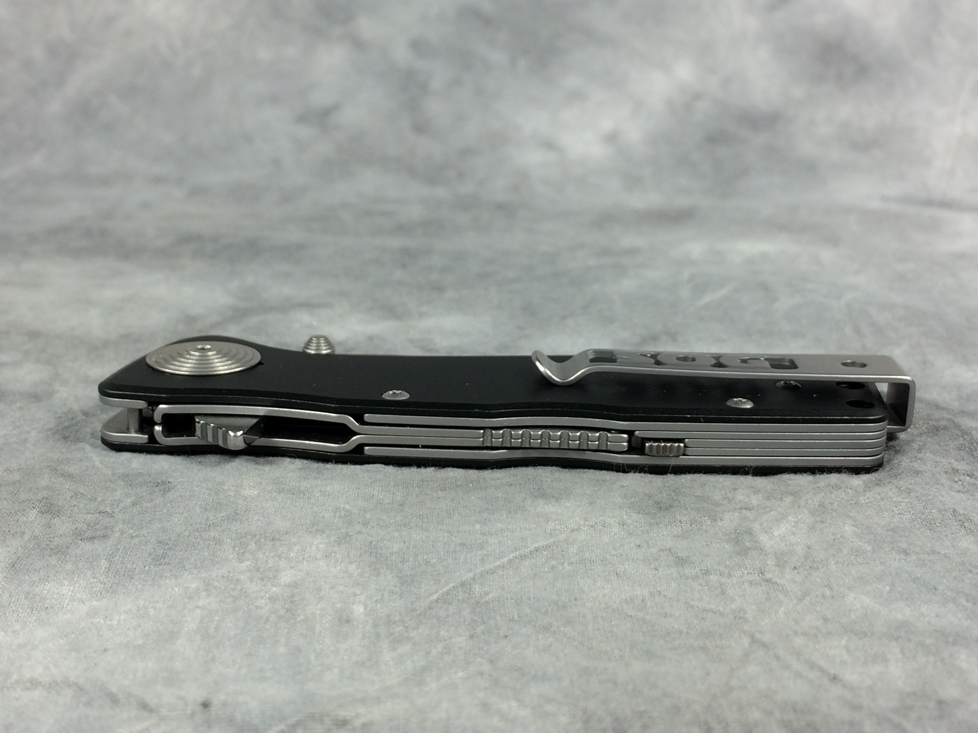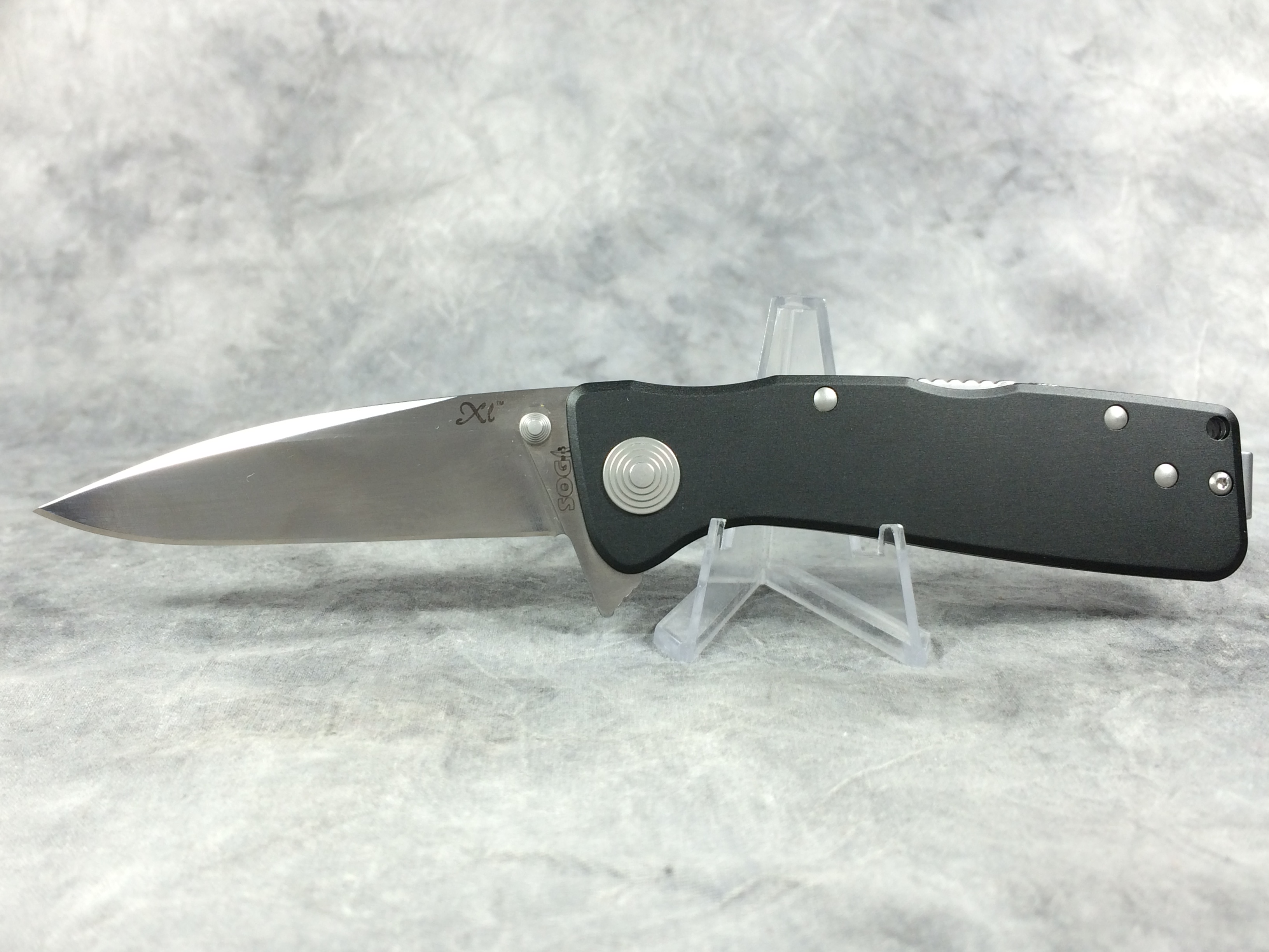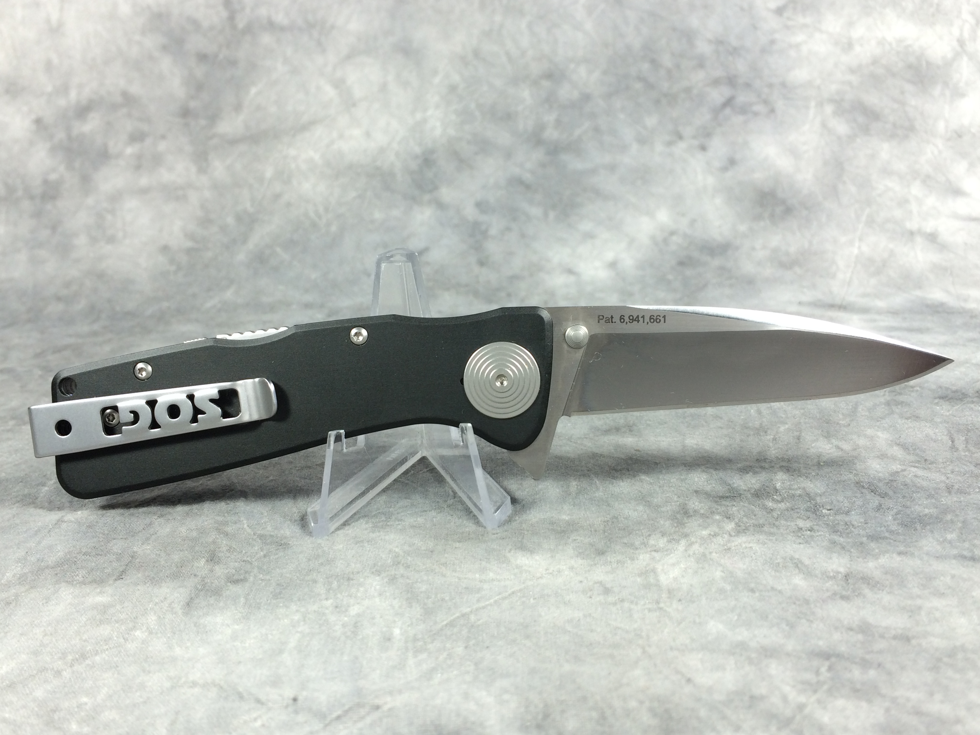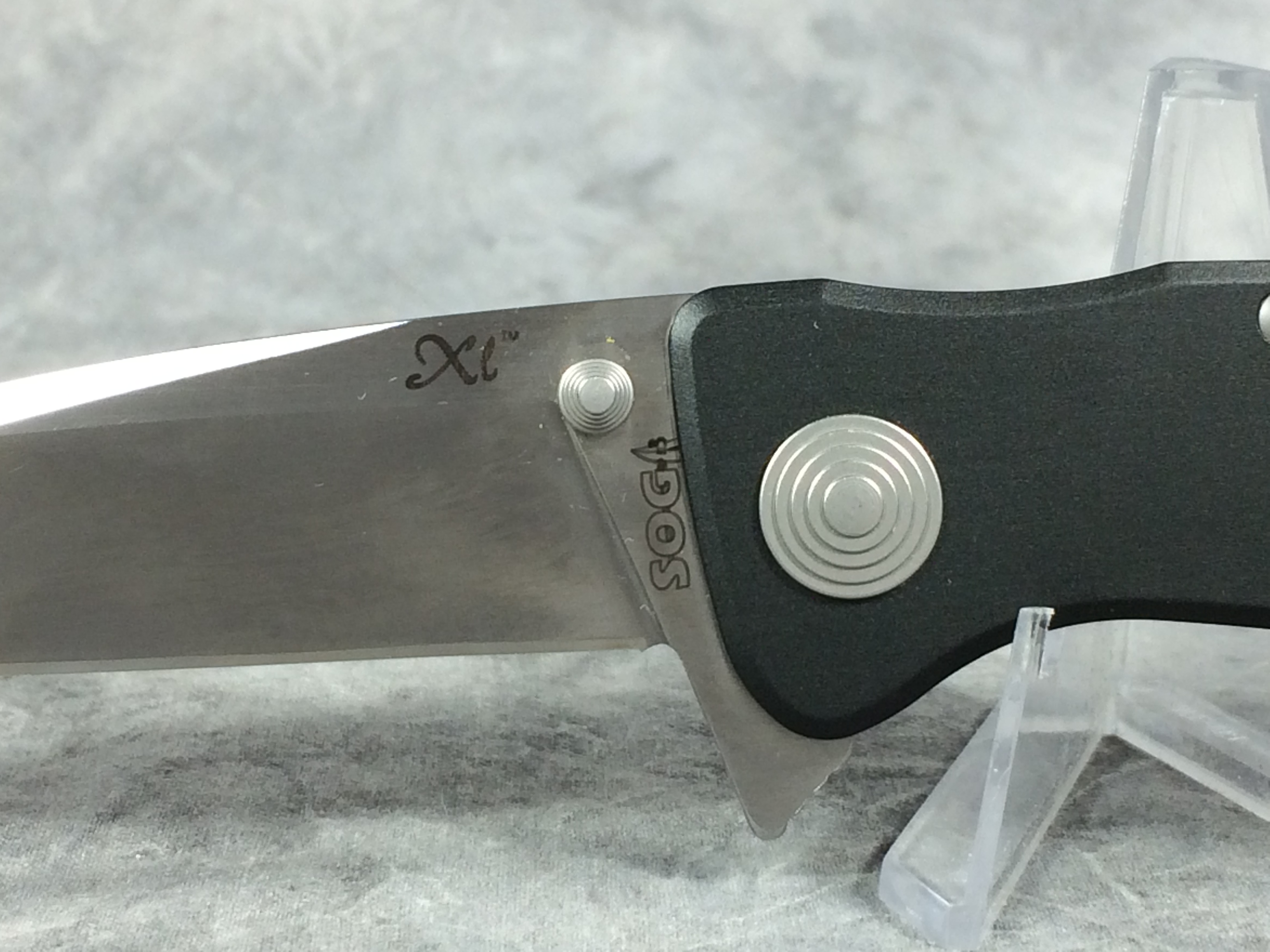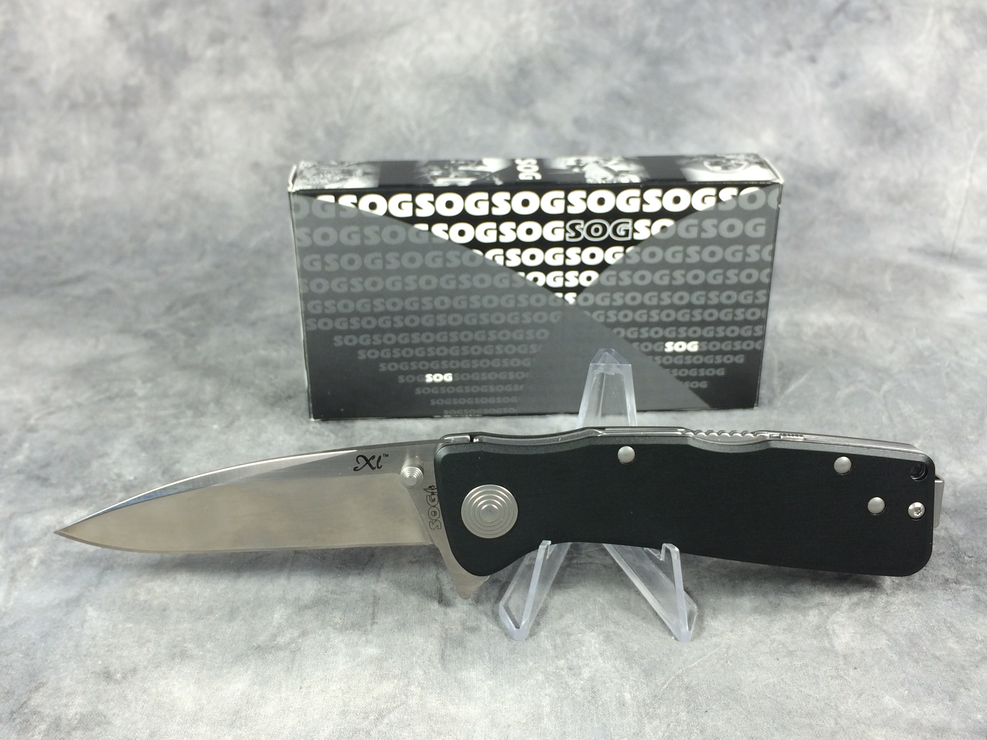 December 24, 2025 - 4-3/8 inches closed. 7-1/2 inches open. Made in USA. AUS 8 Stainless Steel straight edge blade etched "XL" and "Pat. 6,941,661". Features SOG Assisted Technology (S.A.T.) for easy opening. Black graphite anodized handles. With dual thumb studs, pocket clip, and safety lock. Includes original box and paperwork.