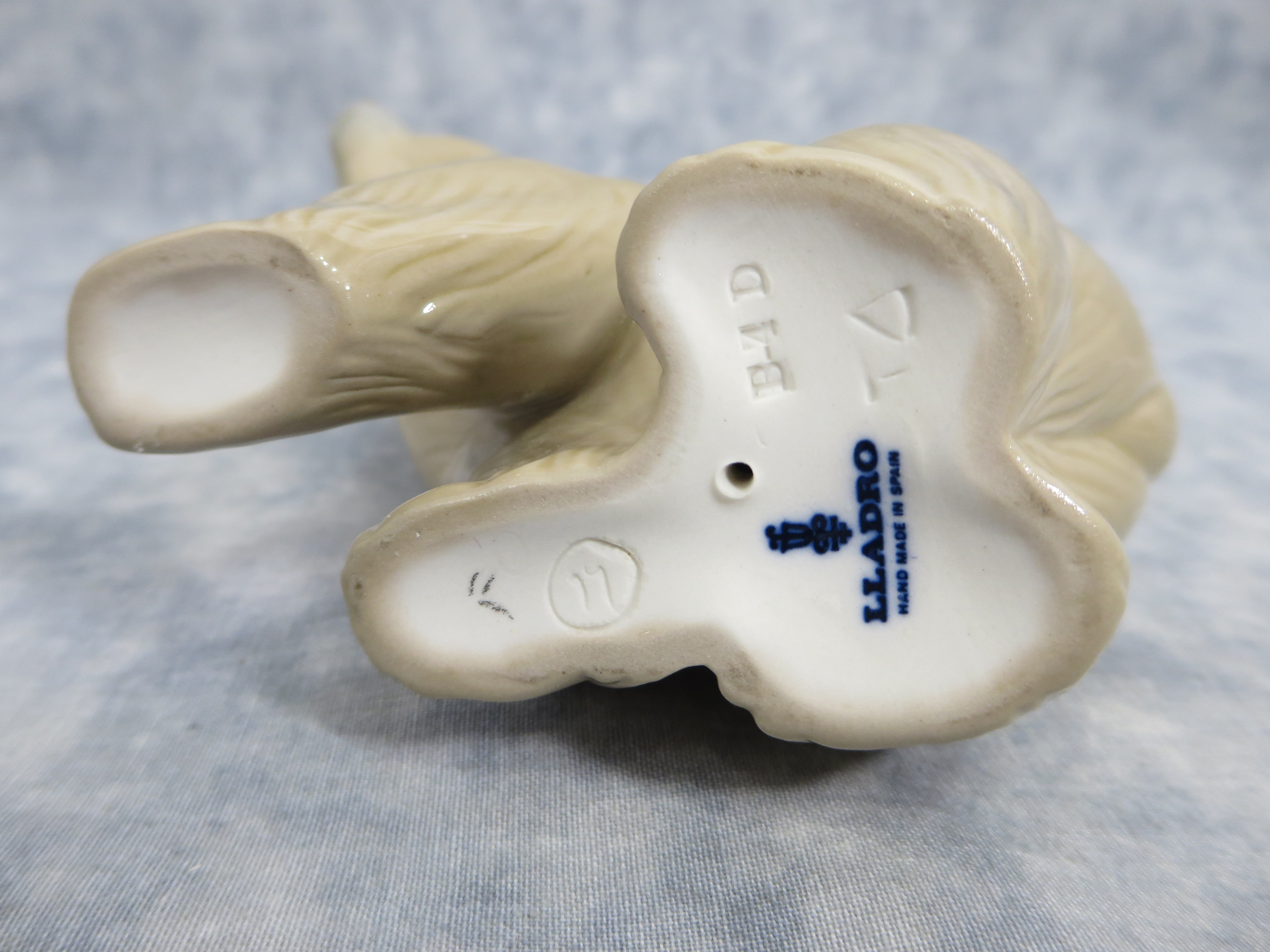 October 28, 2025 - Hand made in Spain. 3-3/4 inches tall. 2-1/2 inches wide. 5 inches deep. Base is fully marked with the Lladro chemical symbol and stylized campanillo in blue on bottom of base.