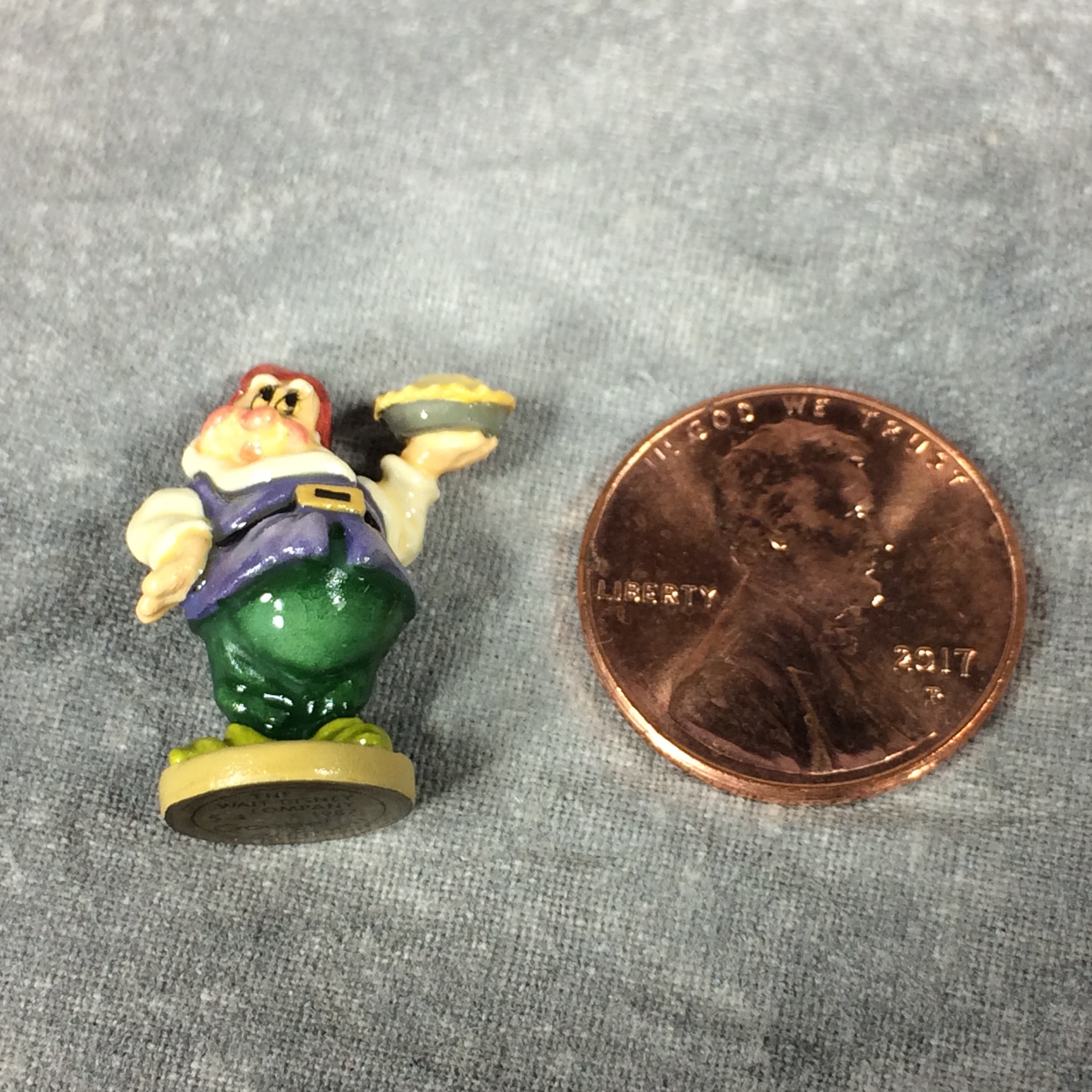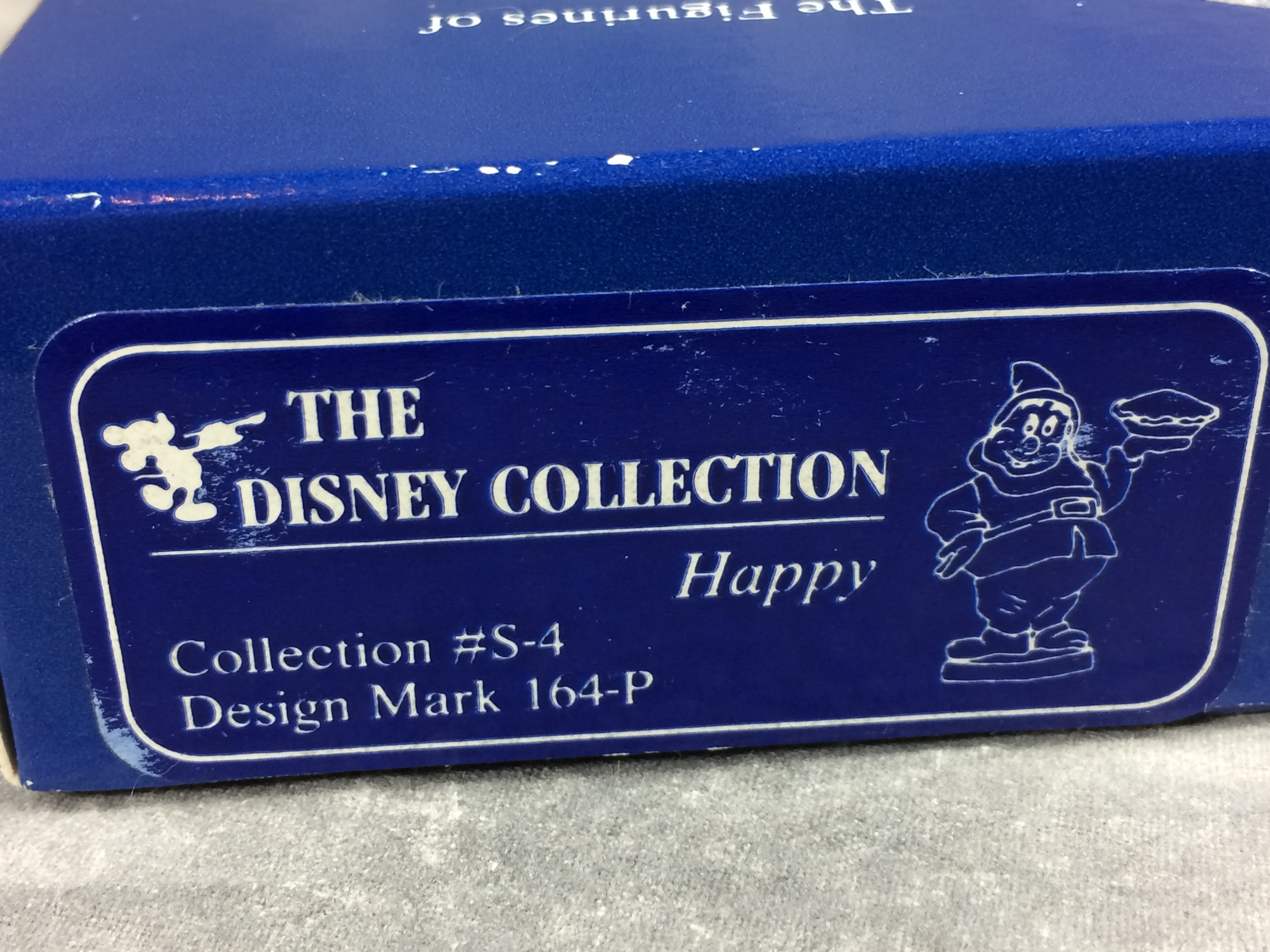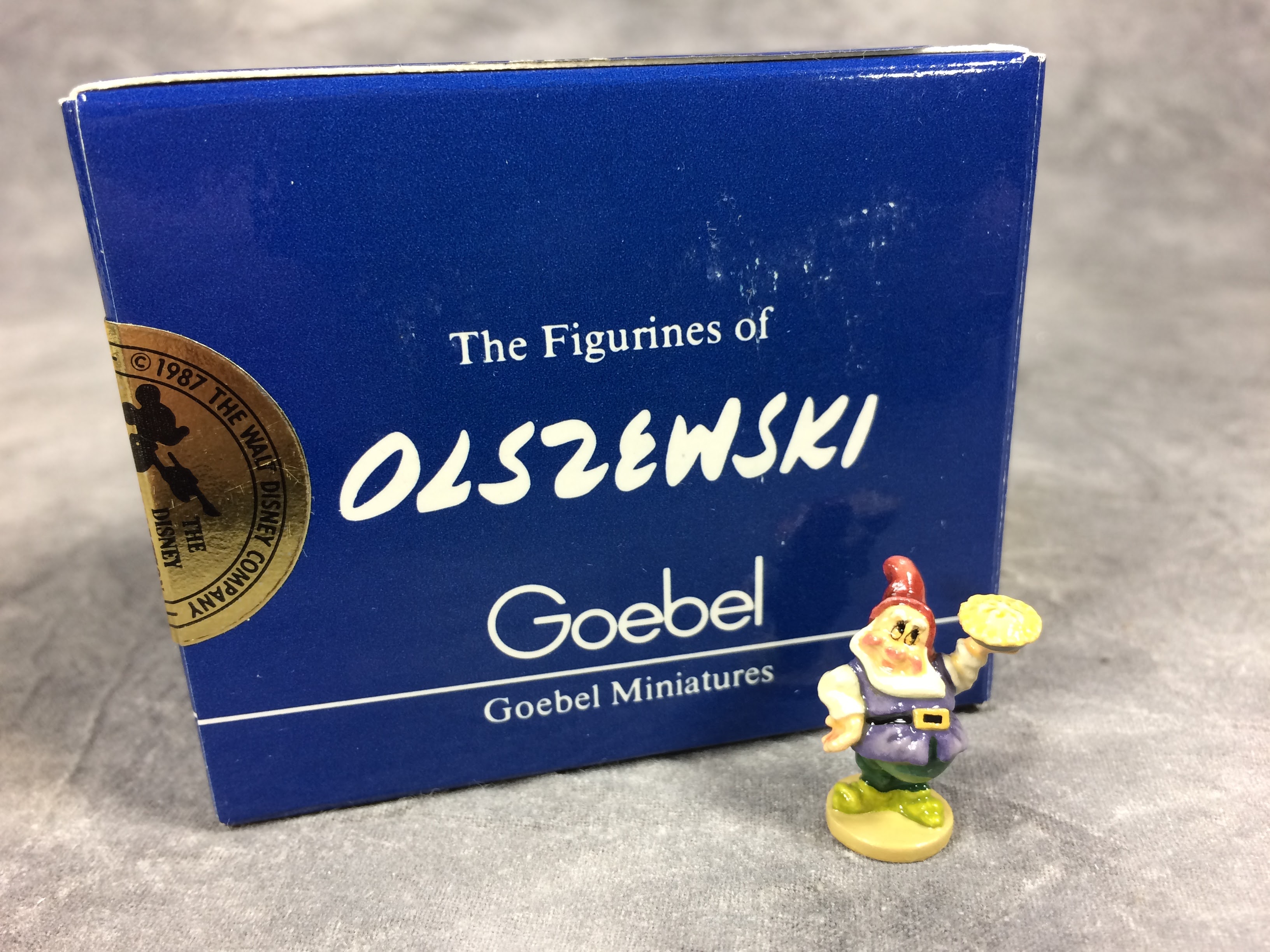 February 03, 2026 - 7/8 inch bronze, hand-painted, miniature of Snow White & The Seven Dwarfs' HAPPY. Base stamped: The Walt Disney Company / S-4 / c 1987 / Goebel / Olszewski. Includes original velveteen display box and paperboard box.