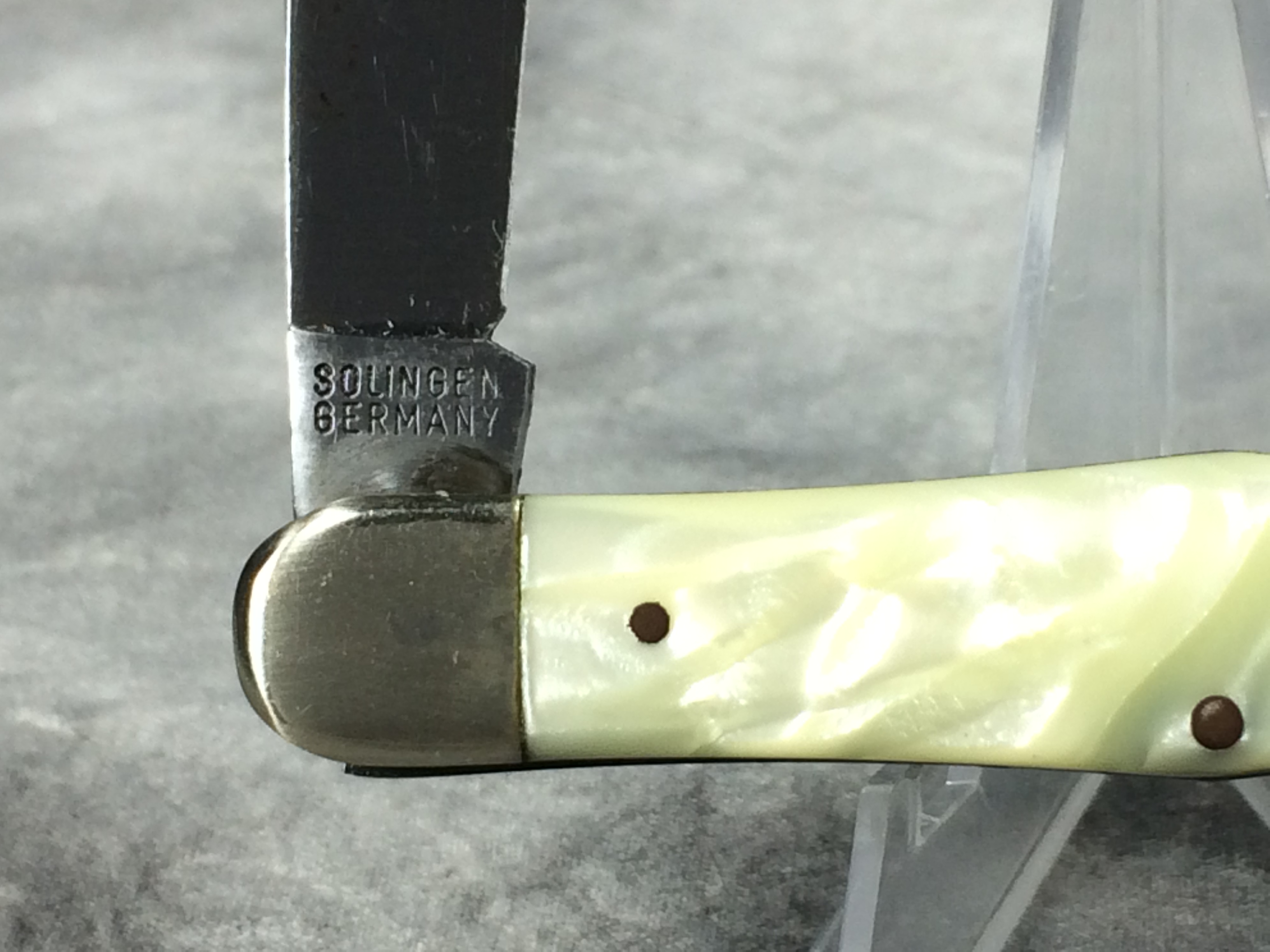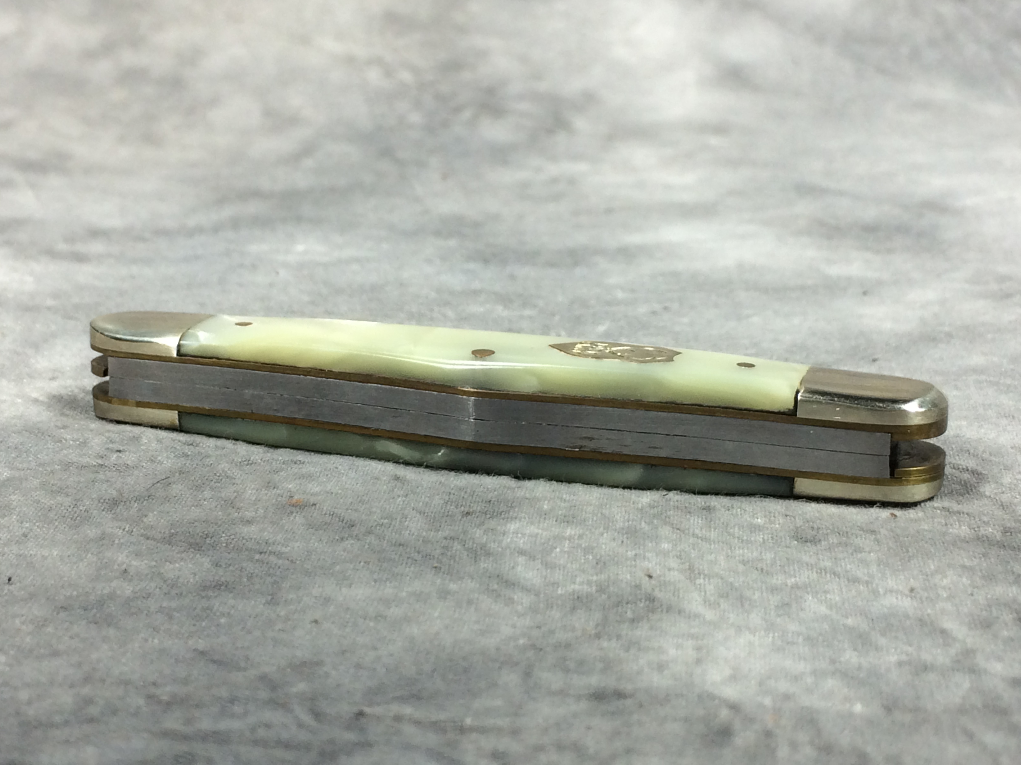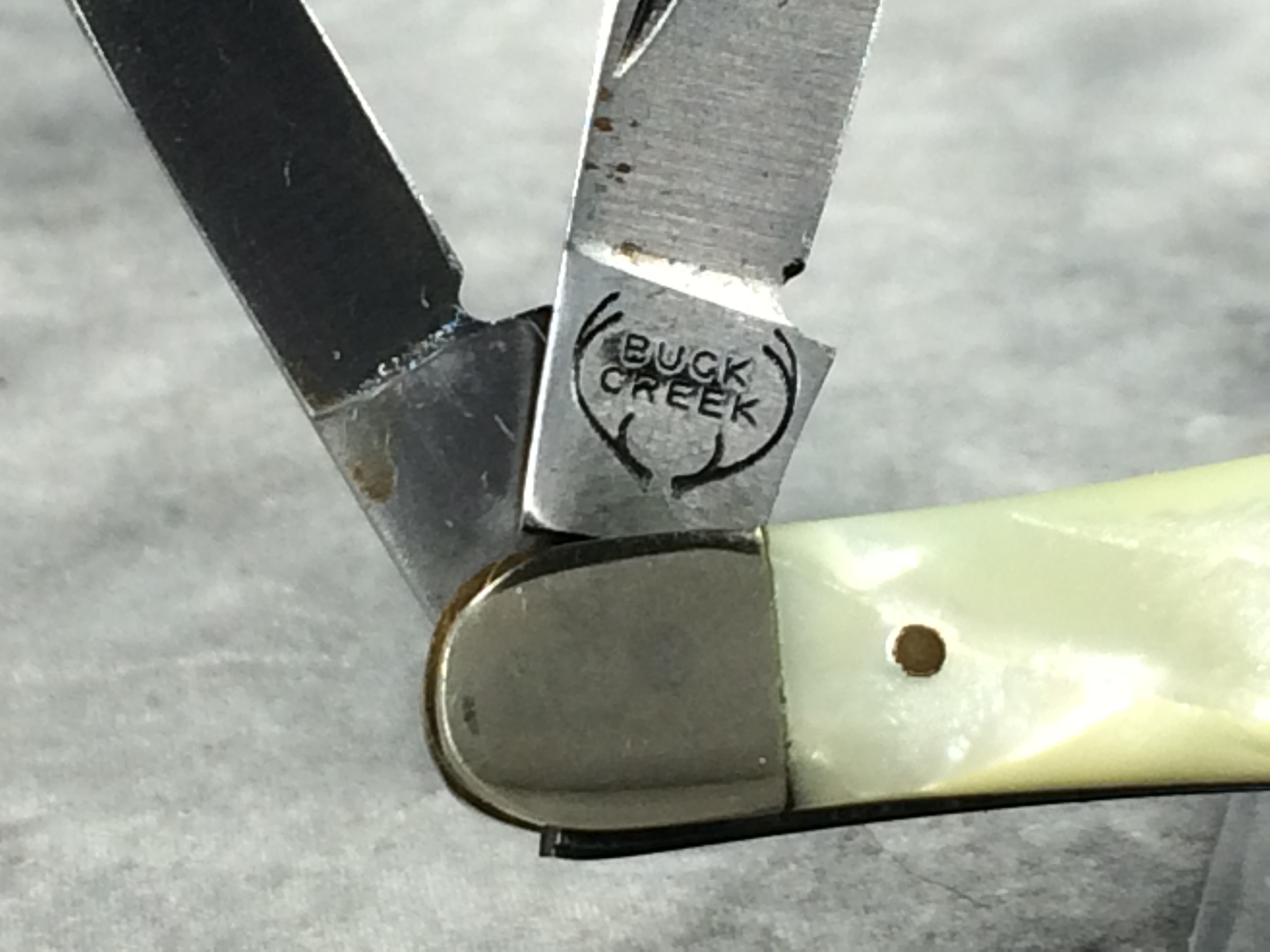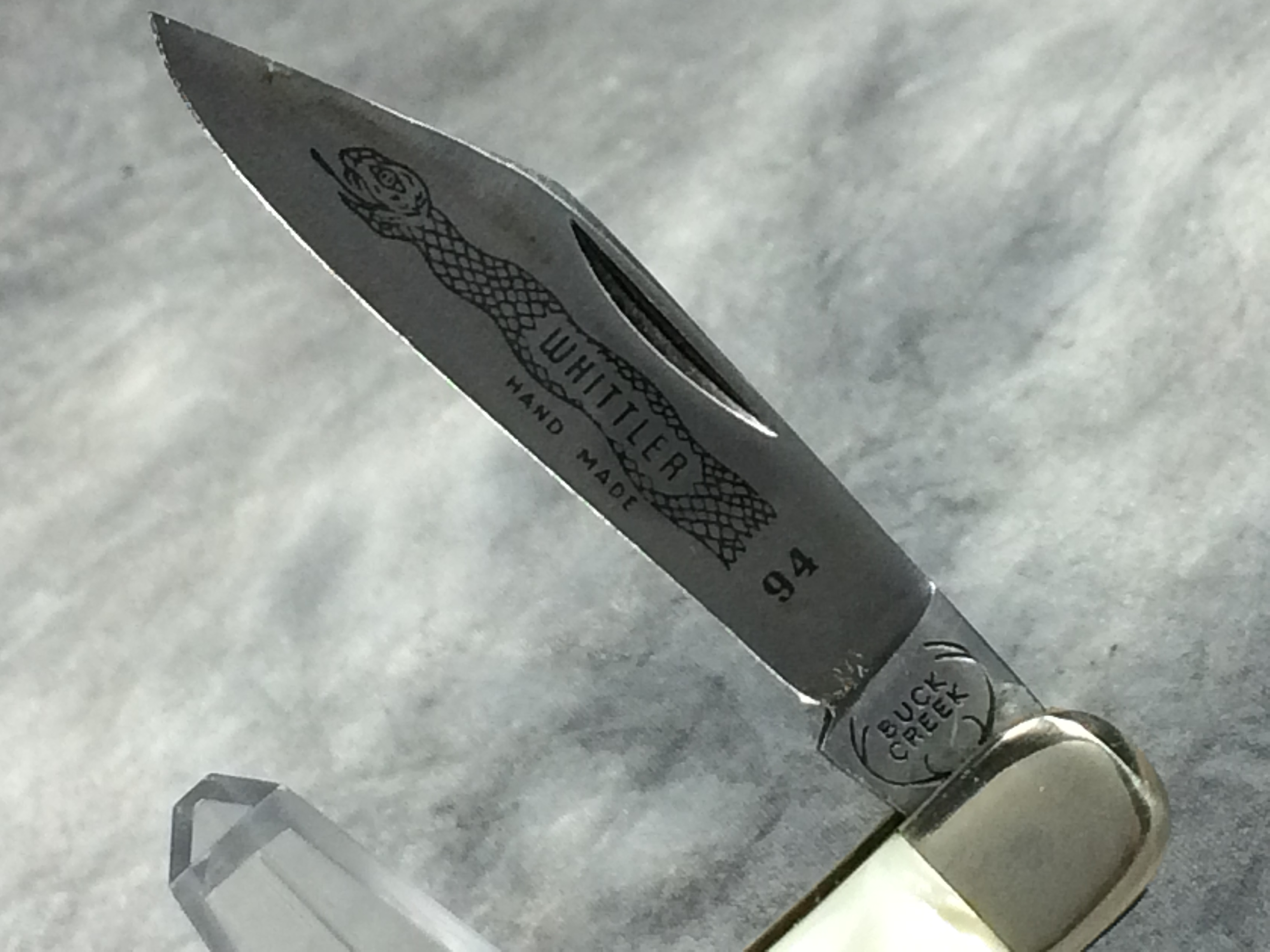 January 14, 2026 - 3-1/2 inches closed. 5-7/8 inches open. "BUCK CREEK" with Antler logo, "Stewart A. Taylor Co.", and "SOLINGEN GERMANY" tang stamps. Master blade etched "WHITTLER HAND MADE" and "94" with a snake image. Cream/tan "cracked ice" composition handle. "BUCK CREEK" badge shield. Nickel Silver bolsters. Brass liner.