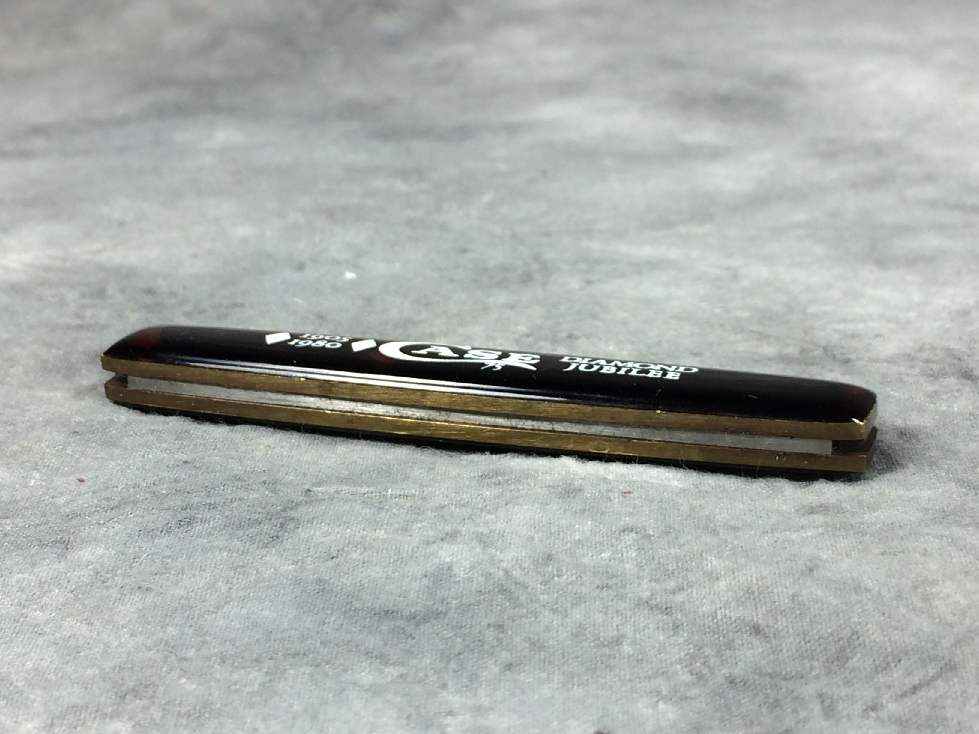 December 04, 2025 - 2-Blade Pen Knife made to commemorate the Case Anniversary Diamond Jubilee 1905-1980. 3-1/8 inches closed. 4-7/8 inches open. Made in USA. "CASE XX STAINLESS USA ** " (2 dot) tang stamp. Pen and spear blades. Imitation tortoise shell handle.