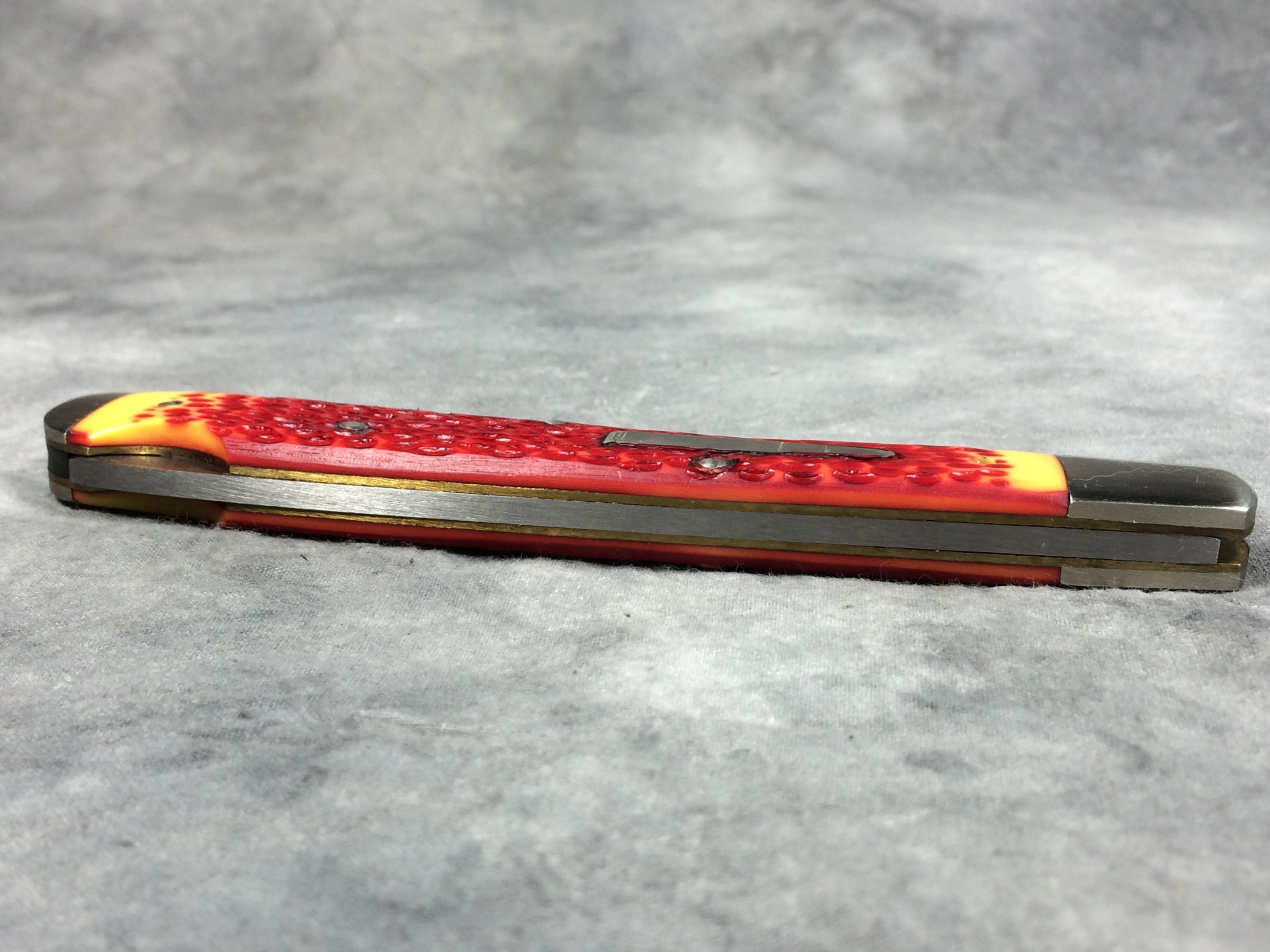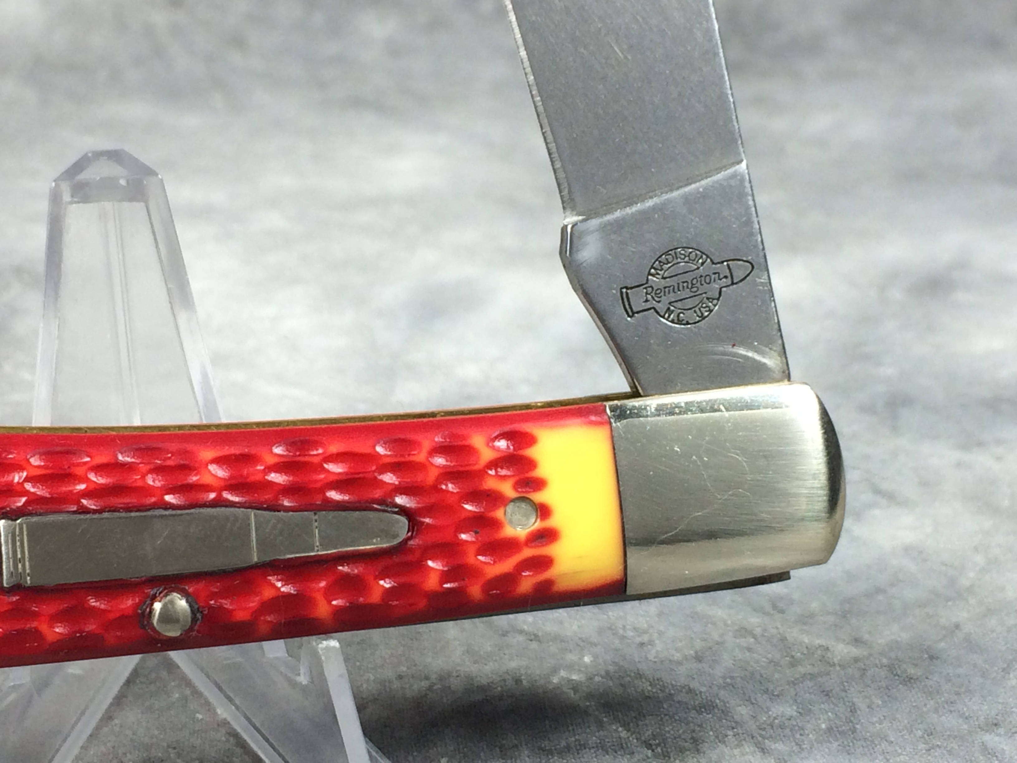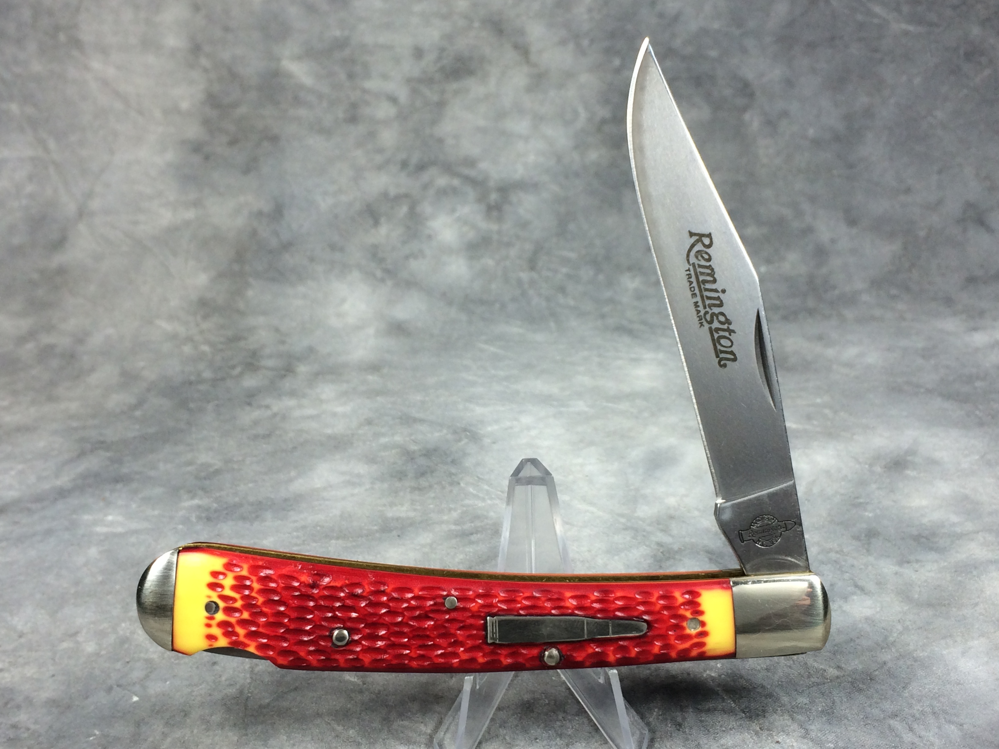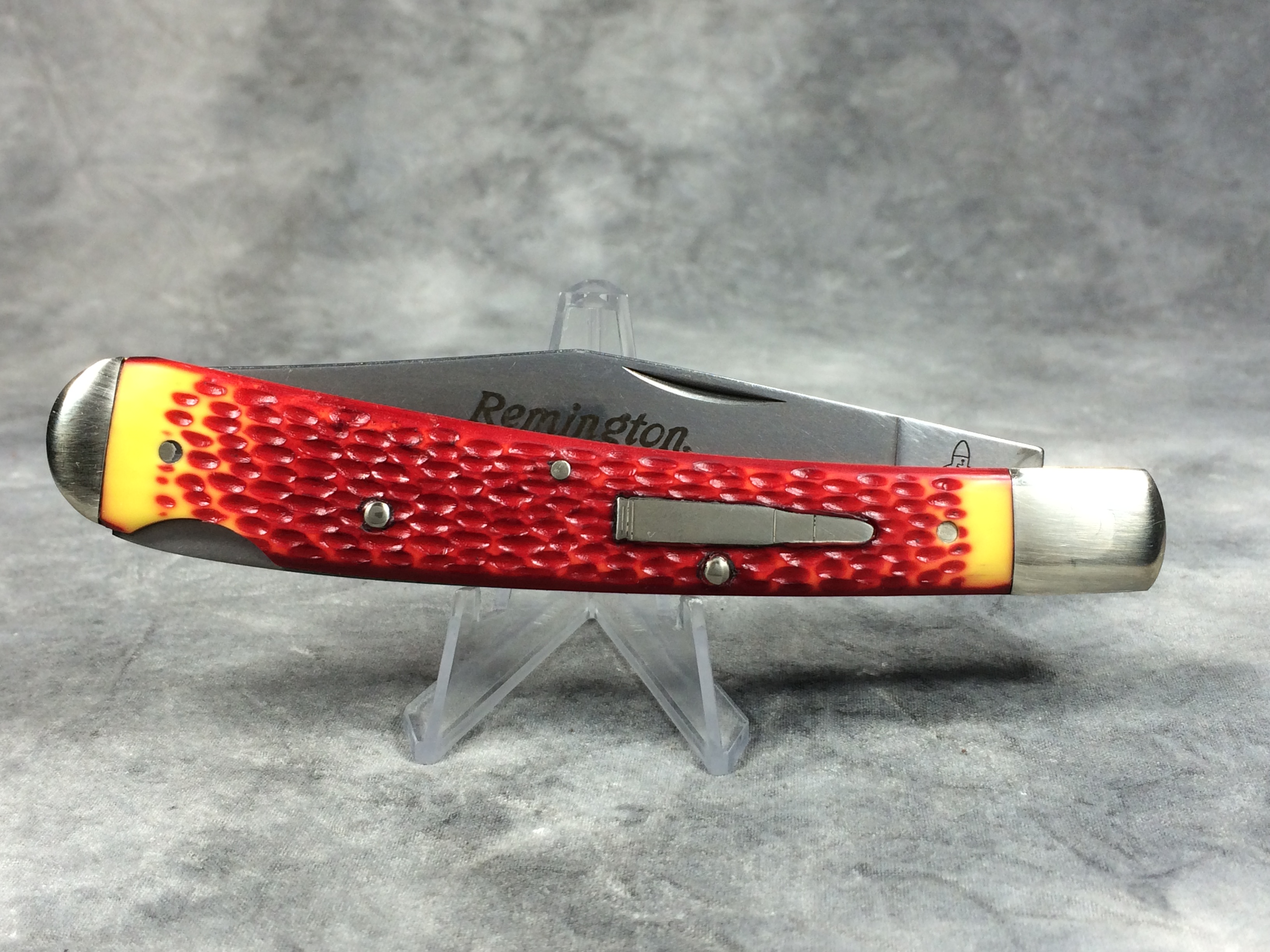 February 03, 2026 - Single Blade Limited Lockback Bullet Knife. 5-3/8 inches closed. 9-3/8 inches open. Made in USA. 'Remington Madison N.C. USA' tang stamp. Bullet shield. Stainless Steel blades. Master blade etched "Remington TRADE MARK". Red & Orange Delrin handle. Nickel Silver bolsters. Brass liner.