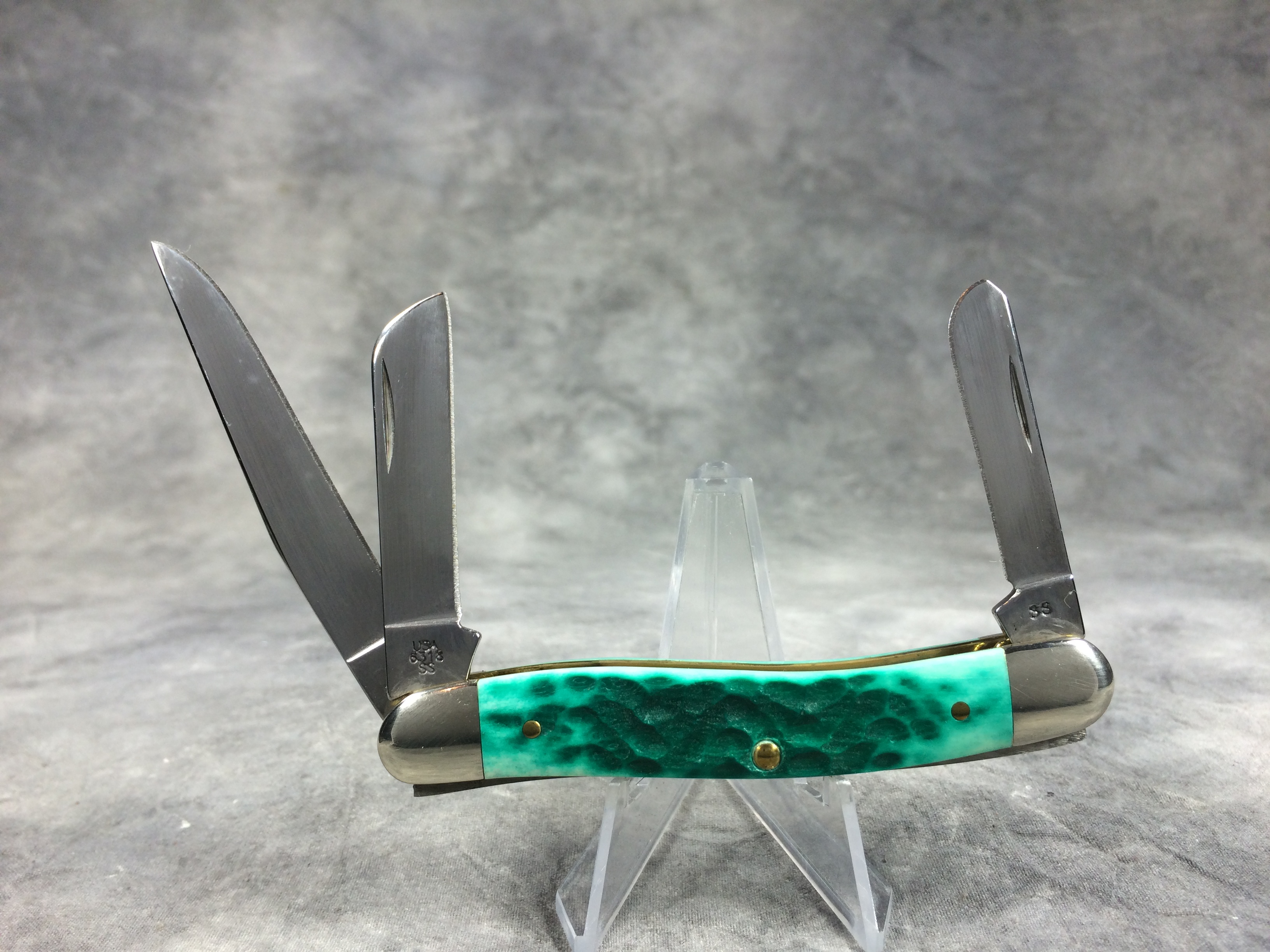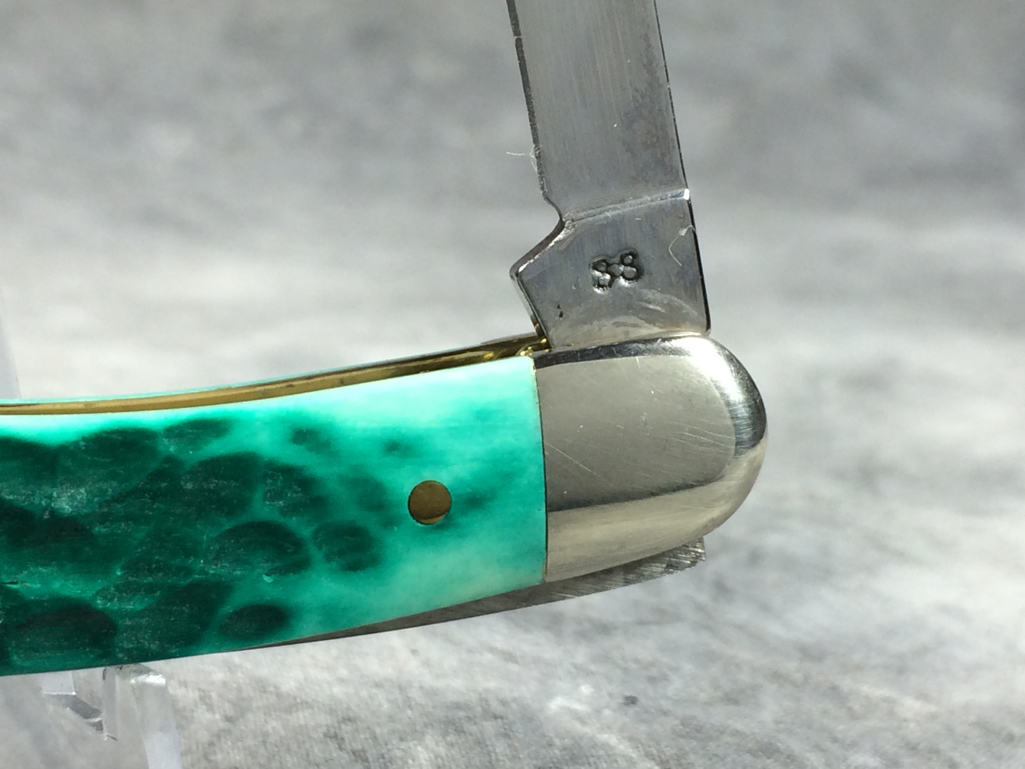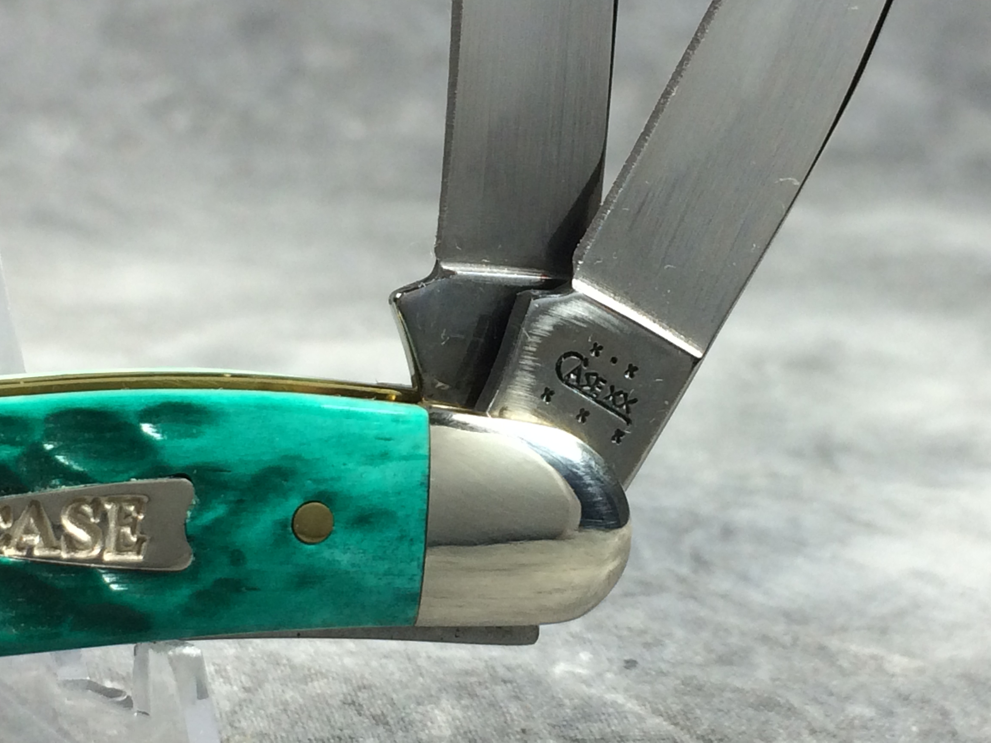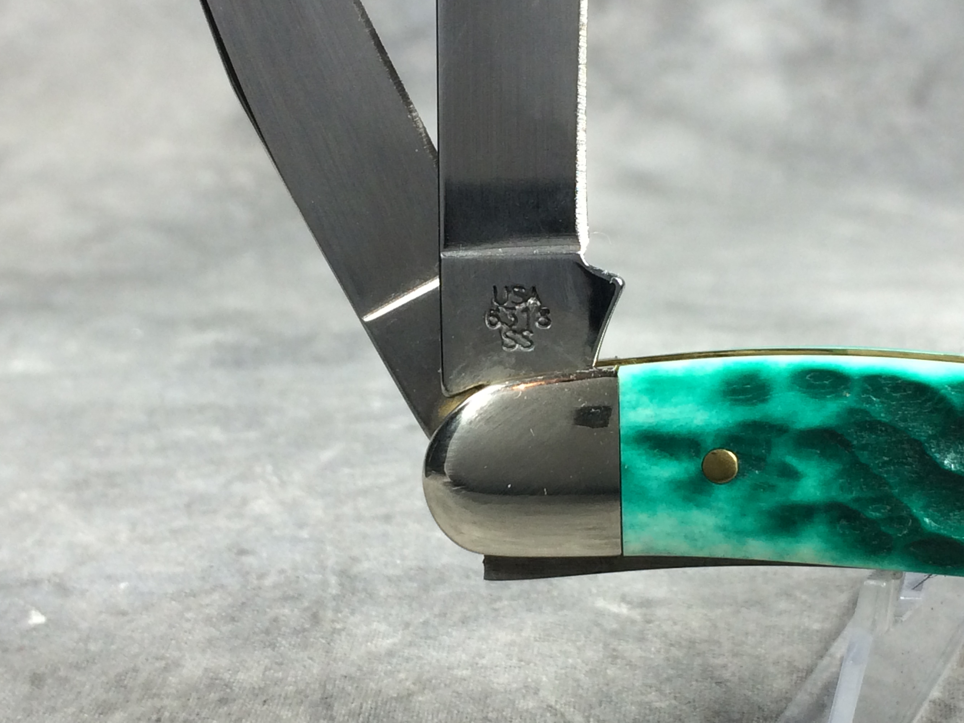 April 05, 2026 - 3-5/8 inches closed. 6-1/8 inches open. Made in USA. "  x*x  CASE XX  x x x  " (with lightning bolt S), "SS", and "USA 6318 SS" tang stamps. Arrow "CASE" shield. Stainless Steel blades. Jigged Jade Bone handle. Nickel Silver bolsters. Brass liner.