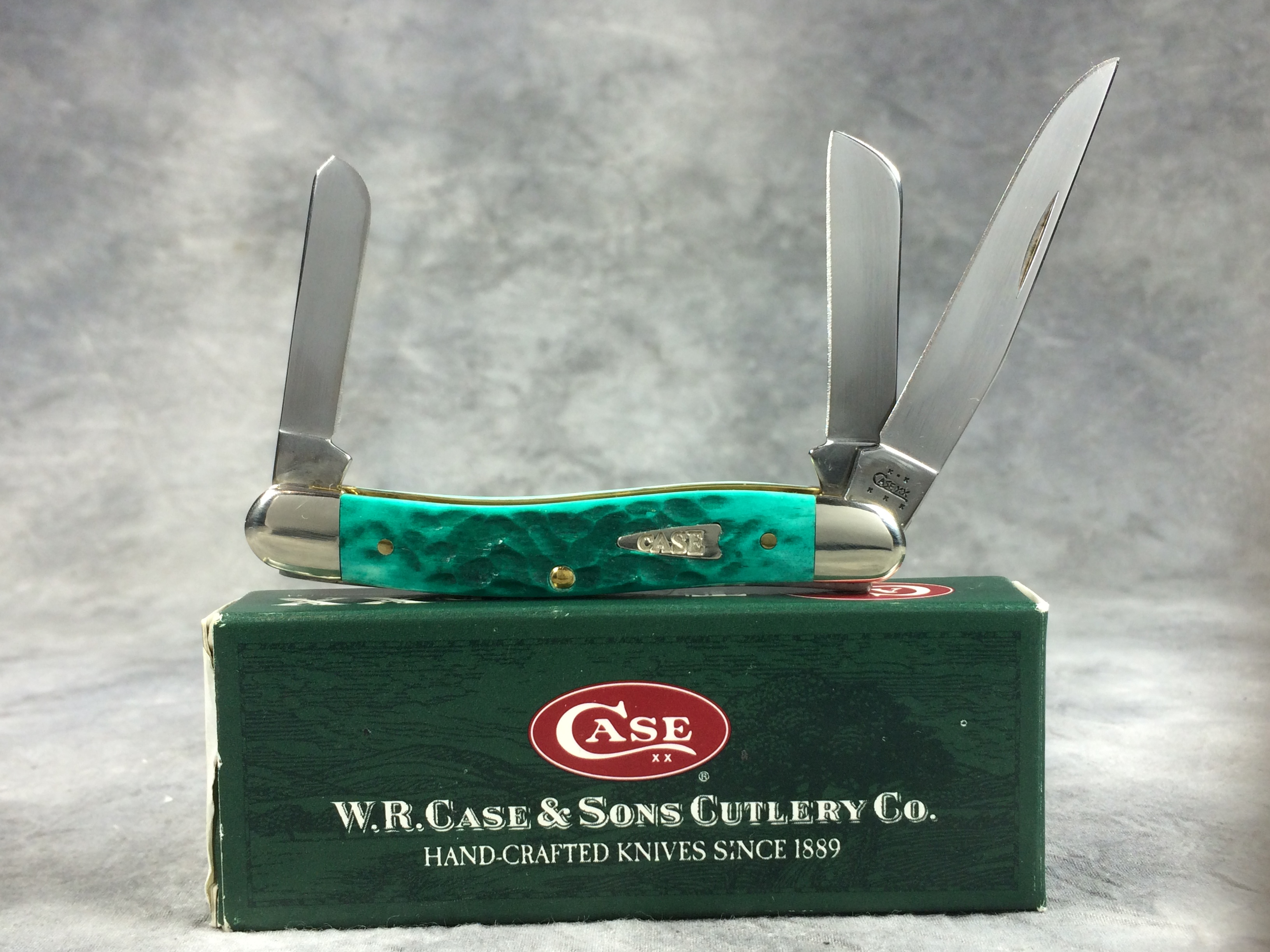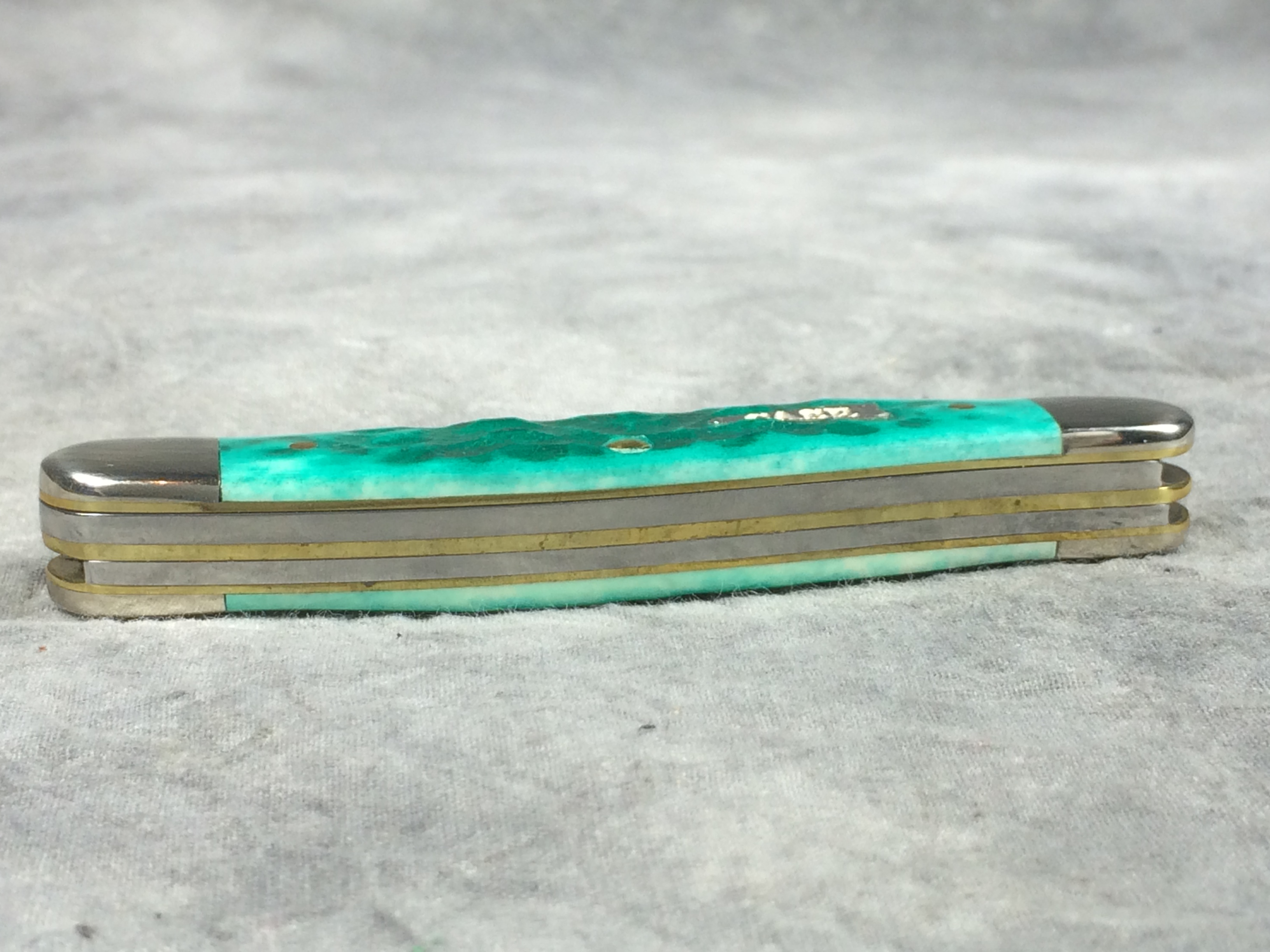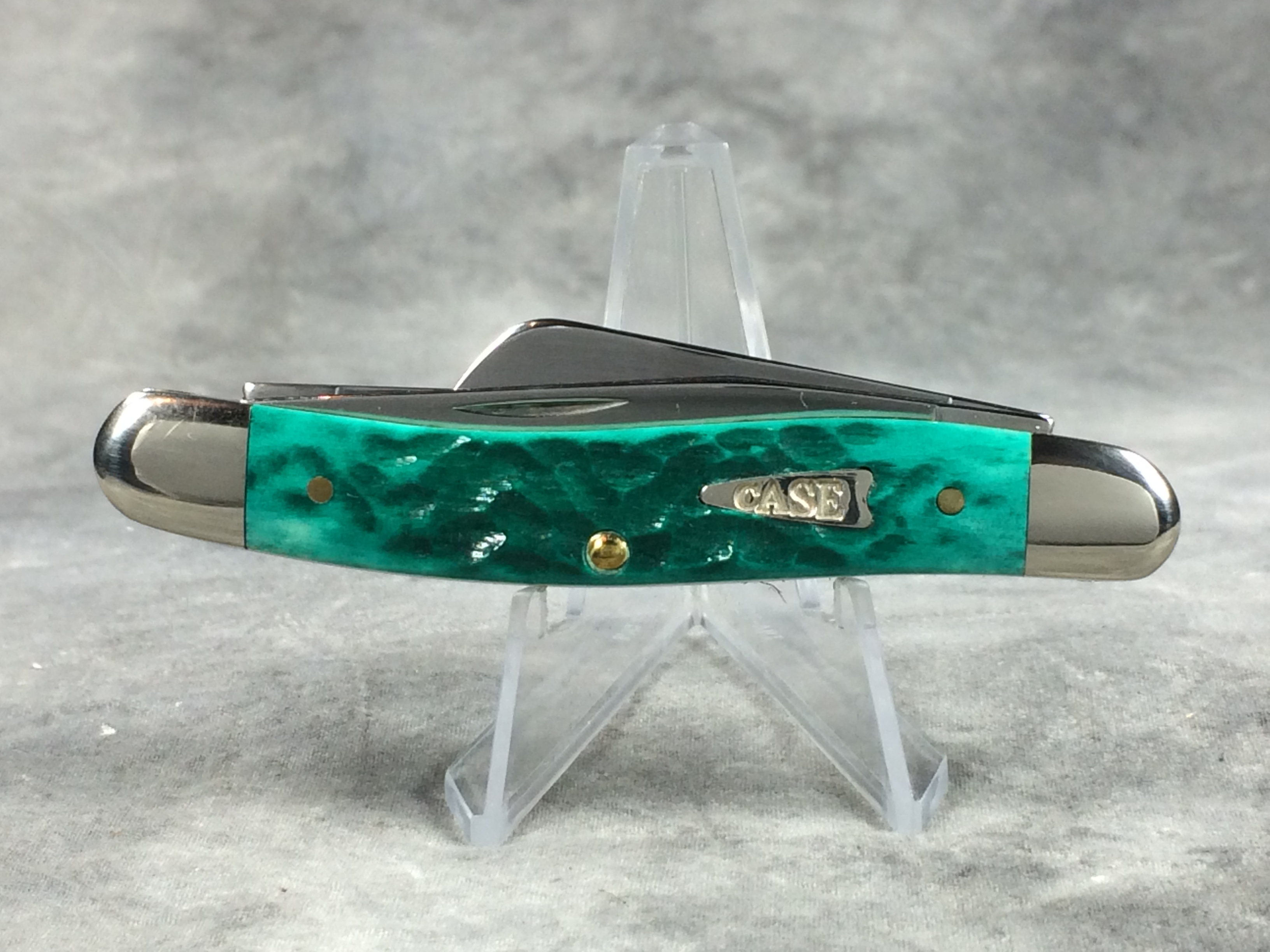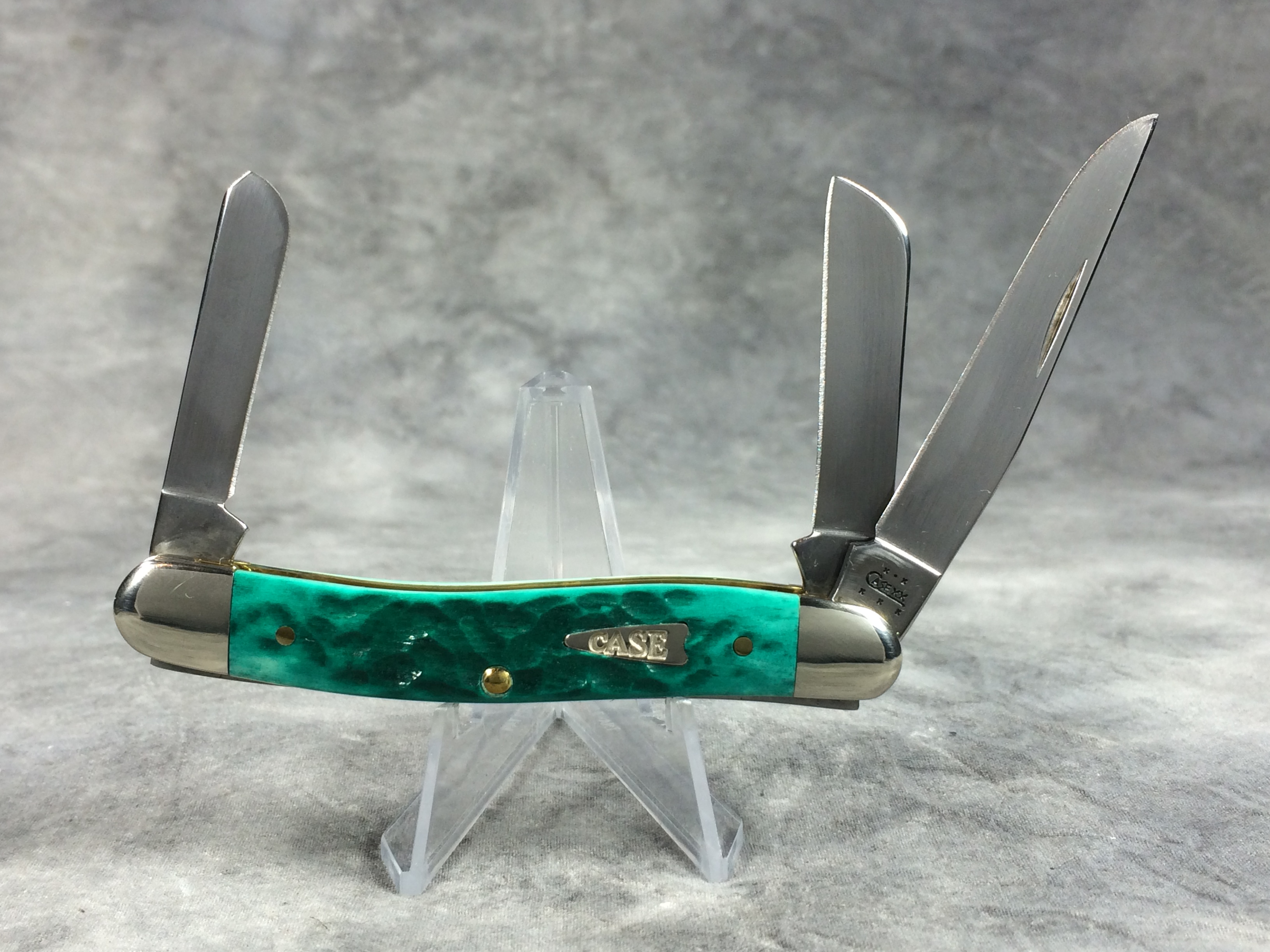 April 05, 2026 - 3-5/8 inches closed. 6-1/8 inches open. Made in USA. "  x*x  CASE XX  x x x  " (with lightning bolt S), "SS", and "USA 6318 SS" tang stamps. Arrow "CASE" shield. Stainless Steel blades. Jigged Jade Bone handle. Nickel Silver bolsters. Brass liner.
