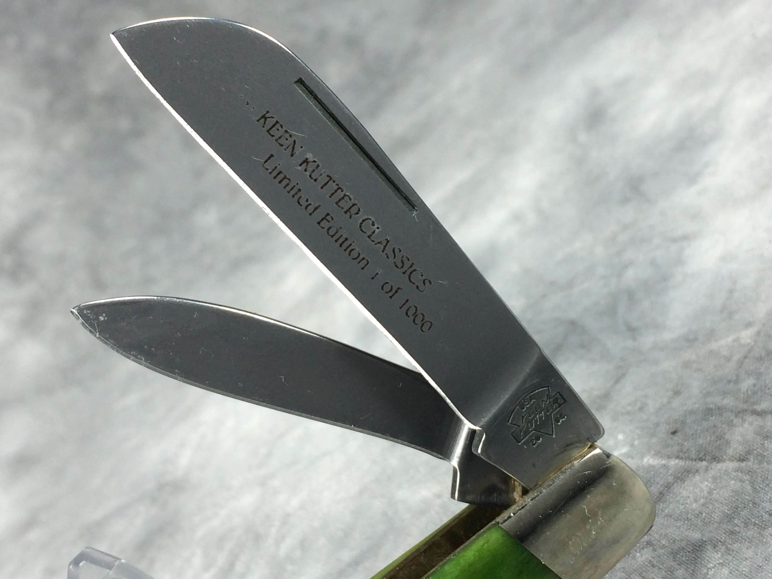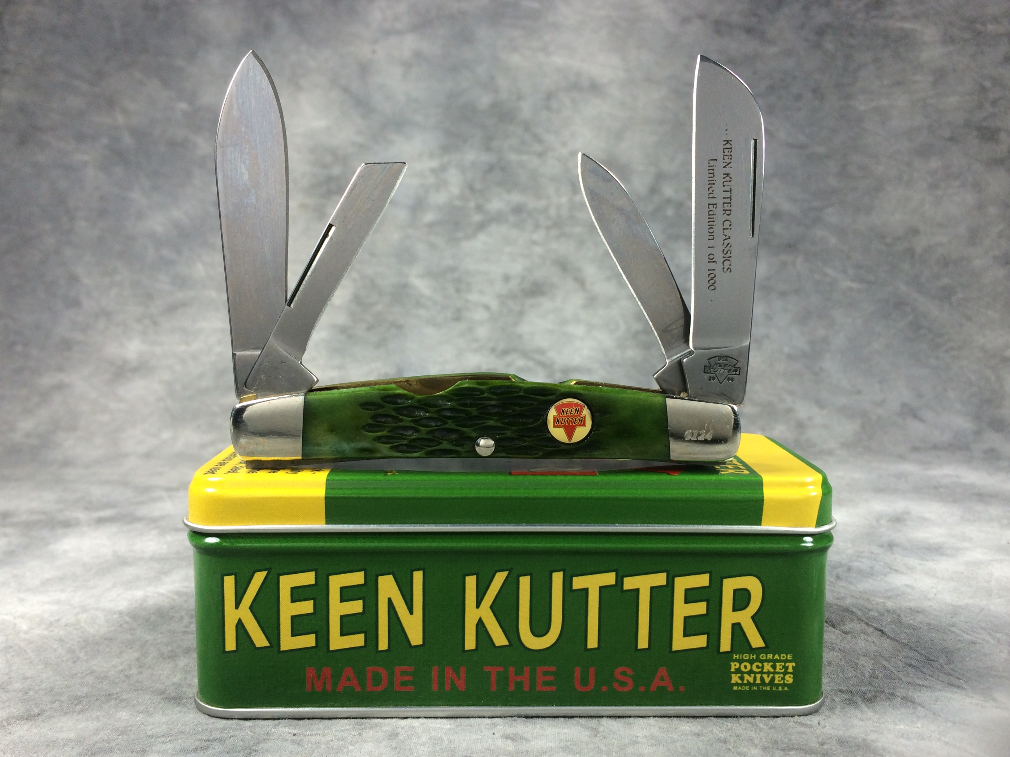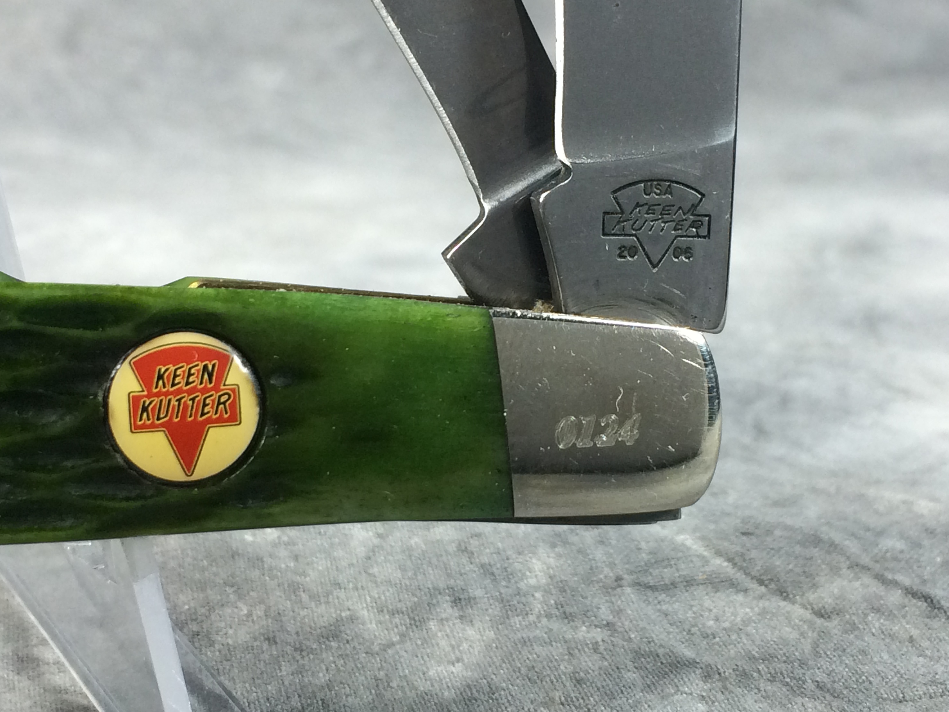 January 14, 2026 - 4 inches closed. 6-5/8 inches open. Made in USA. "KEEN KUTTER USA 2006" logo tang stamp. Circle KEEN KUTTER shield. Stainless Steel blades. Main blade etched "KEEN KUTTER CLASSICS Limited Edition 1 of 1000". Green jigged bone handle. Nickel Silver bolsters. Front right bolster etched with serial #0124. Brass liner. With original gift tin, cardboard sleeve, and paperwork.