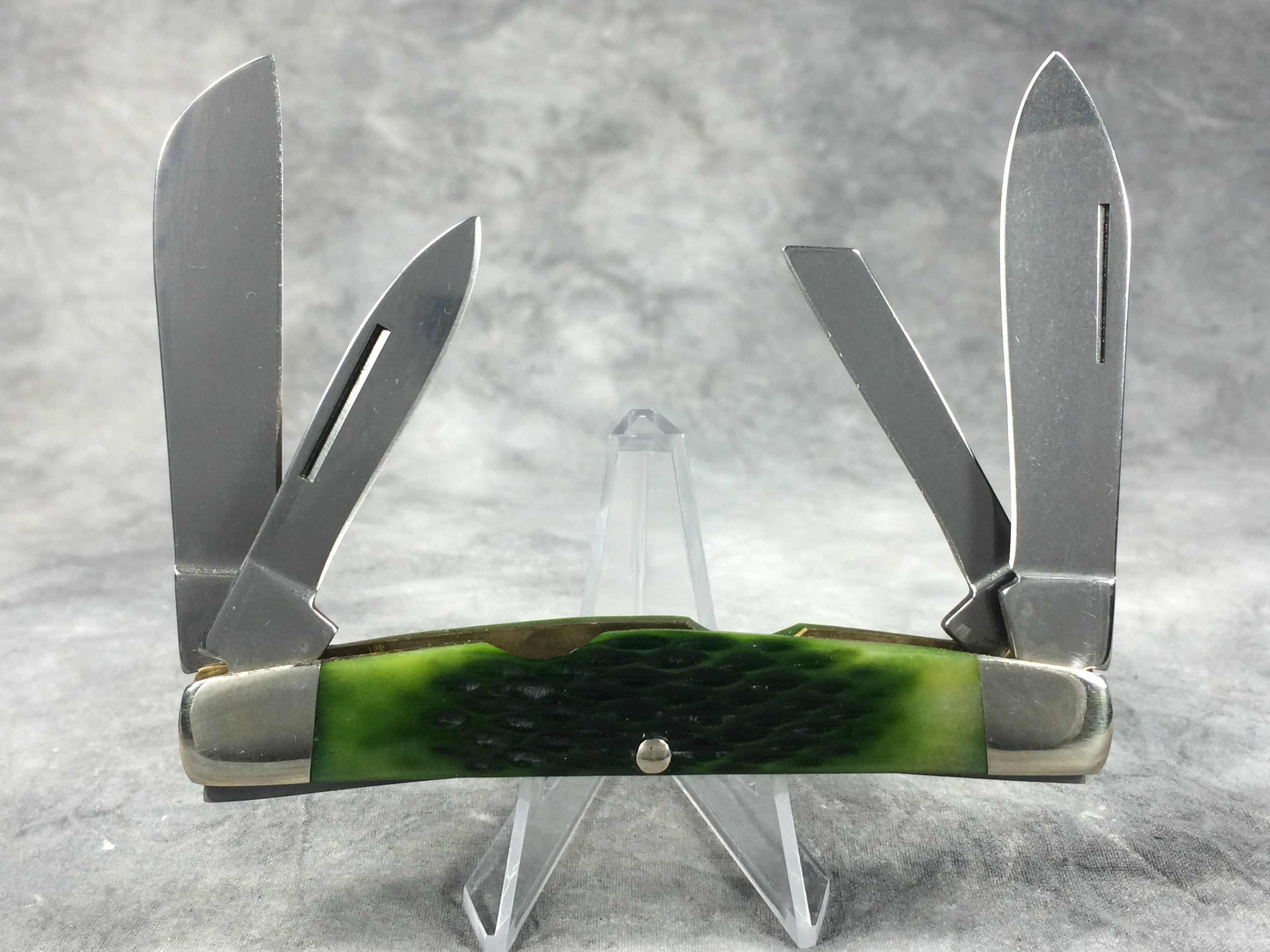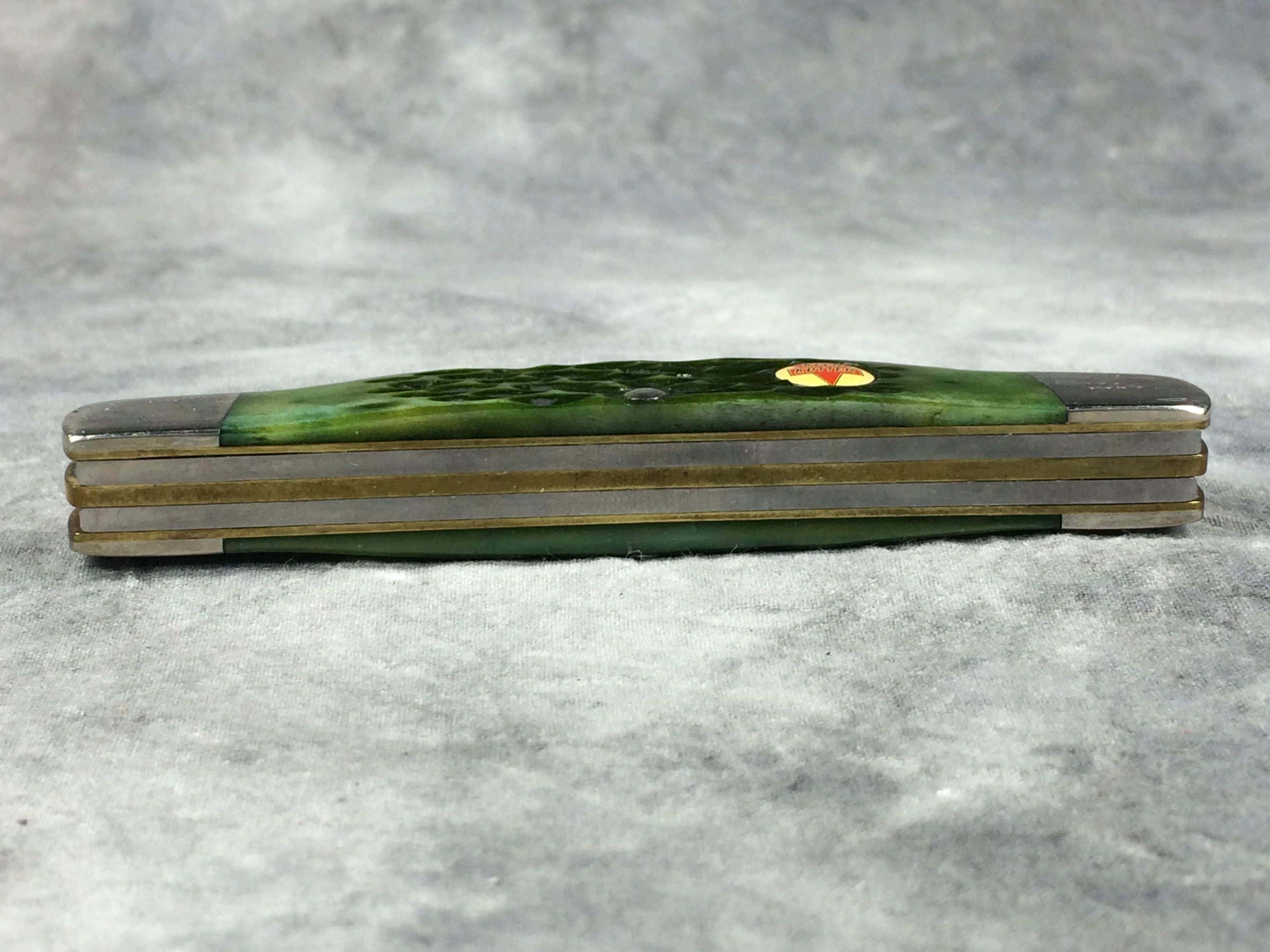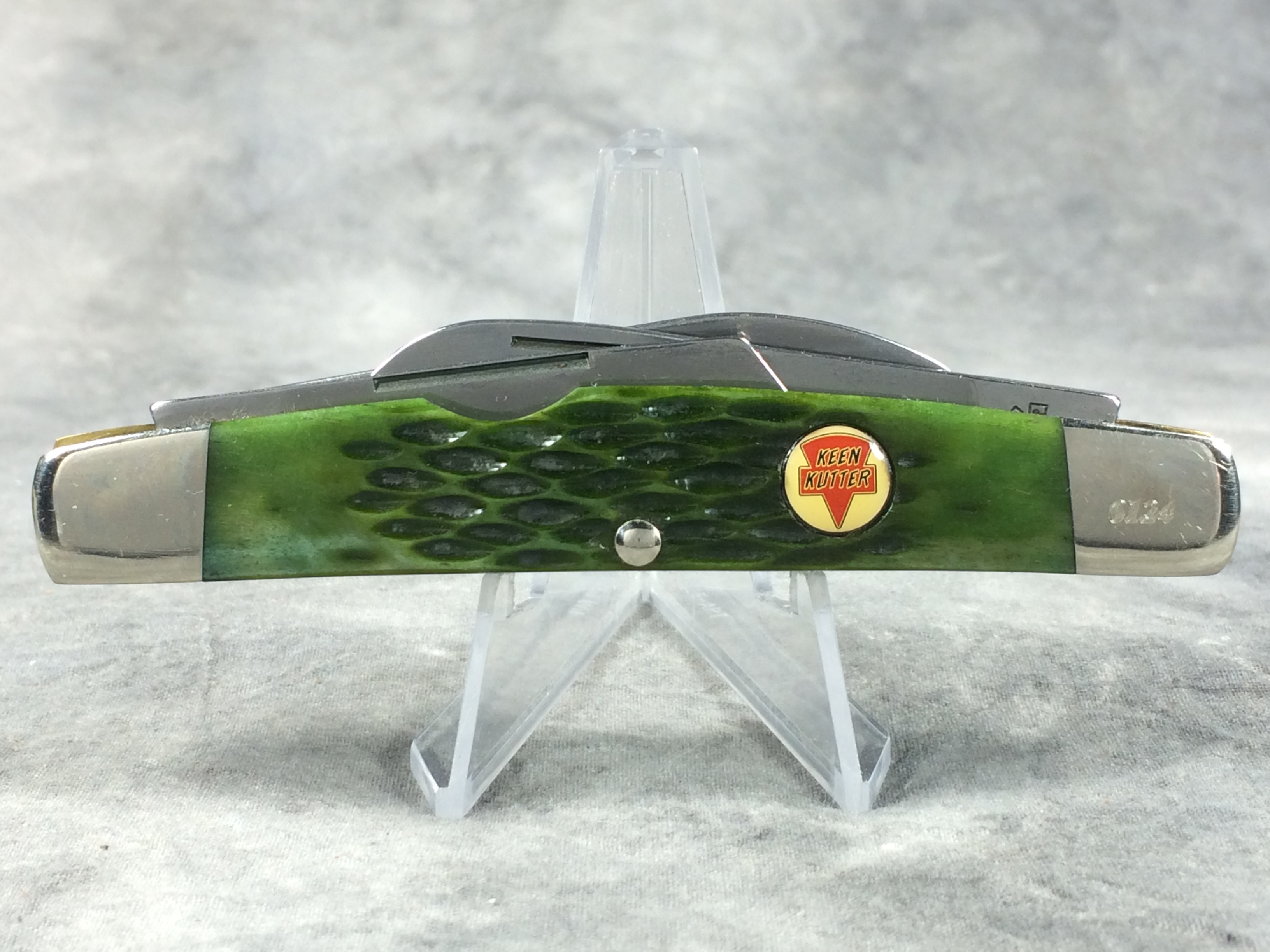 January 14, 2026 - 4 inches closed. 6-5/8 inches open. Made in USA. "KEEN KUTTER USA 2006" logo tang stamp. Circle KEEN KUTTER shield. Stainless Steel blades. Main blade etched "KEEN KUTTER CLASSICS Limited Edition 1 of 1000". Green jigged bone handle. Nickel Silver bolsters. Front right bolster etched with serial #0124. Brass liner. With original gift tin, cardboard sleeve, and paperwork.