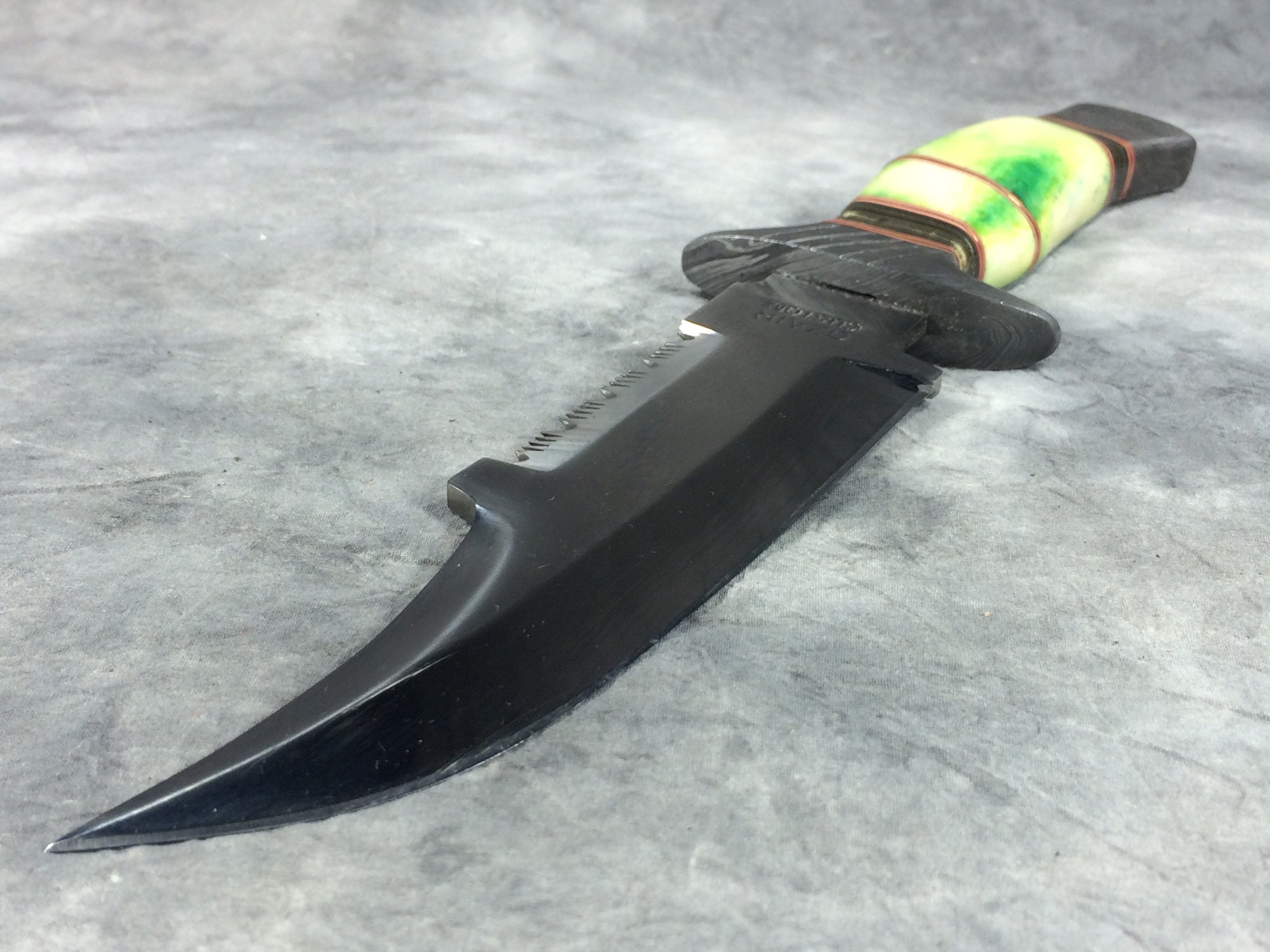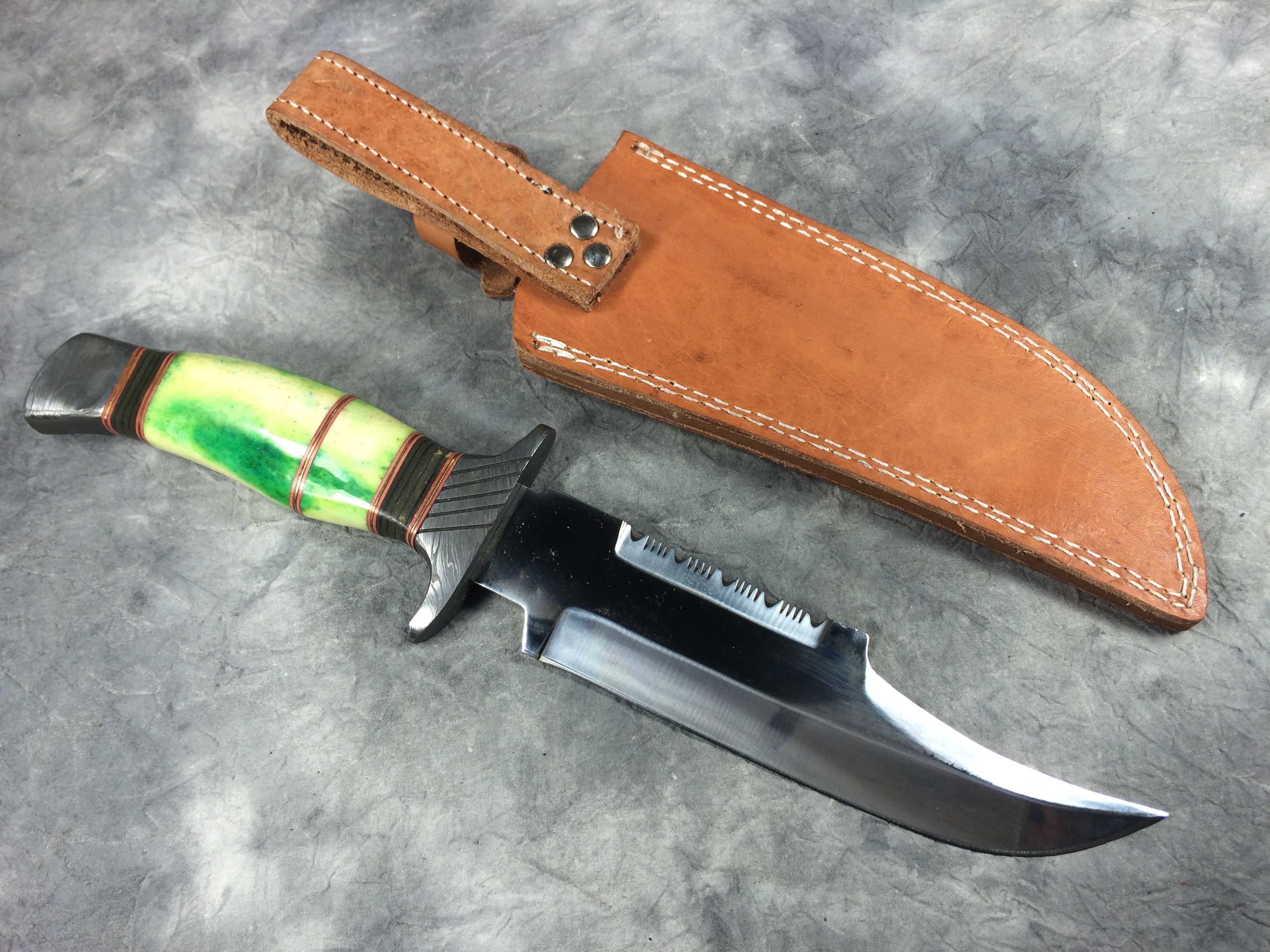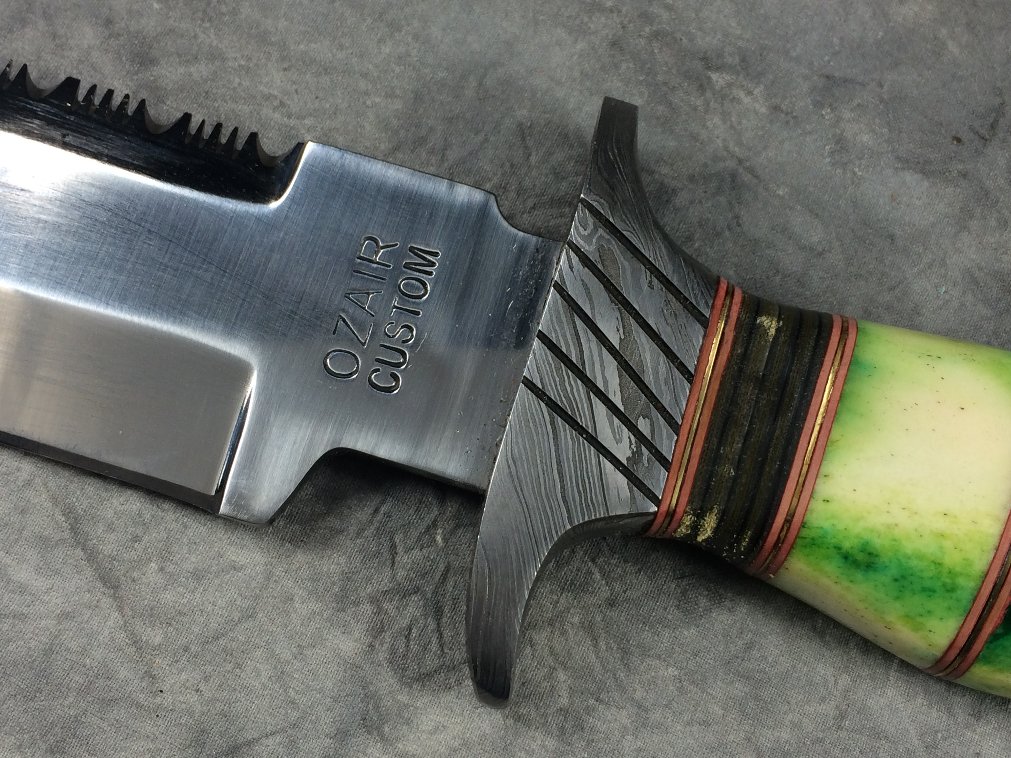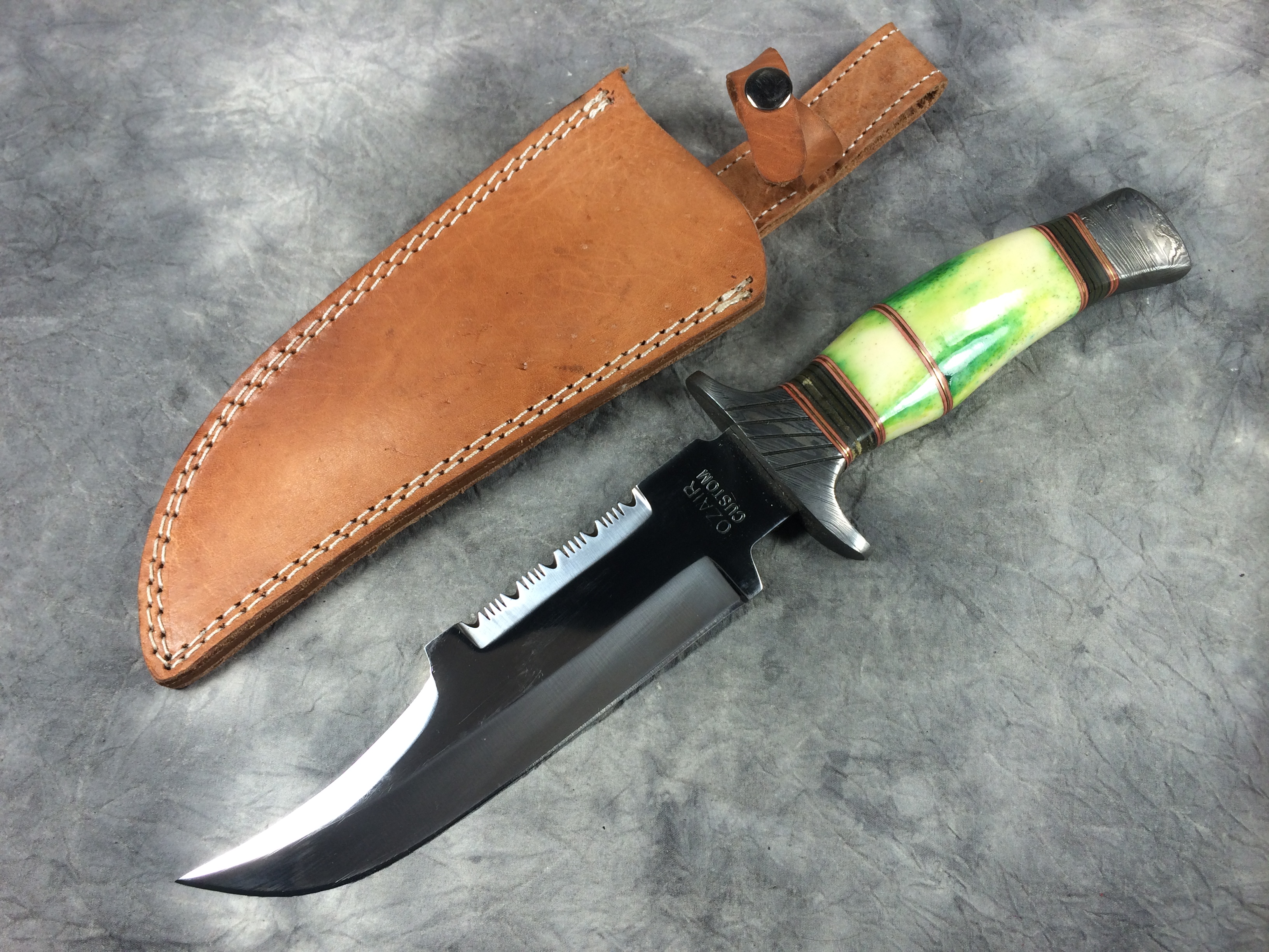 February 23, 2026 - Custom Handmade Bowie Knife. 14-1/4 inches long. Blade is 8 inches long. Green bone & stacked leather handle. Stainless steel blade, partially serrated on top edge. "OZAIR CUSTOM" tang stamp. Damascus guard and pommel. With brown leather sheath.