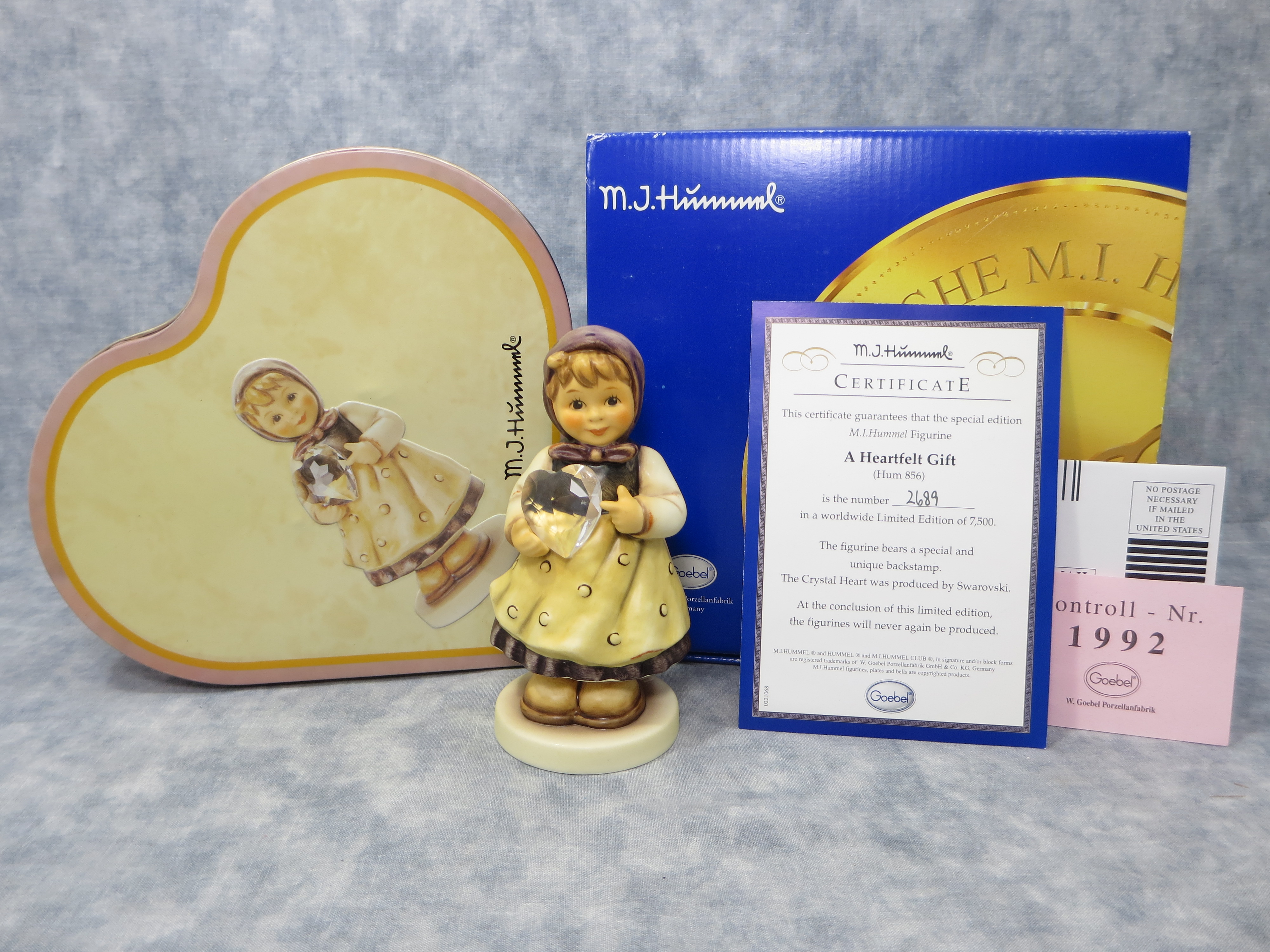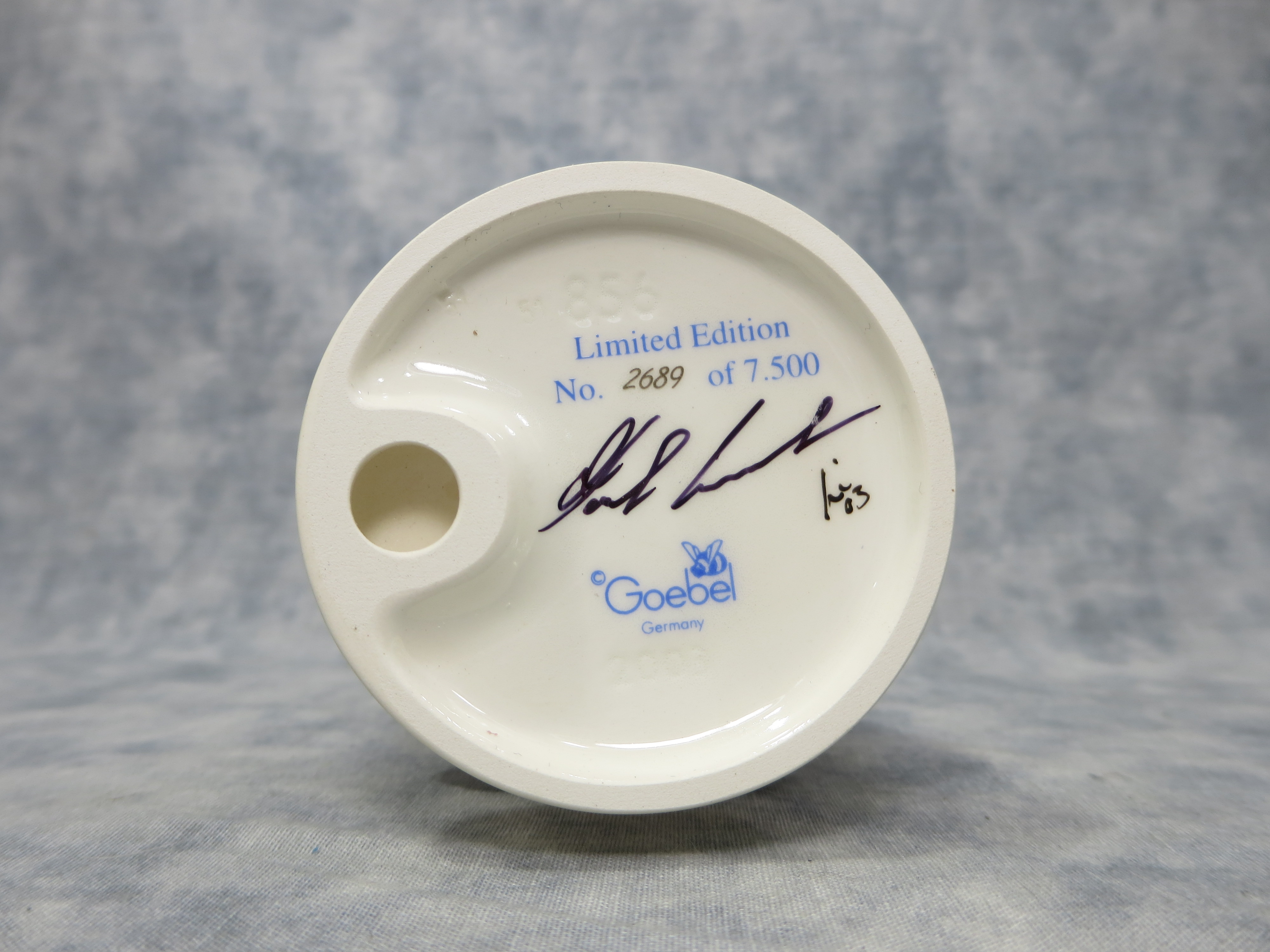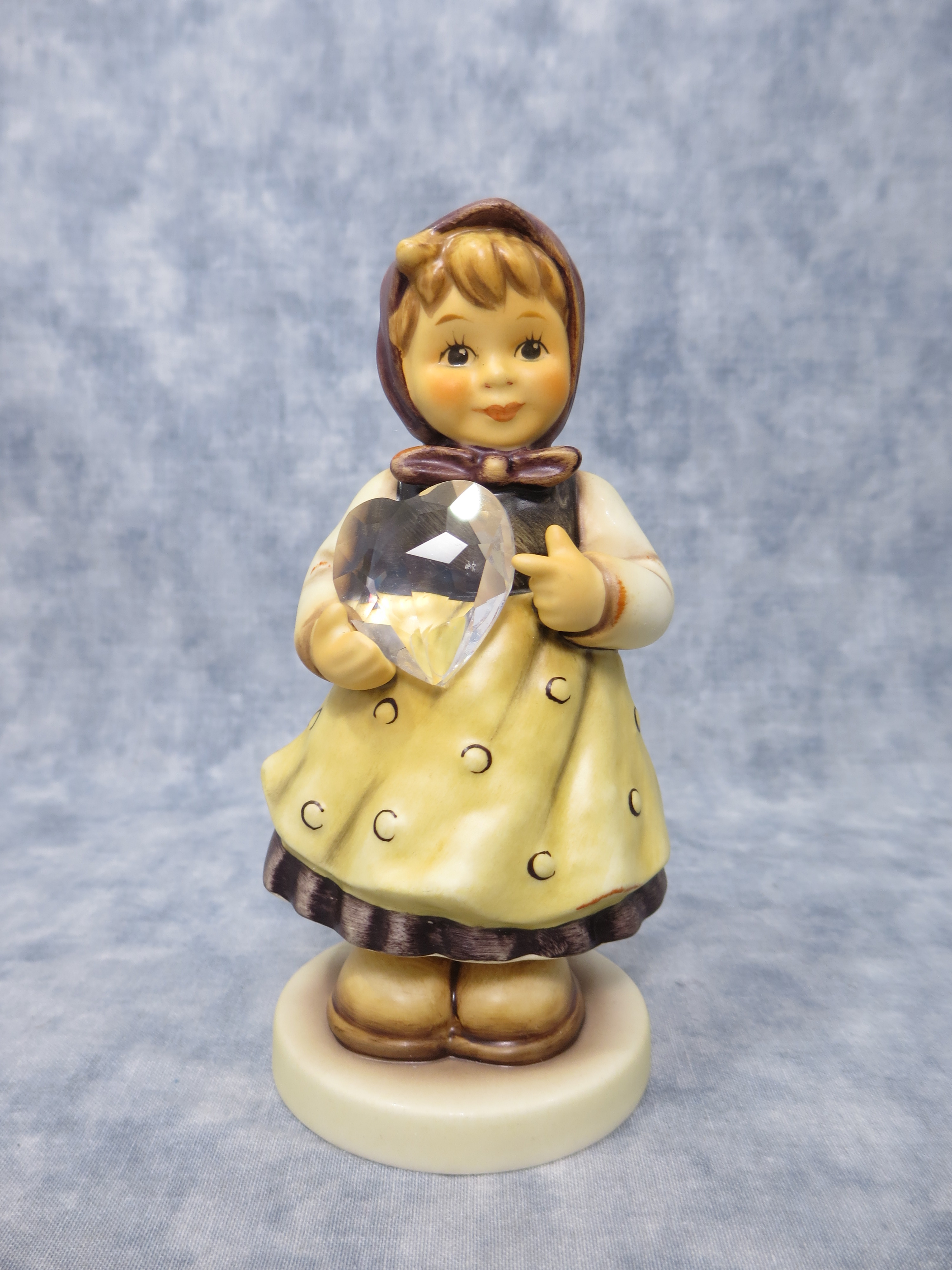 February 23, 2026 - 5-1/4 inches tall. The Crystal Heart was produced by Swarovski. Base is incised 856 and 2003. Goebel TMK 8 trademark and 'Limited Edition No. xxxx of 7,500' imprinted in blue on bottom of base. Painter hand-initialed and dated in black ink on bottom of base. Master Artist signed in black sharpie on bottom of base.