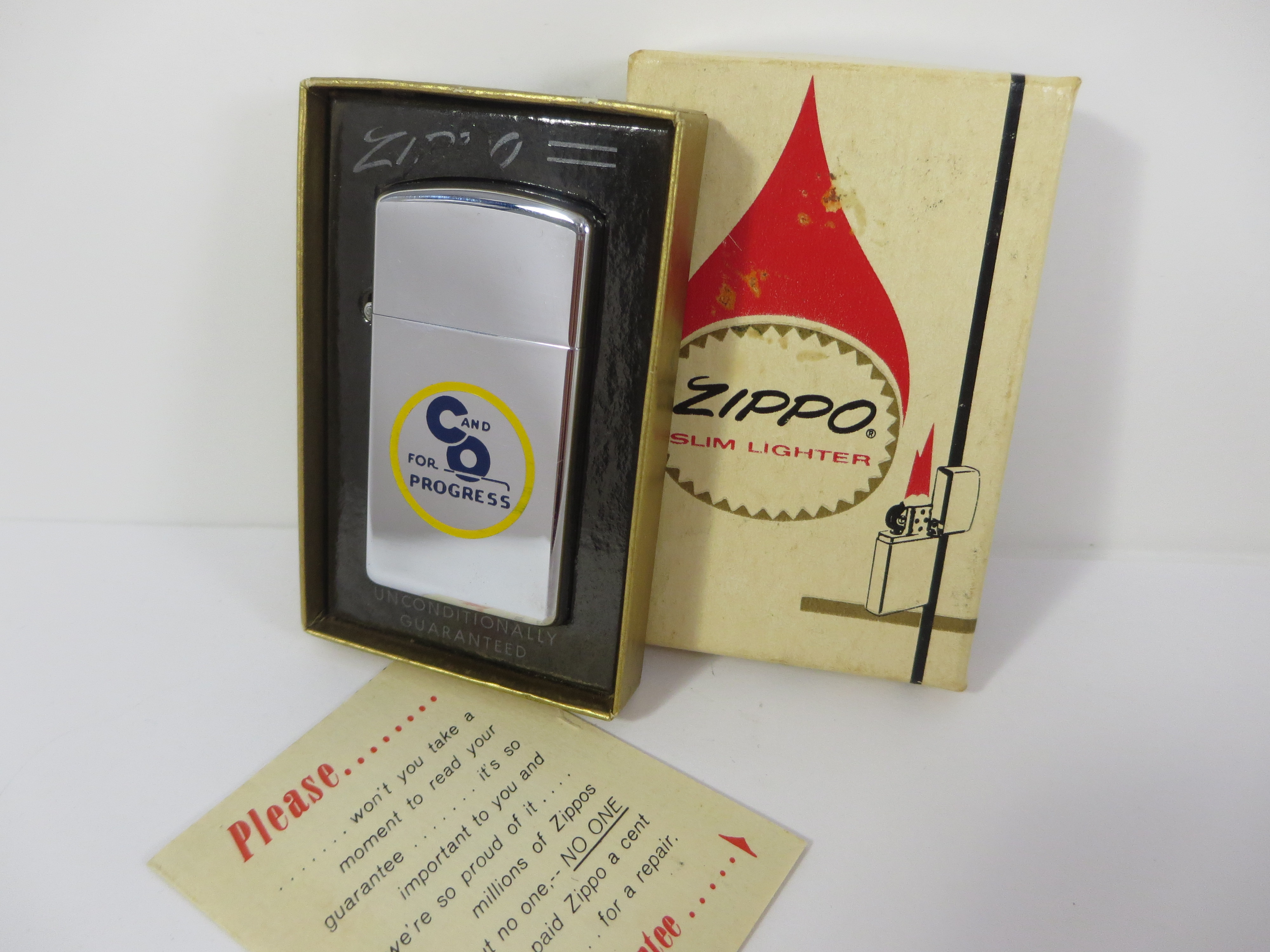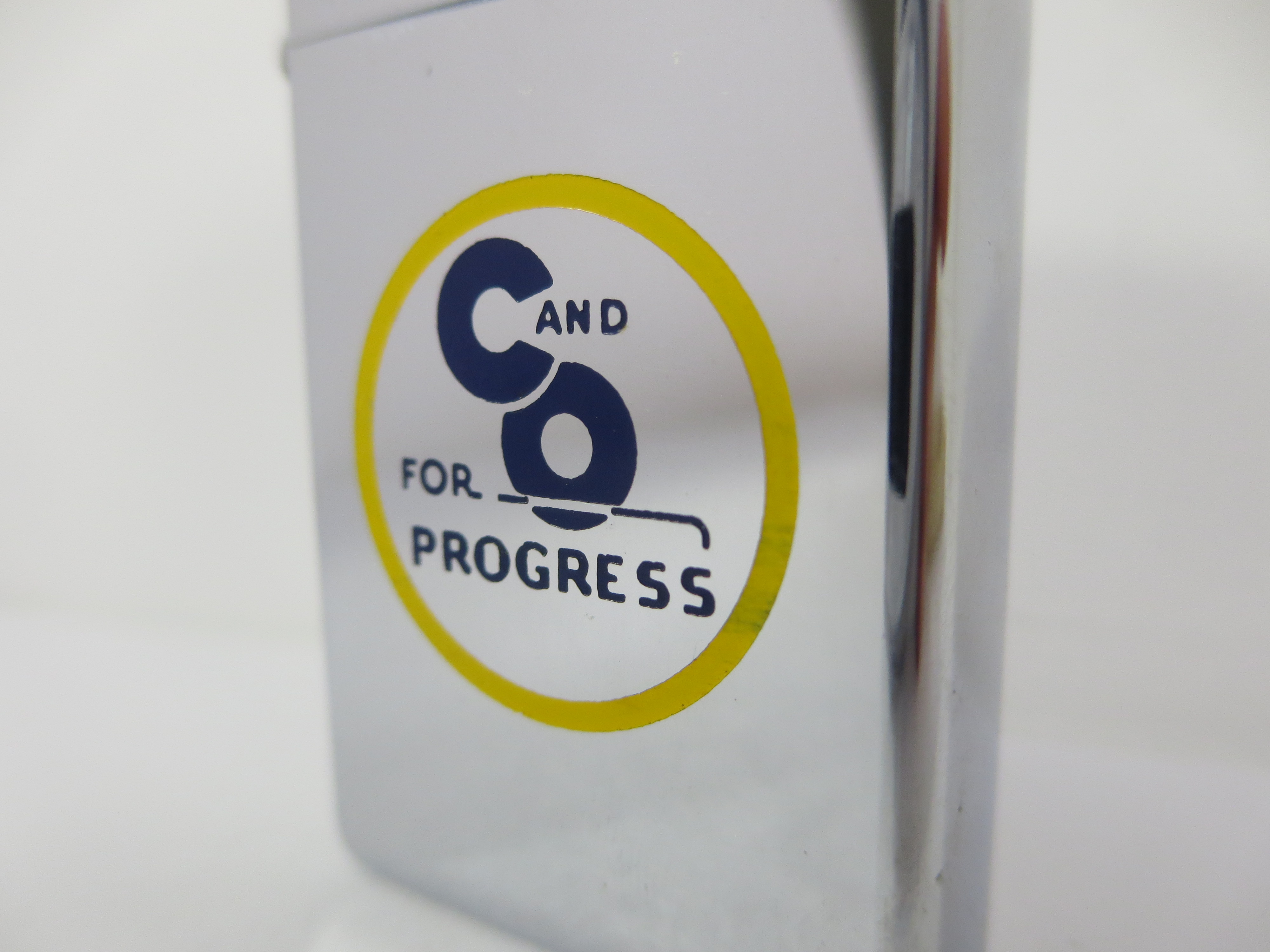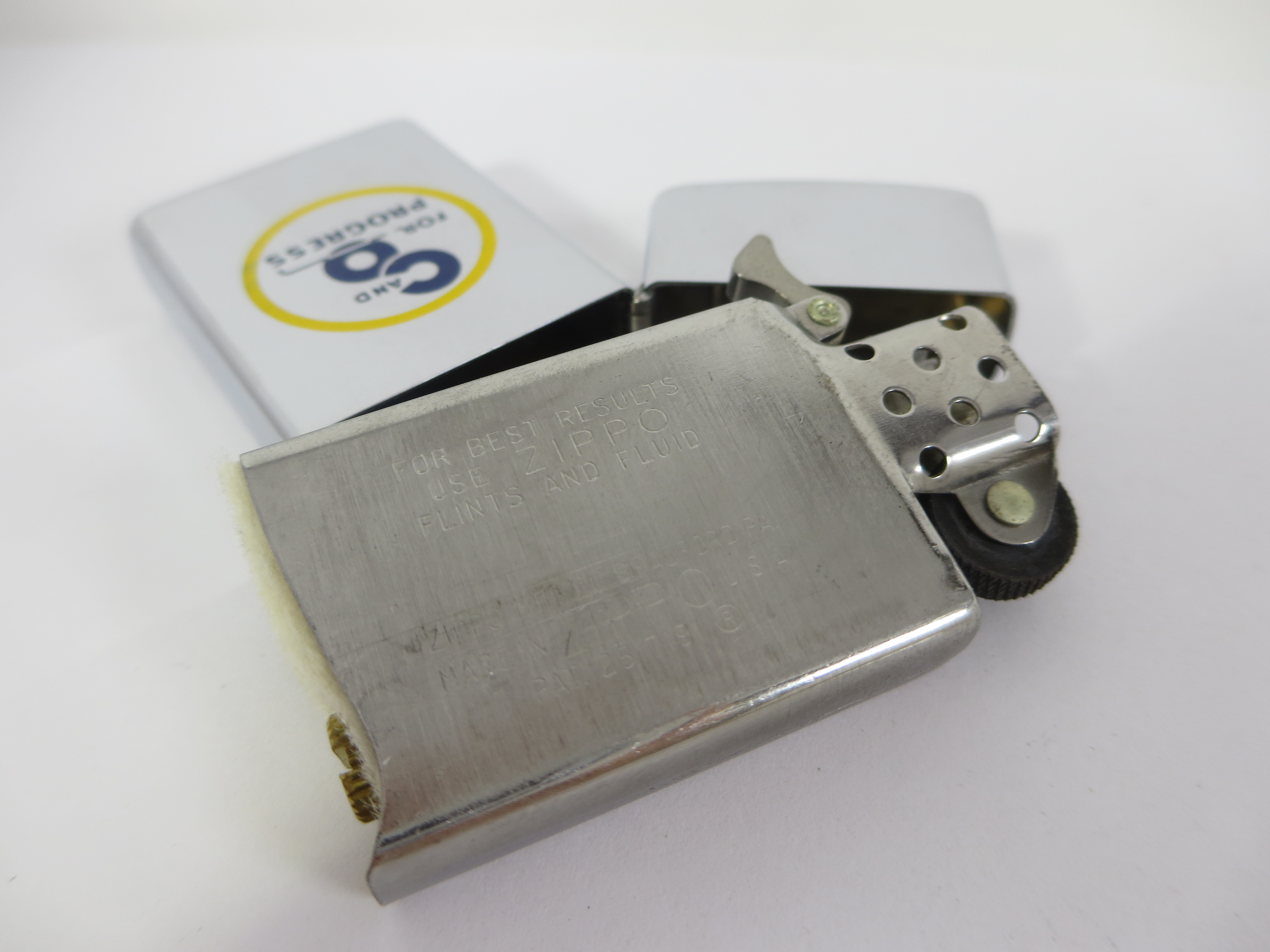 April 21, 2026 - ZIPPO C & O For Progress Lighter circa 1967. Polished Chrome finish over solid Brass with laser engraved, colorized front logo. Slim Size. Bottom of lighter reads: |||| Zippo ||| Includes original Pat. 2517191 unfired insert.