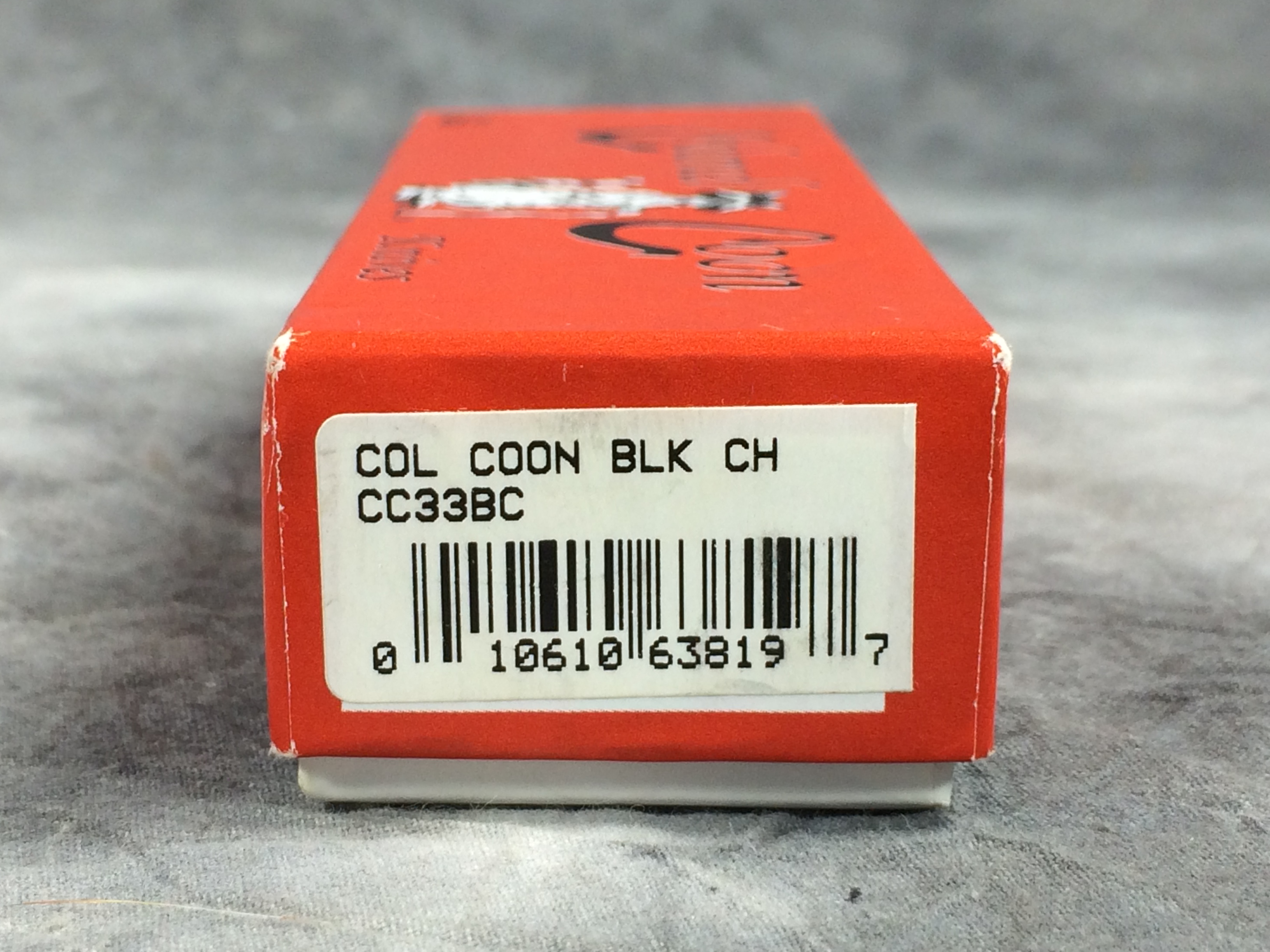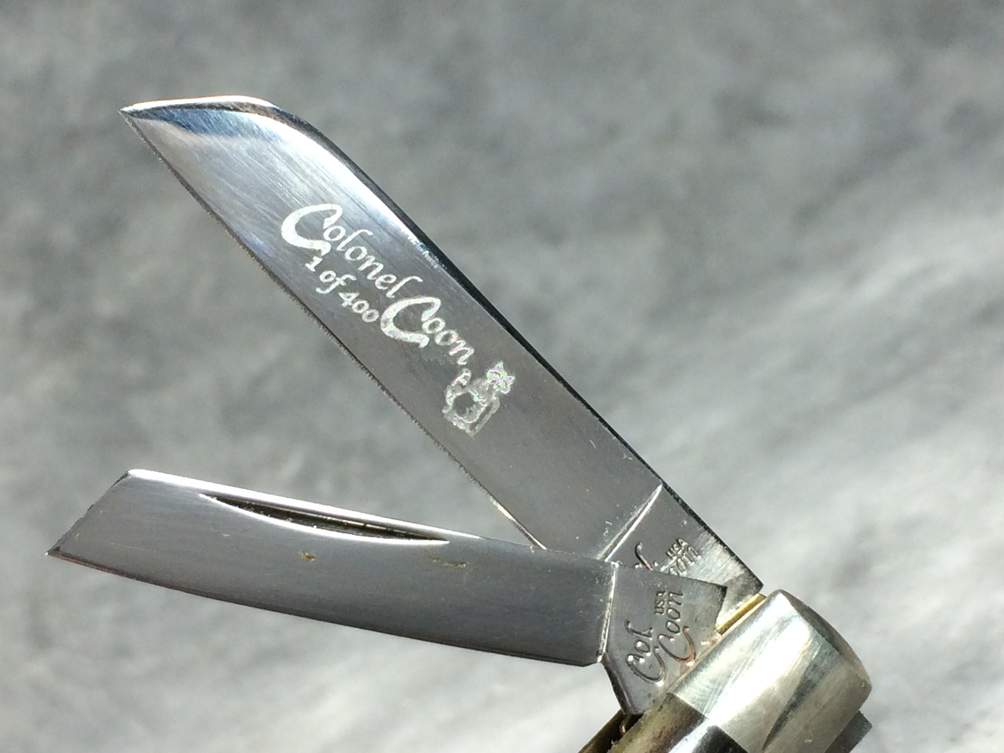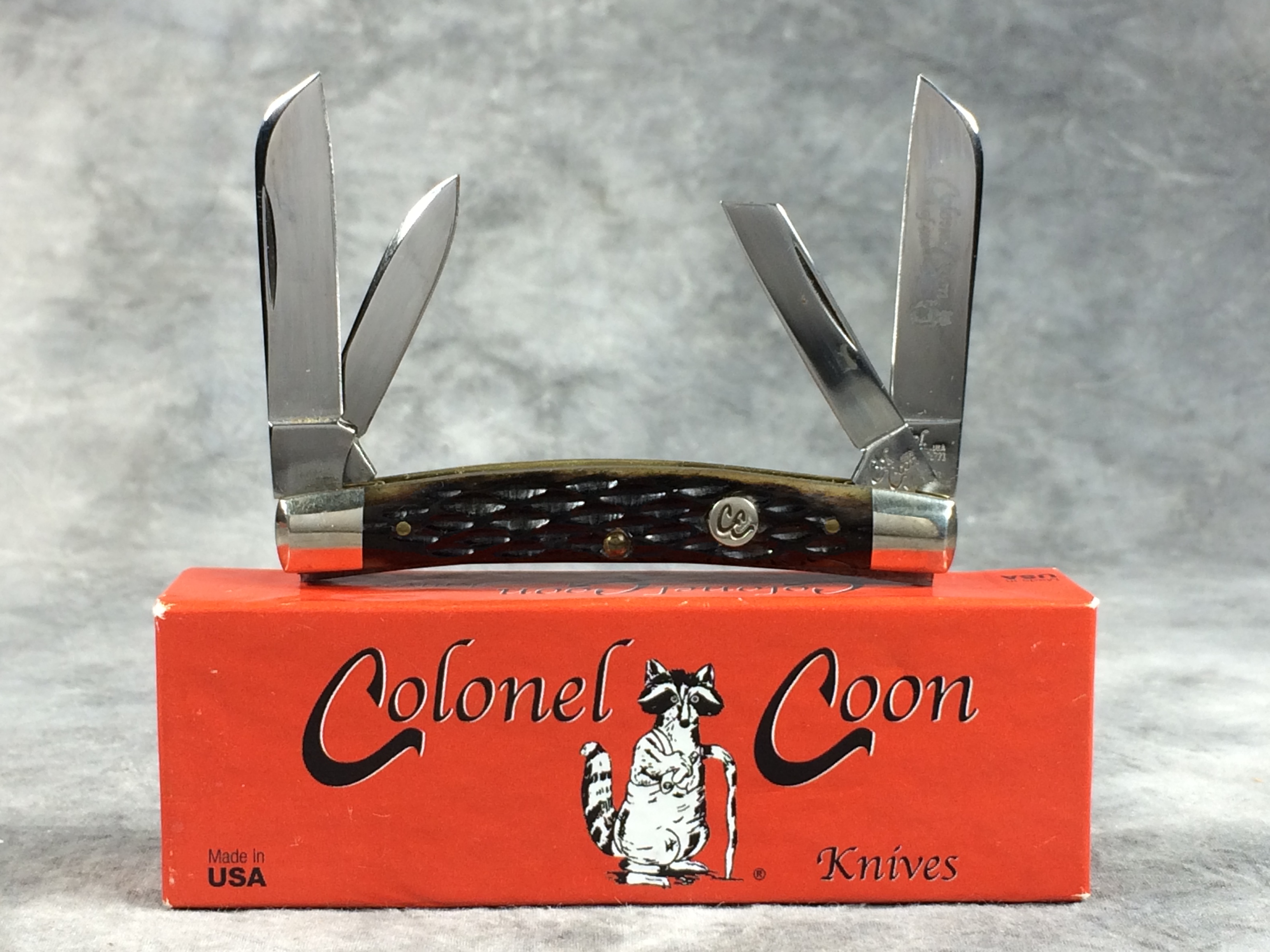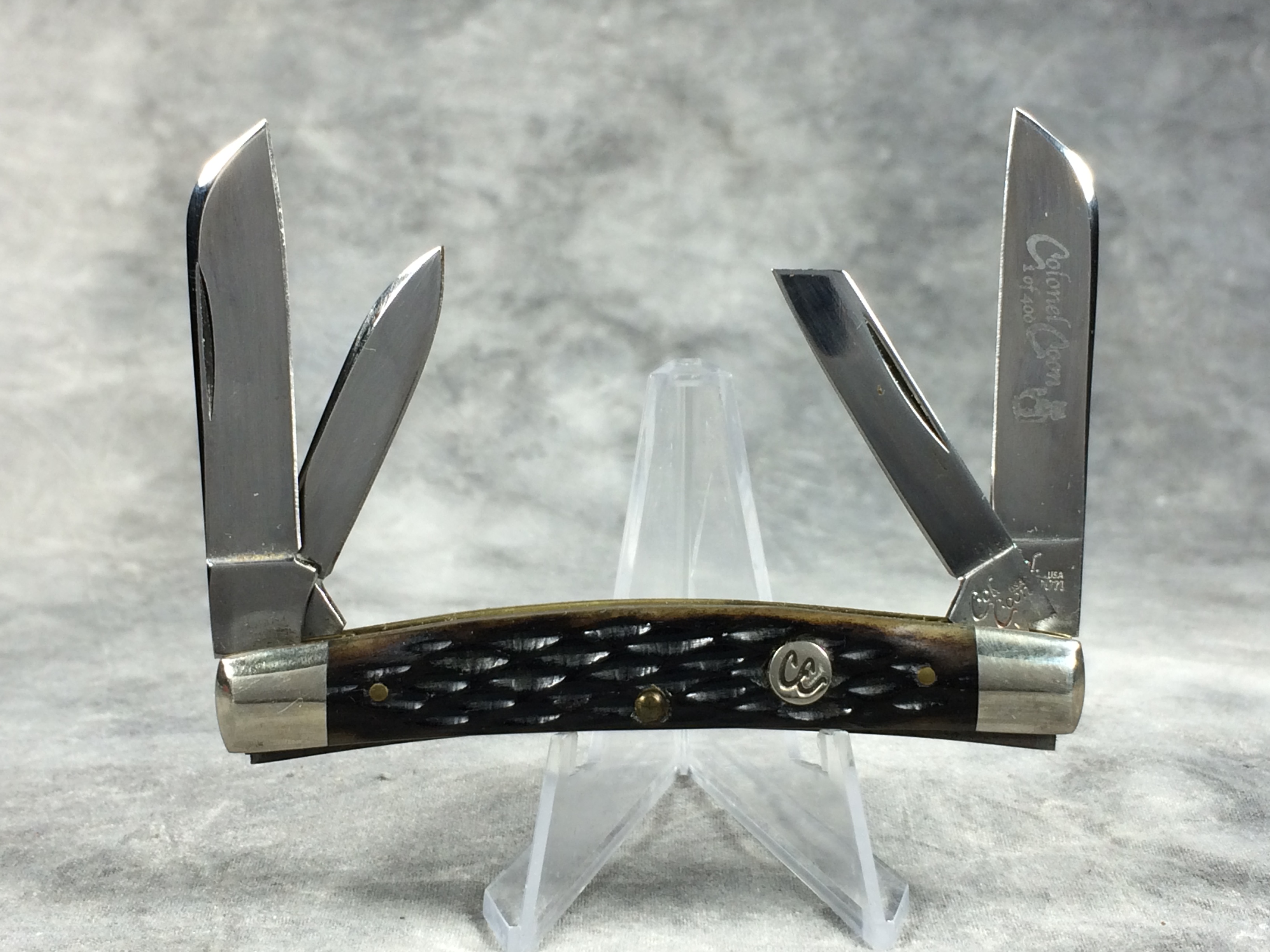 December 04, 2025 - 3-1/2 inches closed. 5-1/2 inches open. "Col. Coon USA" tang stamp. Main blade etched "Colonel Coon 1 of 400". Circle "CC" shield. Black Cherry Jigged Bone handle. Nickel Silver bolsters and brass liner. With original box.