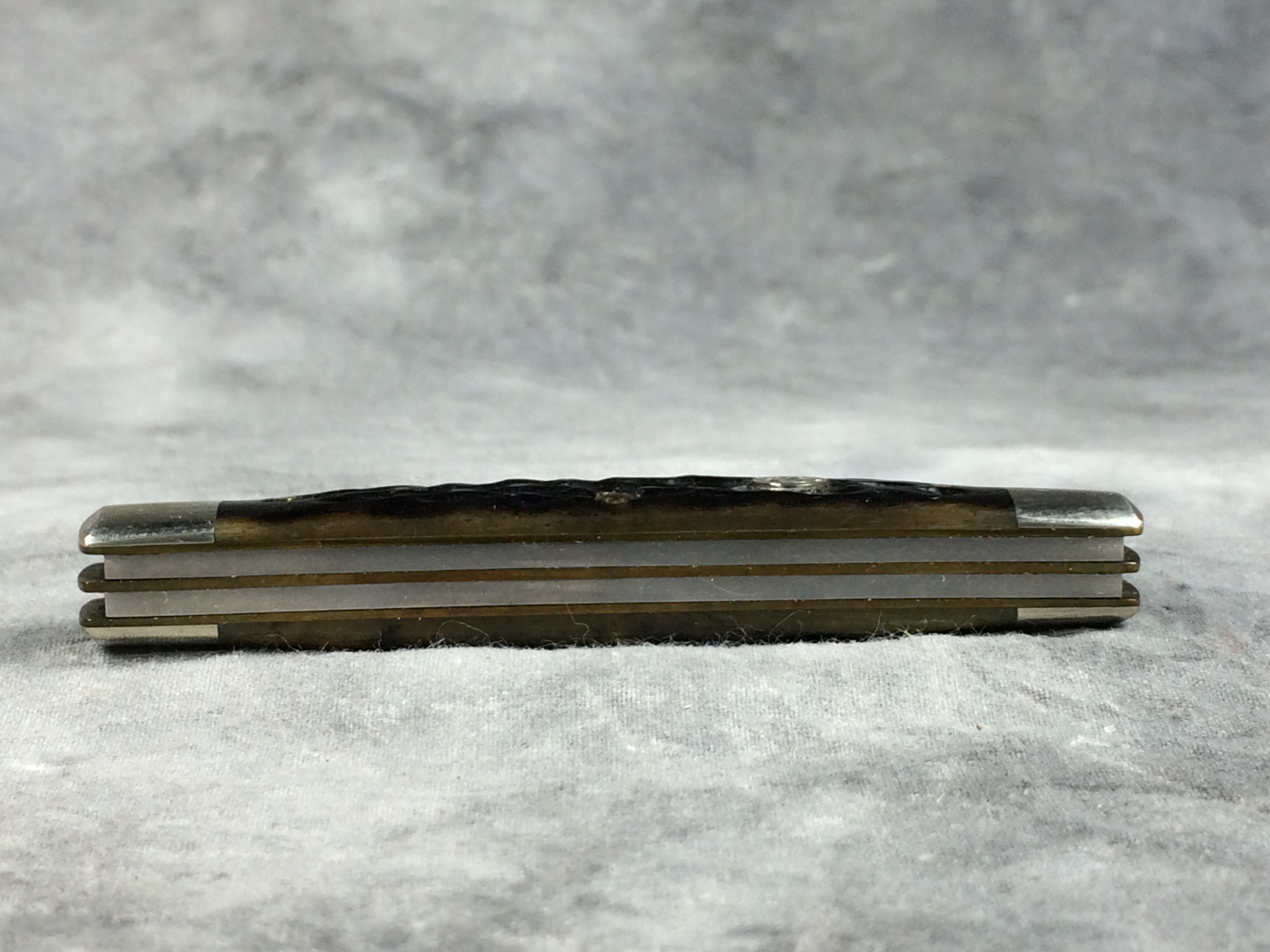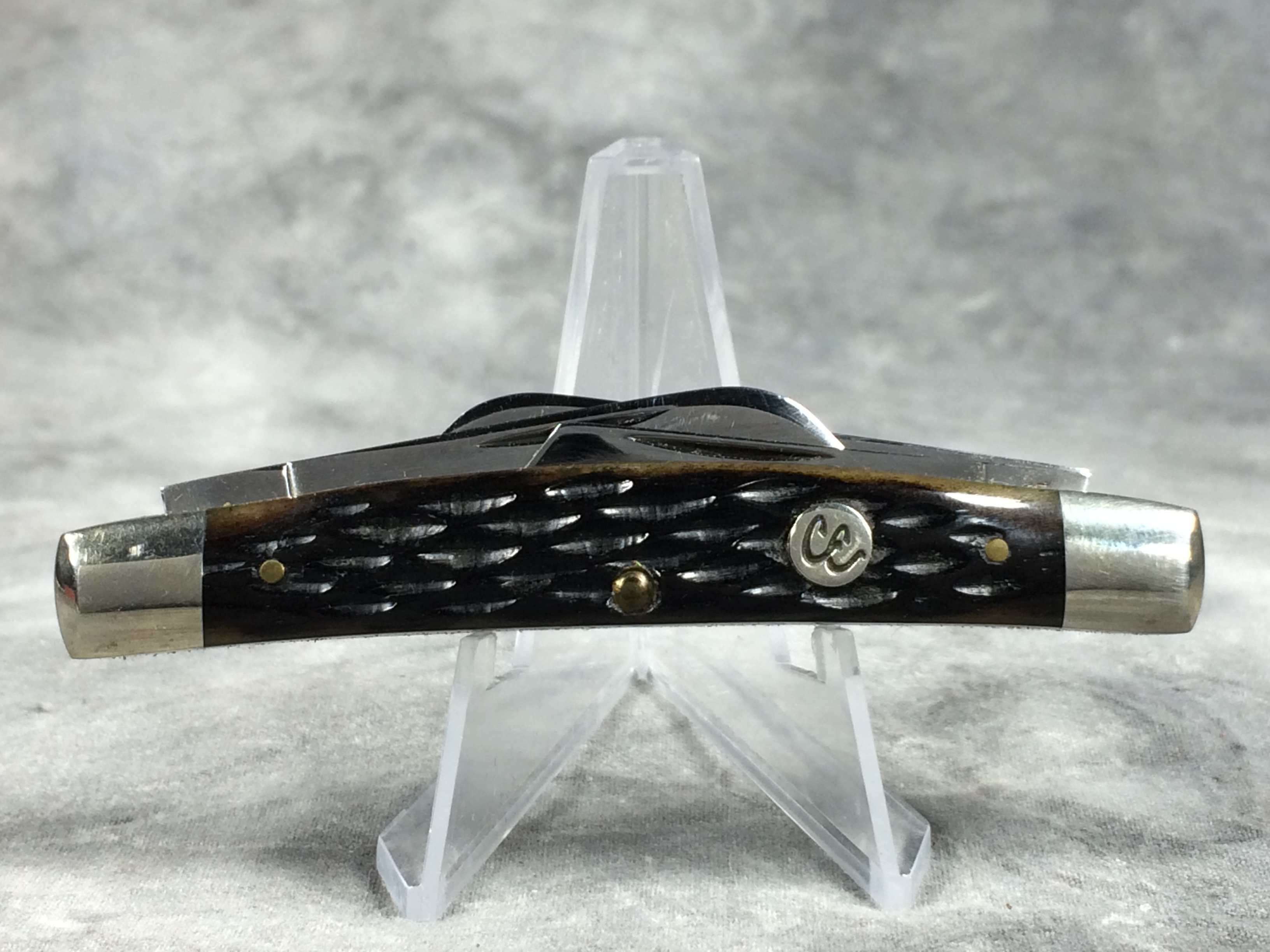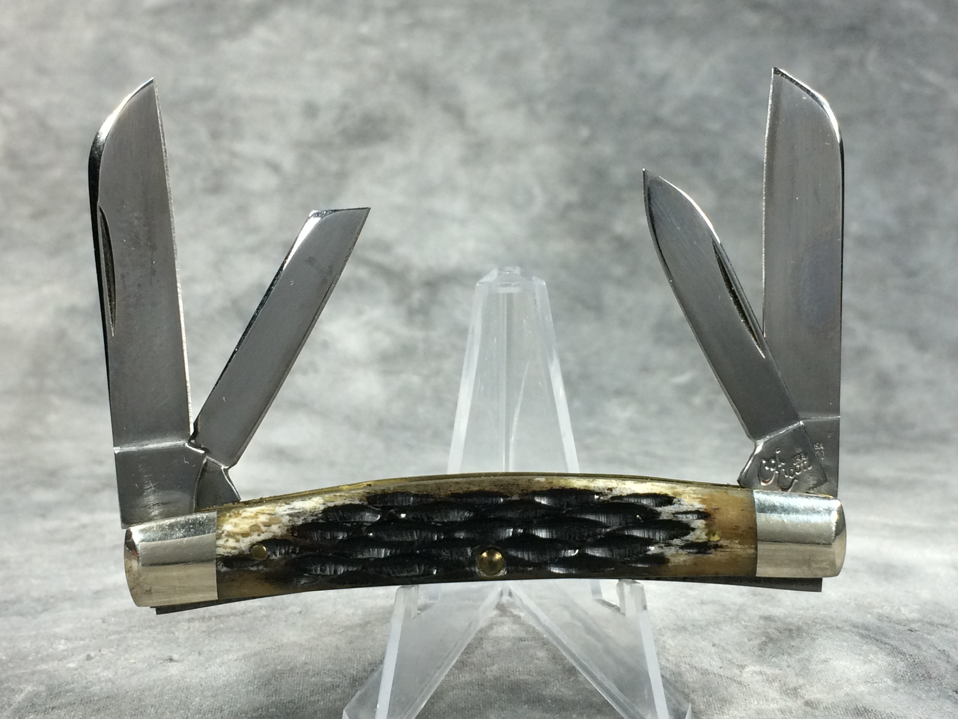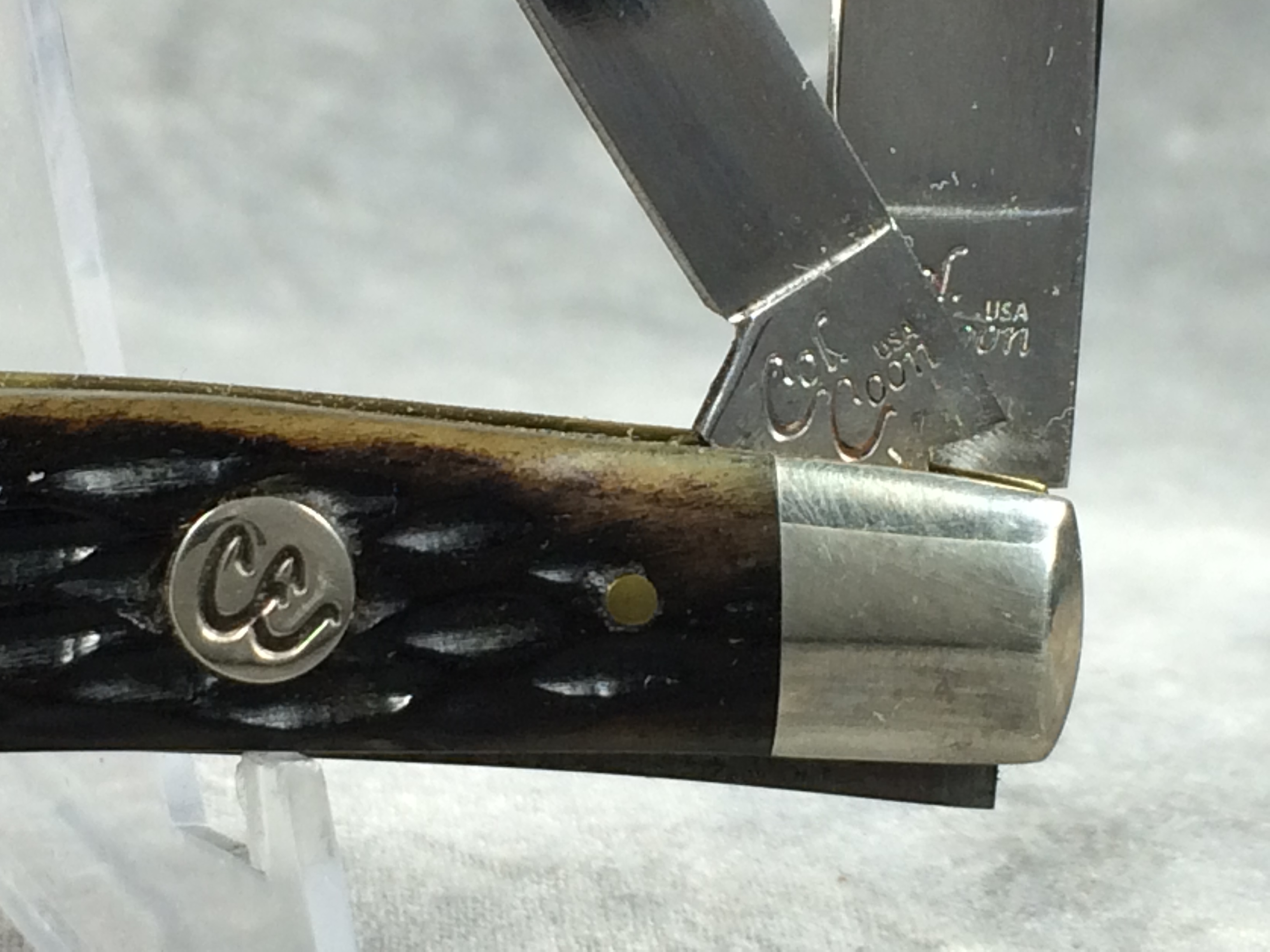 December 04, 2025 - 3-1/2 inches closed. 5-1/2 inches open. "Col. Coon USA" tang stamp. Main blade etched "Colonel Coon 1 of 400". Circle "CC" shield. Black Cherry Jigged Bone handle. Nickel Silver bolsters and brass liner. With original box.