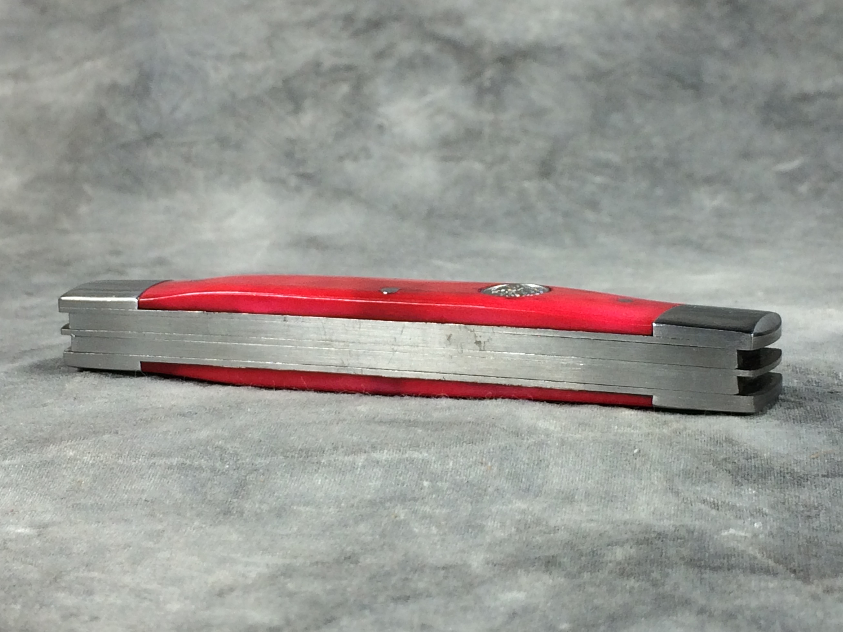 February 03, 2026 - 4-1/8 inches closed. 6-1/2 inches open. "CHIEF BRAND" and "CF0112RD STAINLESS" tang stamps. Smooth red bone handle. Circle Chief shield. Stainless steel bolsters and liner.
