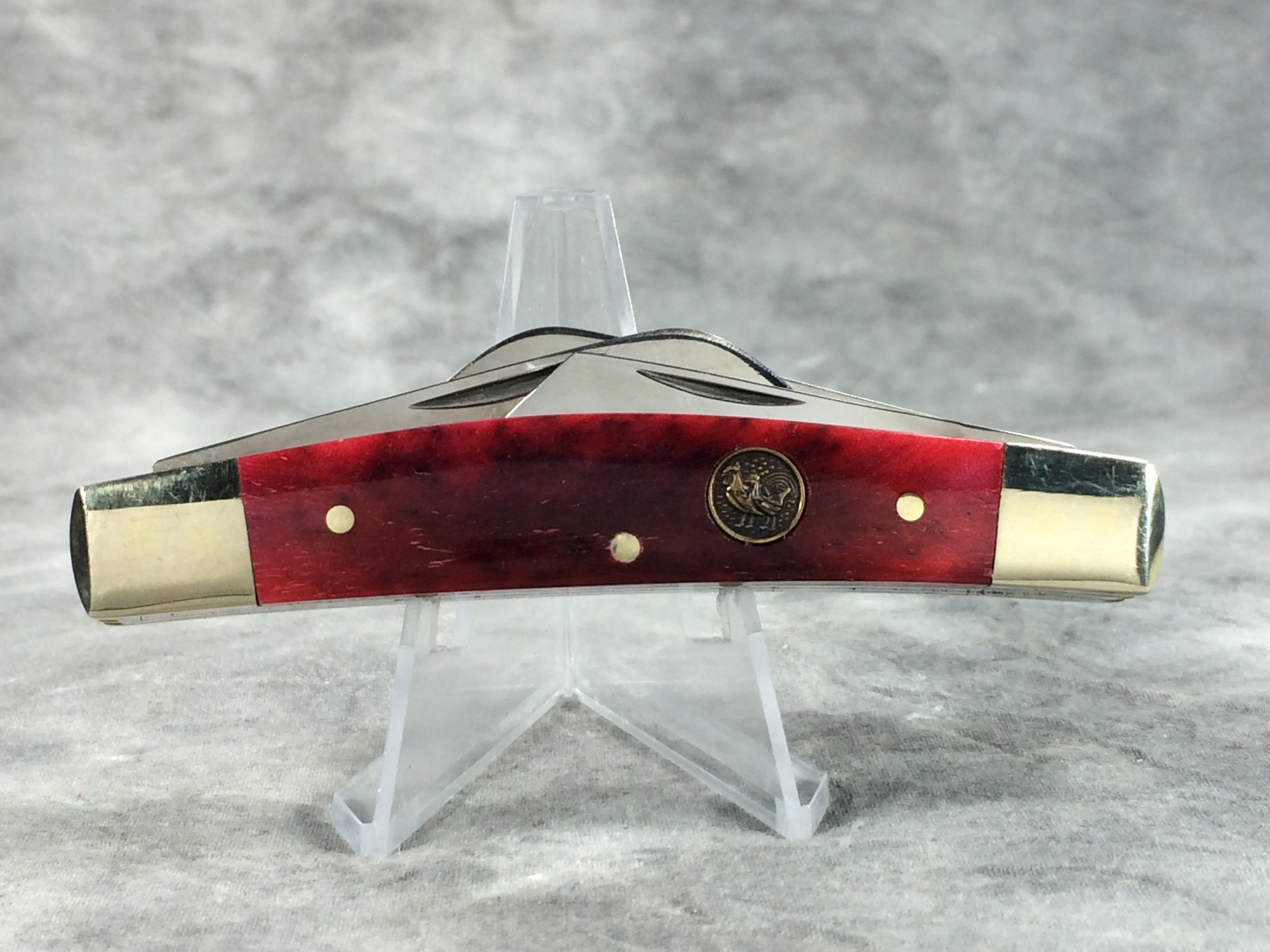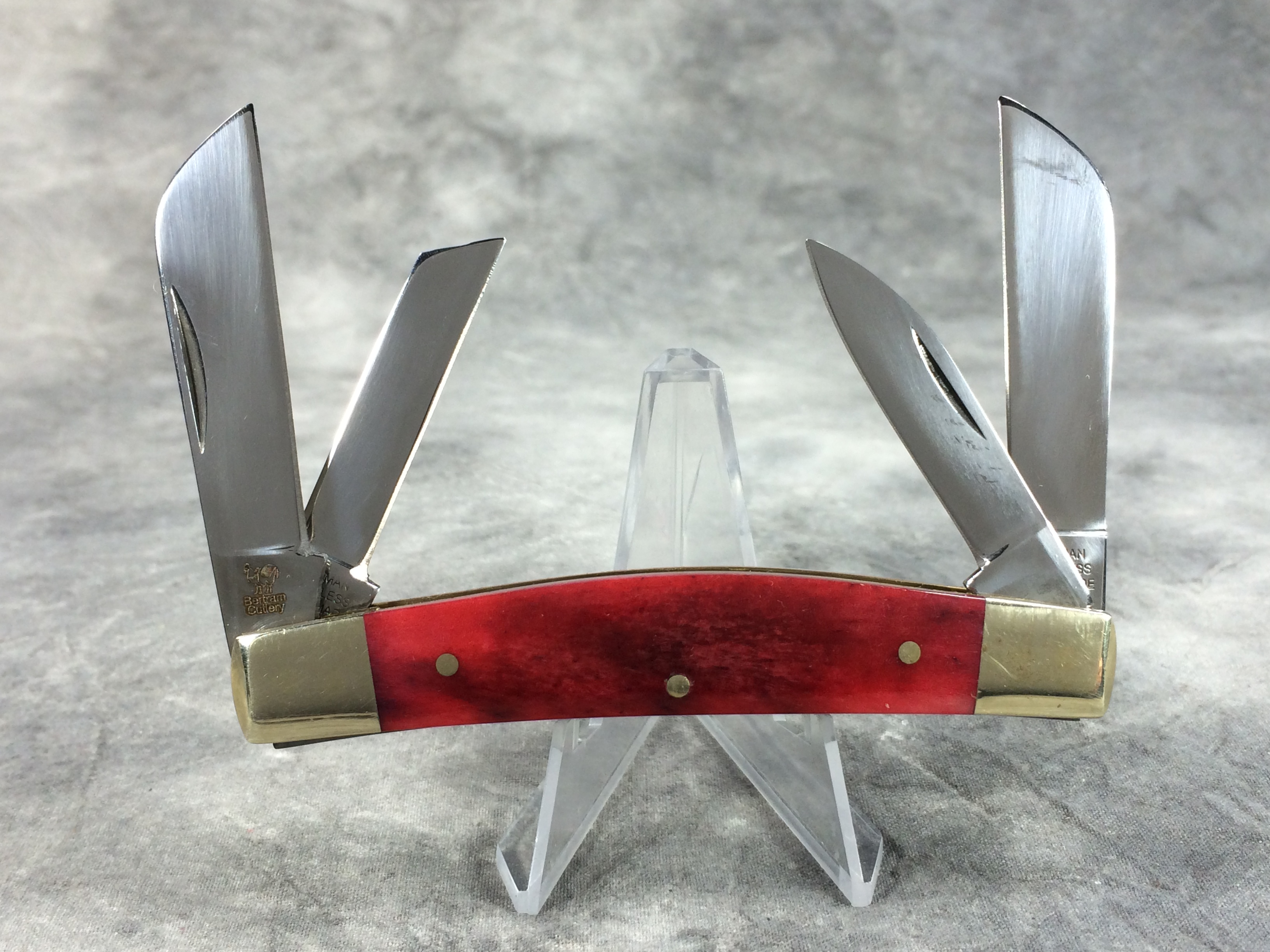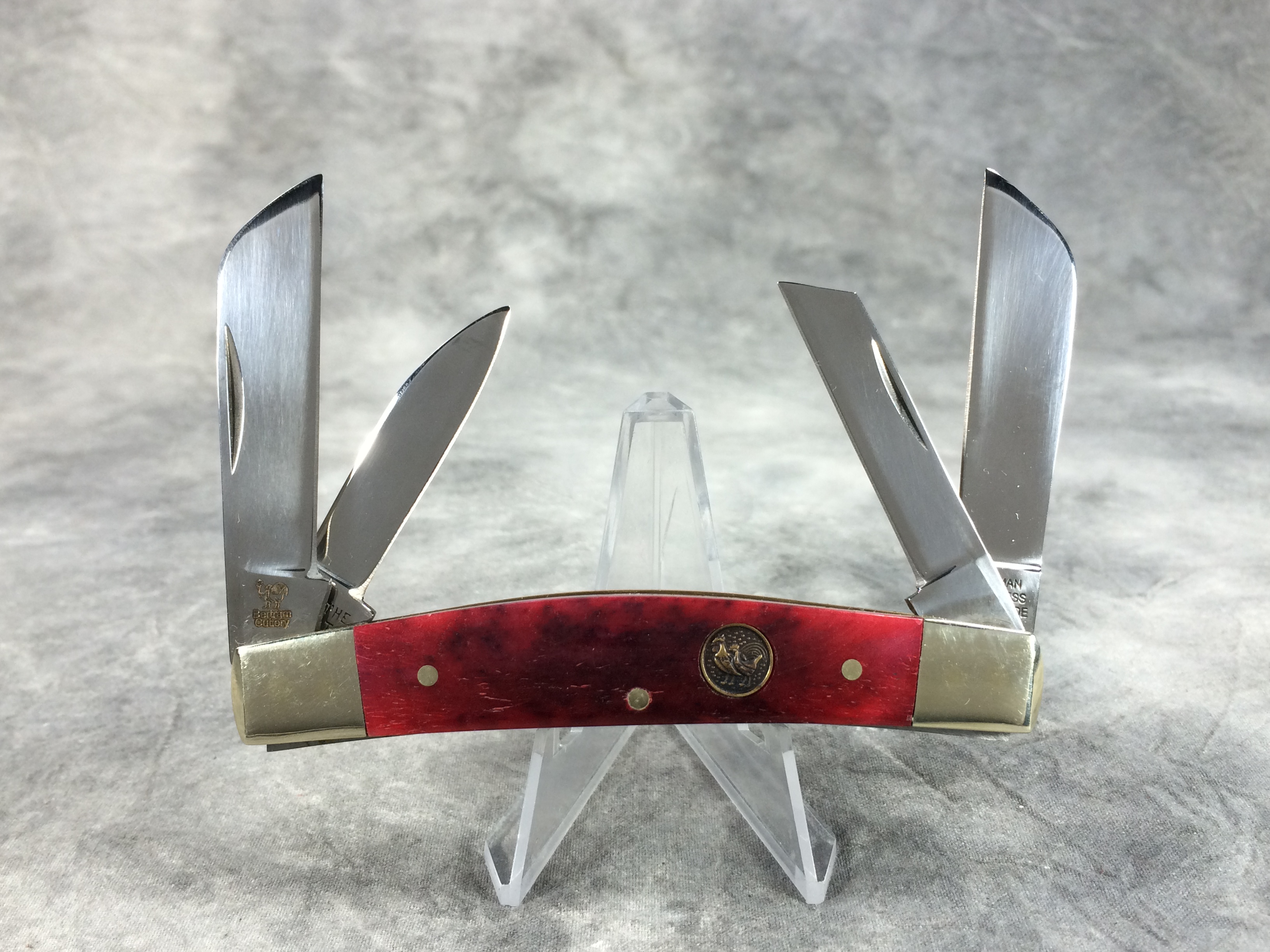 December 04, 2025 - 4-Blade Congress knife. 3-3/4 inches closed. 5-7/8 inches open. "GERMAN STAINLESS HAND MADE 344-BRB", "OIL THE JOINTS", and "Bertram Cutlery" under logo tang stamps. Stainless steel blades. Smooth red bone handle. Circle Hen & Rooster logo shield. Nickel silver bolsters, brass liner.