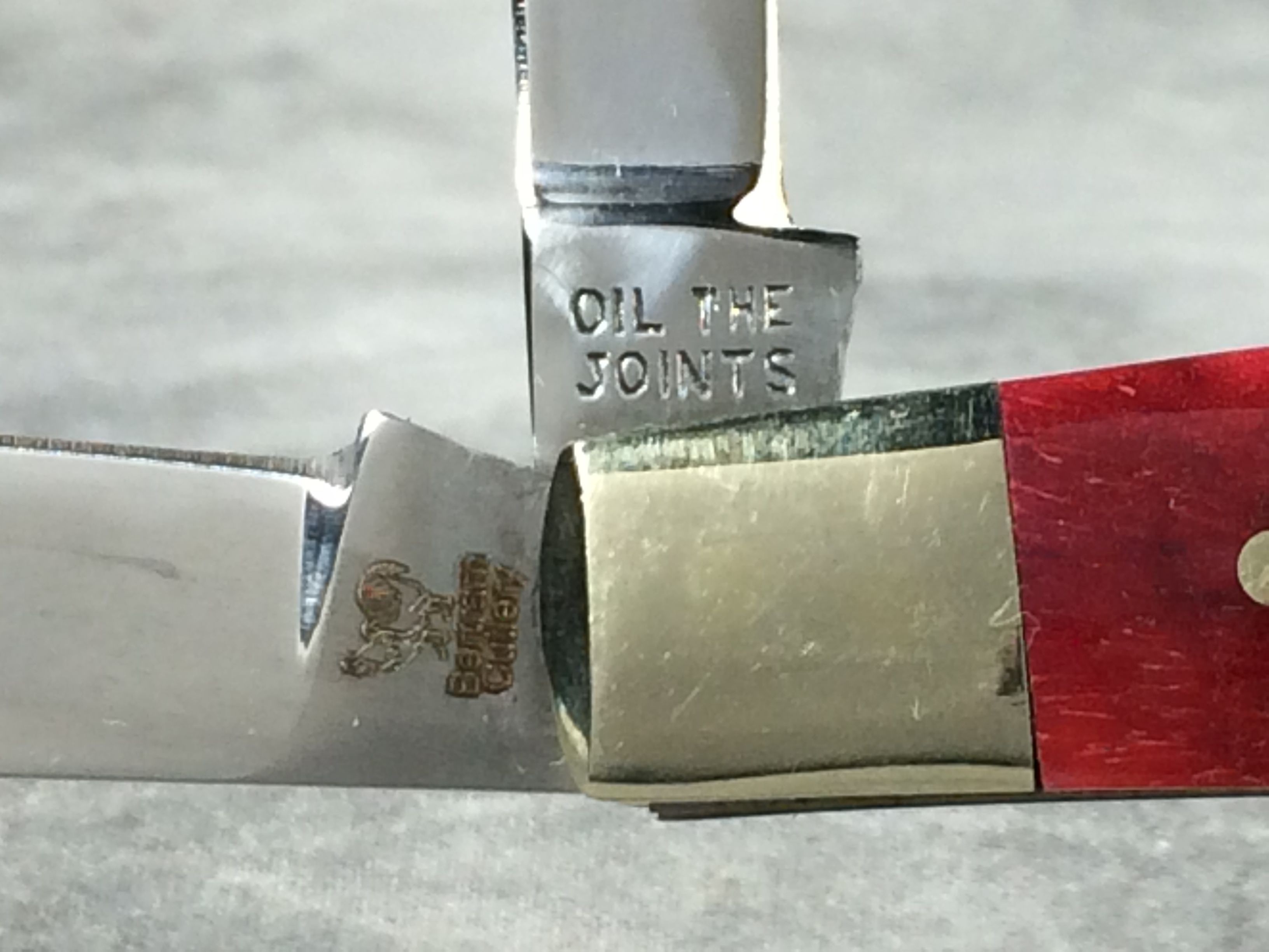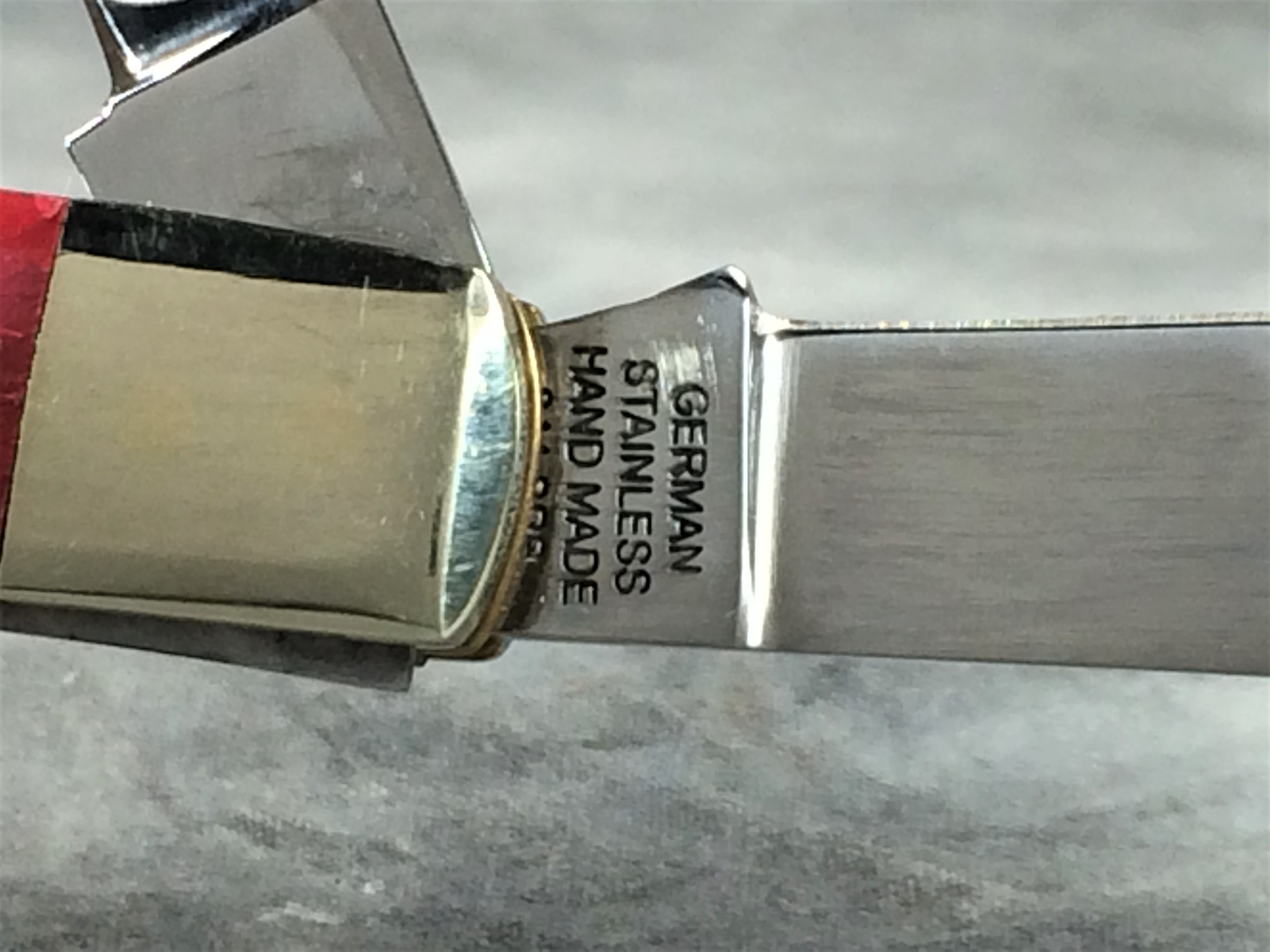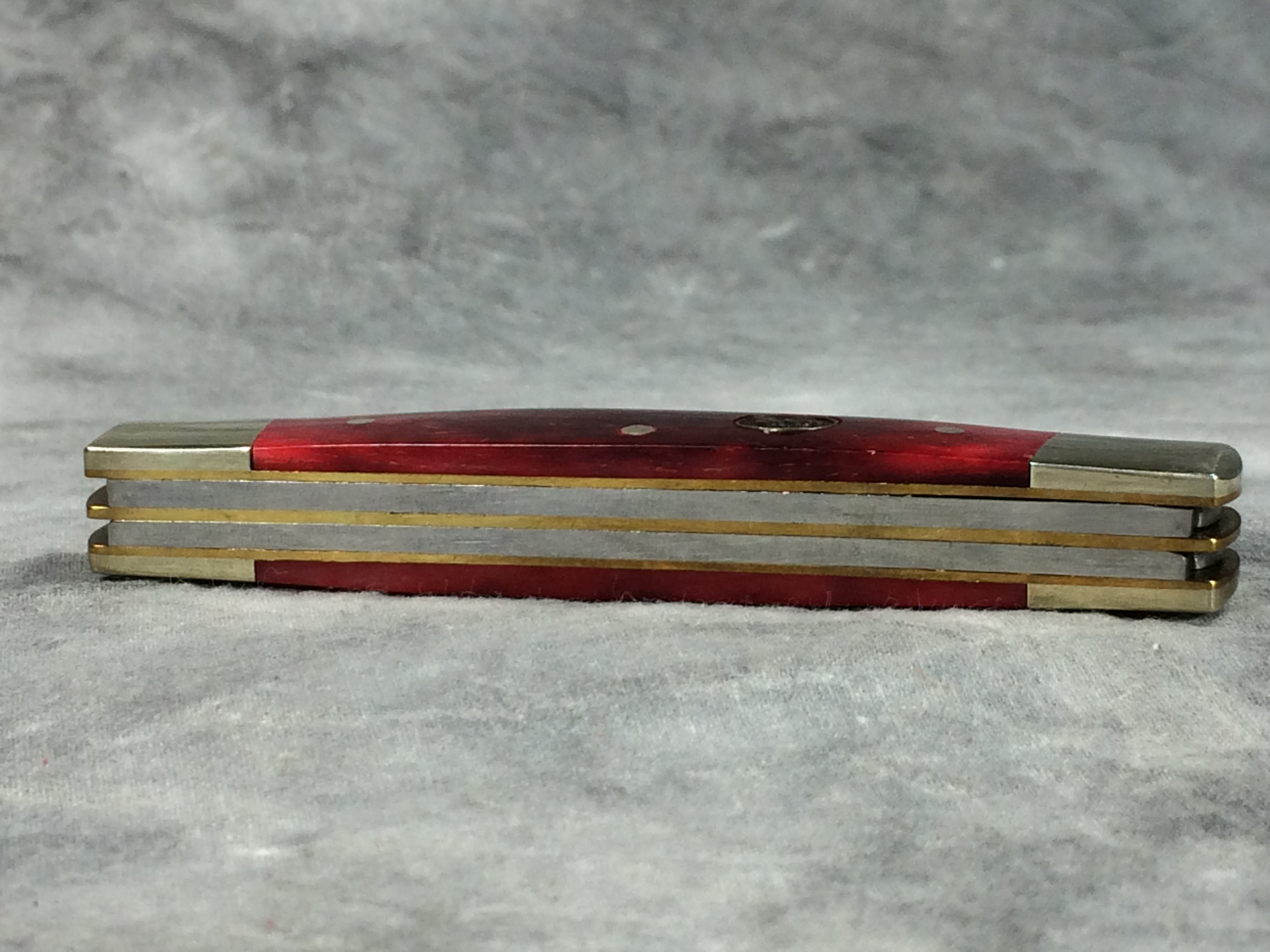 December 04, 2025 - 4-Blade Congress knife. 3-3/4 inches closed. 5-7/8 inches open. "GERMAN STAINLESS HAND MADE 344-BRB", "OIL THE JOINTS", and "Bertram Cutlery" under logo tang stamps. Stainless steel blades. Smooth red bone handle. Circle Hen & Rooster logo shield. Nickel silver bolsters, brass liner.