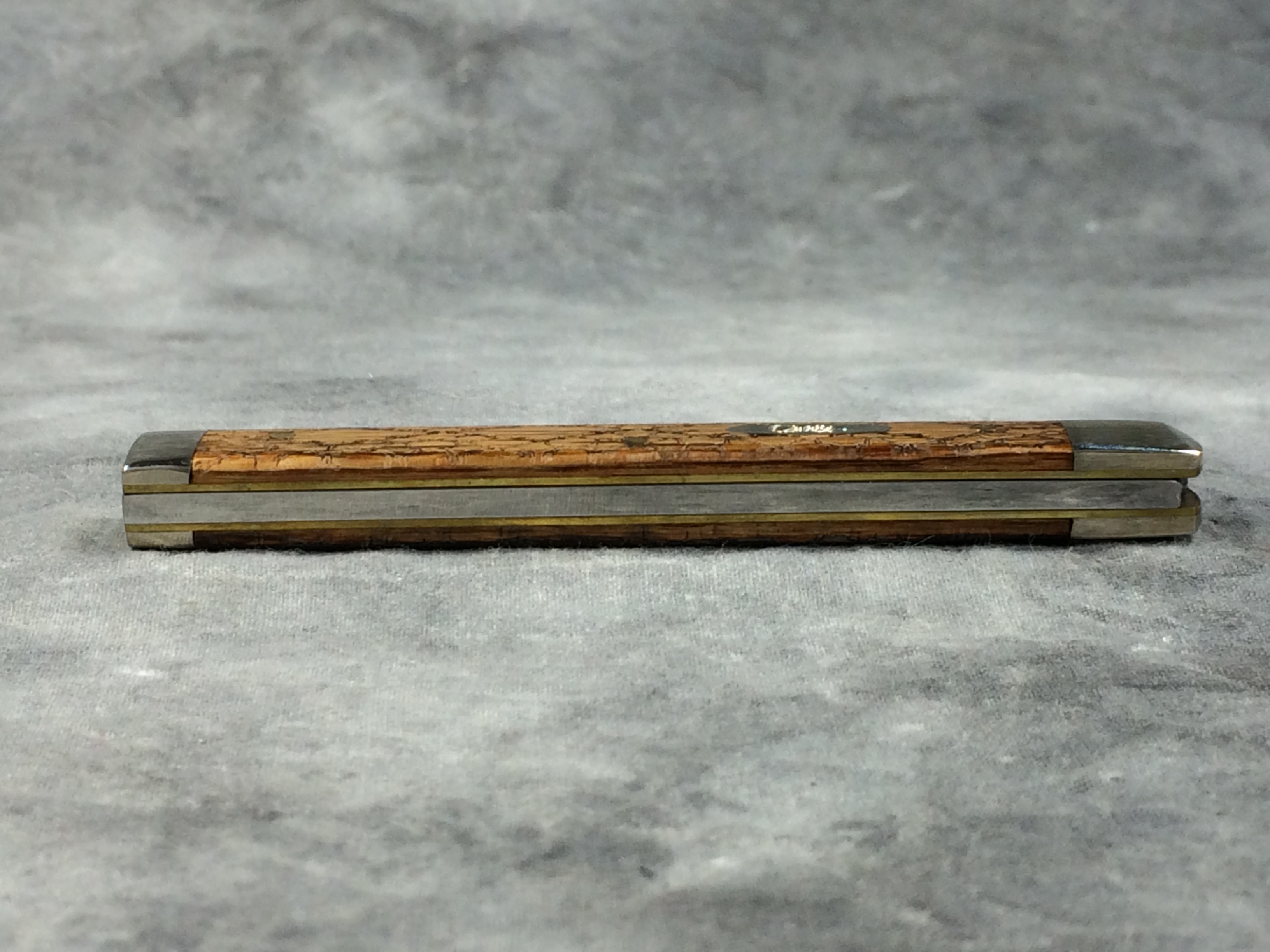October 26, 2025 - 3-5/8 inches closed. 6-5/8 inches open. Made in USA. "  x x  Case XX  x x x " (with lightning bolt S) and "USA 7185 SS" tang stamps. Oval 'Long C' Case XX shield. Stainless Steel blades.  Oak wood handles with rattlesnake laser-etched design. Nickel Silver bolsters. Brass liner.