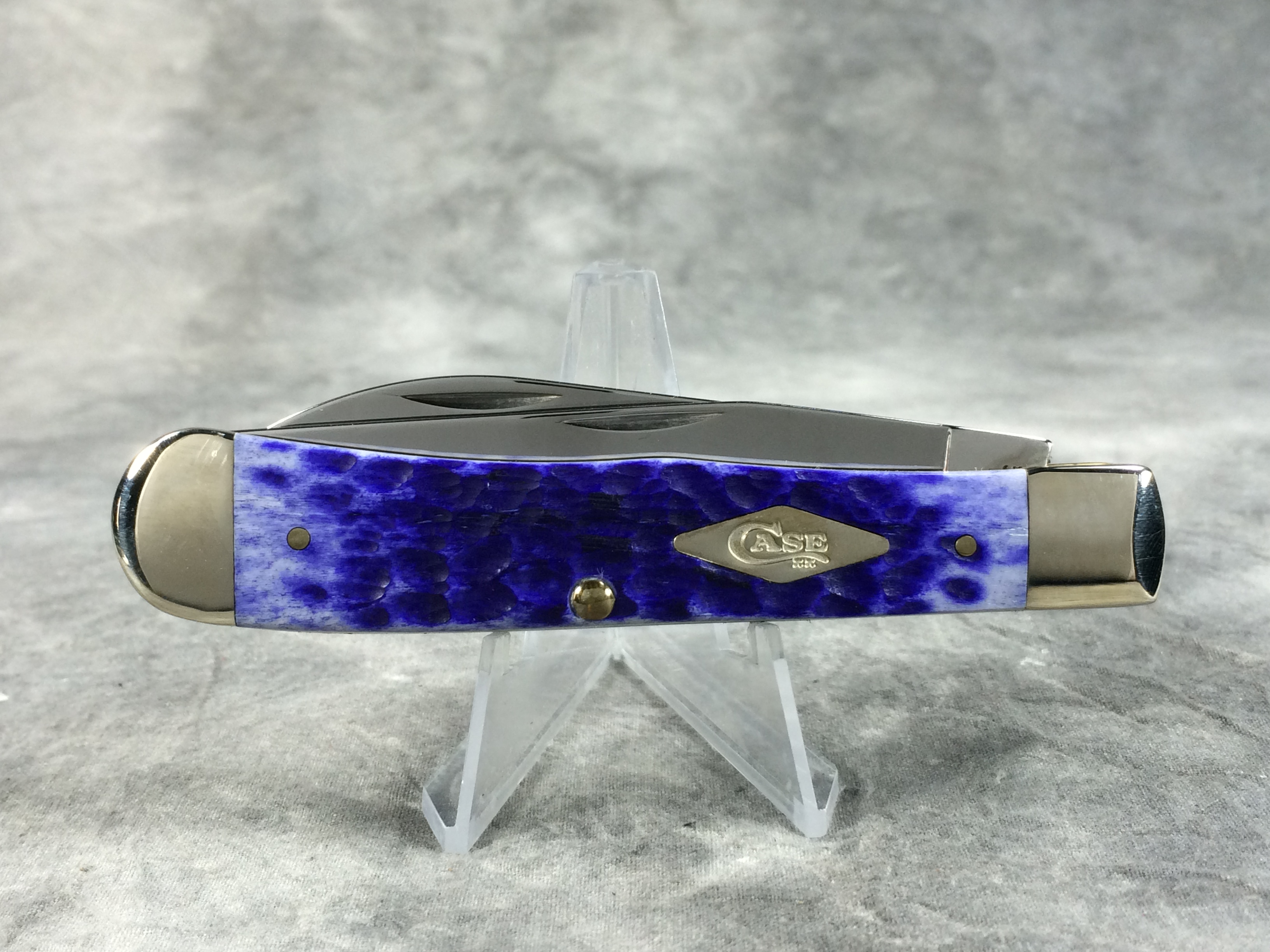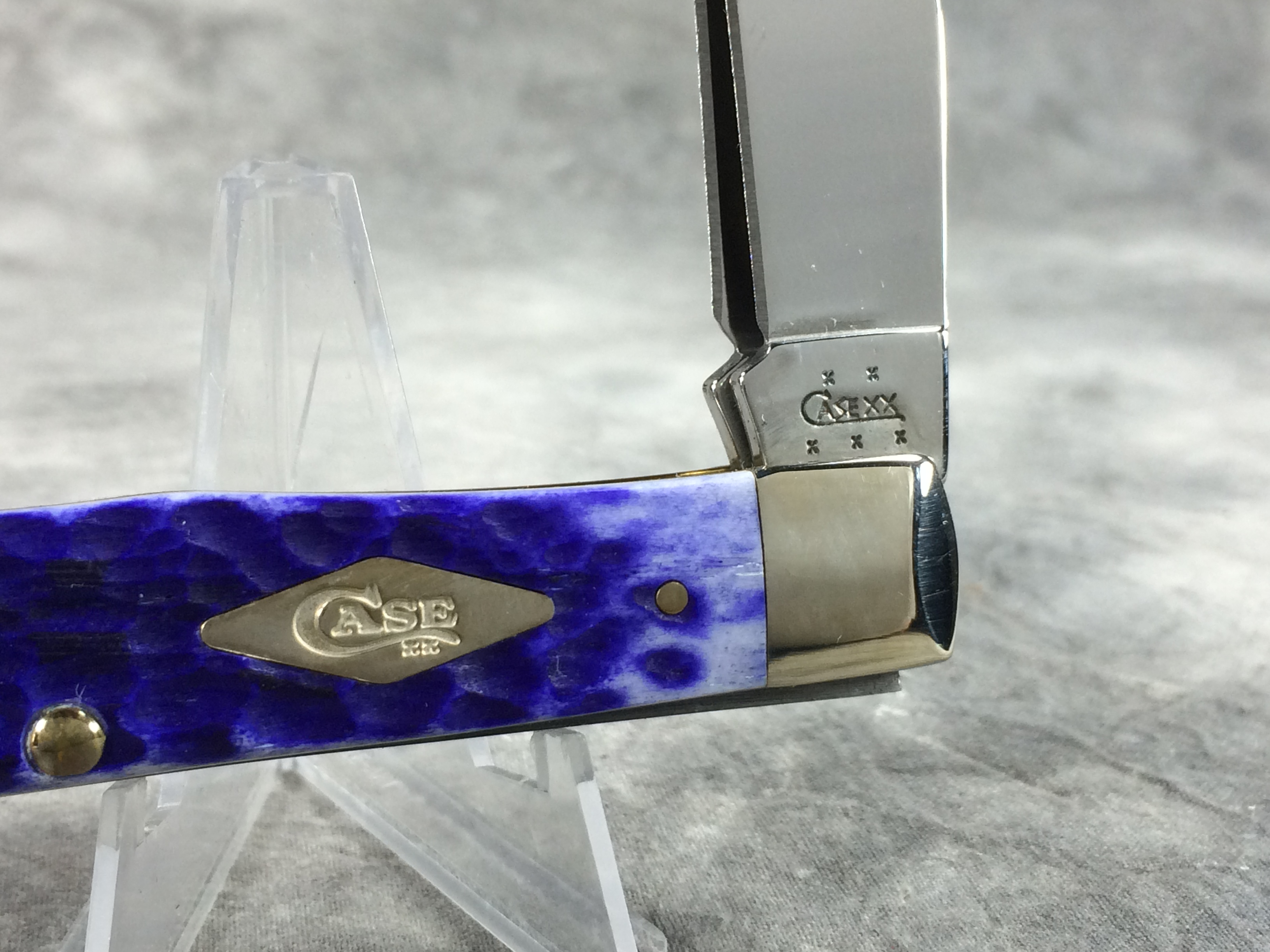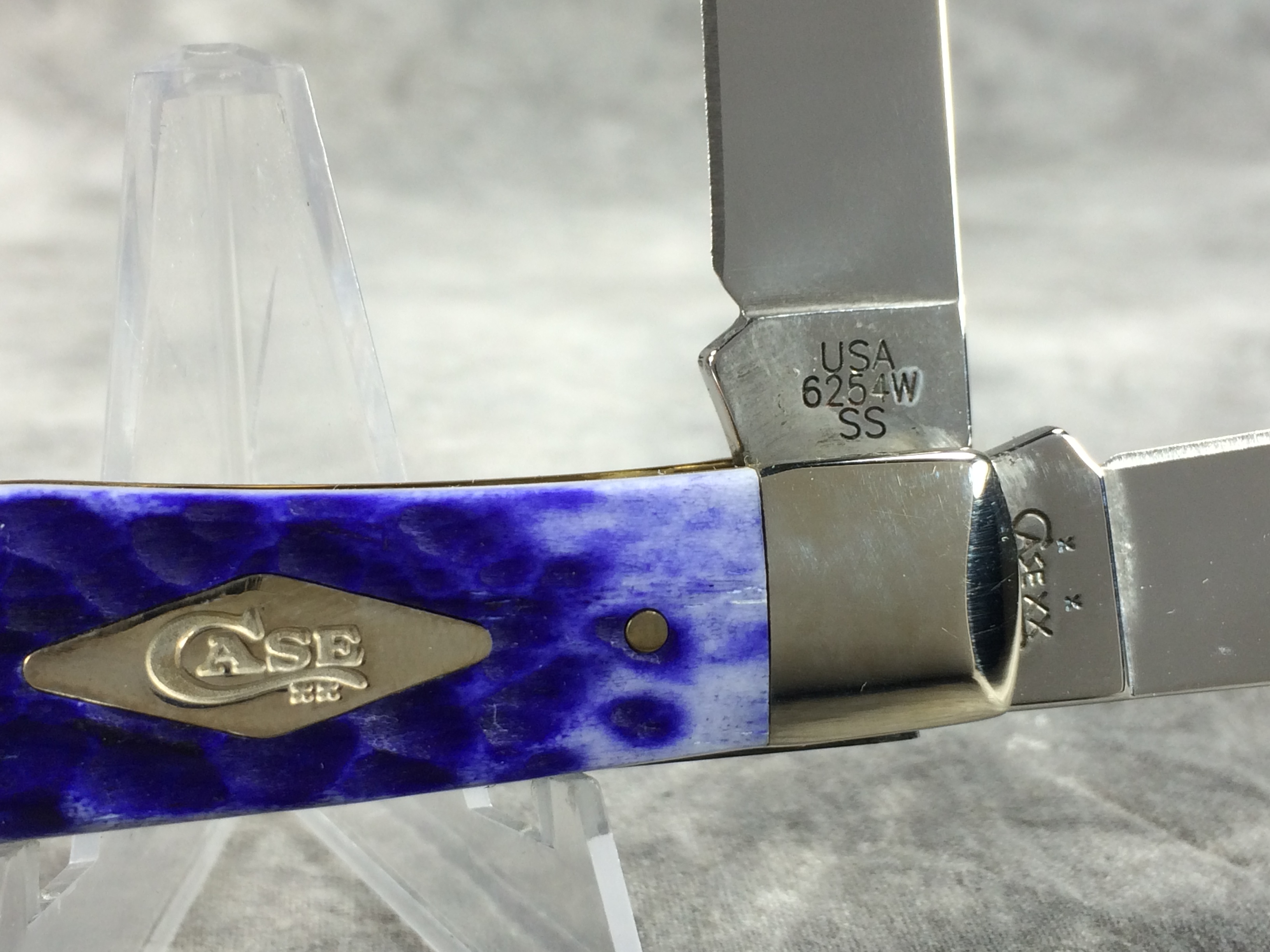 April 05, 2026 - 4-1/8 inches closed. 7-3/8 inches open. Made in USA. "  x x  CASE XX  x x x  " and "USA 6254W SS" tang stamps. Long-C "Case xx" diamond shield. Stainless Steel blades. Violet / Purple jigged bone handle. Nickel Silver bolsters. Brass liner.