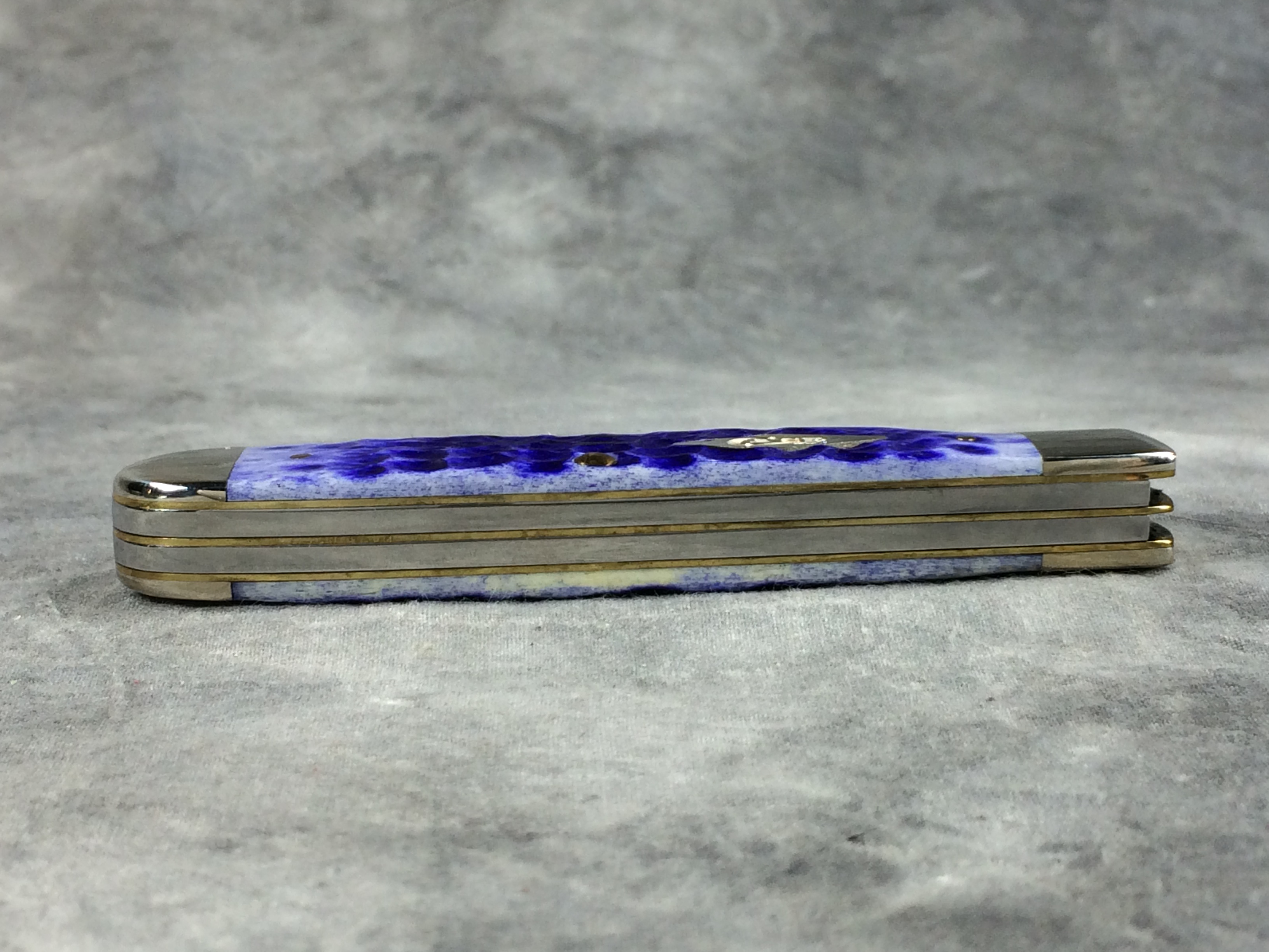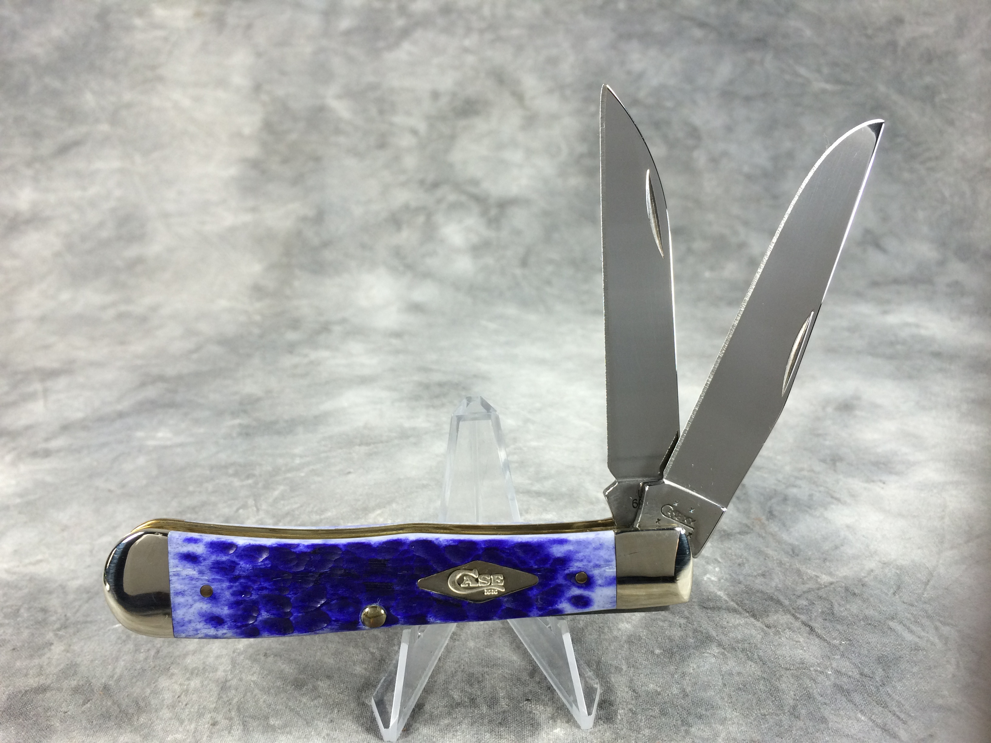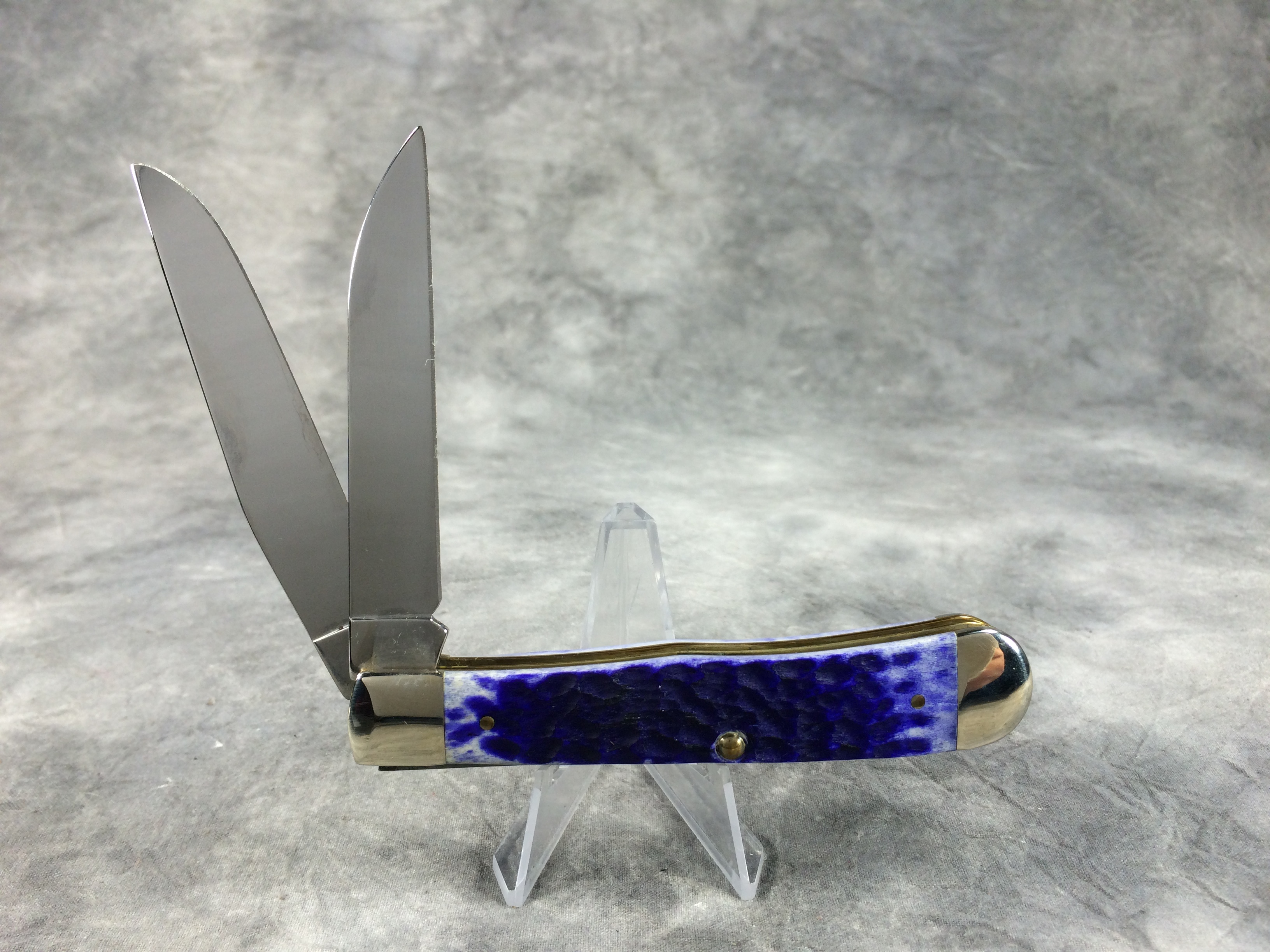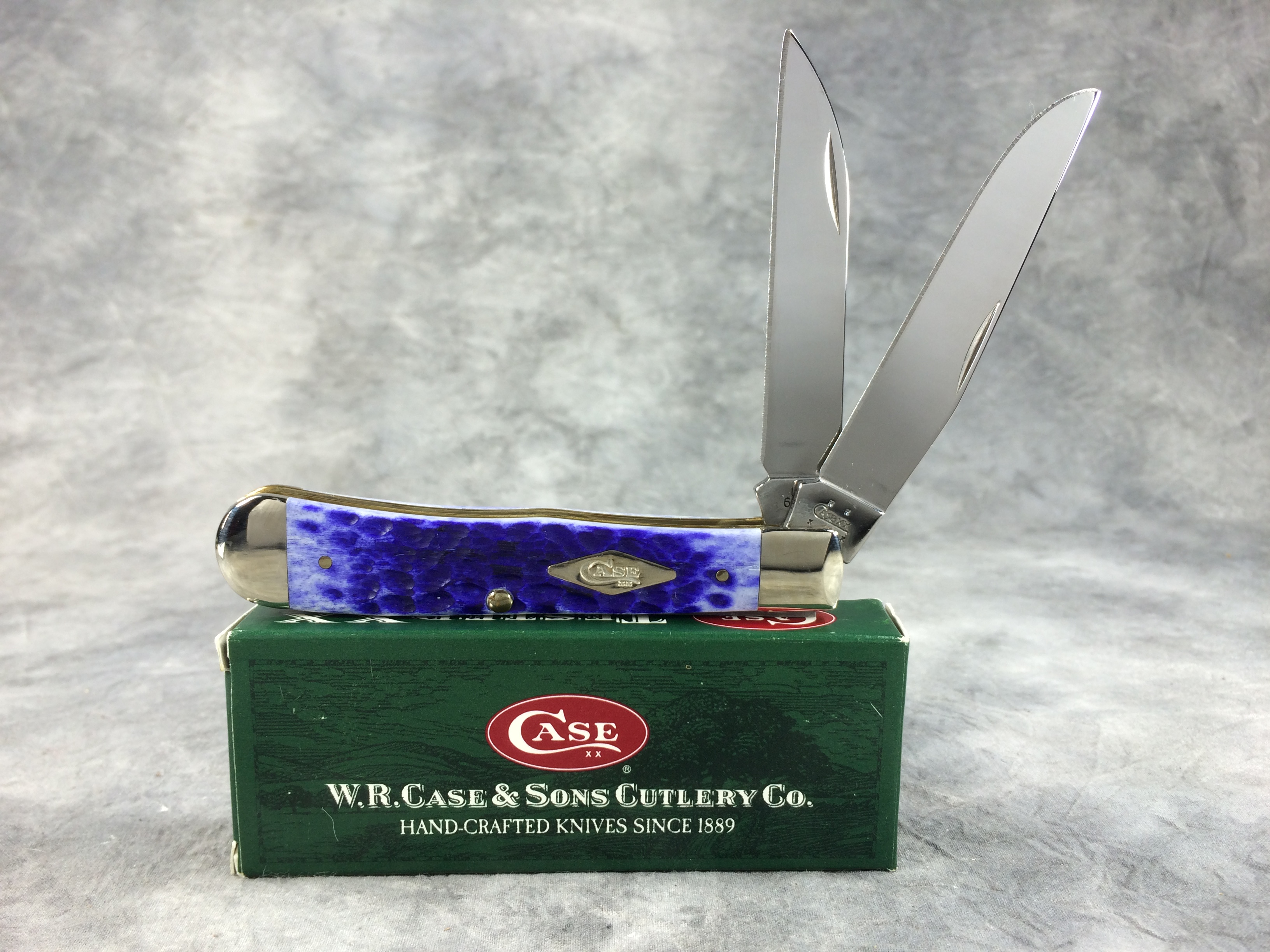 April 05, 2026 - 4-1/8 inches closed. 7-3/8 inches open. Made in USA. "  x x  CASE XX  x x x  " and "USA 6254W SS" tang stamps. Long-C "Case xx" diamond shield. Stainless Steel blades. Violet / Purple jigged bone handle. Nickel Silver bolsters. Brass liner.