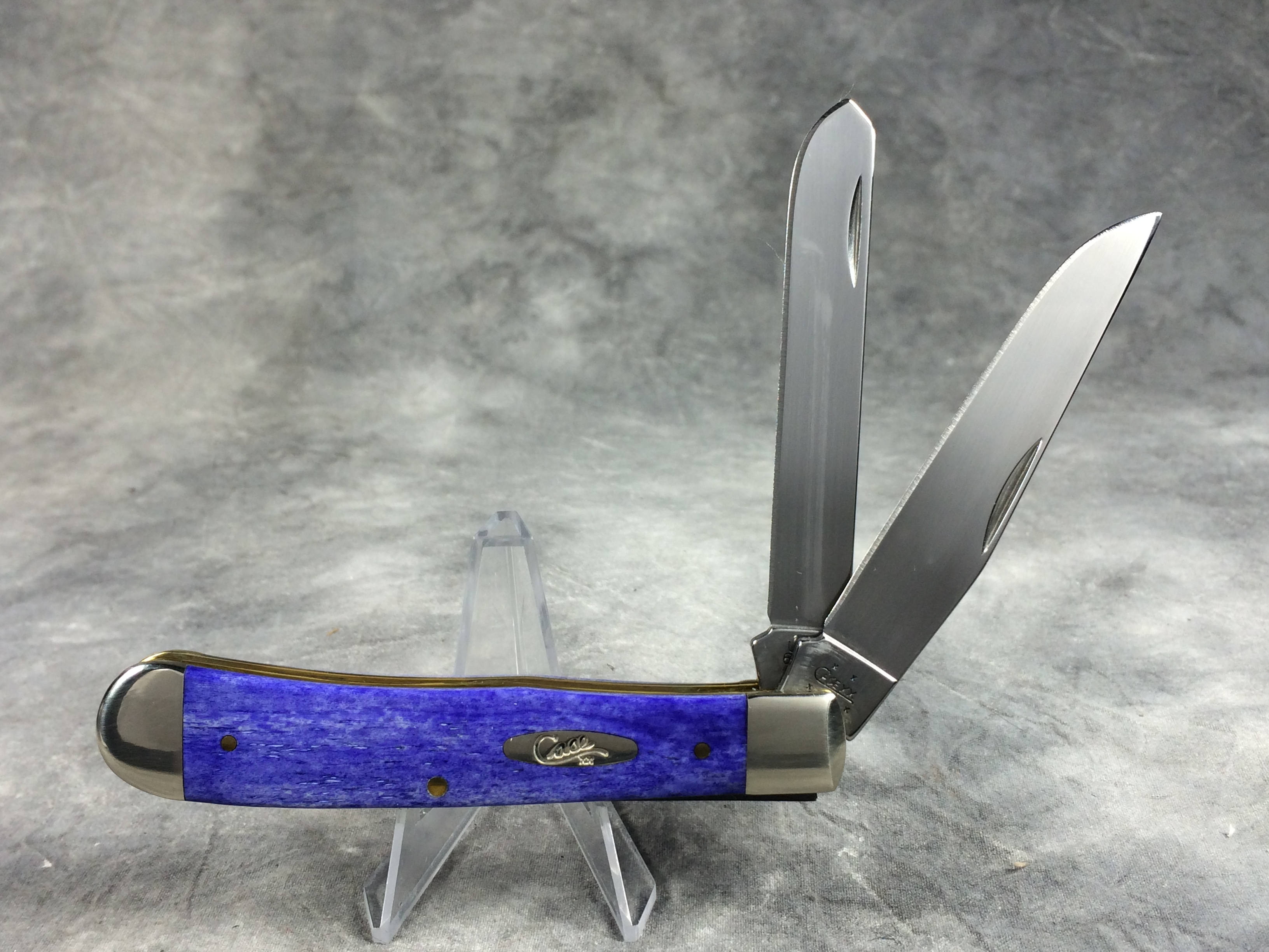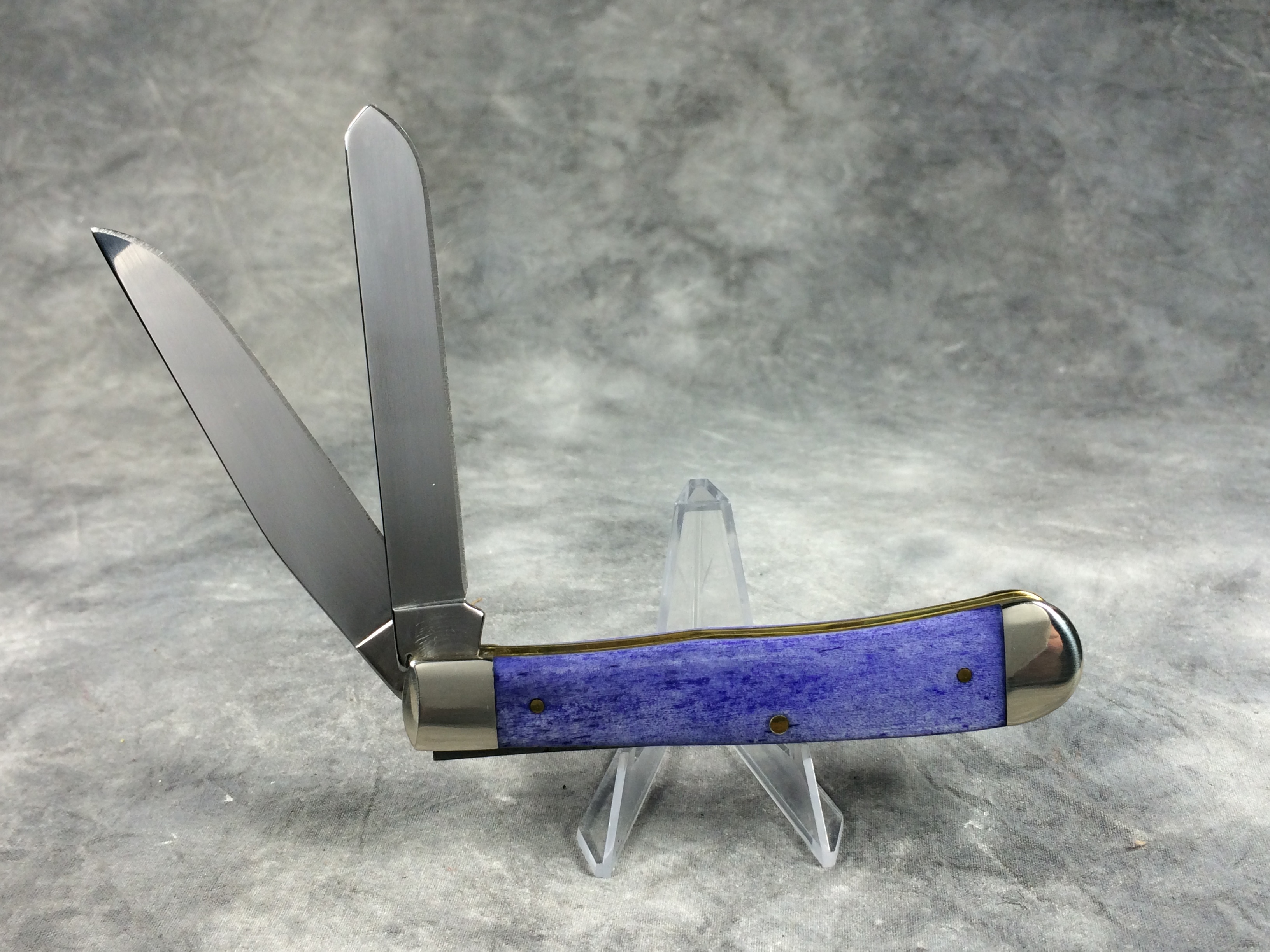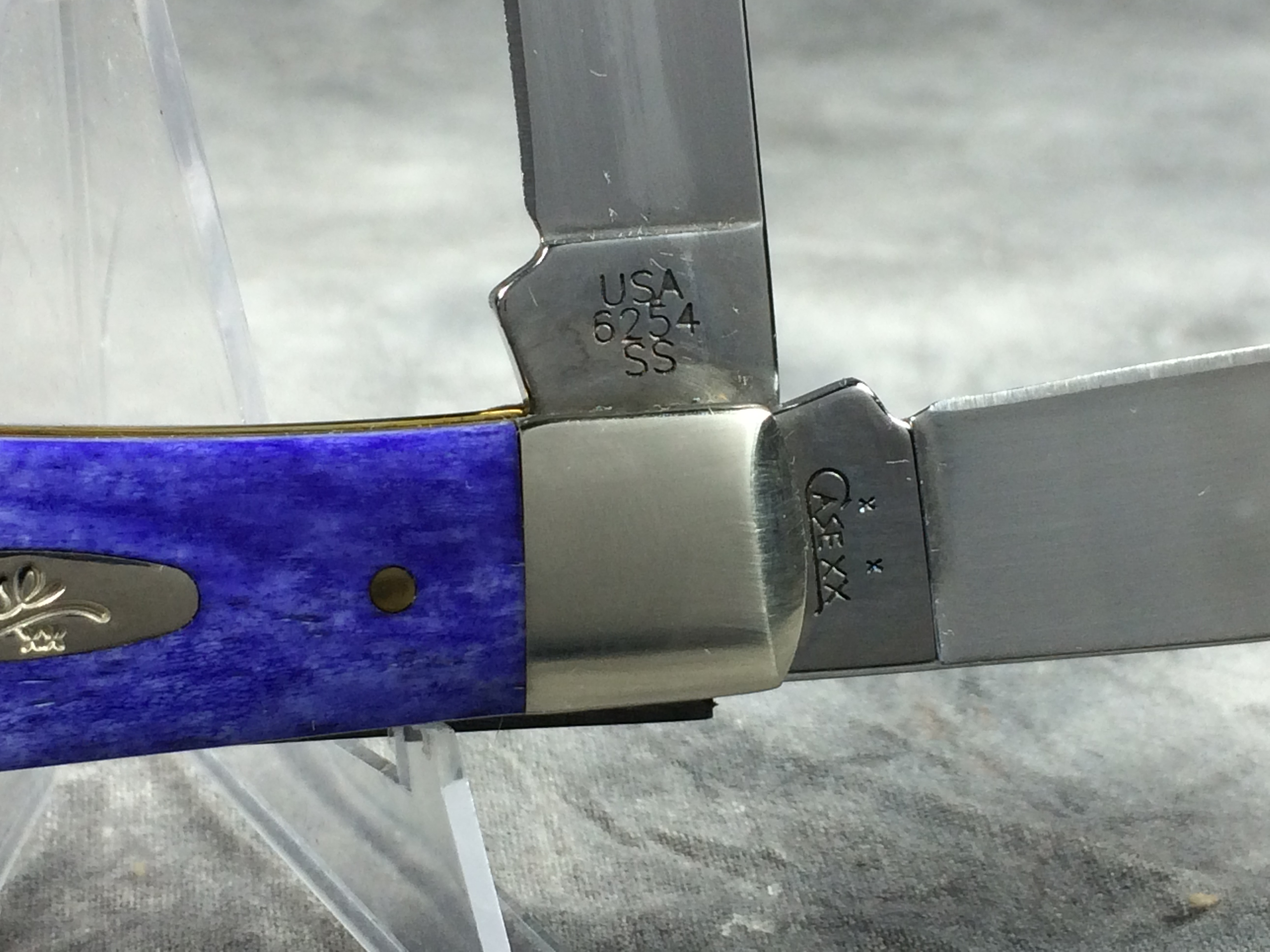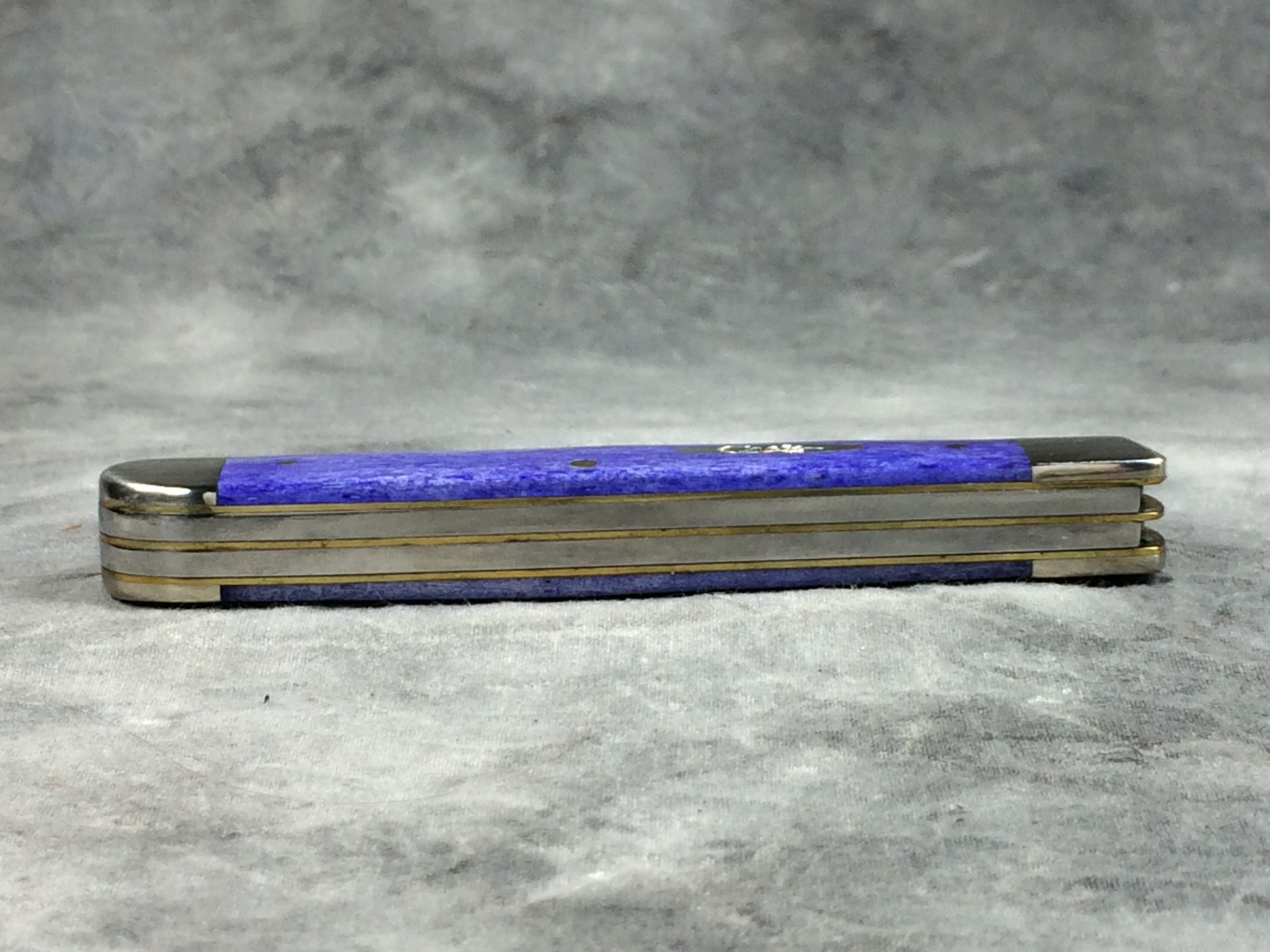 December 25, 2025 - 4-1/8 inches closed. 7-3/8 inches open. Made in USA. "  x x  CASE XX  x x x  " and "USA 6254 SS" tang stamps. Oval Long-C "Case xx" shield. Stainless Steel blades. Violet / Purple smooth bone handle. Nickel Silver bolsters. Brass liner.