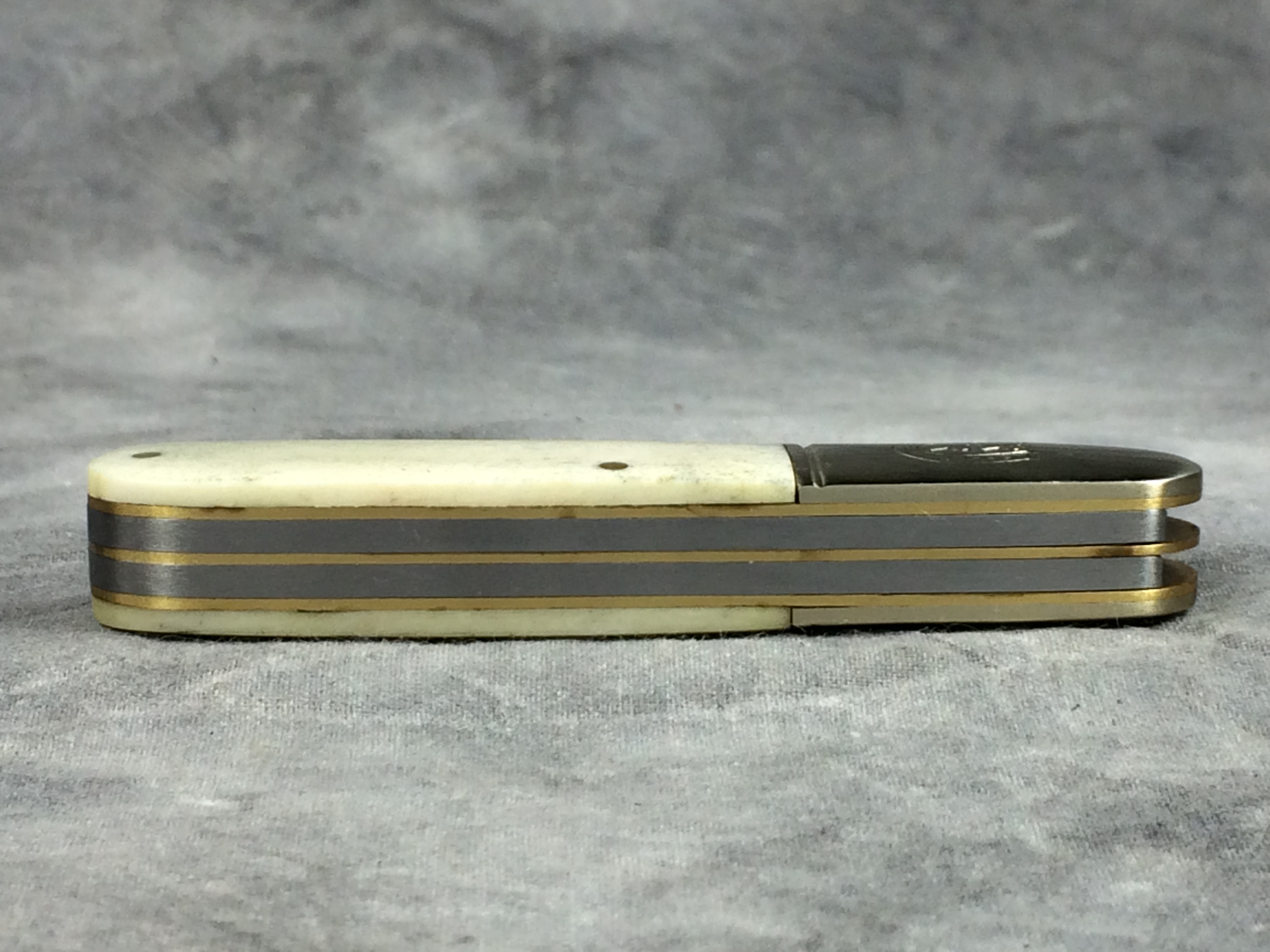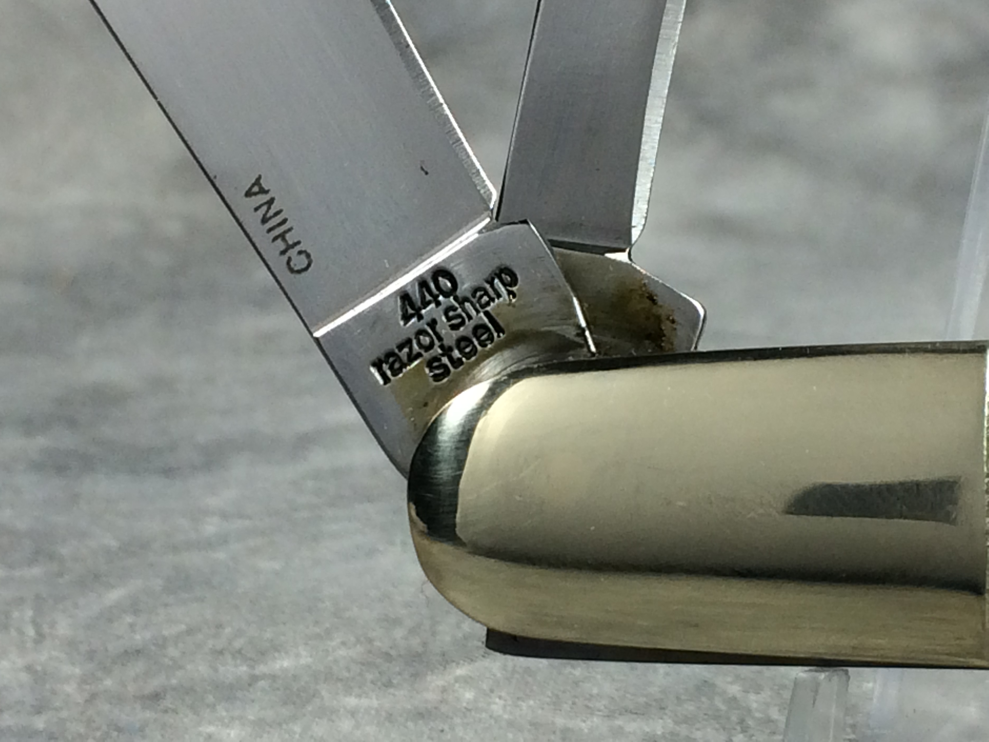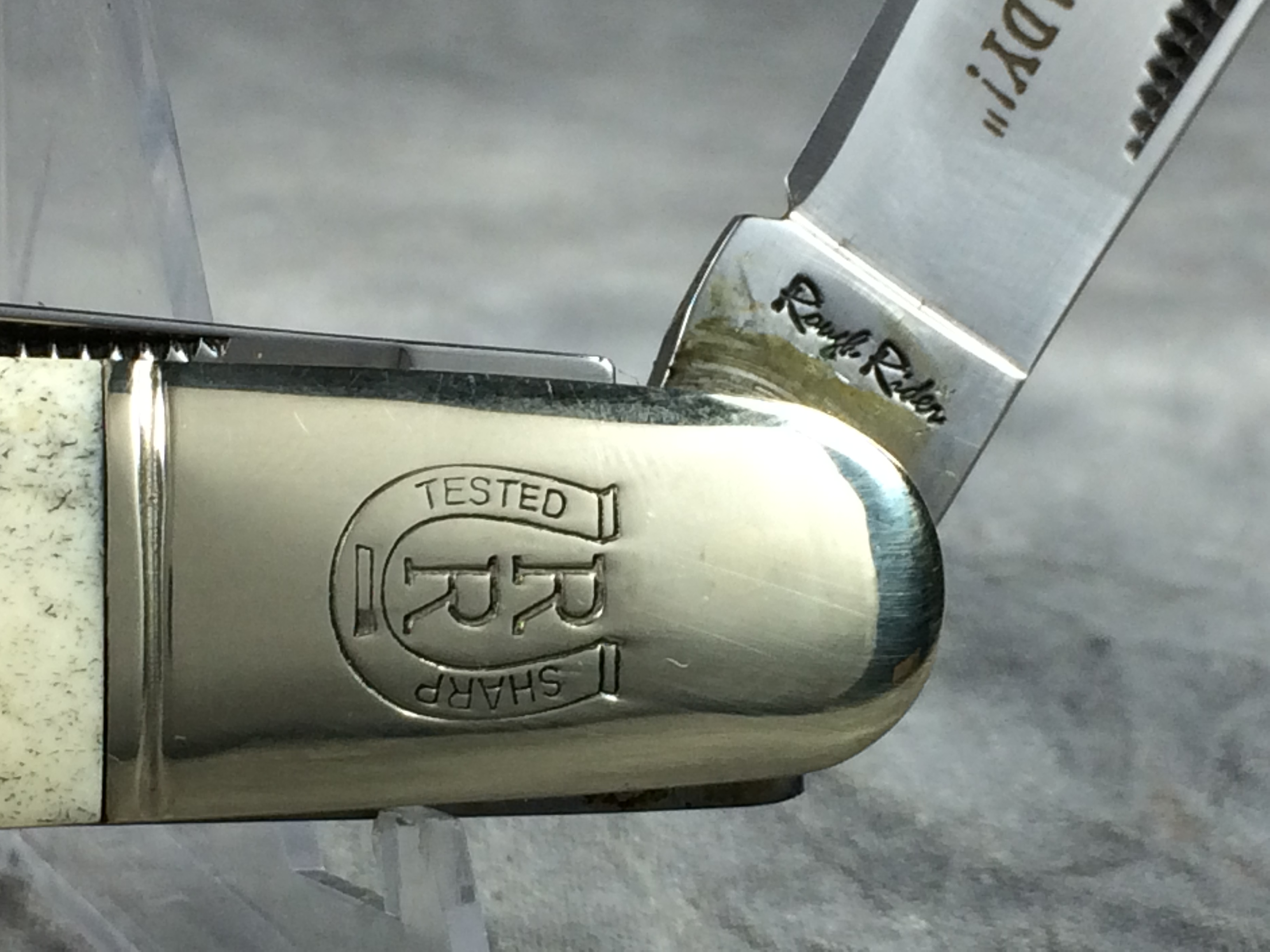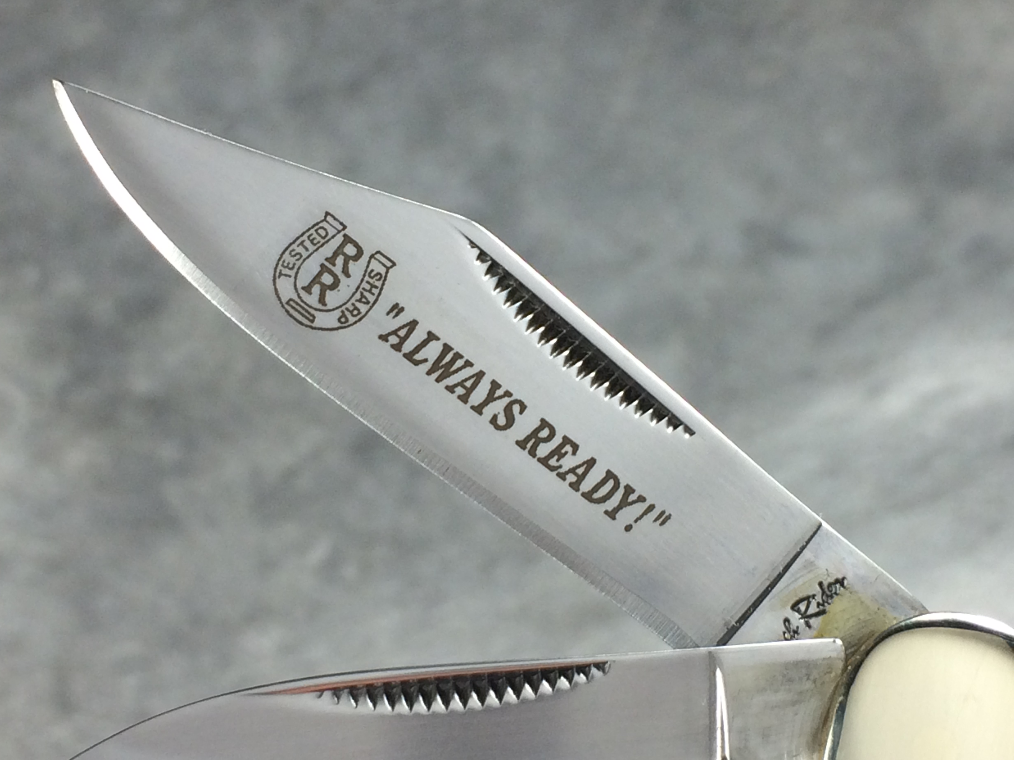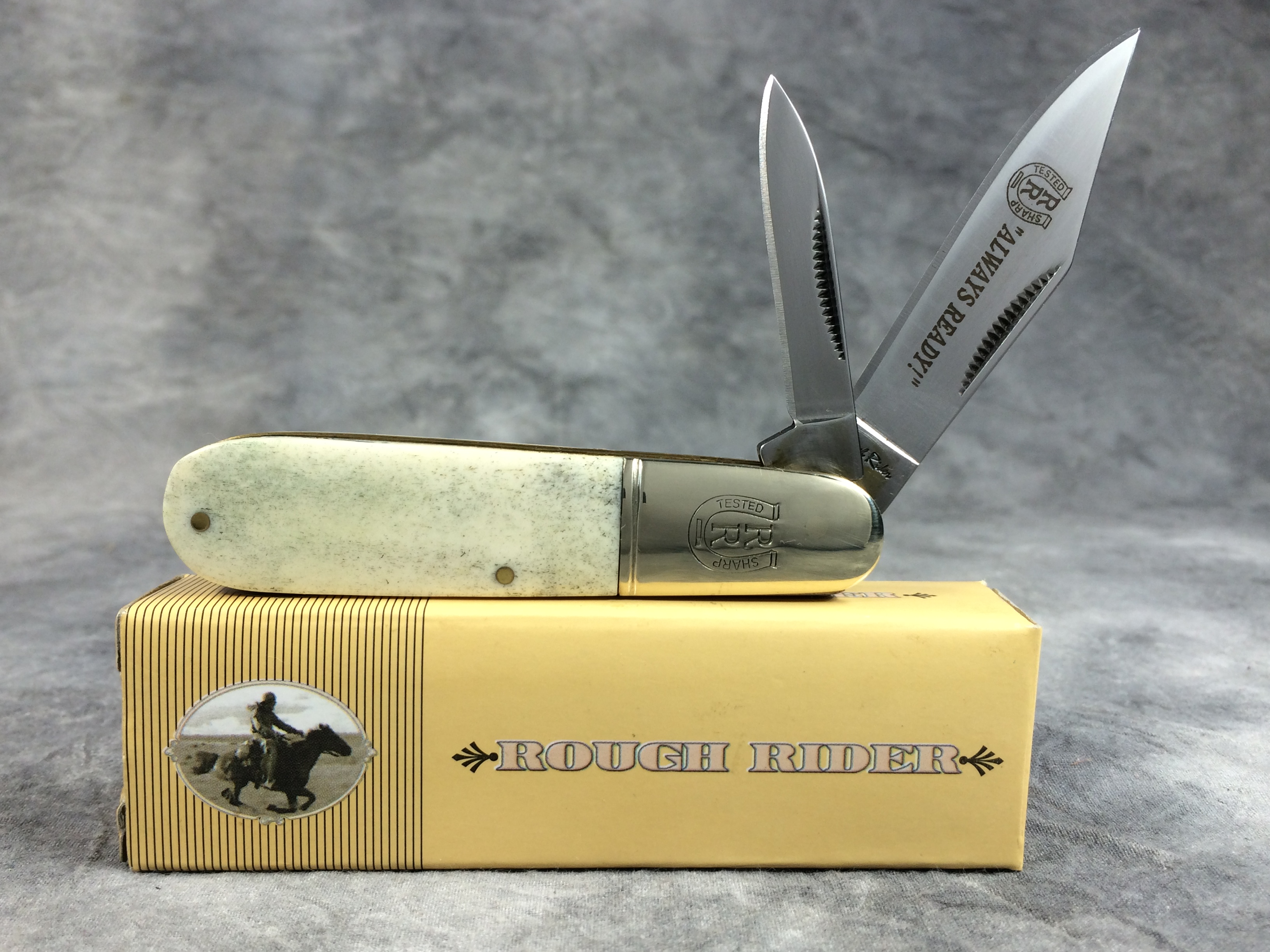 December 04, 2025 - 3-1/4 inches closed. 5-3/4 inches open. "Rough Rider" and "440 razor sharp steel" tang stamps. 440 Stainless Steel blades. Main blade etched with Rough Rider logo and "Always Ready!" on the front and "CHINA" on the back. Smooth White Bone handle. Nickel silver bolsters. Front bolster deep-etched with Rough Rider logo. Brass liner. With original box.