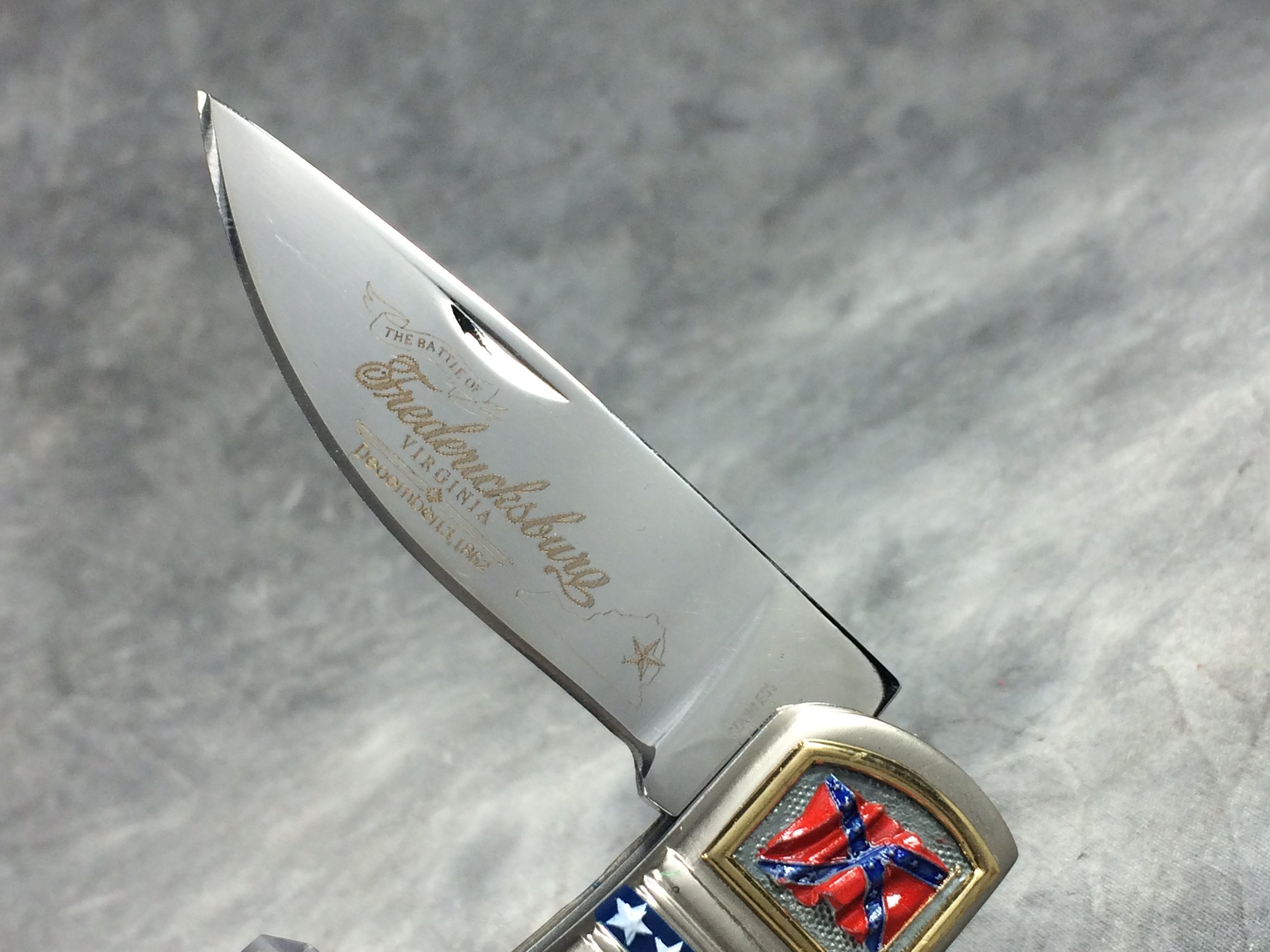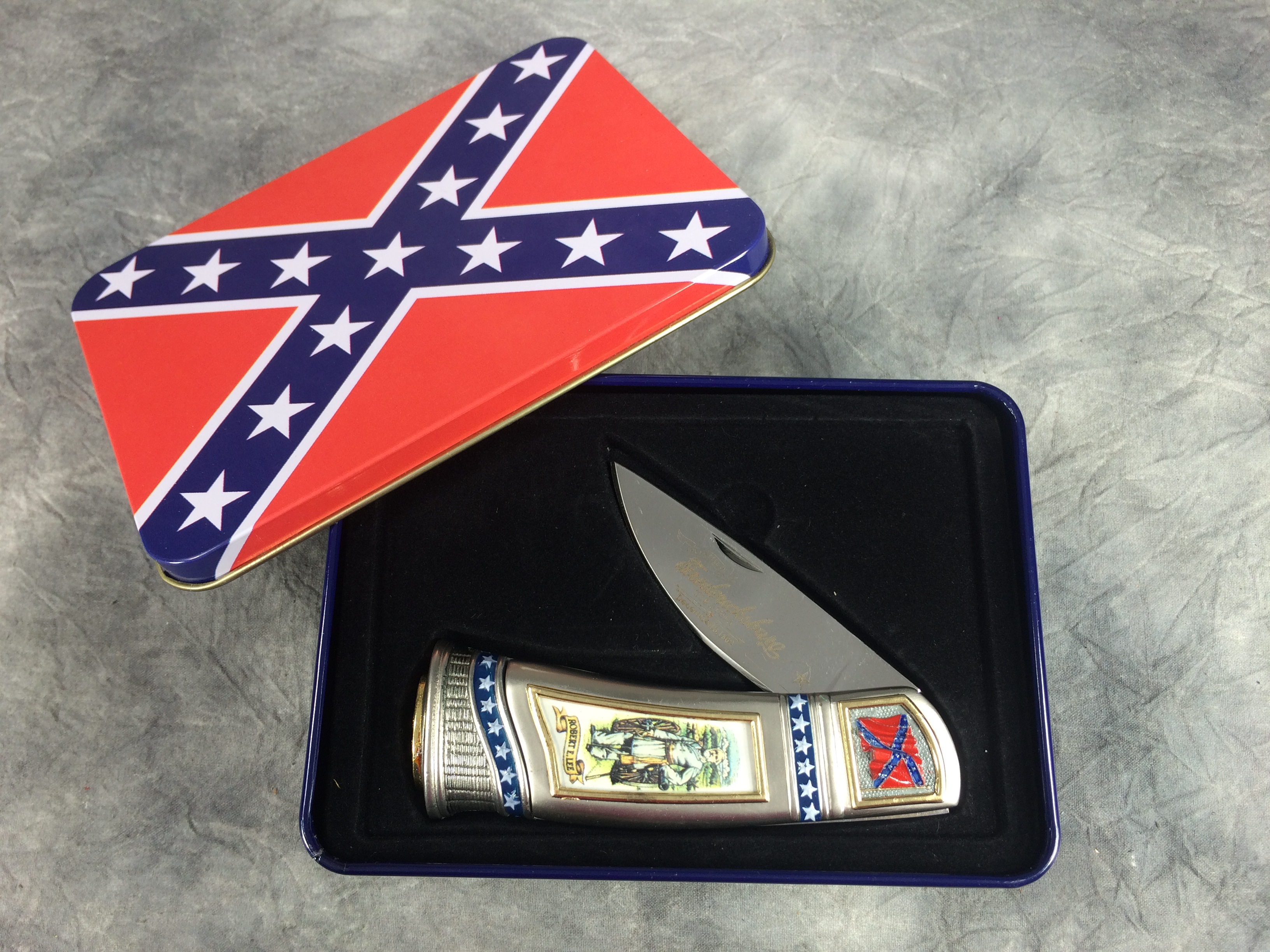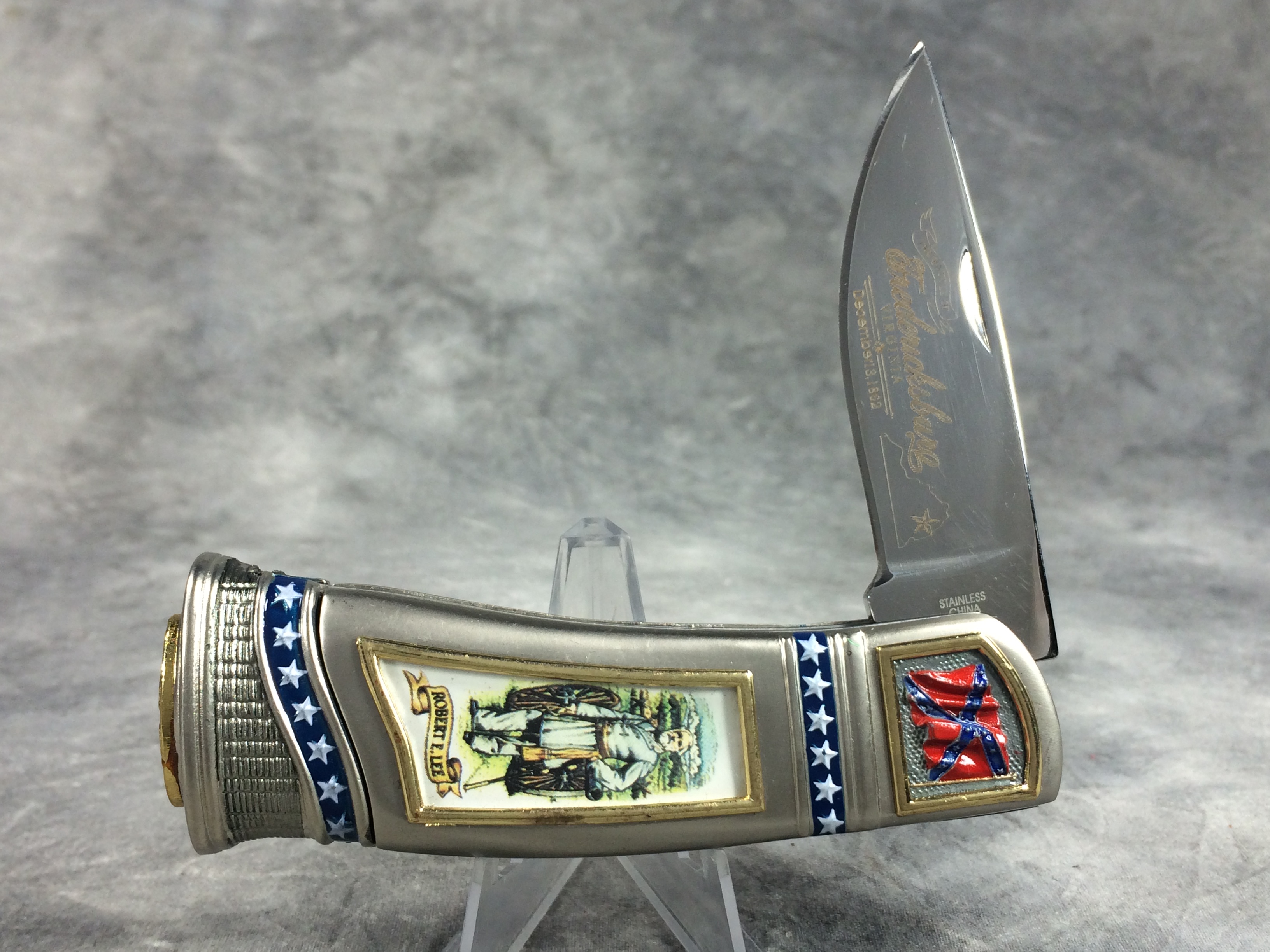 April 05, 2026 - 4-1/4 inches closed, 7-1/4 inches open. "STAINLESS CHINA" tang stamp. Very ornate handle with with image of General Robert E. Lee. Blade etched "THE BATTLE OF Fredericksburg, Virginia December 13, 1862". Comes in a gift tin with an image of the Confederate flag on the lid.