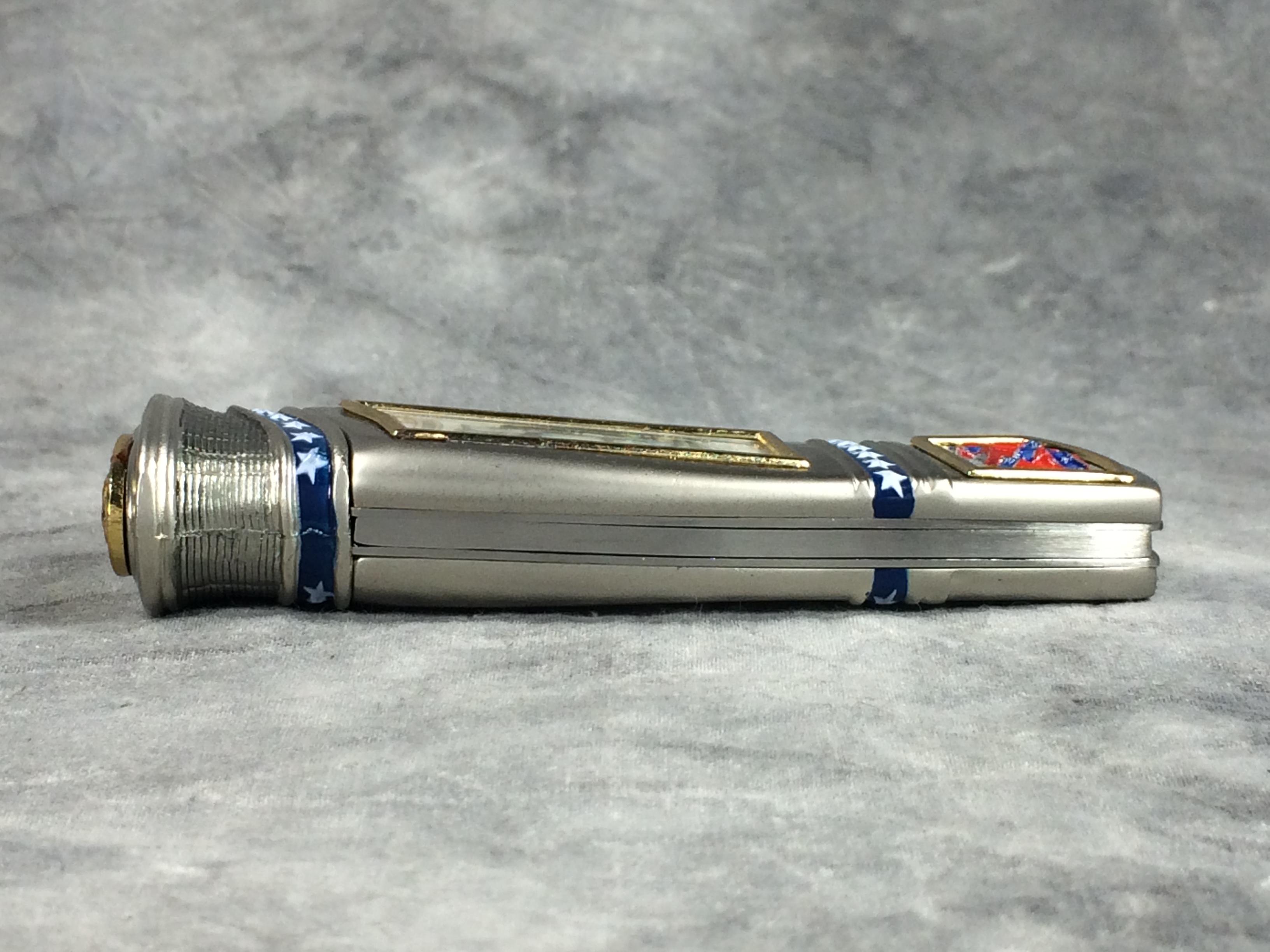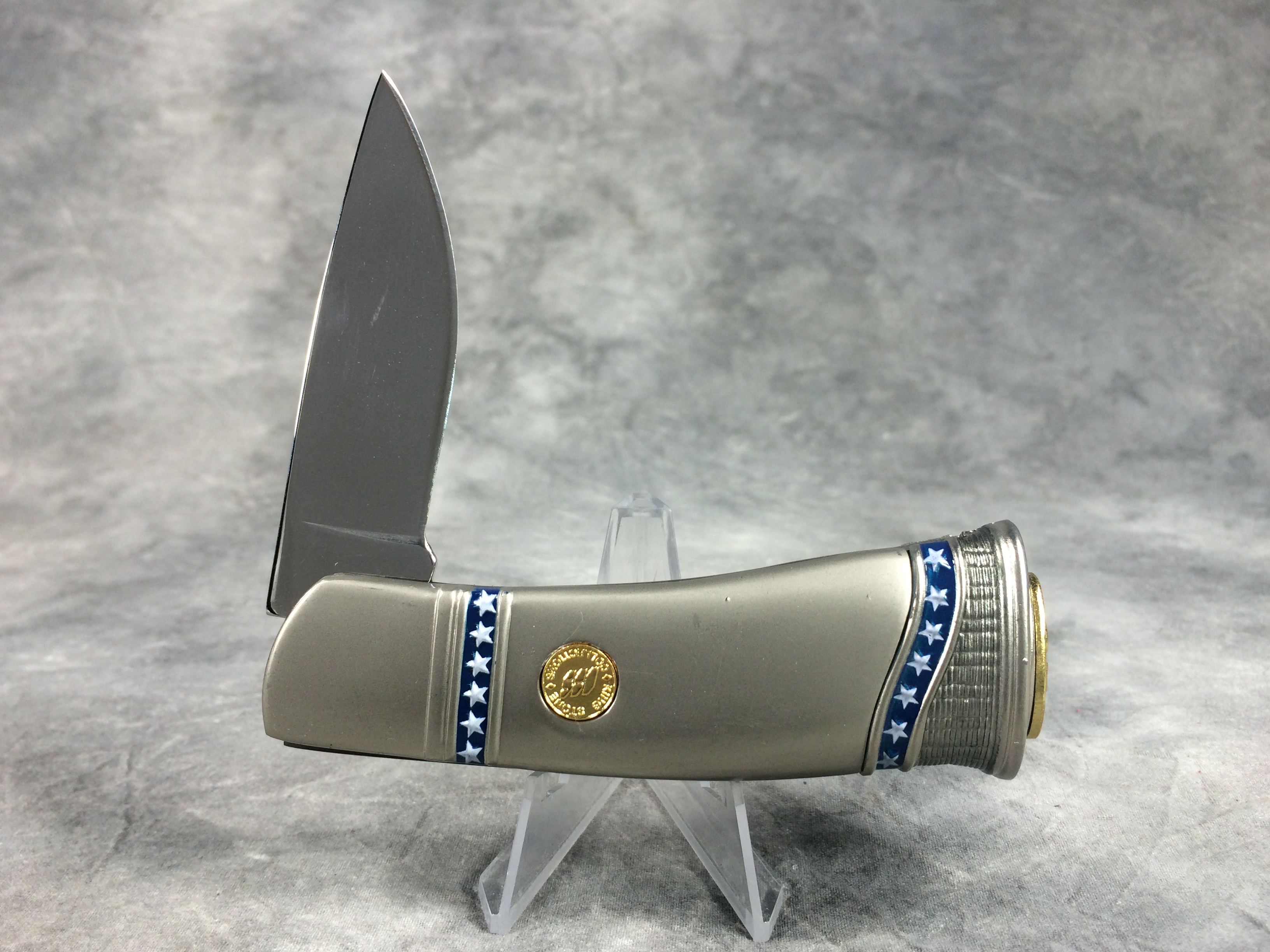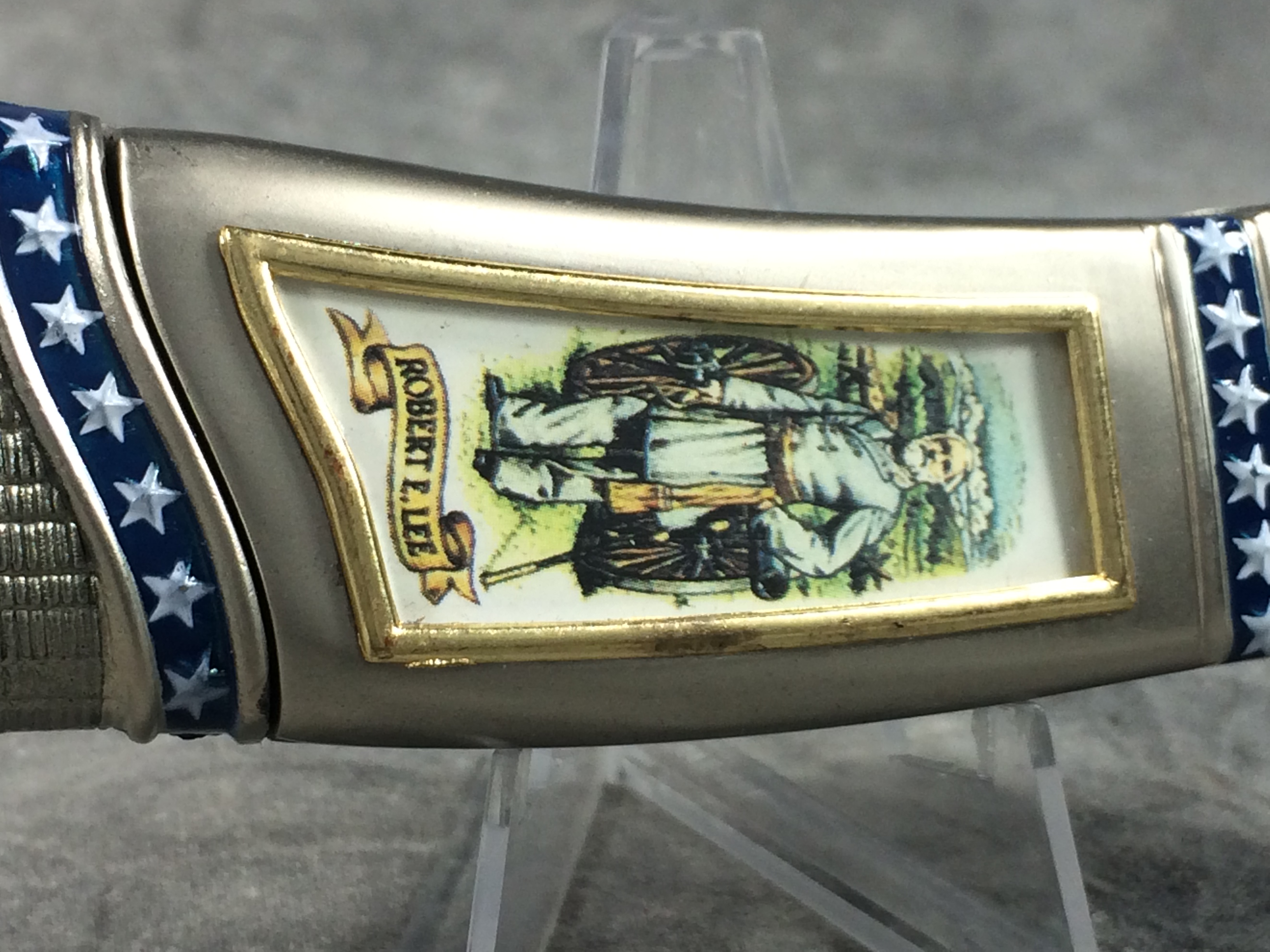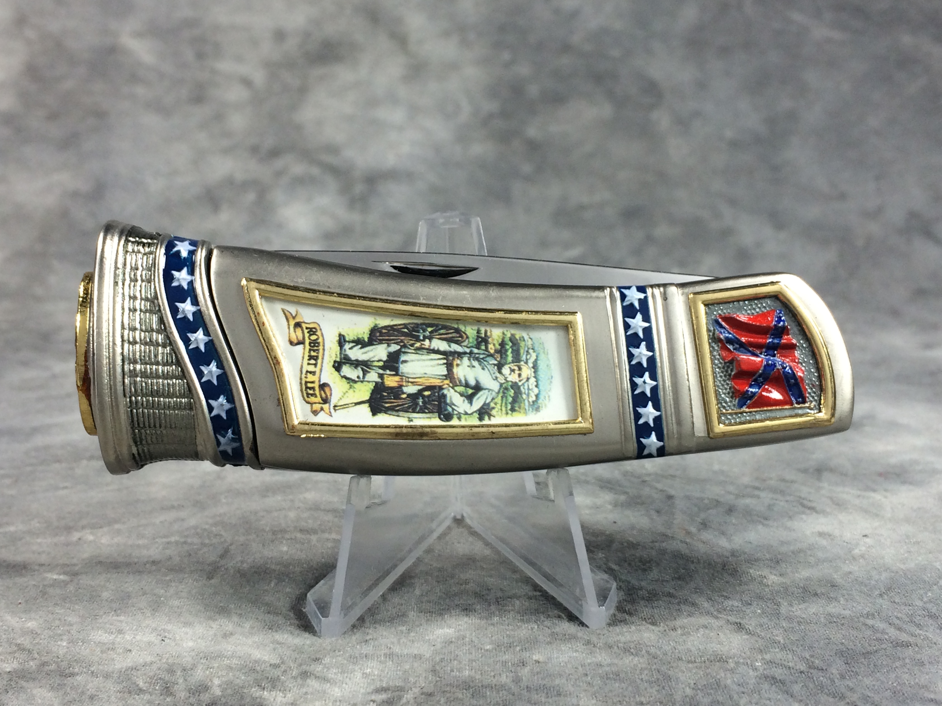 April 05, 2026 - 4-1/4 inches closed, 7-1/4 inches open. "STAINLESS CHINA" tang stamp. Very ornate handle with with image of General Robert E. Lee. Blade etched "THE BATTLE OF Fredericksburg, Virginia December 13, 1862". Comes in a gift tin with an image of the Confederate flag on the lid.