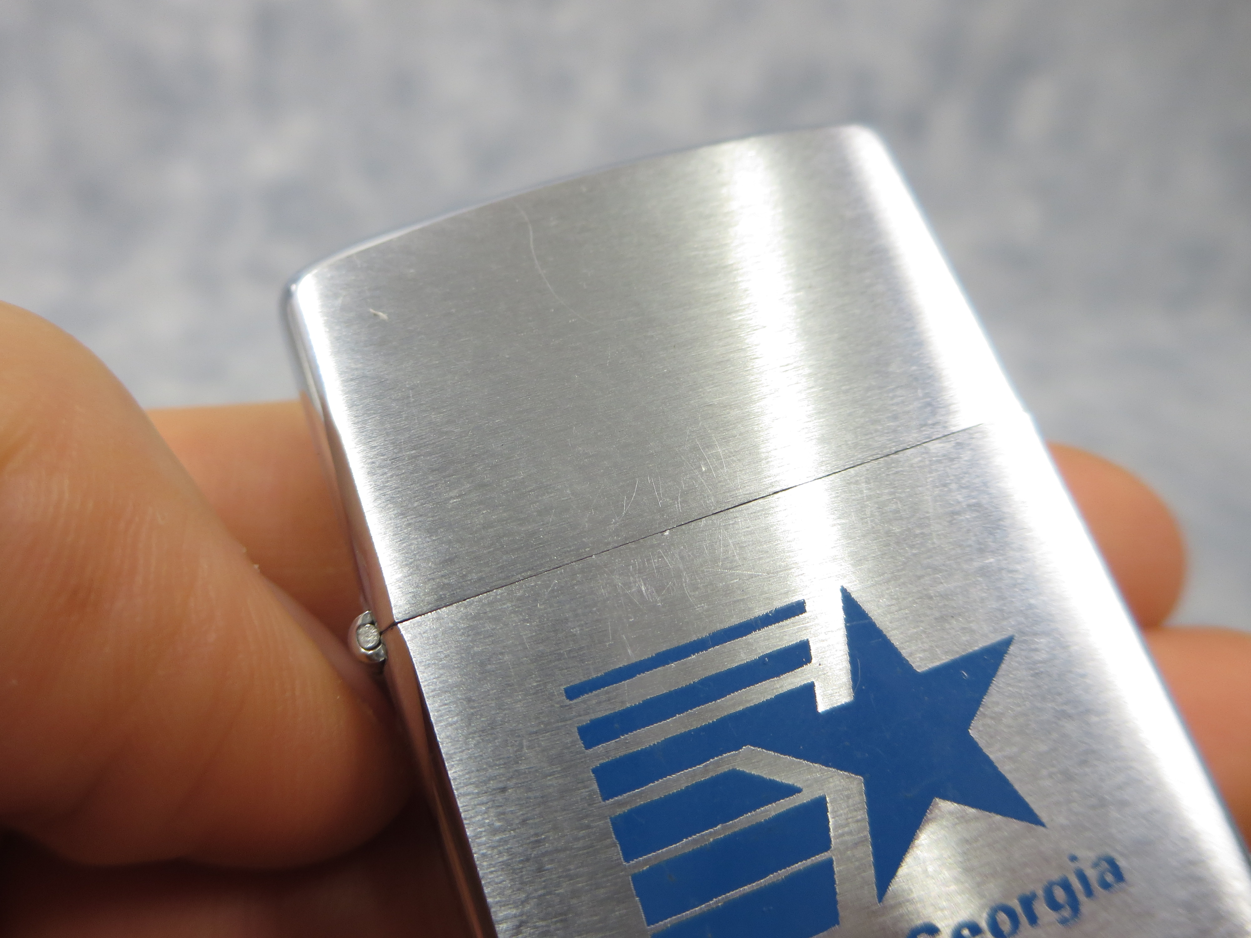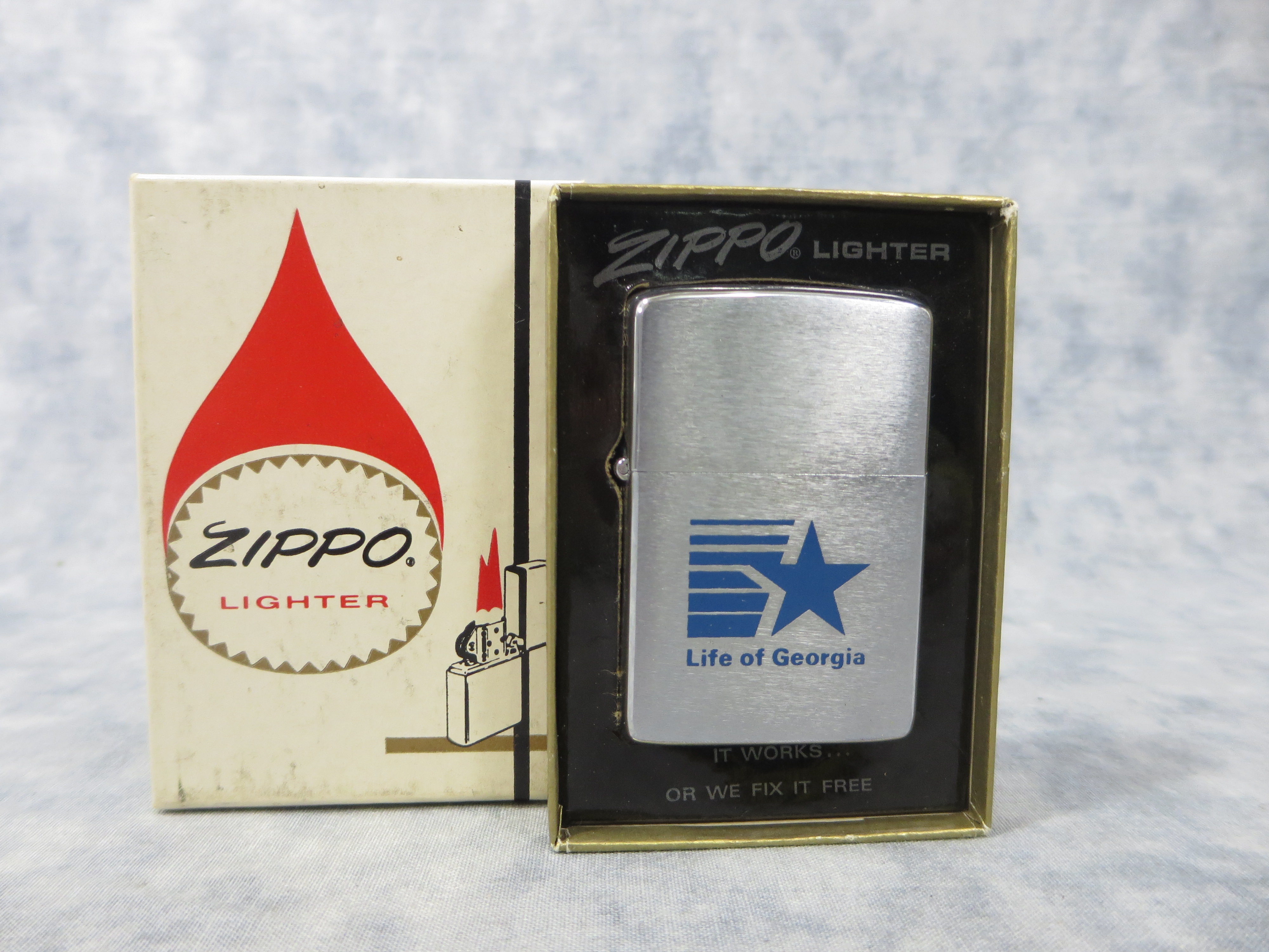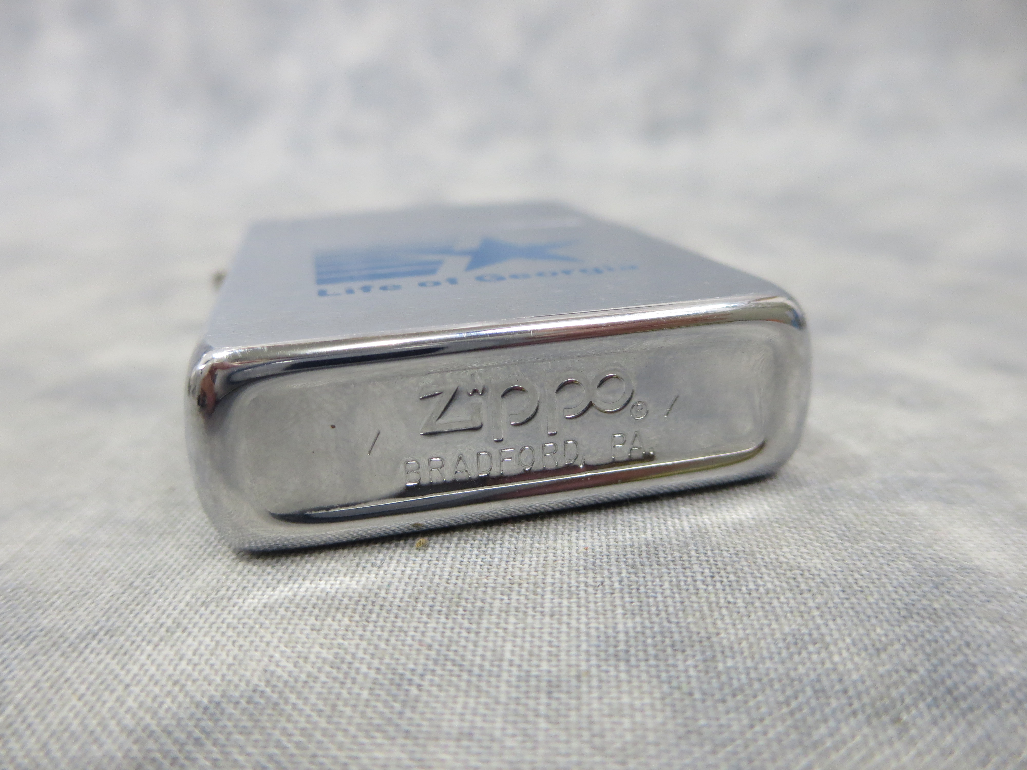 February 23, 2026 - ZIPPO Life of Georgia Advertising Lighter circa 1980. Brushed Chrome finish over solid Brass with engraved front color logo. Standard size 1-7/16 inches wide by 2-1/4 inches high. Bottom of lighter reads: / Zippo / Bradford, PA. Includes original, unfired insert.