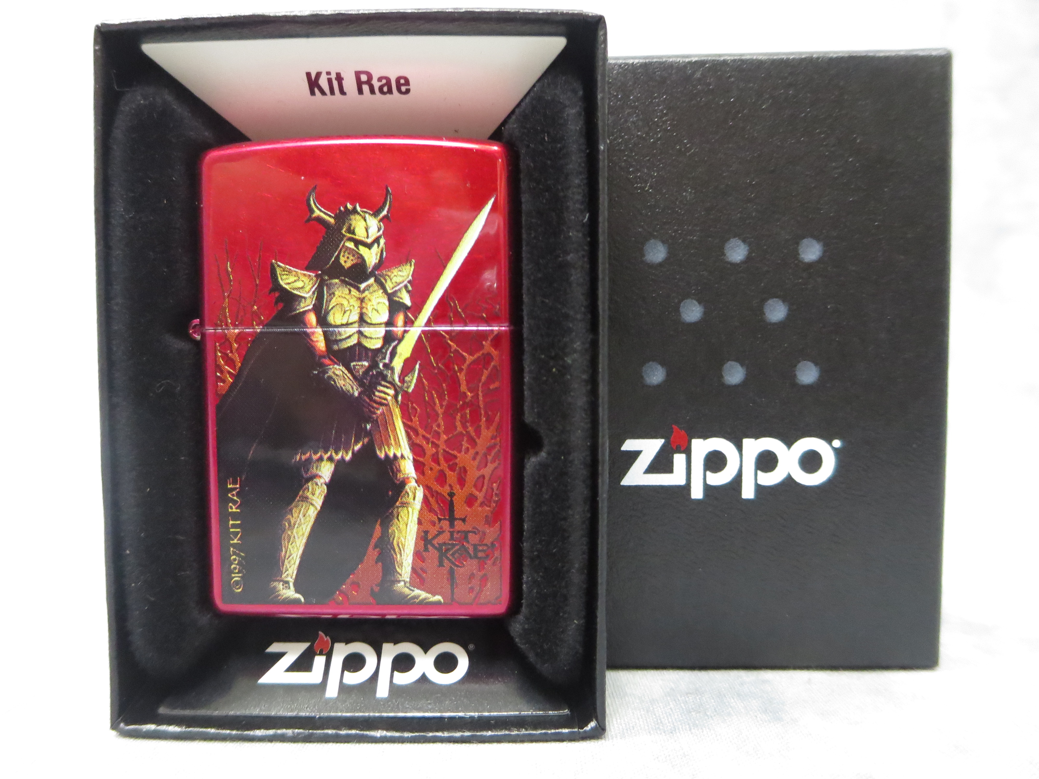 February 03, 2026 - ZIPPO Kit Rae The Dark One lighter circa 2007. Candy Apple Red finish over solid Brass with front color printed design. Standard size 1-7/16 inches wide by 2-1/4 inches high. Bottom of lighter reads: F Zippo 07 Bradford, PA. Made in U.S.A. Includes original, unfired insert.