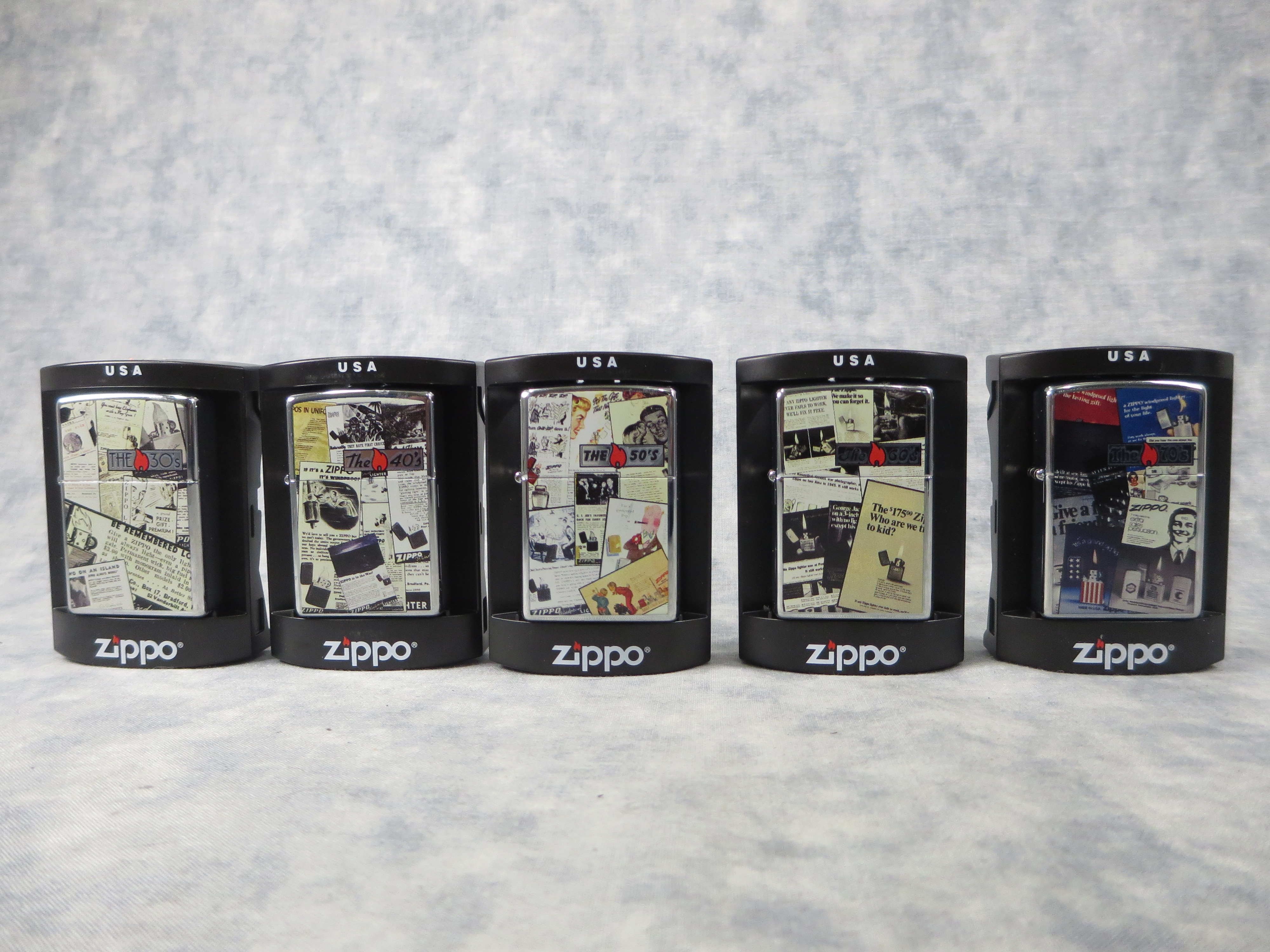 February 03, 2026 - t issued to commemorate the 75th Anniversary of Zippo. ZIPPO Through the Decades Lighter set manufactured in 2007 includes the 30's, 40's, 50's, 60's and 70's lighters with Polished Chrome finish over solid Brass with color printed designs on the front. Standard size 1-7/16 inches wide by 2-1/4 inches high. Bottom of lighters read: D/E Zippo 07 Bradford, PA. Made in U.S.A. Includes original, unfired insert.