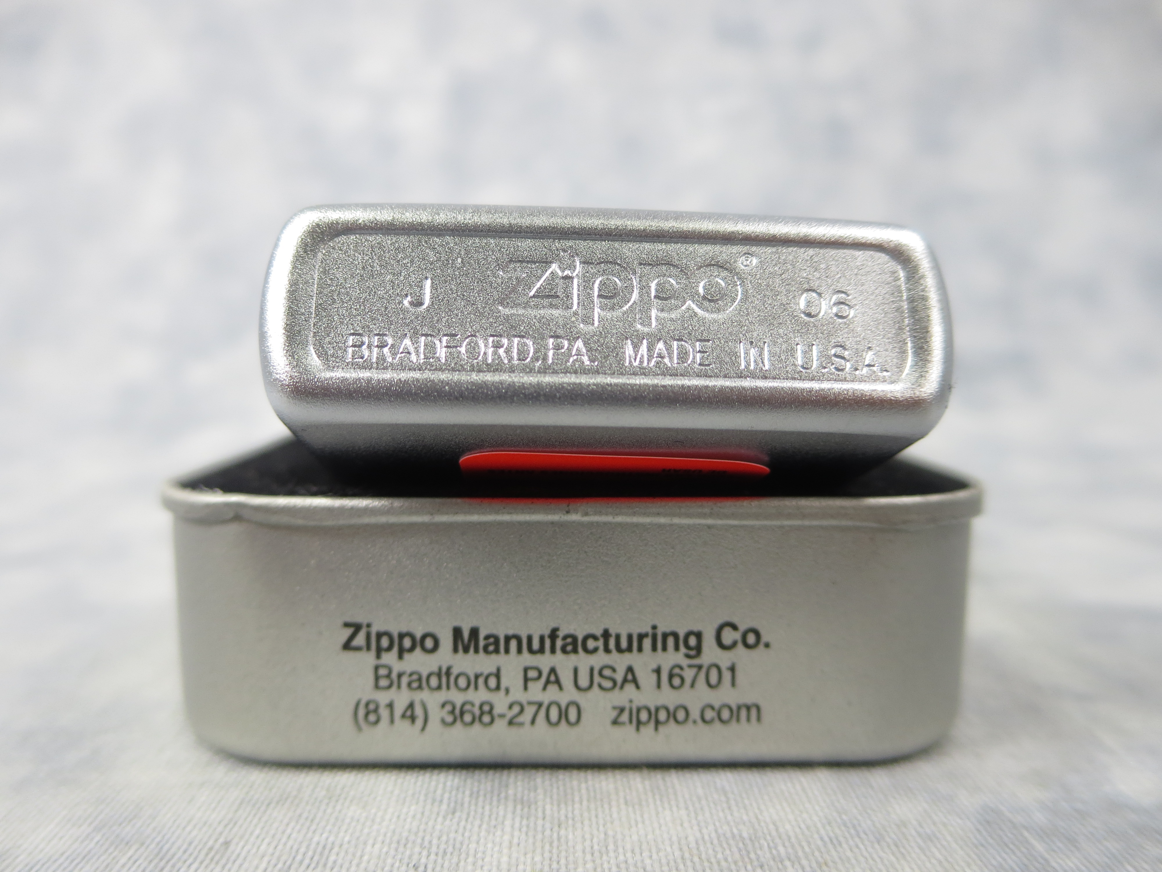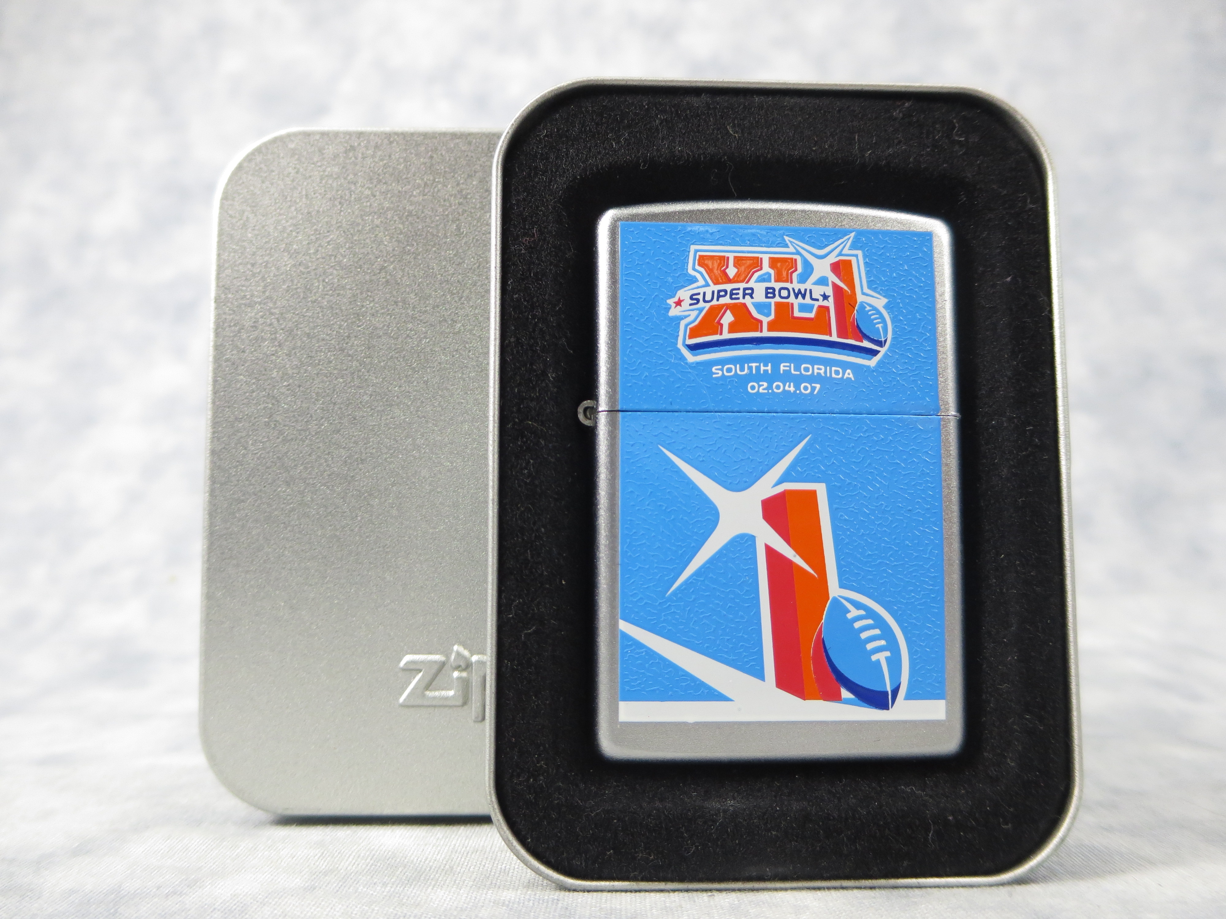 January 14, 2026 - ZIPPO Super Bowl XLI South Florida Lighter manufactured in 2006. Satin Chrome finish over solid Brass with color printed design on front. Standard size 1-7/16 inches wide by 2-1/4 inches high. Bottom of lighter reads: J Zippo 06 Bradford, PA. Made in U.S.A. Includes original, unfired insert.