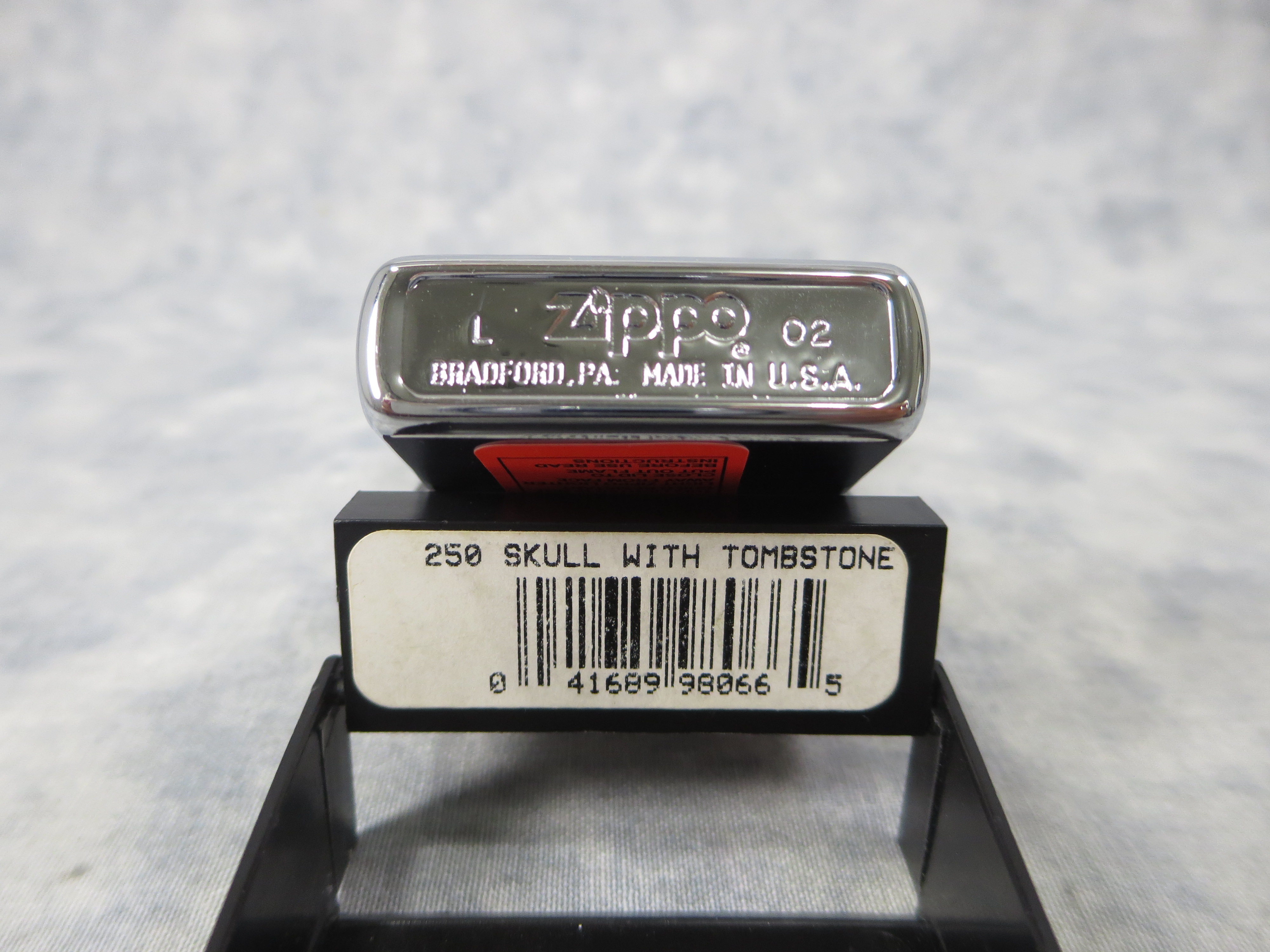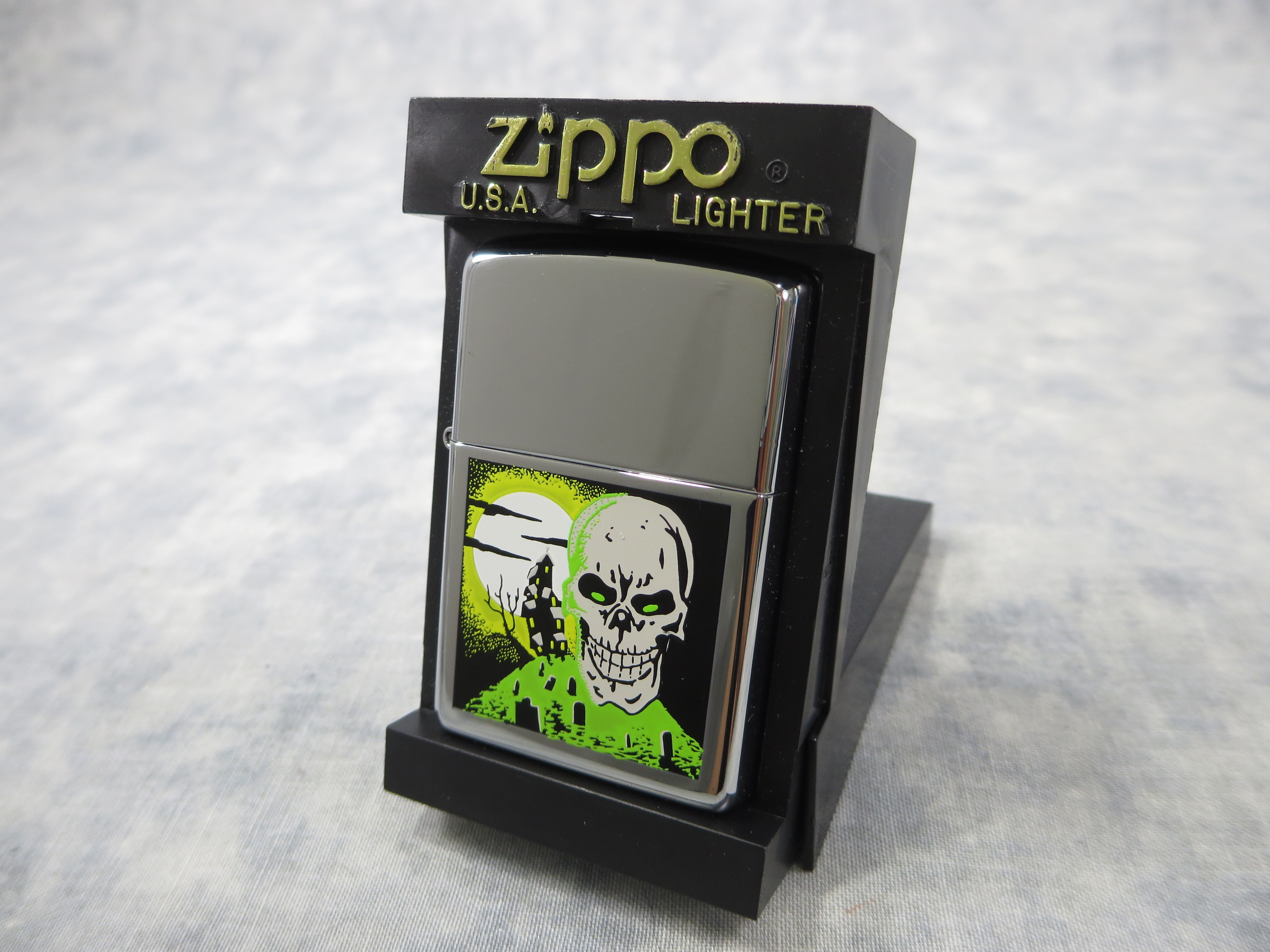October 28, 2025 - ZIPPO Skull/Graveyard/Haunted Mansion Lighter manufactured in 2002. Polished Chrome finish over solid Brass with color printed image on front. Bottom of lighter reads: L Zippo 02 Bradford, PA. Made in U.S.A. Includes original, unfired insert.
