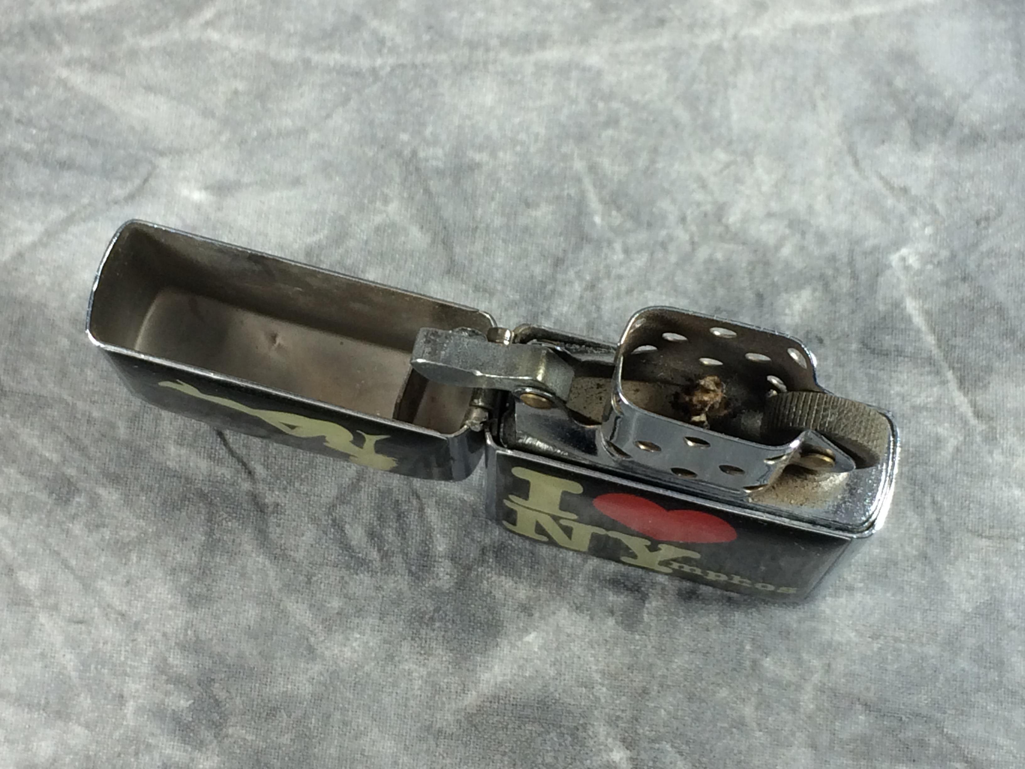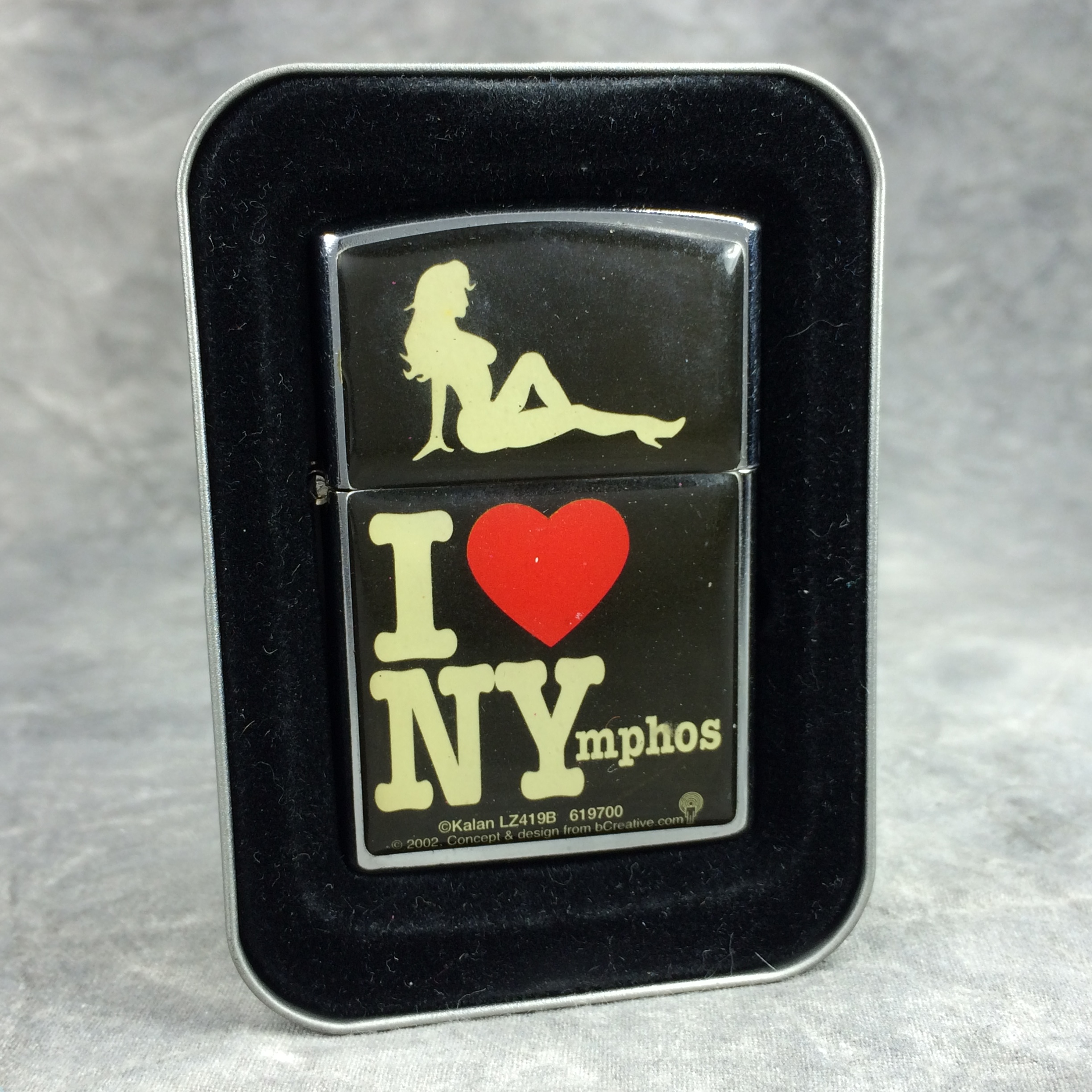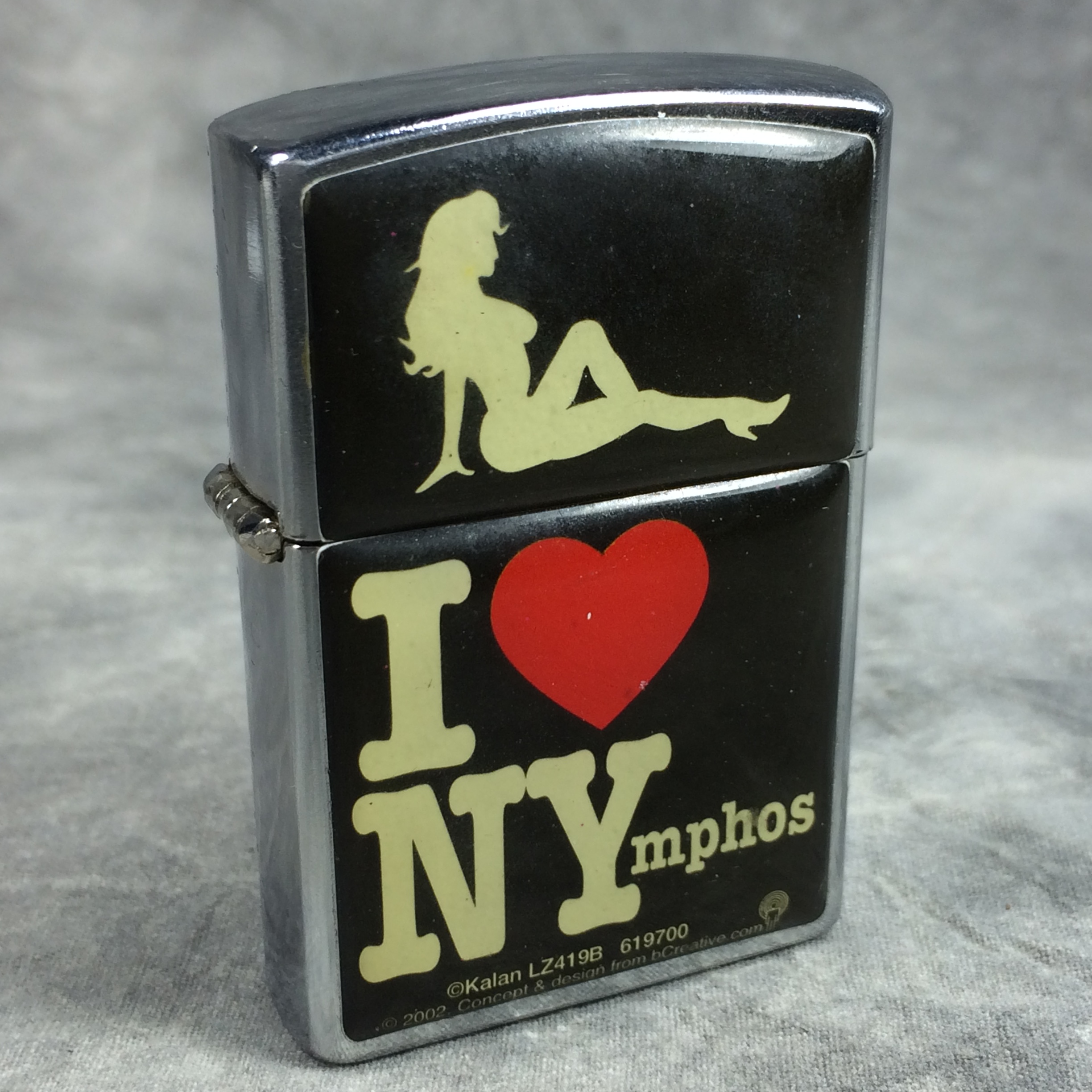 You have: I LOVE NYmphos Polished Chrome Lighter (Kalan LZ419B 619700, 2002)