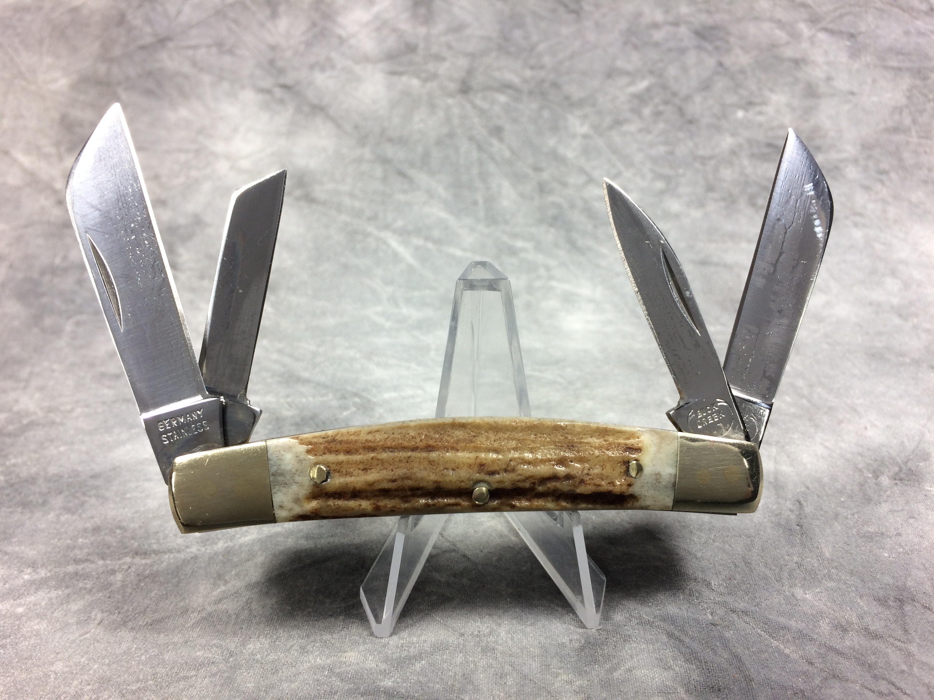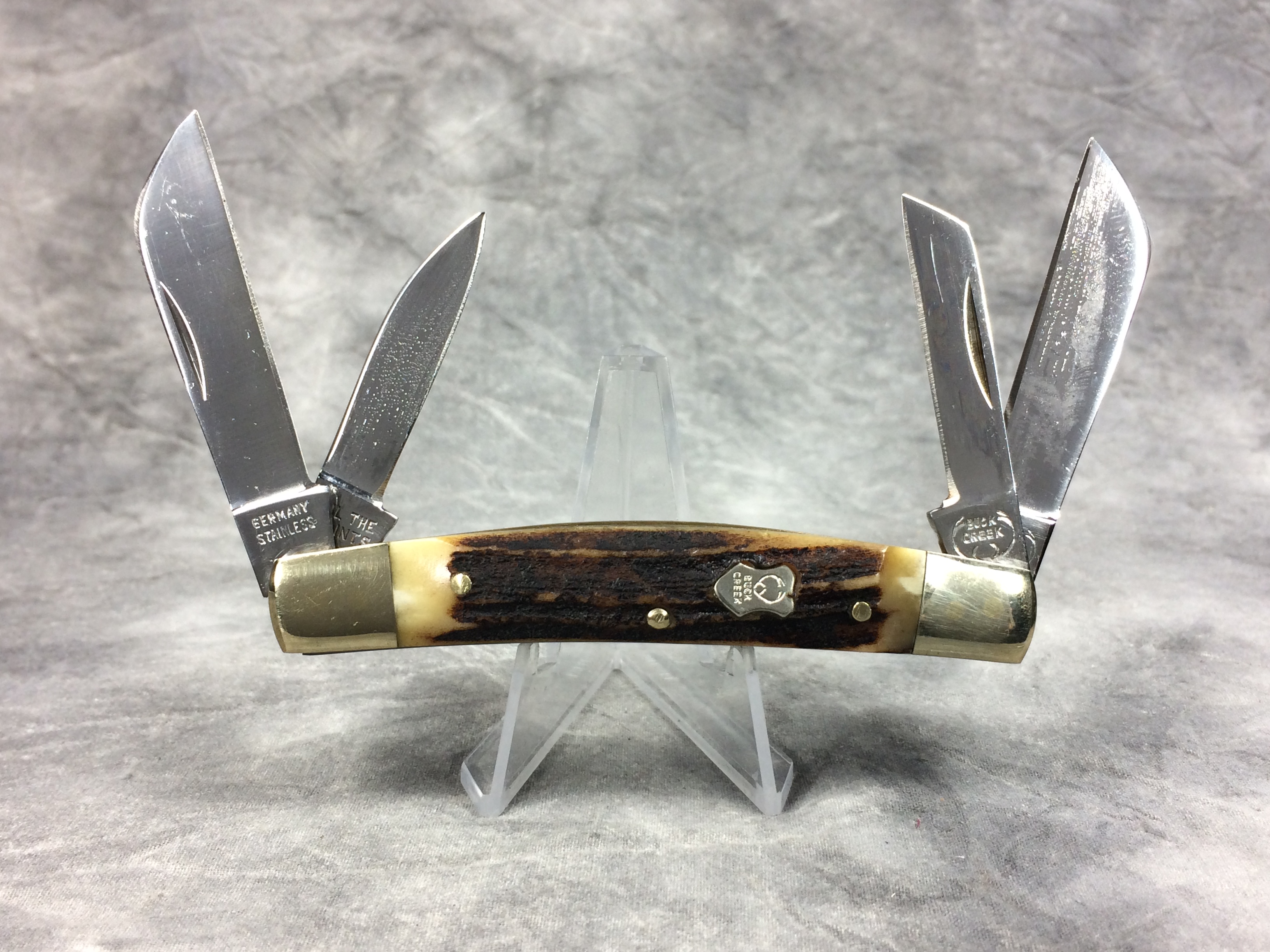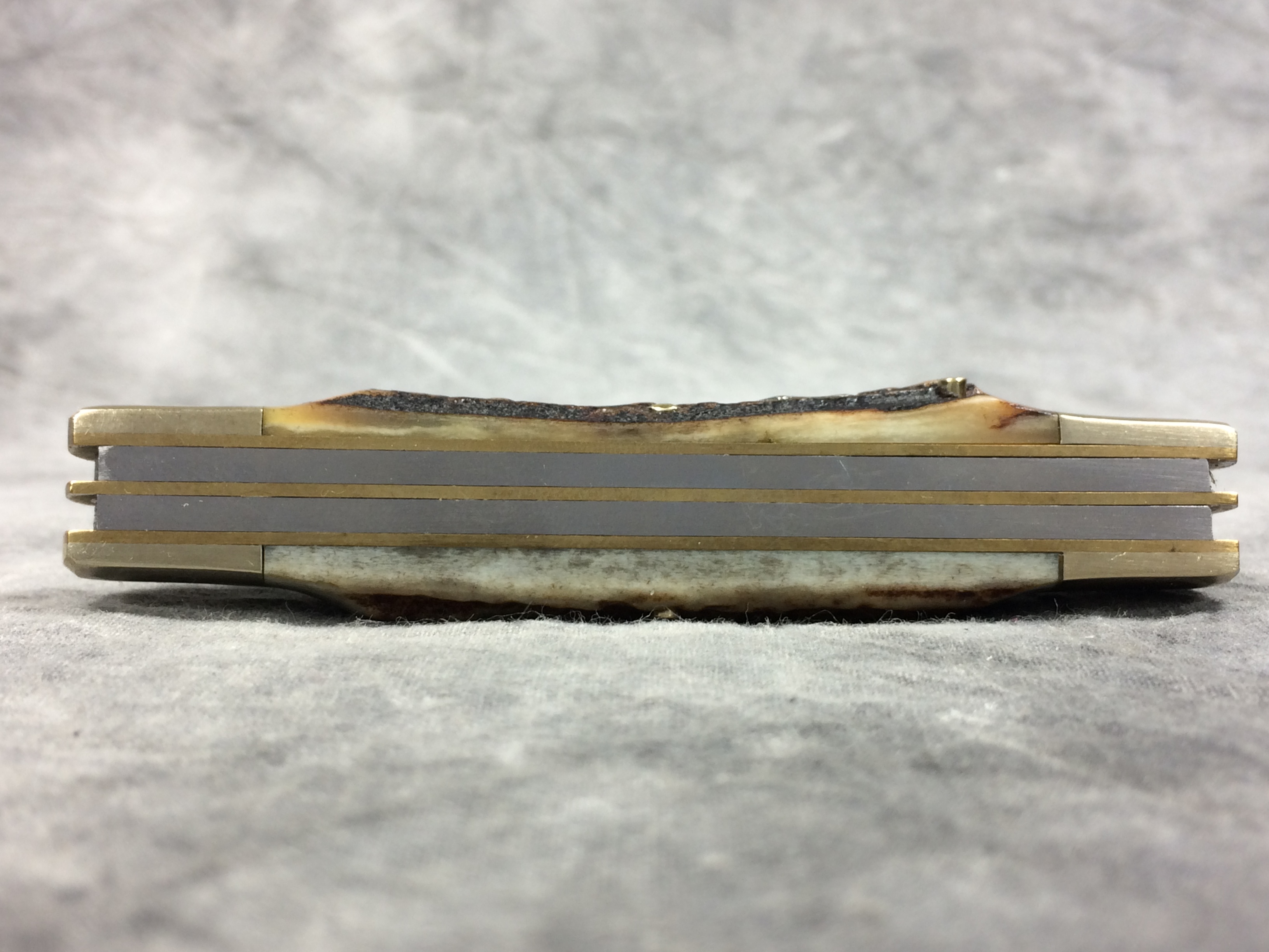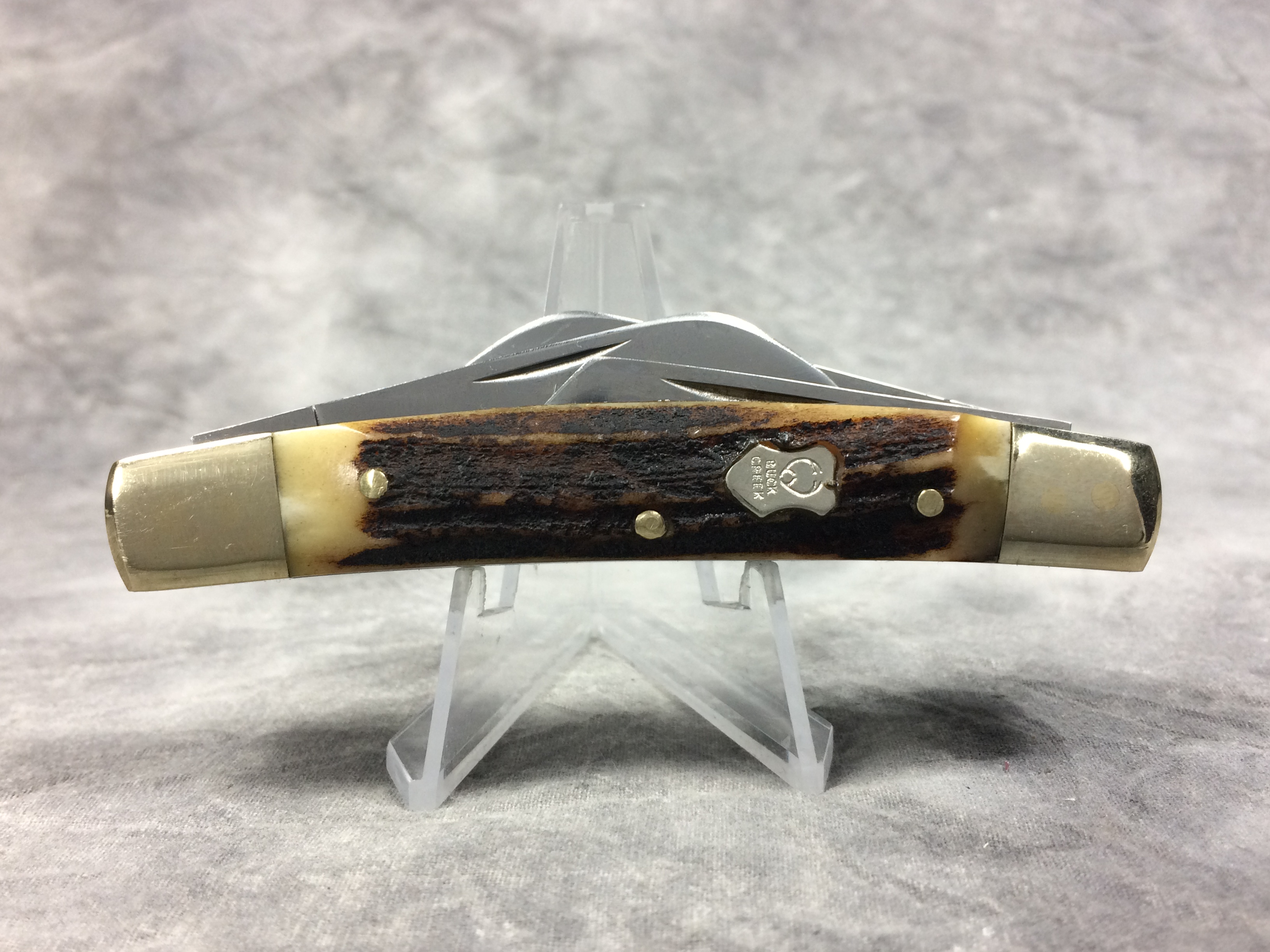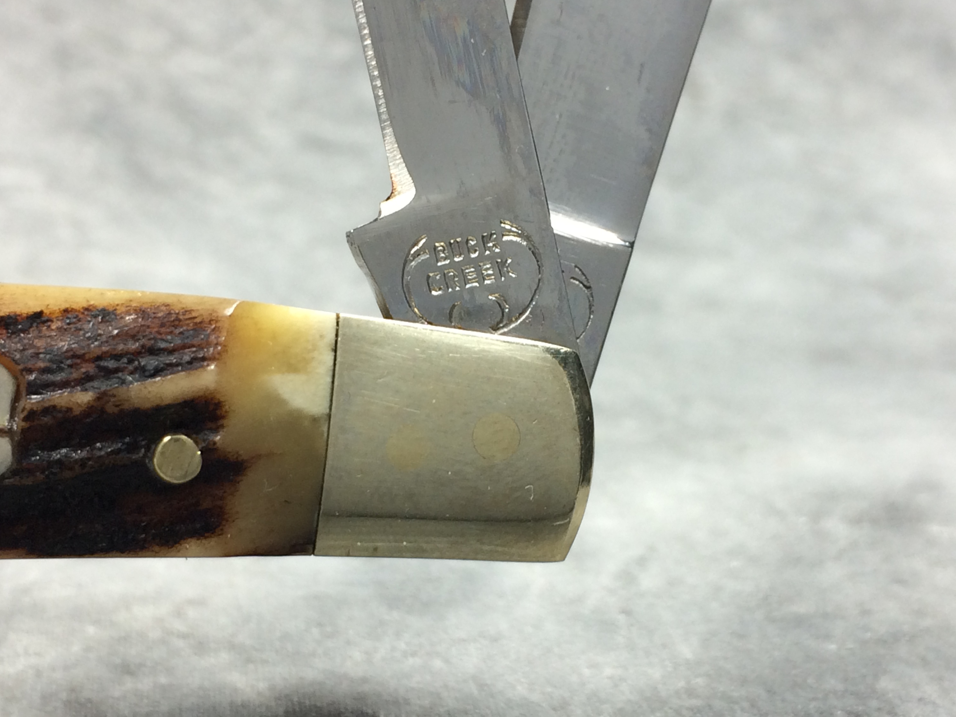 February 23, 2026 - 3-3/4 inches closed. 6 inches open. "BUCK CREEK" with Antler logo, "GERMANY STAINLESS", and "OIL THE JOINTS" tang stamps. "BUCK CREEK" badge shield. Nickel Silver bolsters. Brass liner.