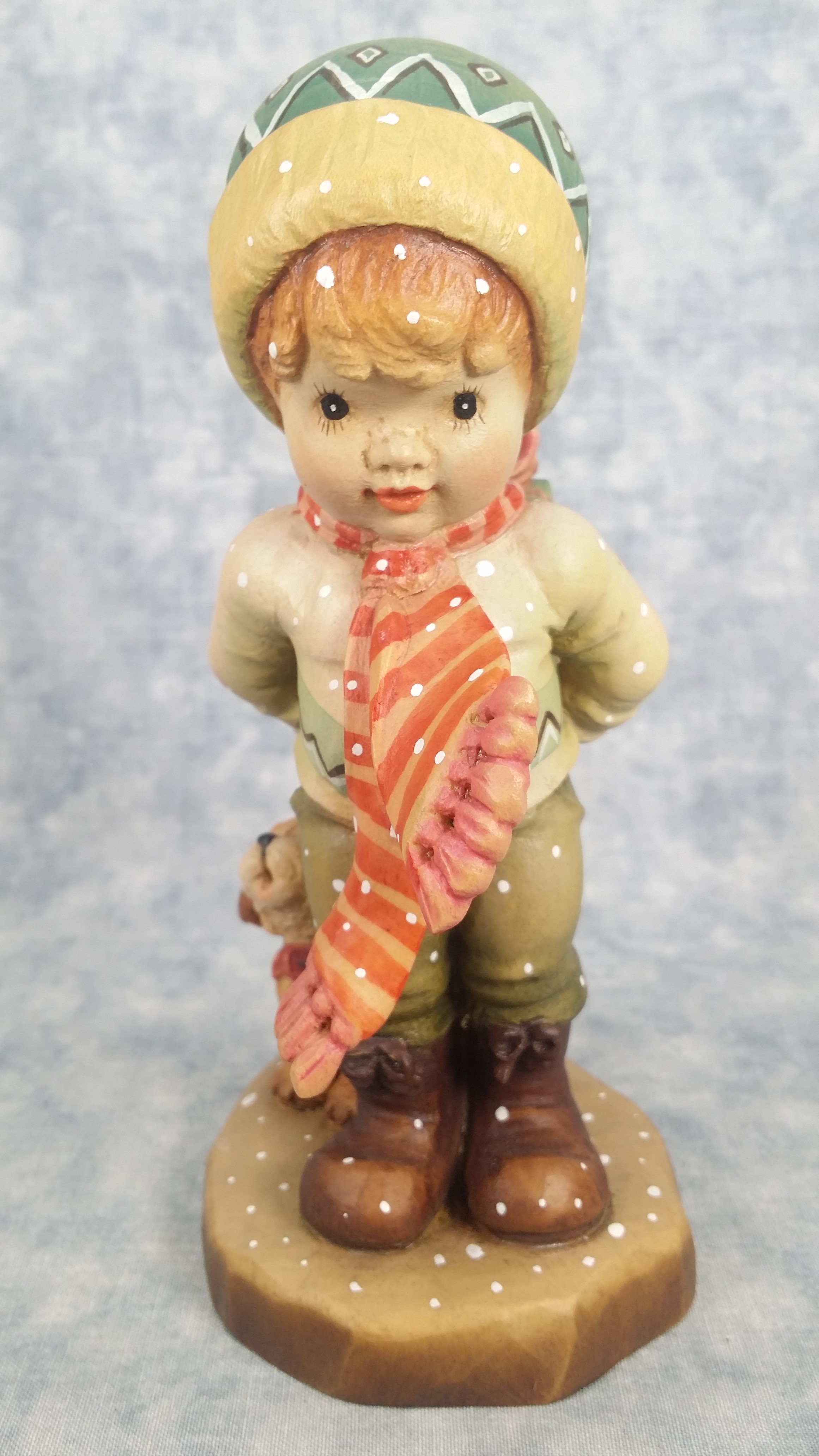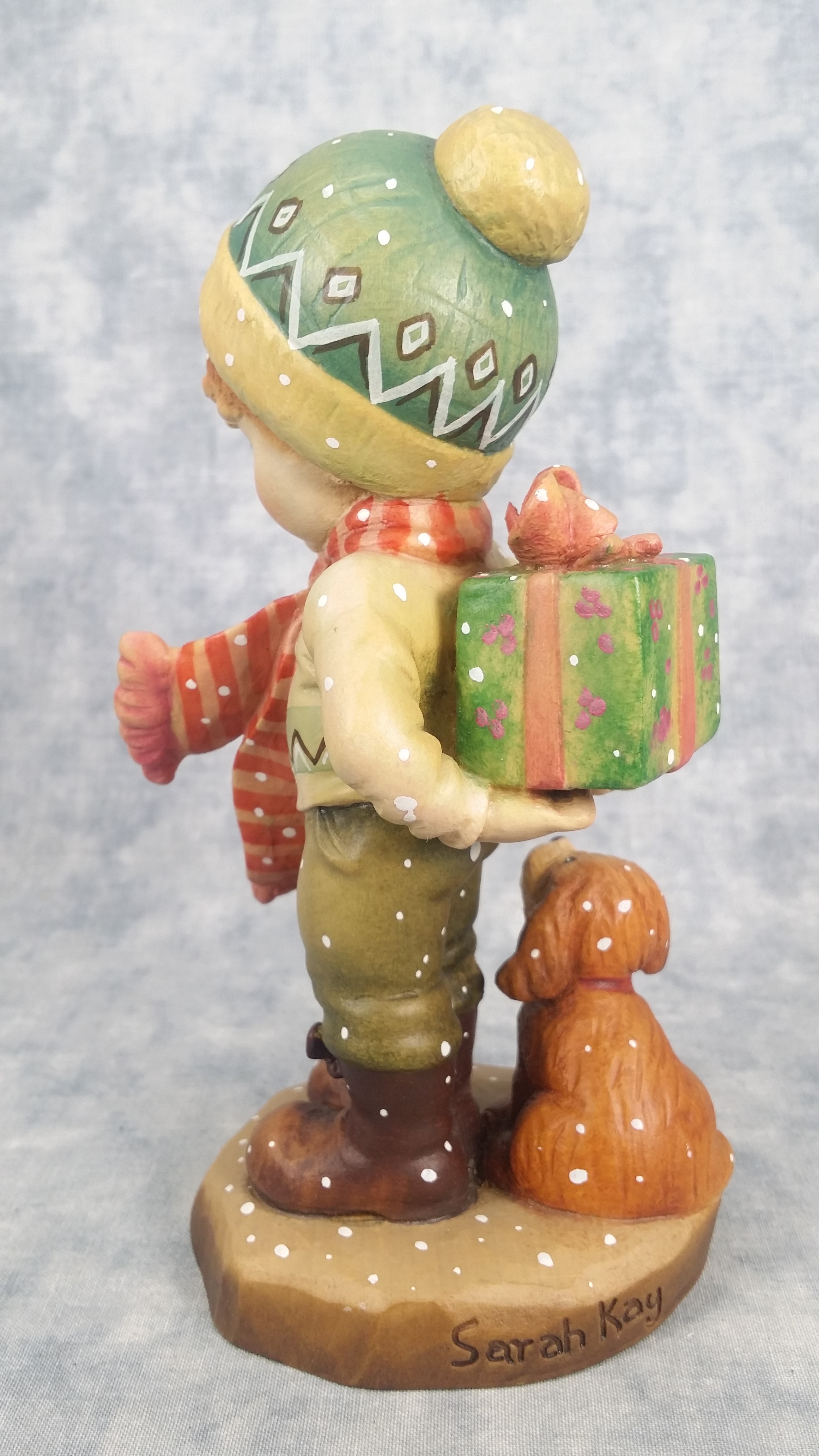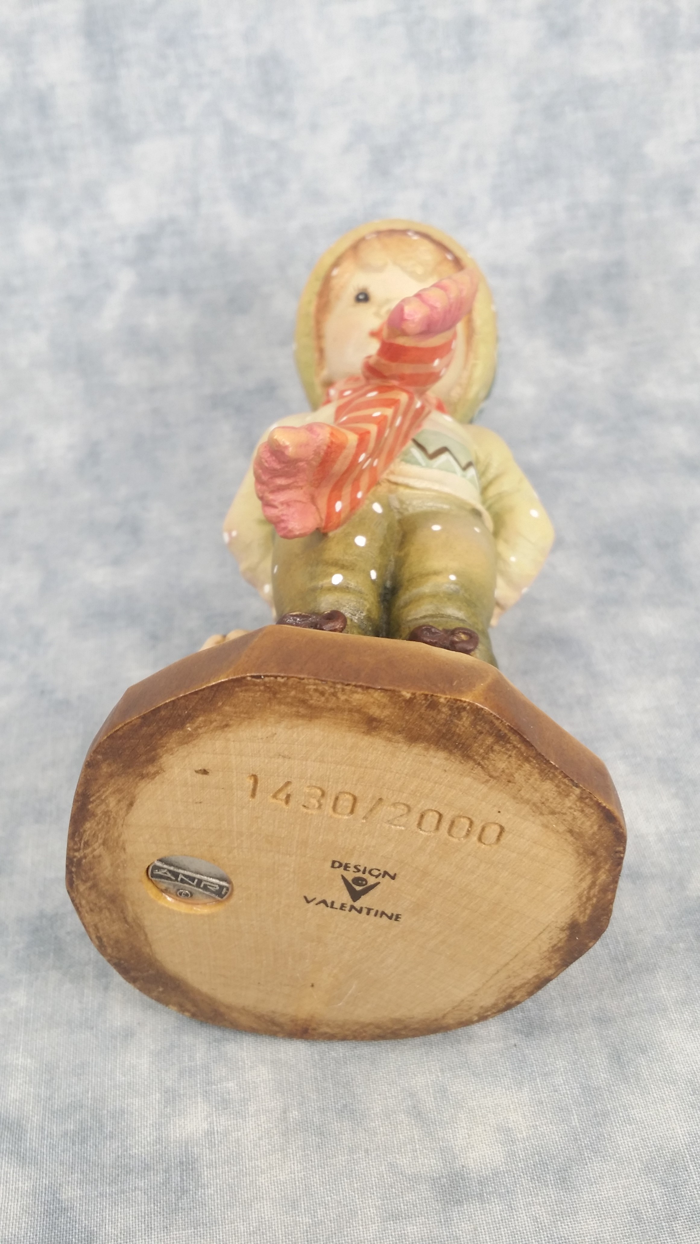 March 16, 2026 - Exact size: 6-1/2 inches tall. Sarah Kay Collection, Design Valentine. Bottom of base is stamped "Design Valentine" and incised with the limited edition number: xxxx/2000. Side of base is incised with the "Sarah Kay" signature. Anri medal disk trademark (used from 1982-1988) is present on bottom of base as a mark of origin and genuinity. Made in Italy.