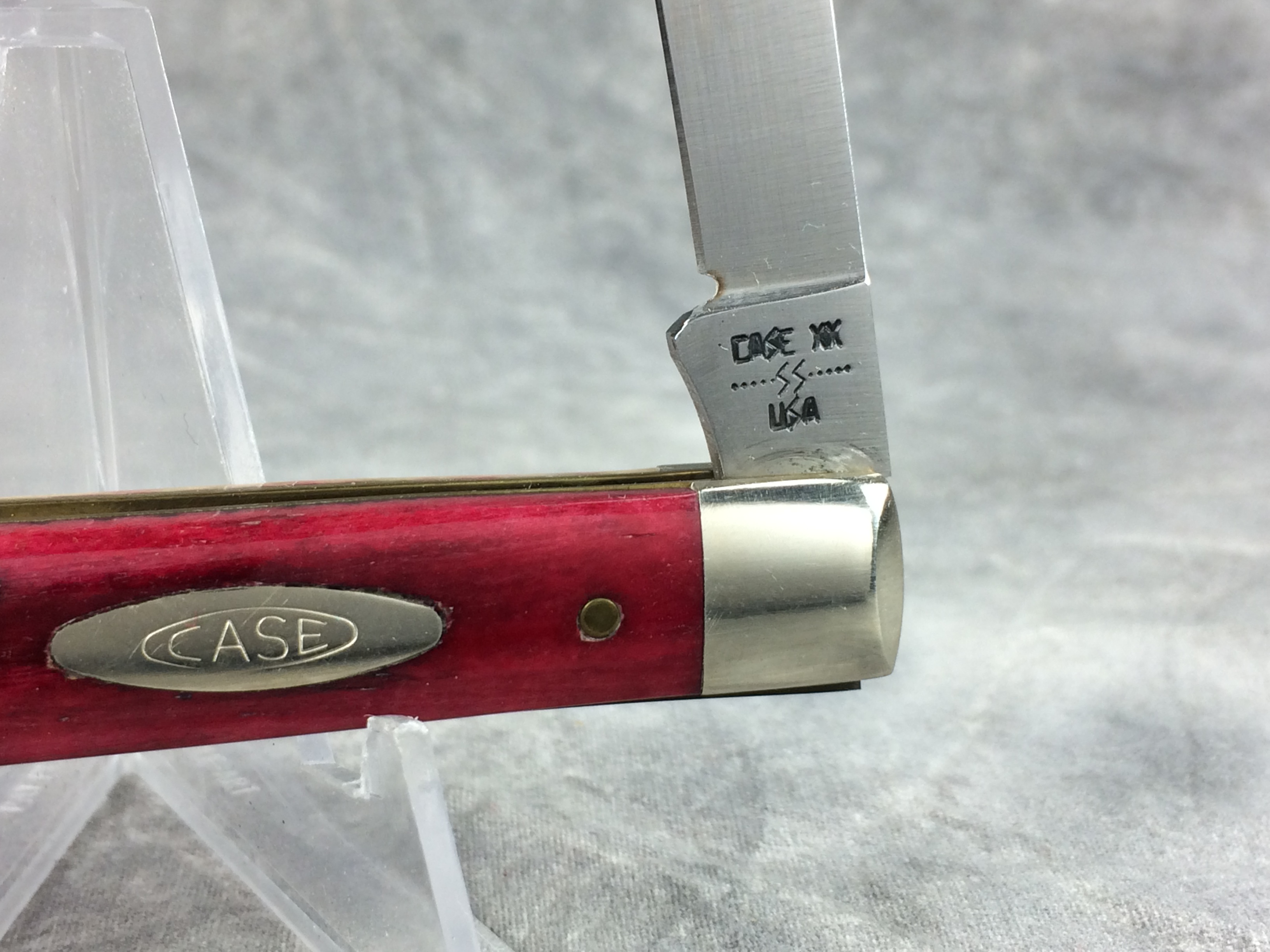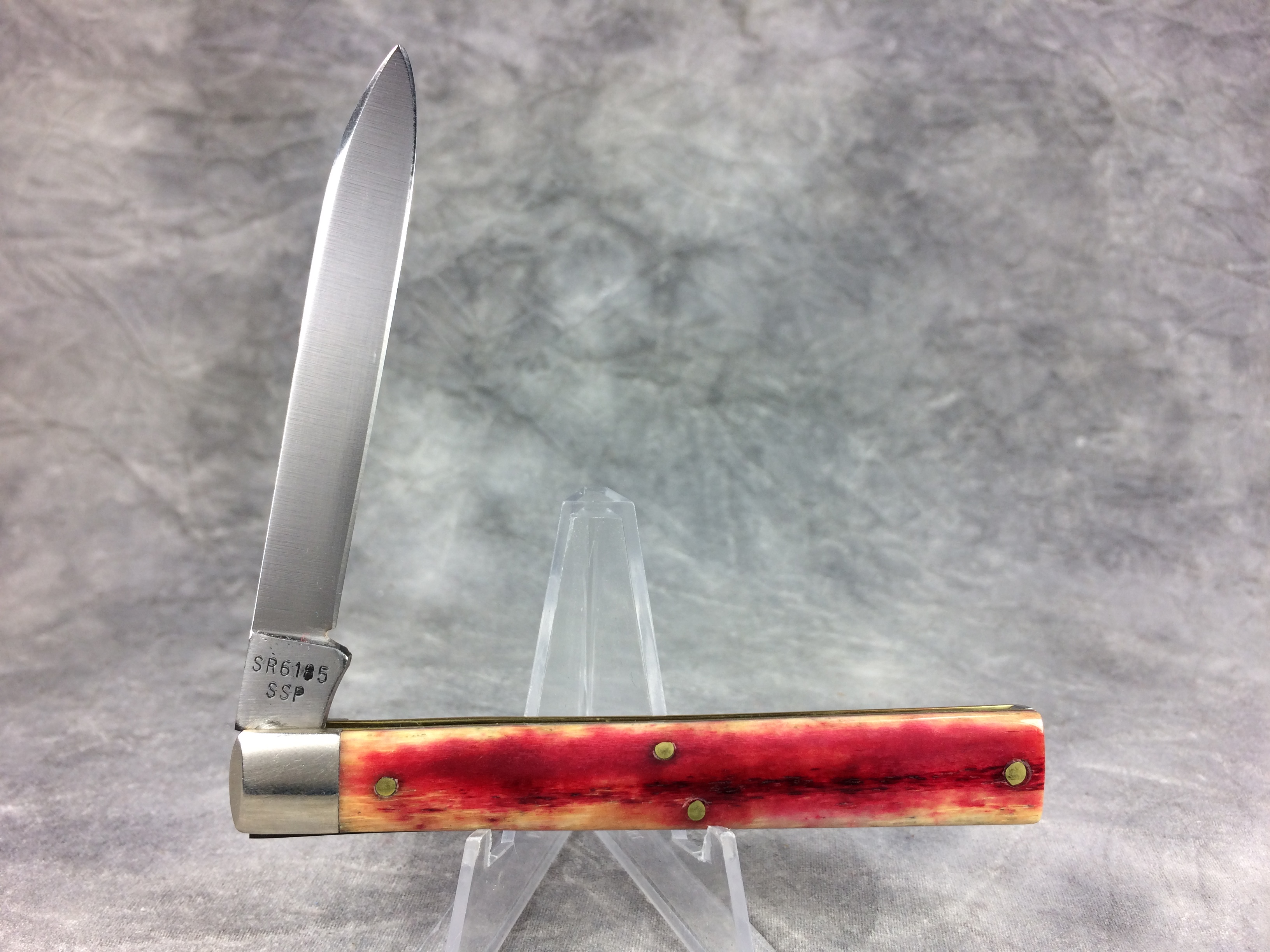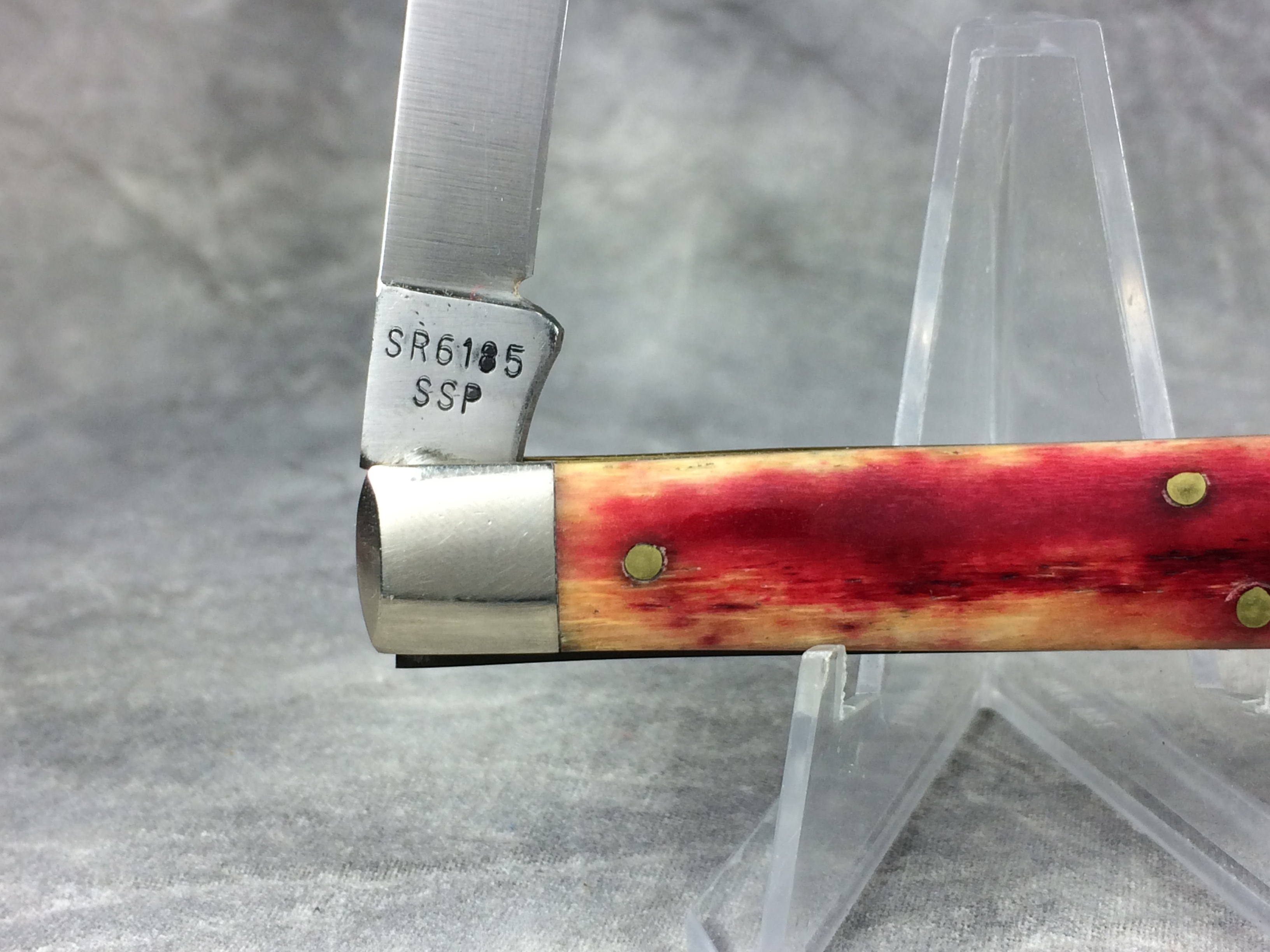 April 05, 2026 - 3-5/8 inches closed. 6-5/8 inches open. Made in USA. "CASE XX U.S.A. *****SS***** USA  " (10 dot with lightning bolt S) and "SR6185 SSP" tang stamps. Double oval open-C "CASE" shield. Stainless steel blade. Smooth Red Appaloosa bone handle. Nickel Silver bolsters. Brass liner.