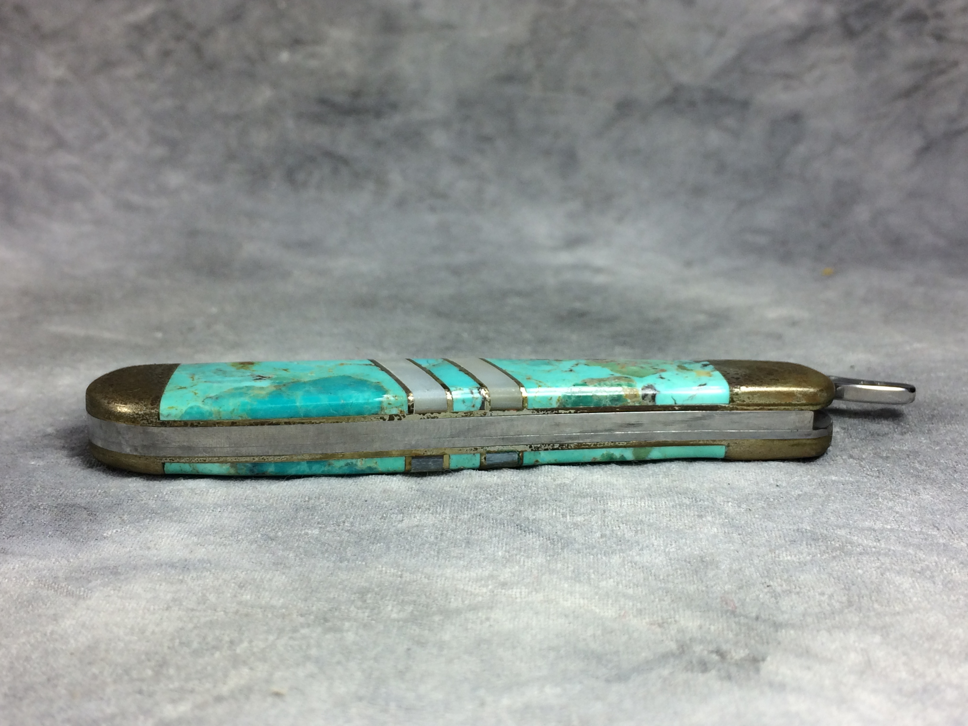 January 14, 2026 - 3-1/2 inches closed. 6-1/8 inches open. Made in USA. "  x*x  Case XX  x*x*x " (with lightning bolt S) and "USA EX1953L SS" tang stamps. Stainless Steel blade. Exotic turquoise handle with mother of pearl inlays. Nickel Silver bolsters and liner.