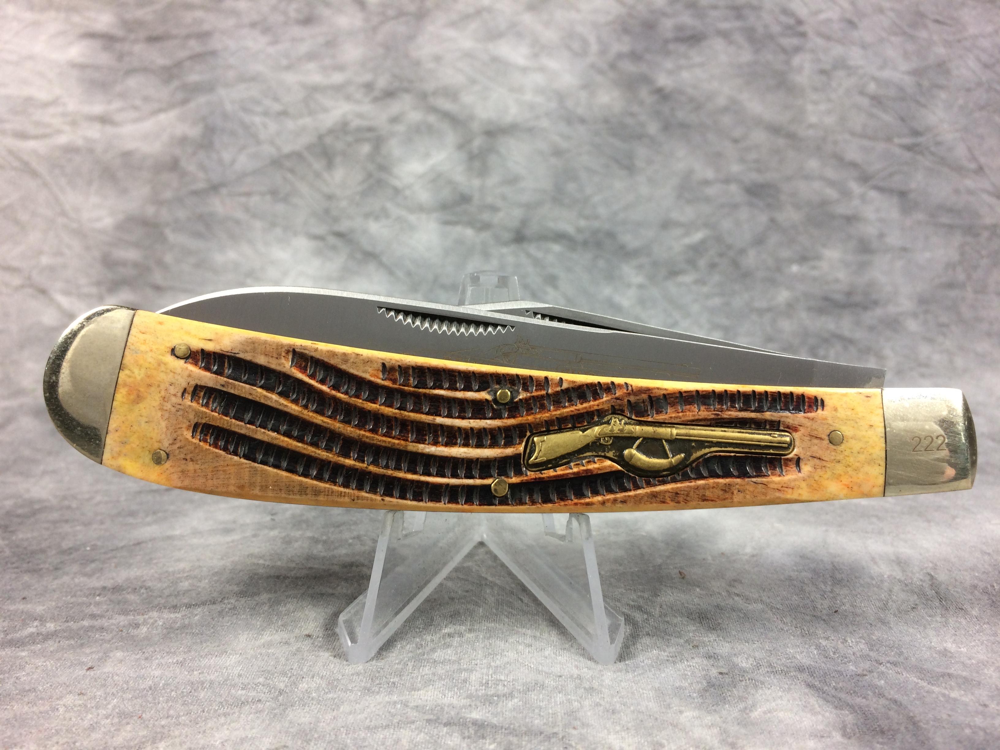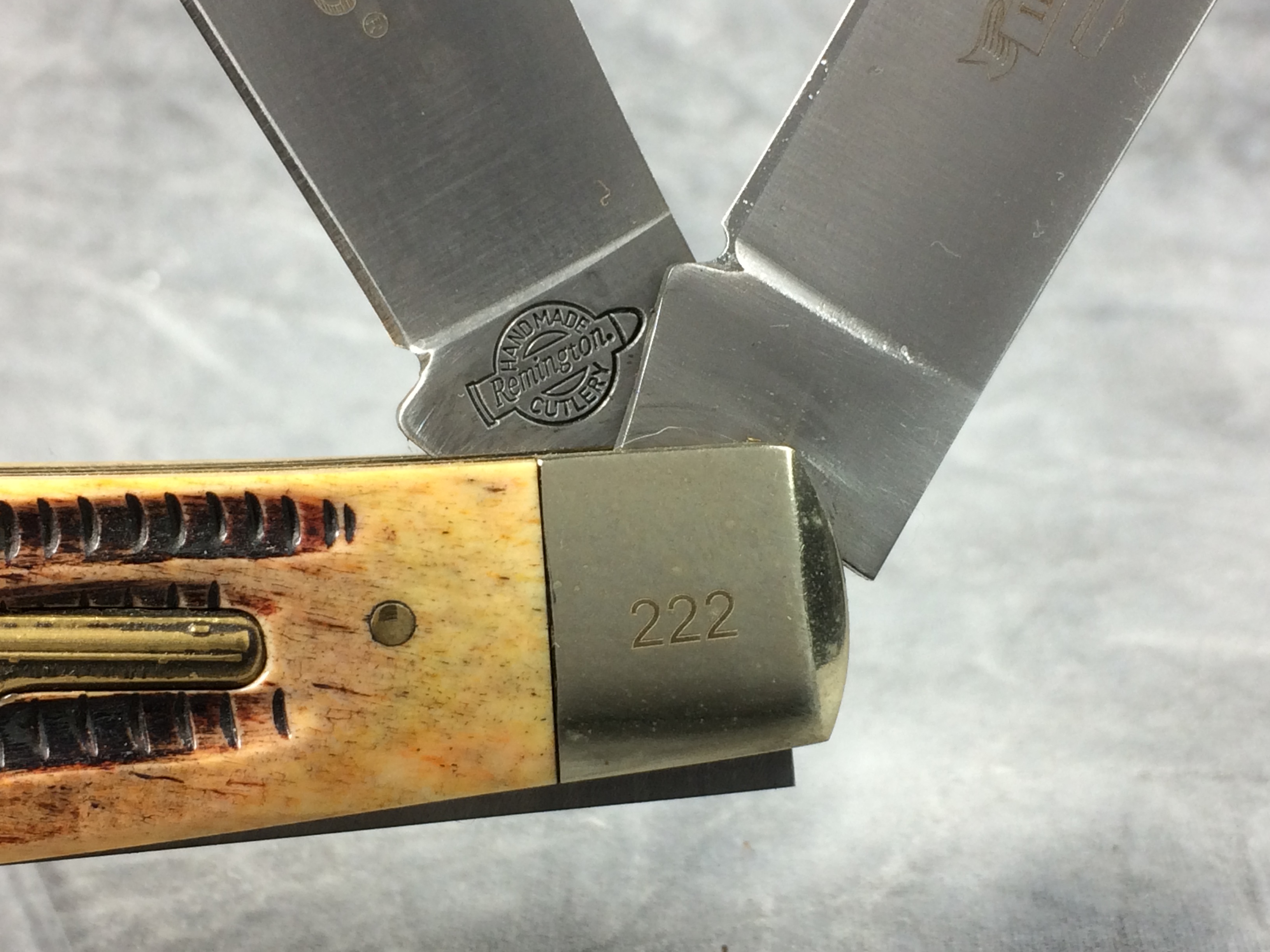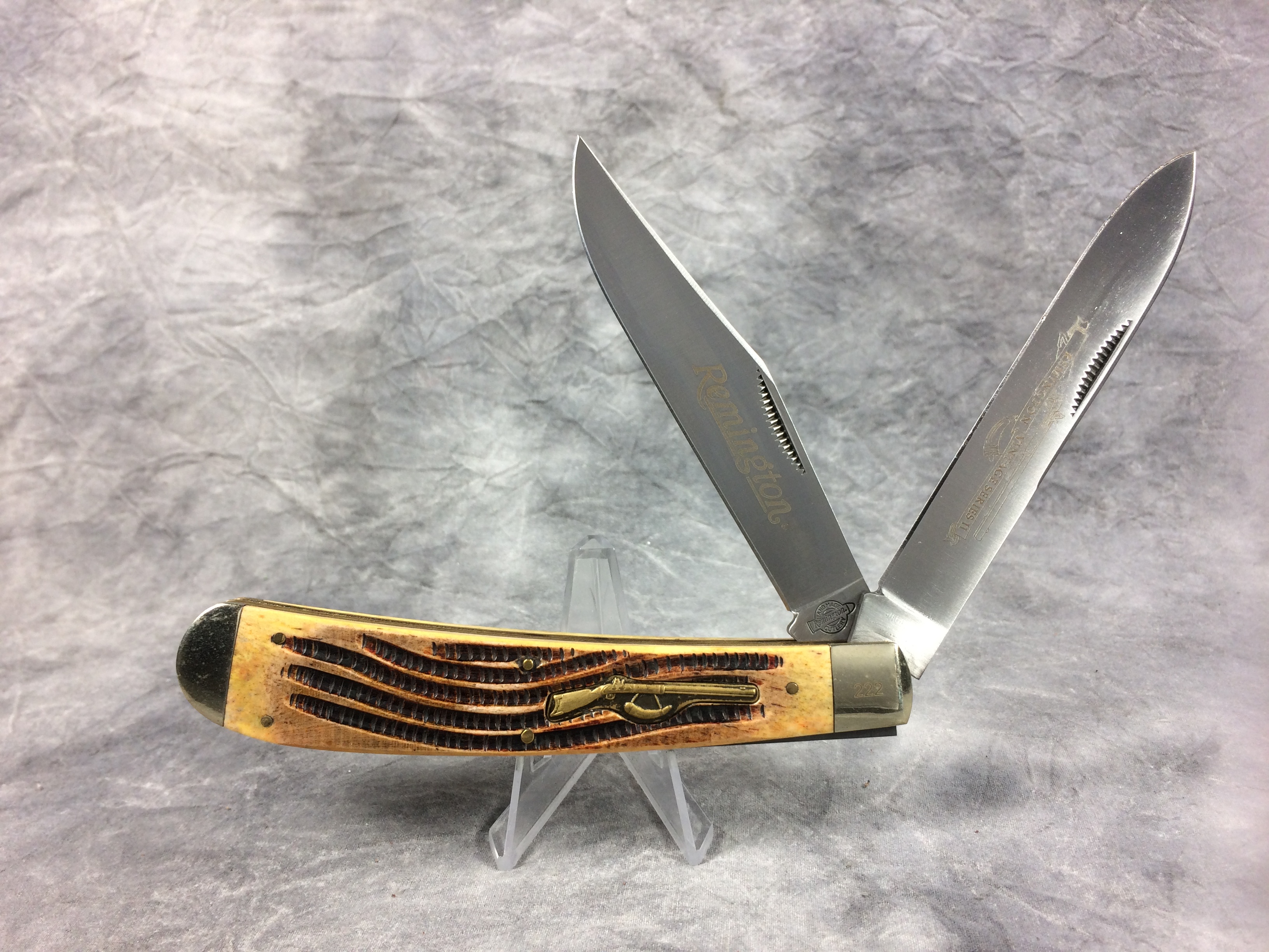 February 23, 2026 - 2-blade rifle knife. Limited Edition. 5-3/8 inches closed. 9-1/2 inches open. Circle w/ Bullet "HANDMADE REMINGTON CUTLERY" logo tang stamp. Rifle shield. Stainless steel blades etched "Remington" and "REMINGTON VINTAGE SERIES II" on banner with image of rifle. Carved yellow/orange bone handle. Nickel Silver bolsters; front right bolster etched with serial number. Brass liner.