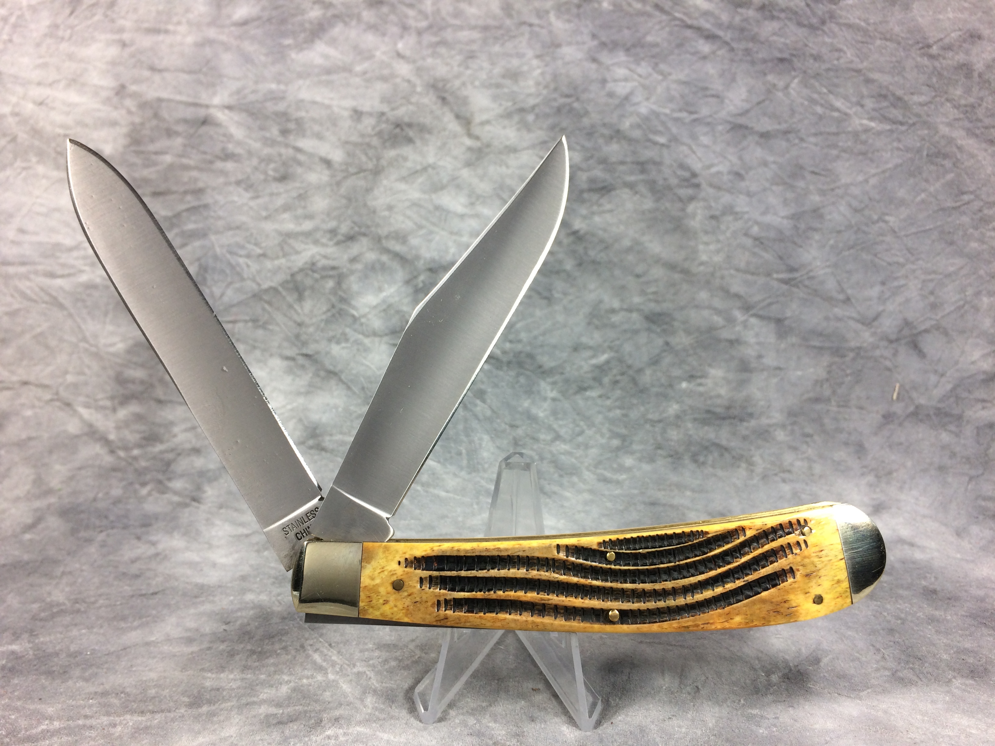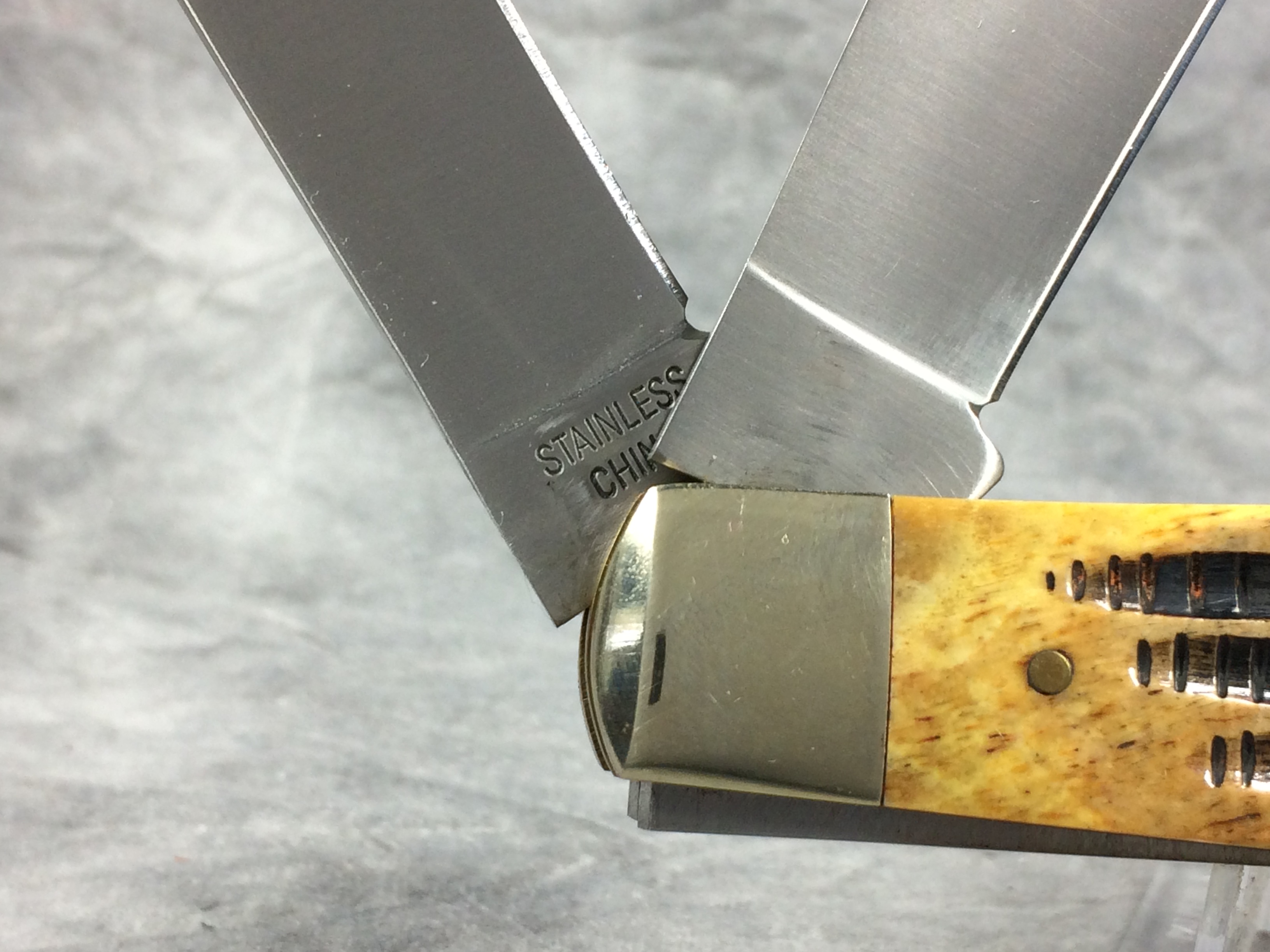 You have: REMINGTON NEW TANG Series II Handmade Yellow/Orange Bone 2-Blade Rifle Knife