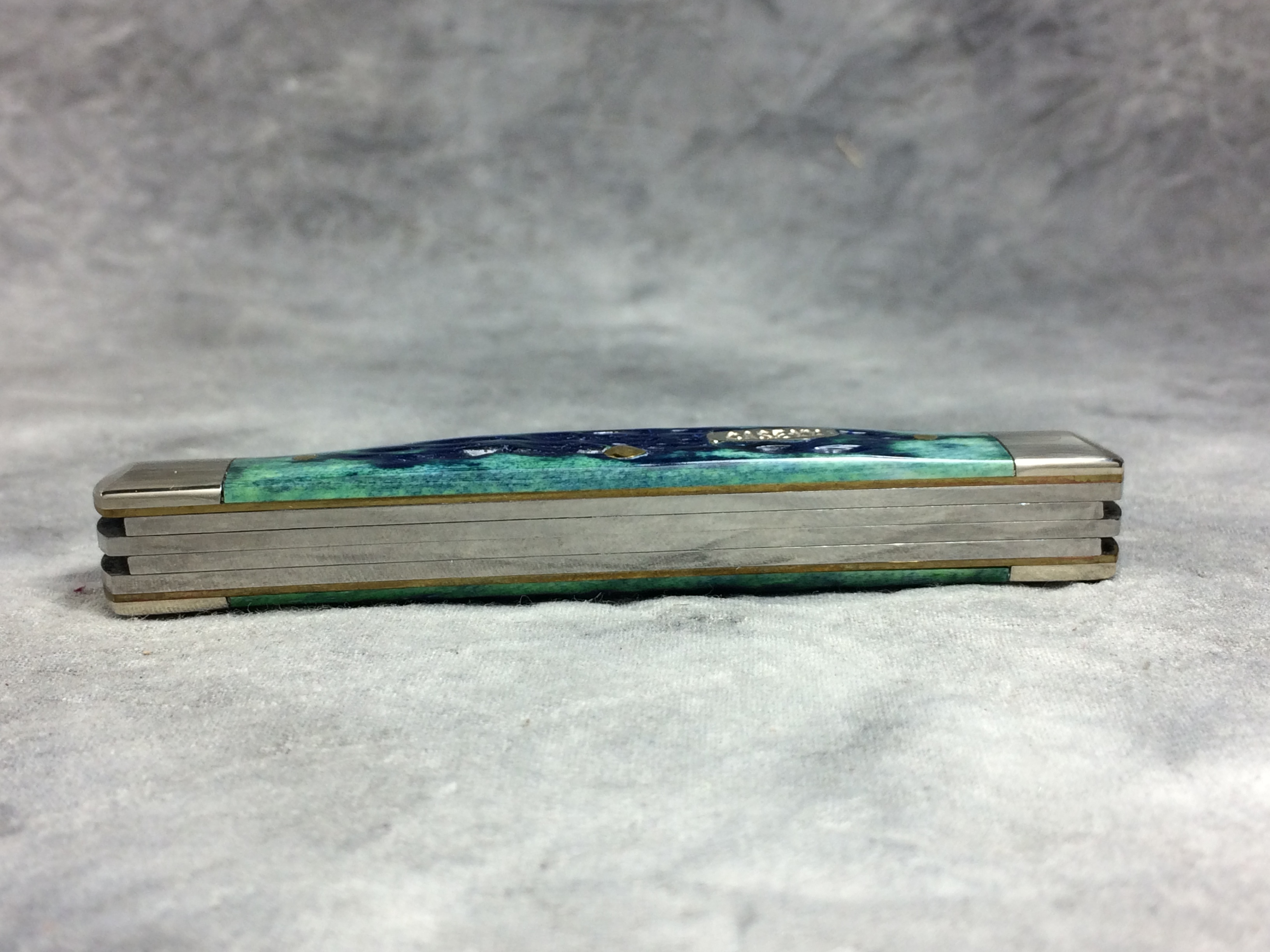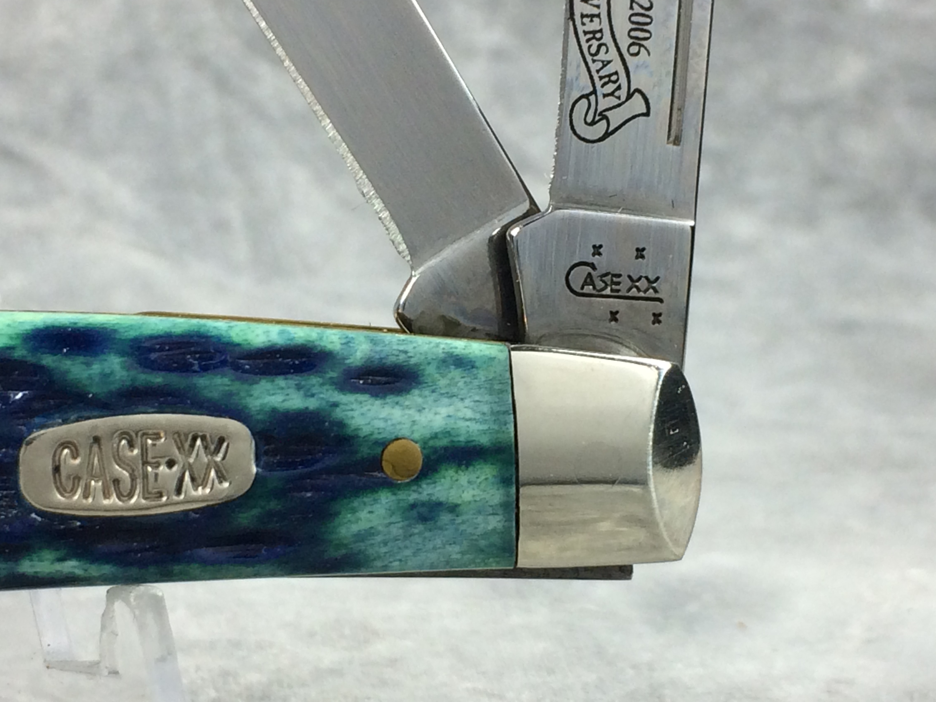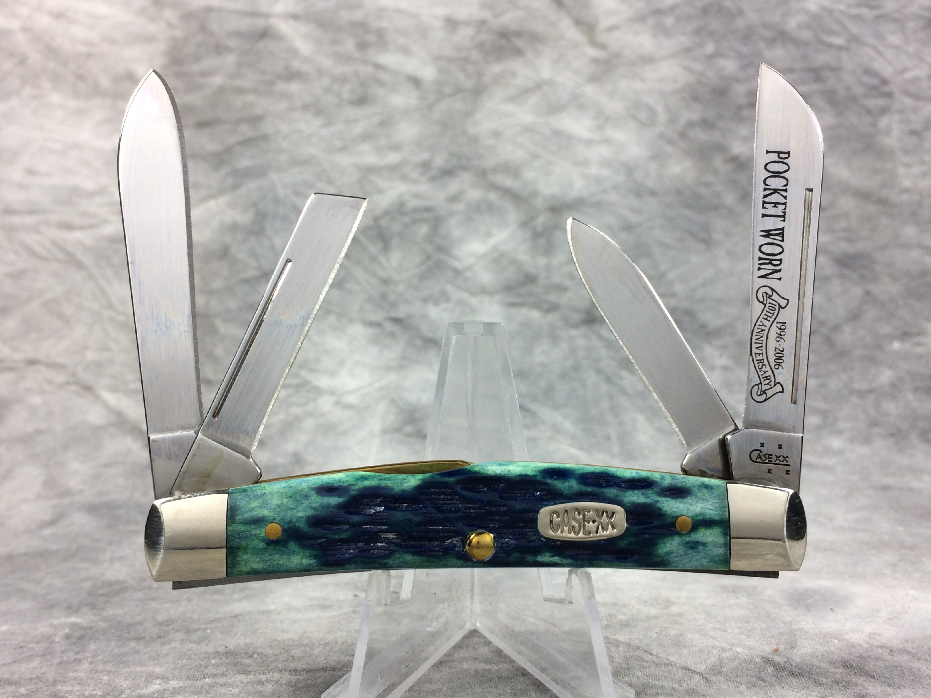 December 04, 2025 - 3-1/2 inches closed. 5-7/8 inches open. Made in USA. " x x Case XX    x x " (with lightning bolt S) and "USA 64052 SS" tang stamp. Oval closed-C block letter "CASE-XX" shield. Stainless Steel blades. Main blade etched "POCKET WORN 1996-2006 10TH ANNIVERSARY". Jigged aquamarine bone handle. Nickel Silver bolsters. Brass liner.