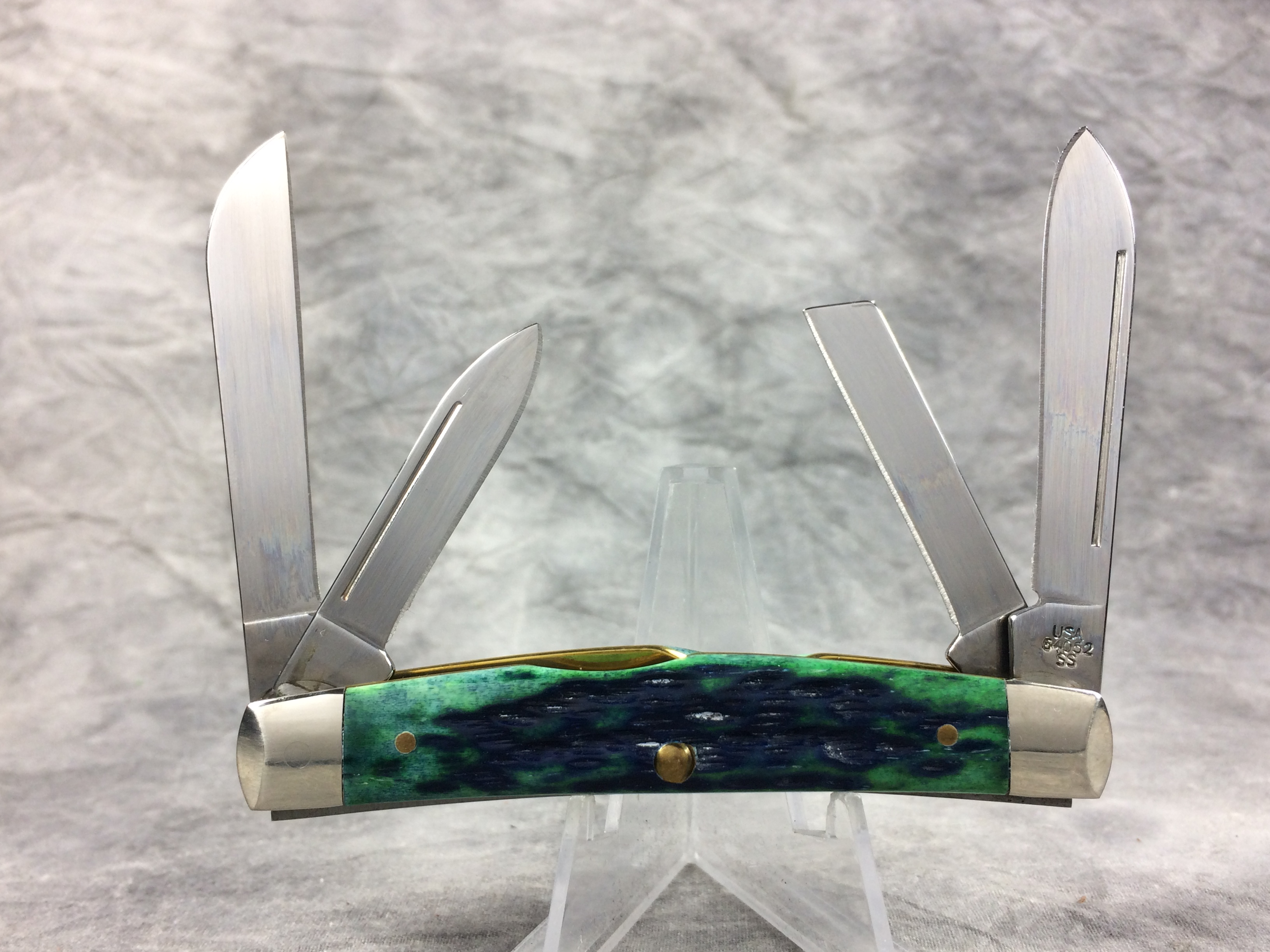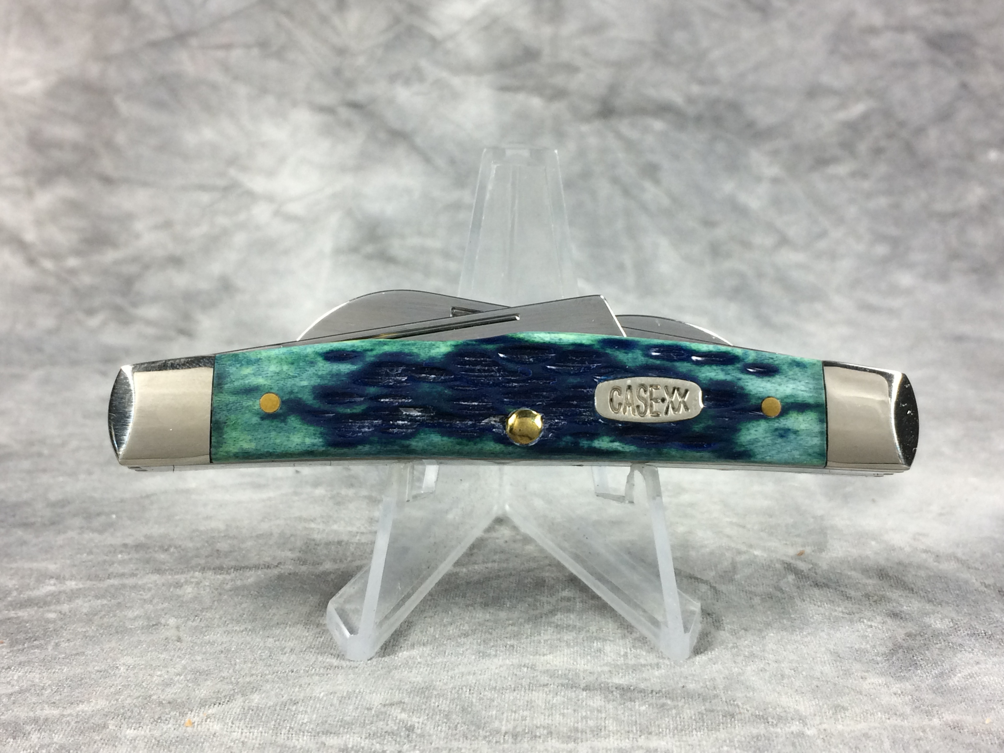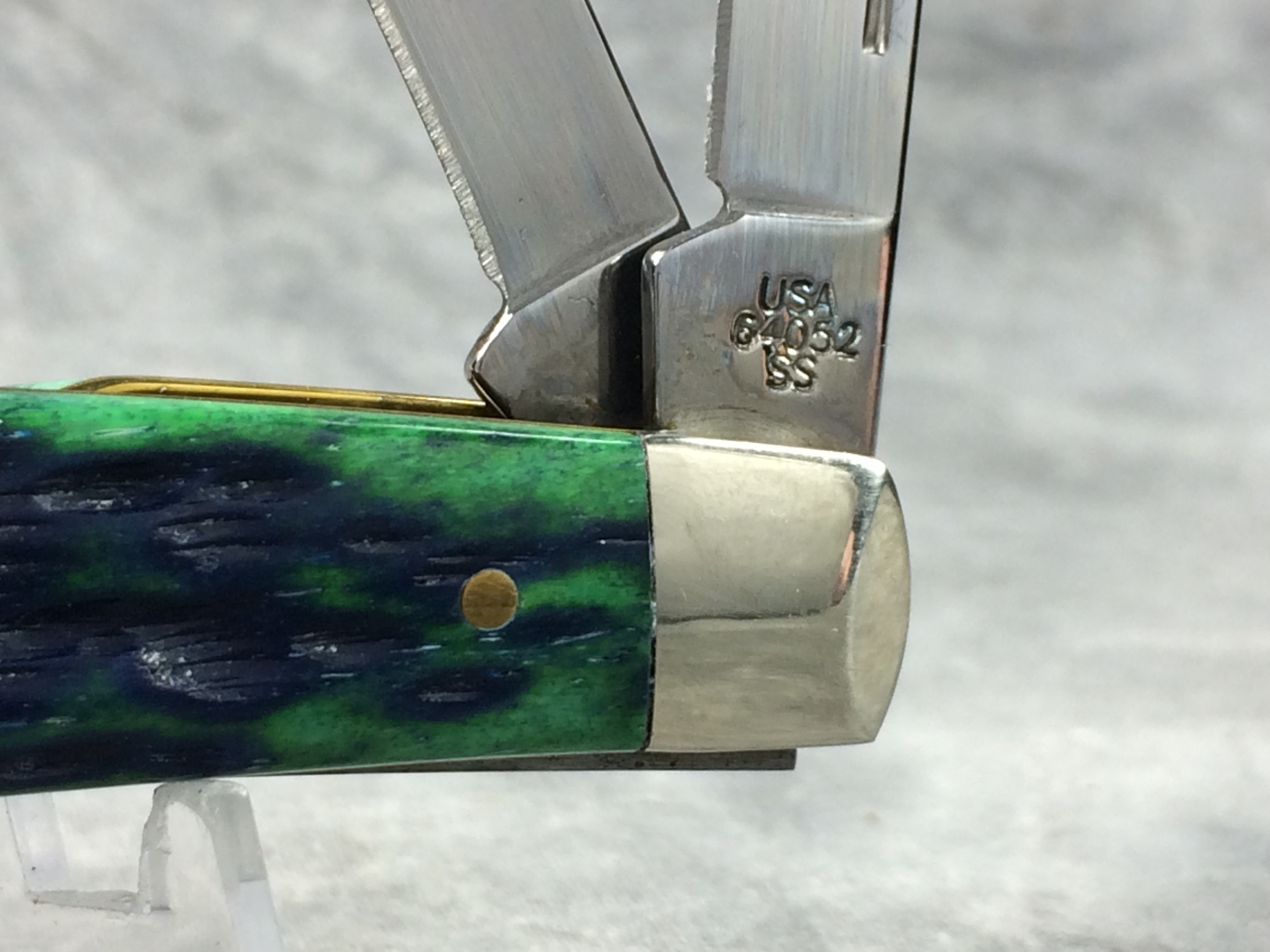 December 04, 2025 - 3-1/2 inches closed. 5-7/8 inches open. Made in USA. " x x Case XX    x x " (with lightning bolt S) and "USA 64052 SS" tang stamp. Oval closed-C block letter "CASE-XX" shield. Stainless Steel blades. Main blade etched "POCKET WORN 1996-2006 10TH ANNIVERSARY". Jigged aquamarine bone handle. Nickel Silver bolsters. Brass liner.