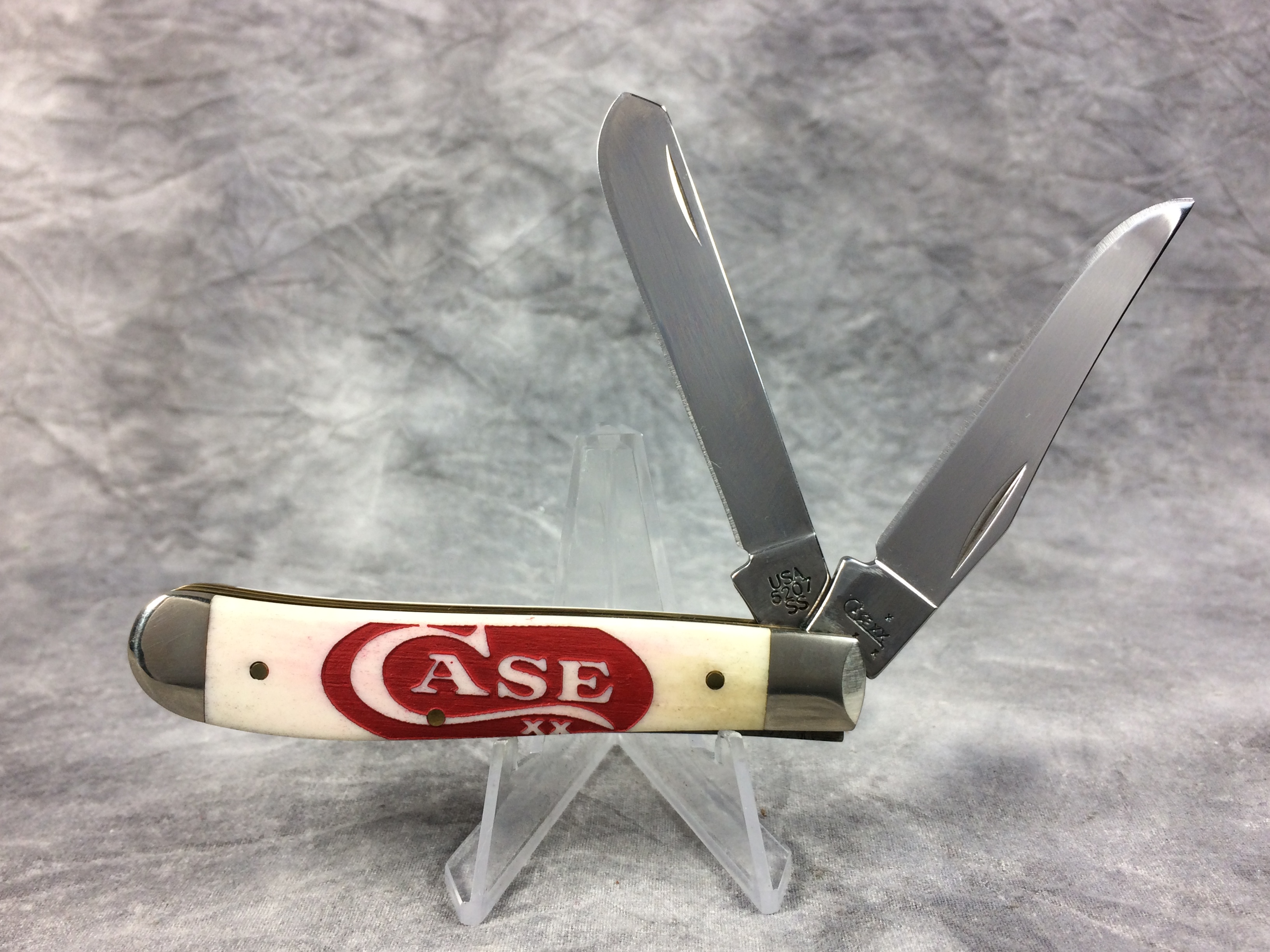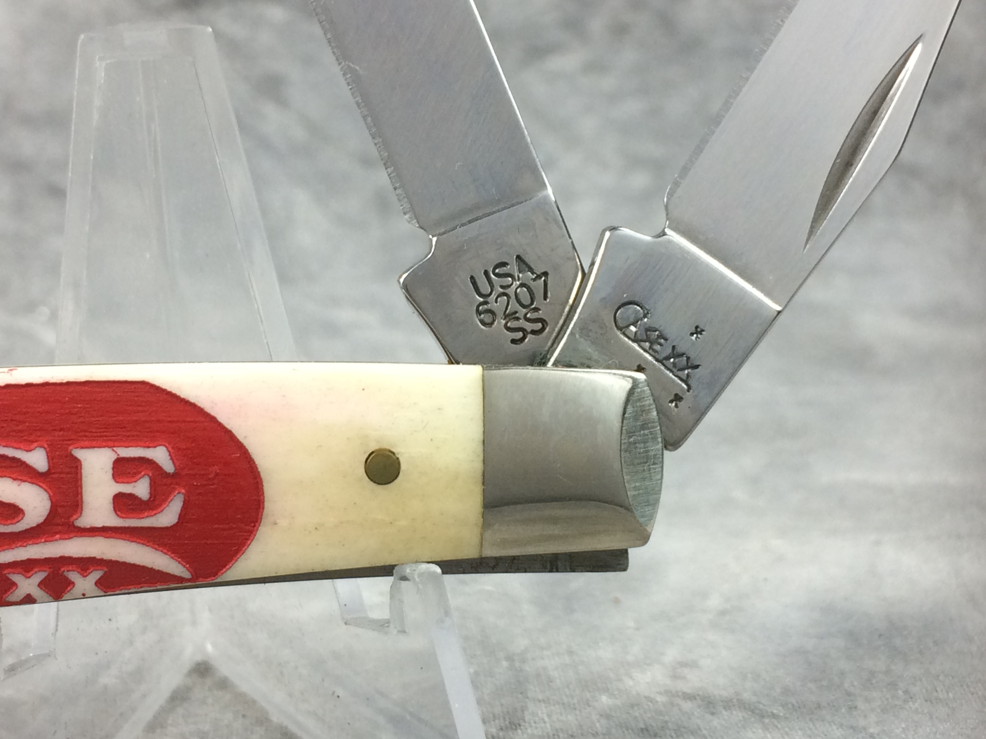 October 26, 2025 - 3-1/2 inches closed. 6-1/8 inches open. Made in USA. "   x  Case XX     x x  " (with lightning bolt S) and "USA 6207 SS" tang stamps. Stainless Steel blades. Red oval long tail C "CASE _ xx" laser work (front and back) on antique smooth bone handles. Nickel Silver bolsters. Brass liner.