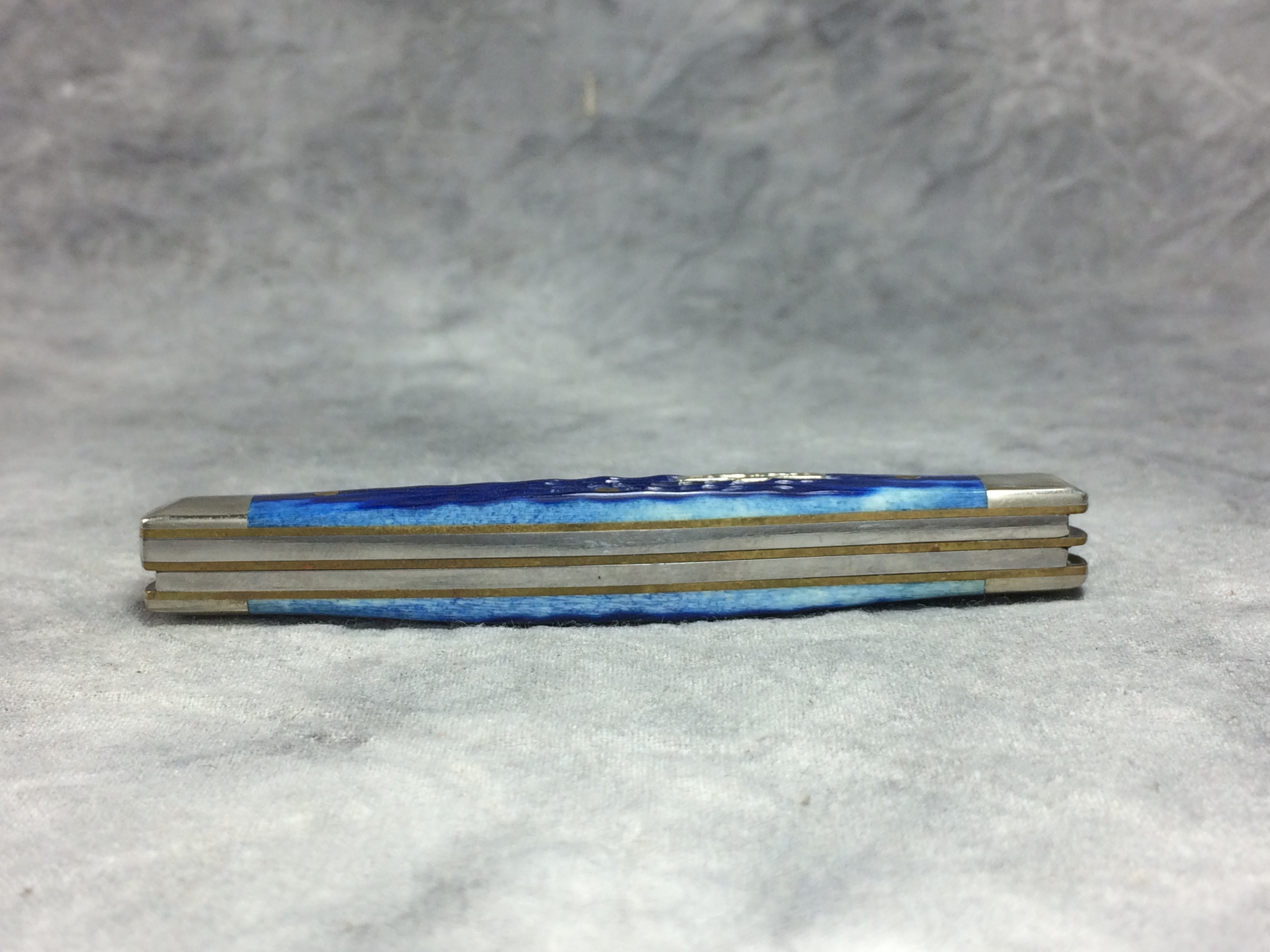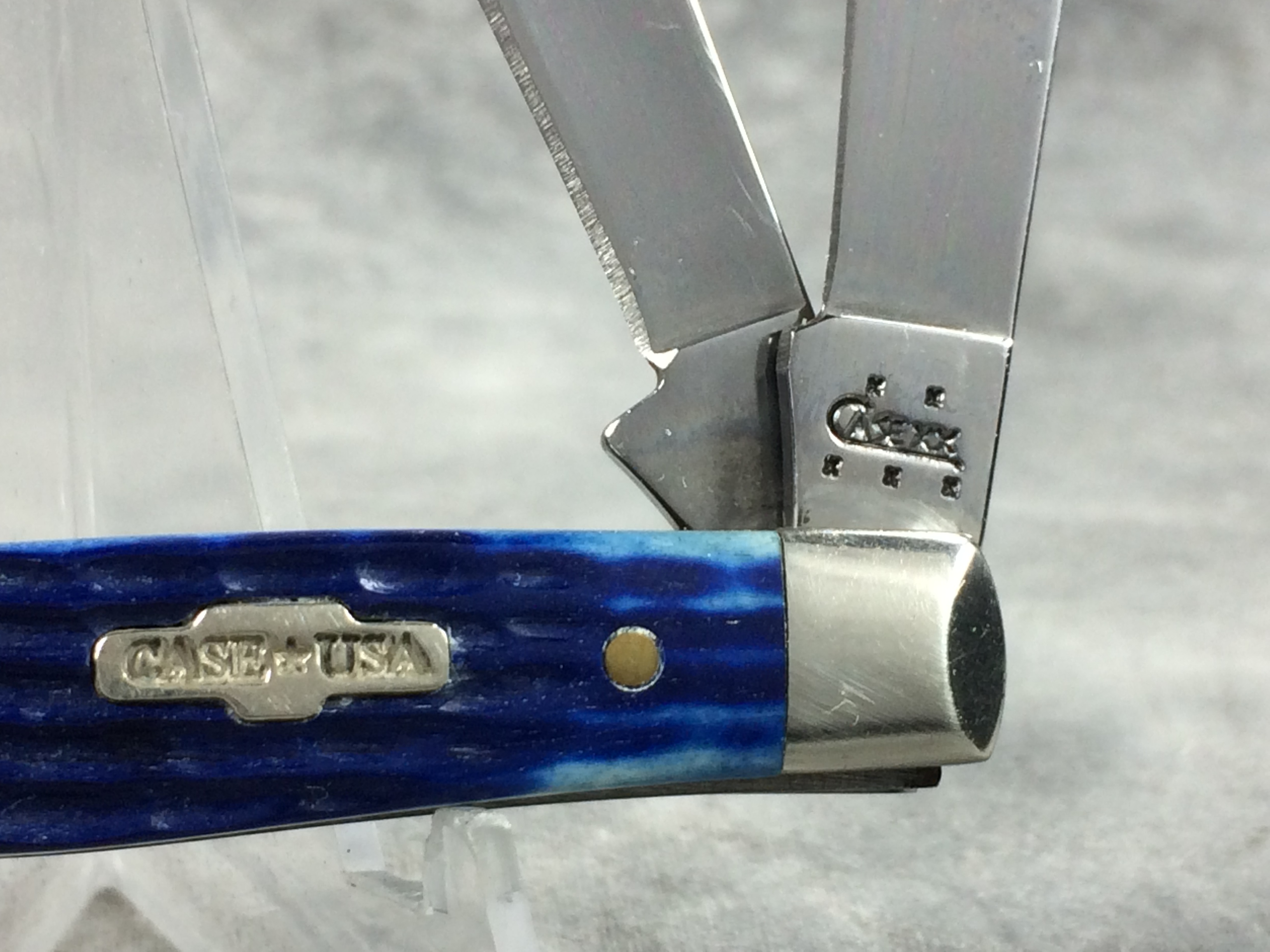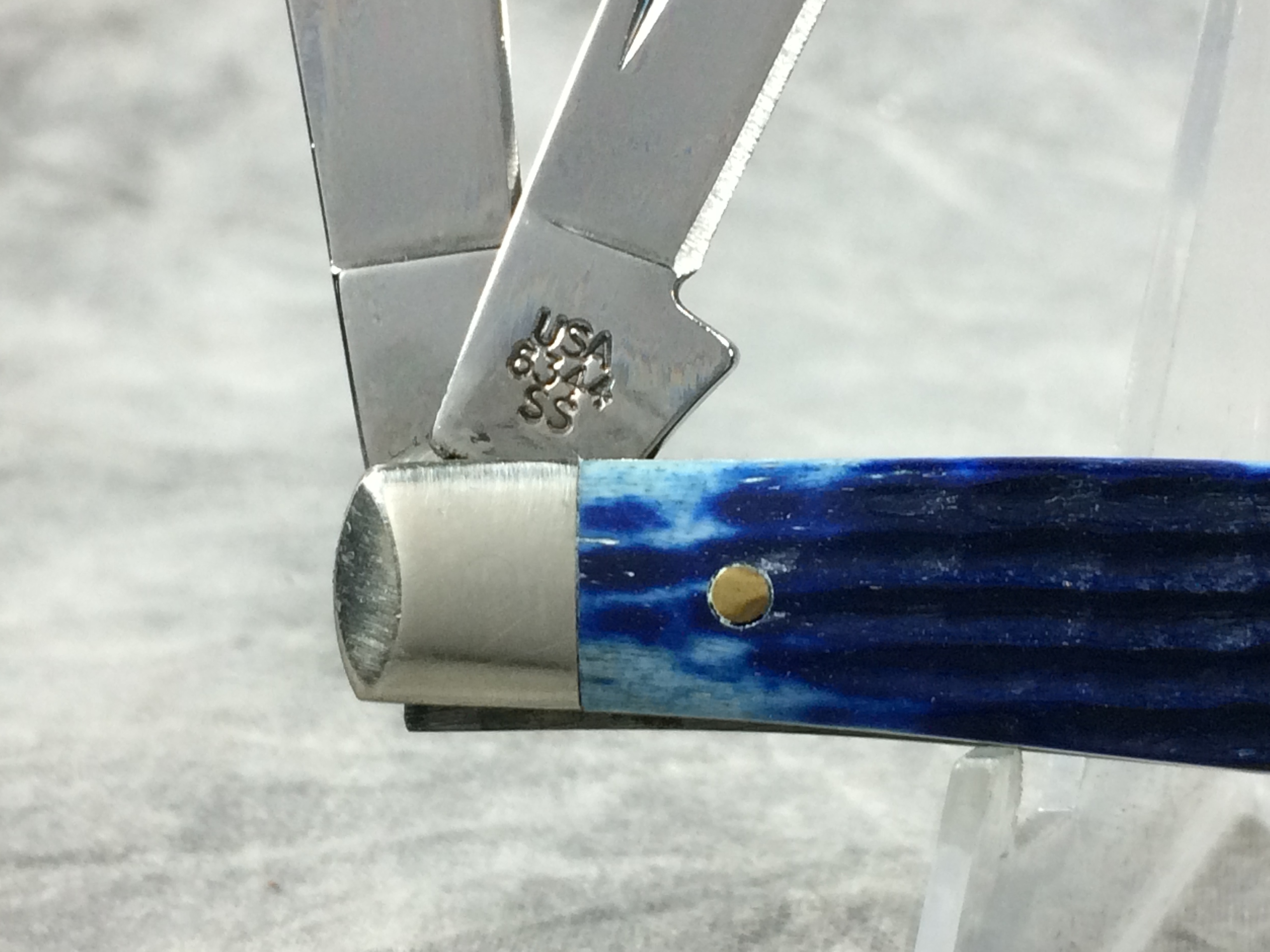 February 03, 2026 - 3-1/4 inches closed. 5-3/4 inches open. Made in USA. "  x x   CASE XX  x x x  " and "USA 6344 SS" tang stamps. Rare "CASE*USA" shield. Stainless Steel blades. Blue jigged bone handle. Nickel Silver bolsters. Brass liner.