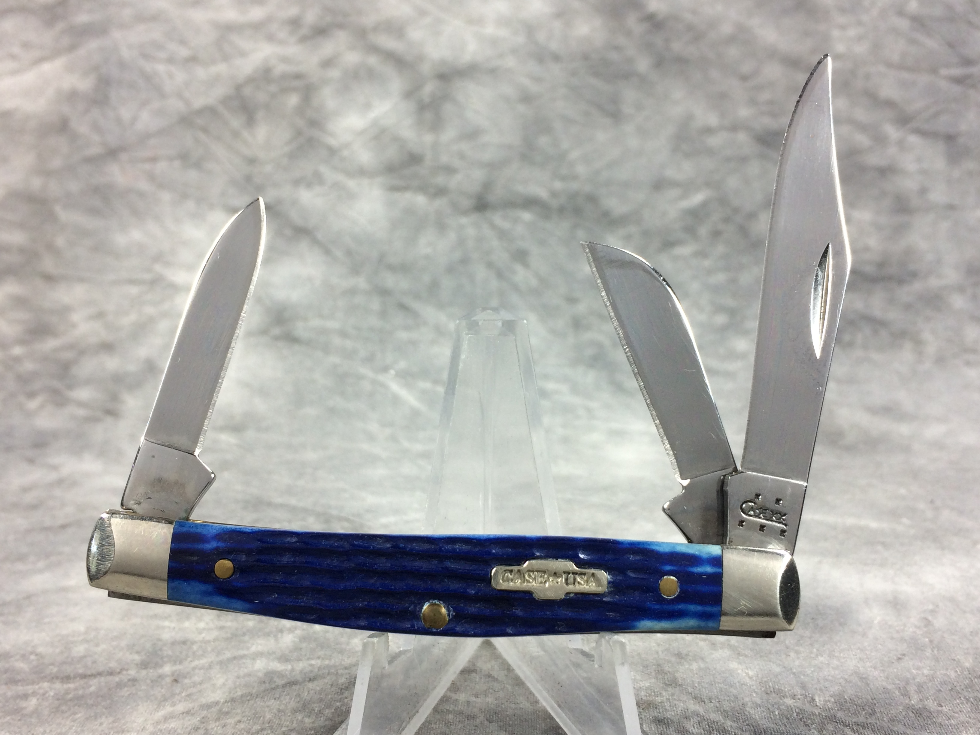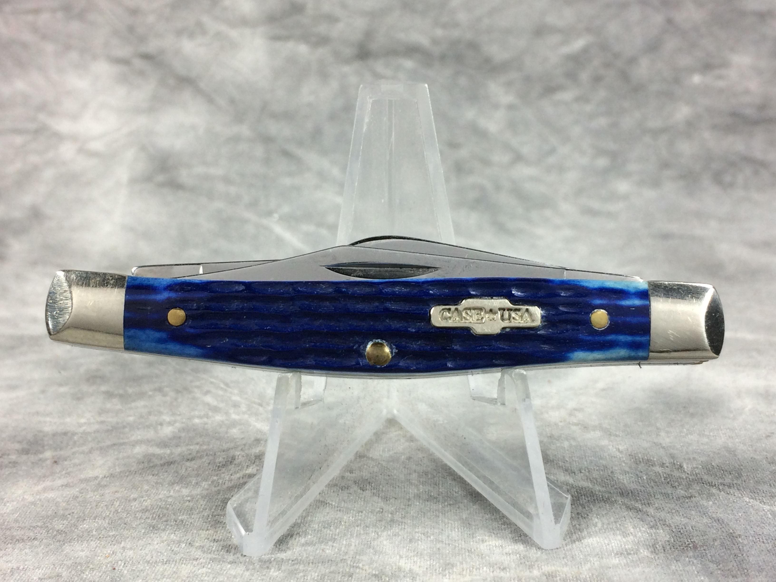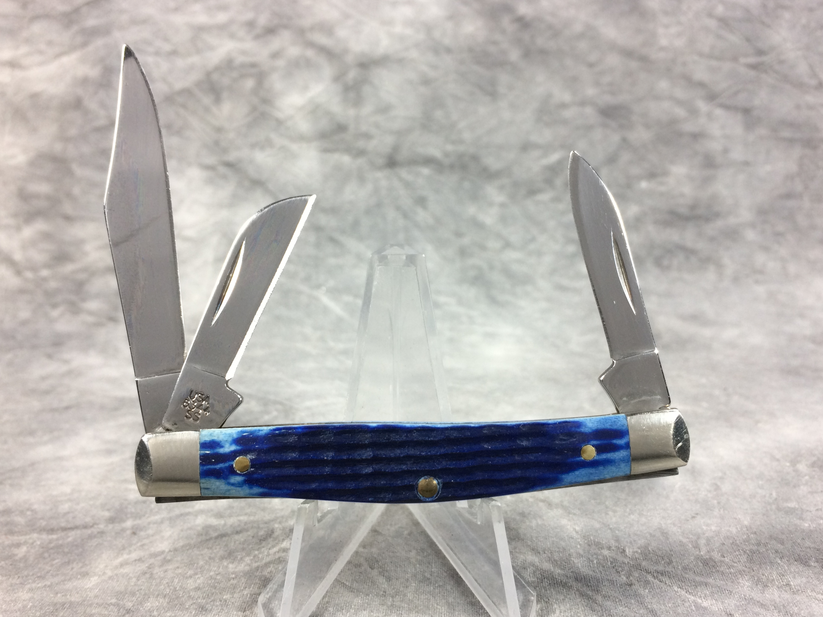 February 03, 2026 - 3-1/4 inches closed. 5-3/4 inches open. Made in USA. "  x x   CASE XX  x x x  " and "USA 6344 SS" tang stamps. Rare "CASE*USA" shield. Stainless Steel blades. Blue jigged bone handle. Nickel Silver bolsters. Brass liner.