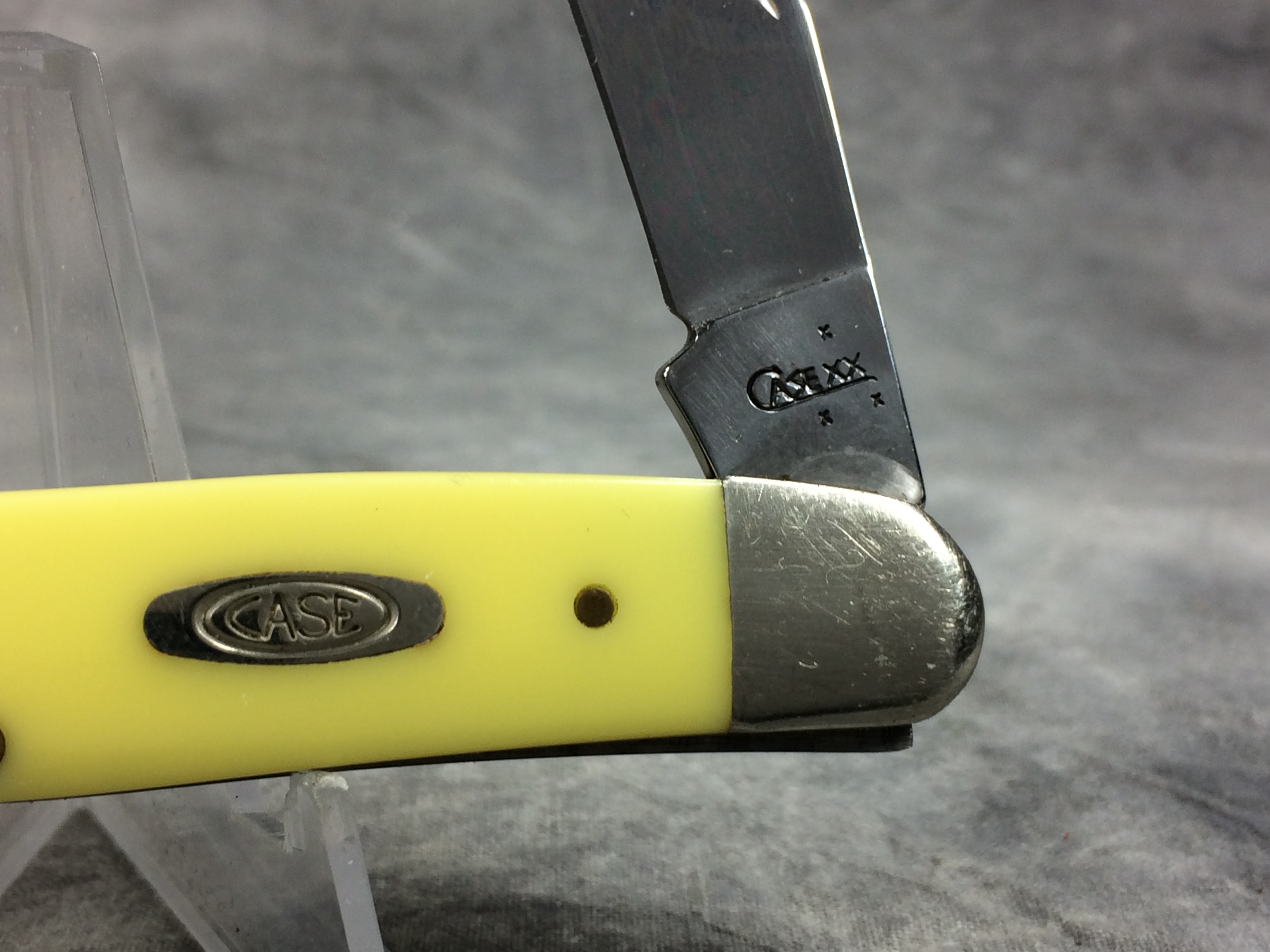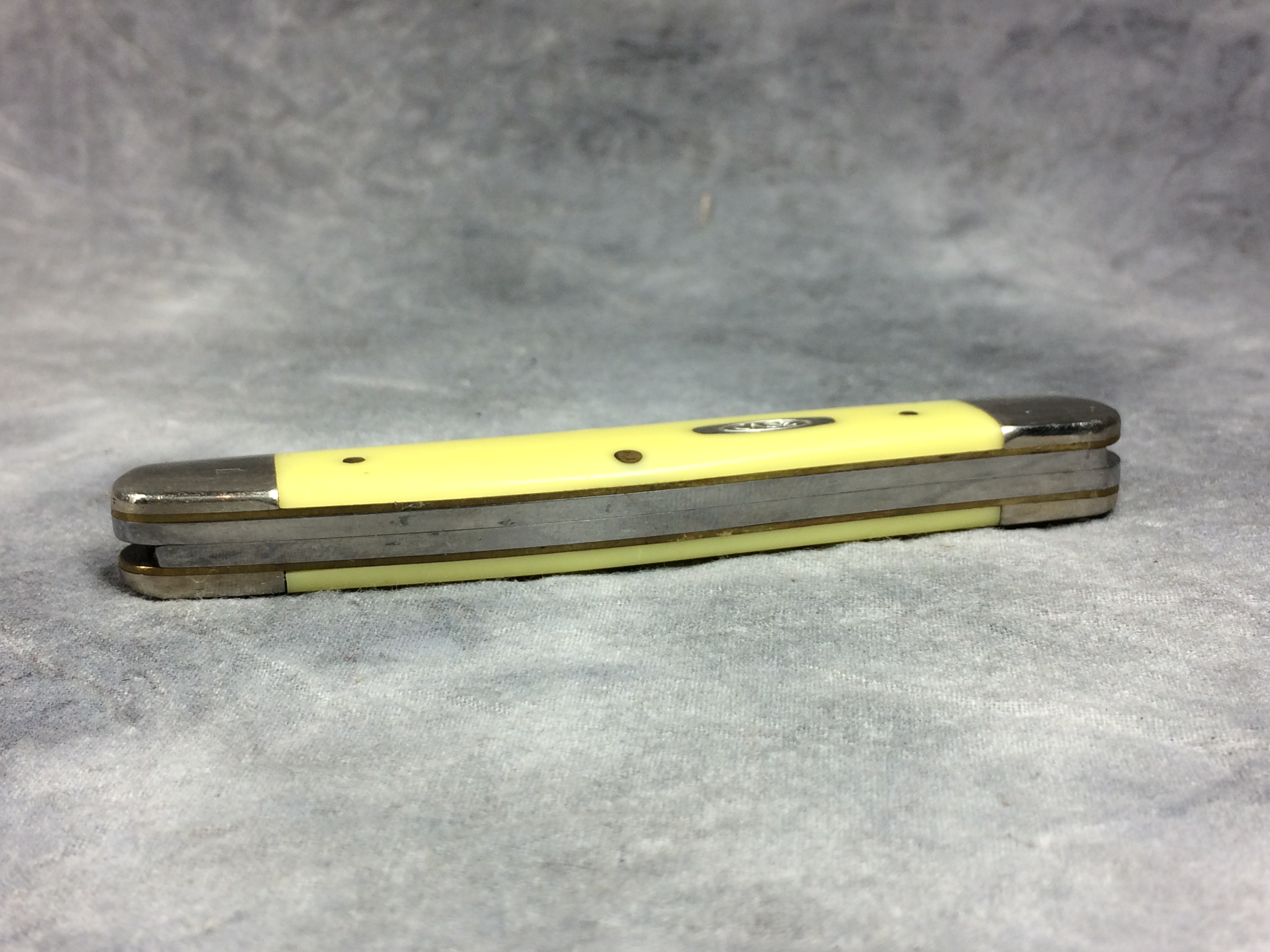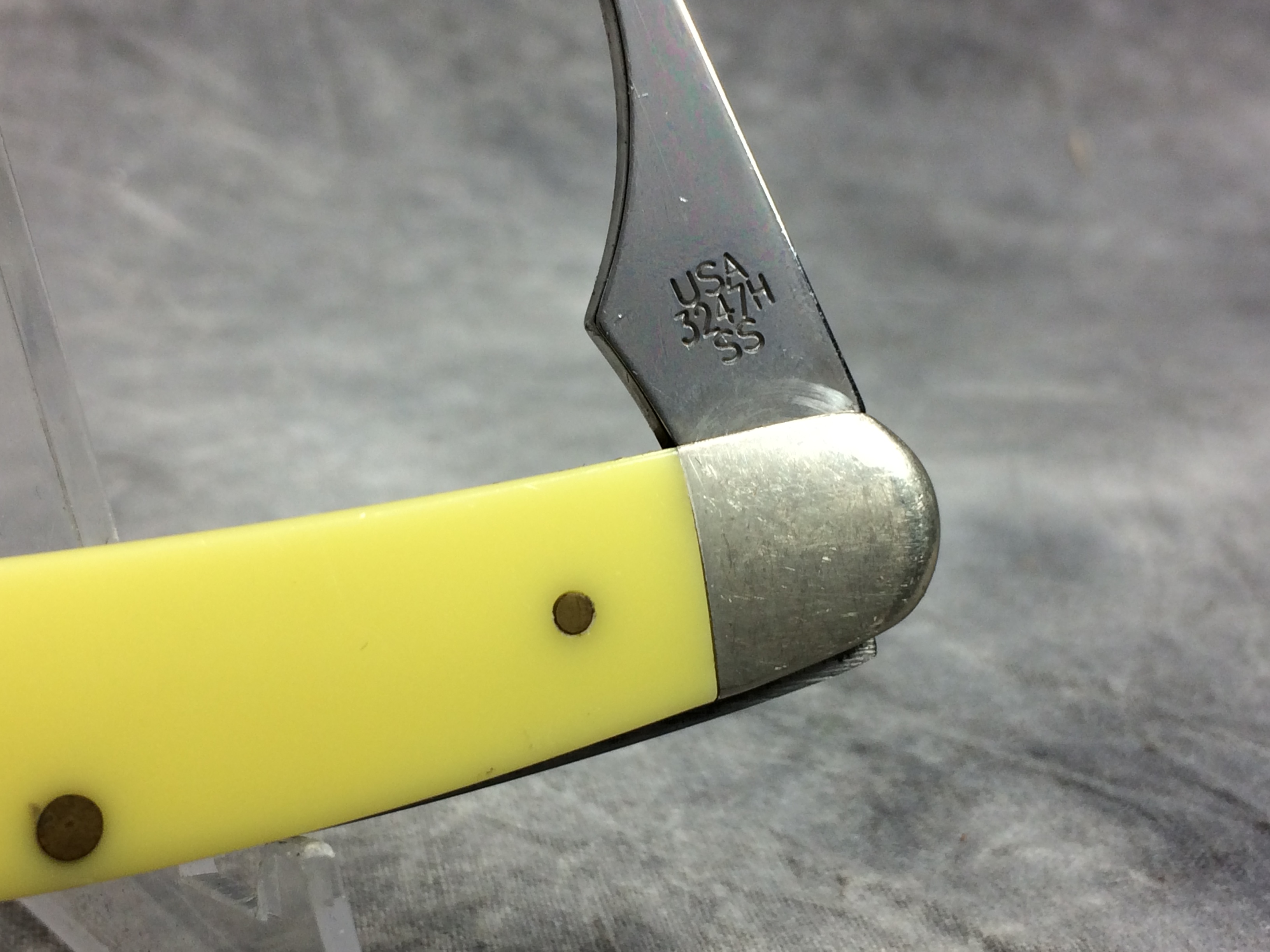 December 04, 2025 - 3-7/8 inches closed. 6-3/4 inches open. Made in USA. "   x  Case XX    x x  " (with lightning bolt S) and "USA 3247H SS" tang stamps. Double oval "open C" CASE shield. Stainless steel blades. Yellow composition handle. Nickel Silver bolsters. Brass liner.