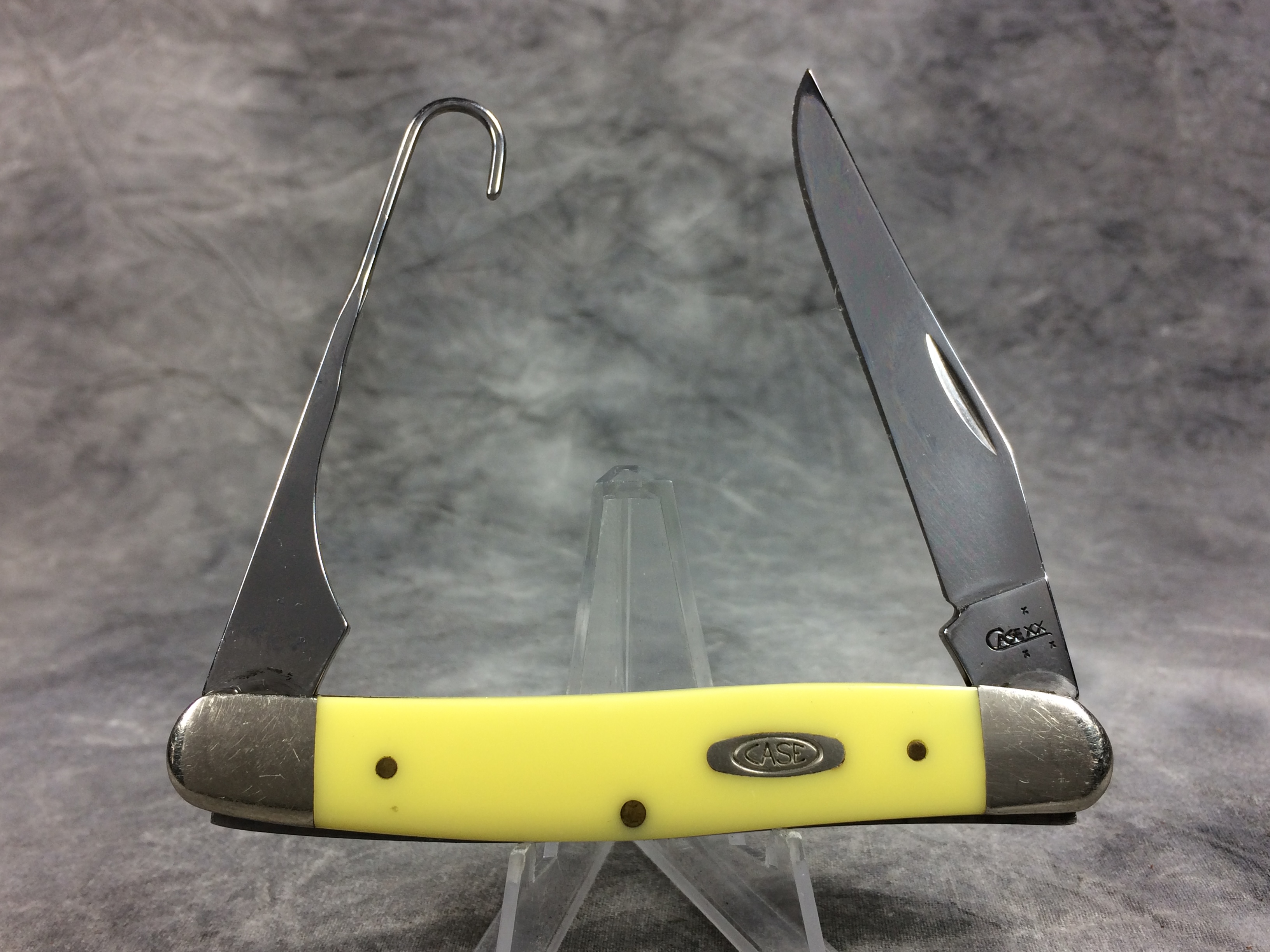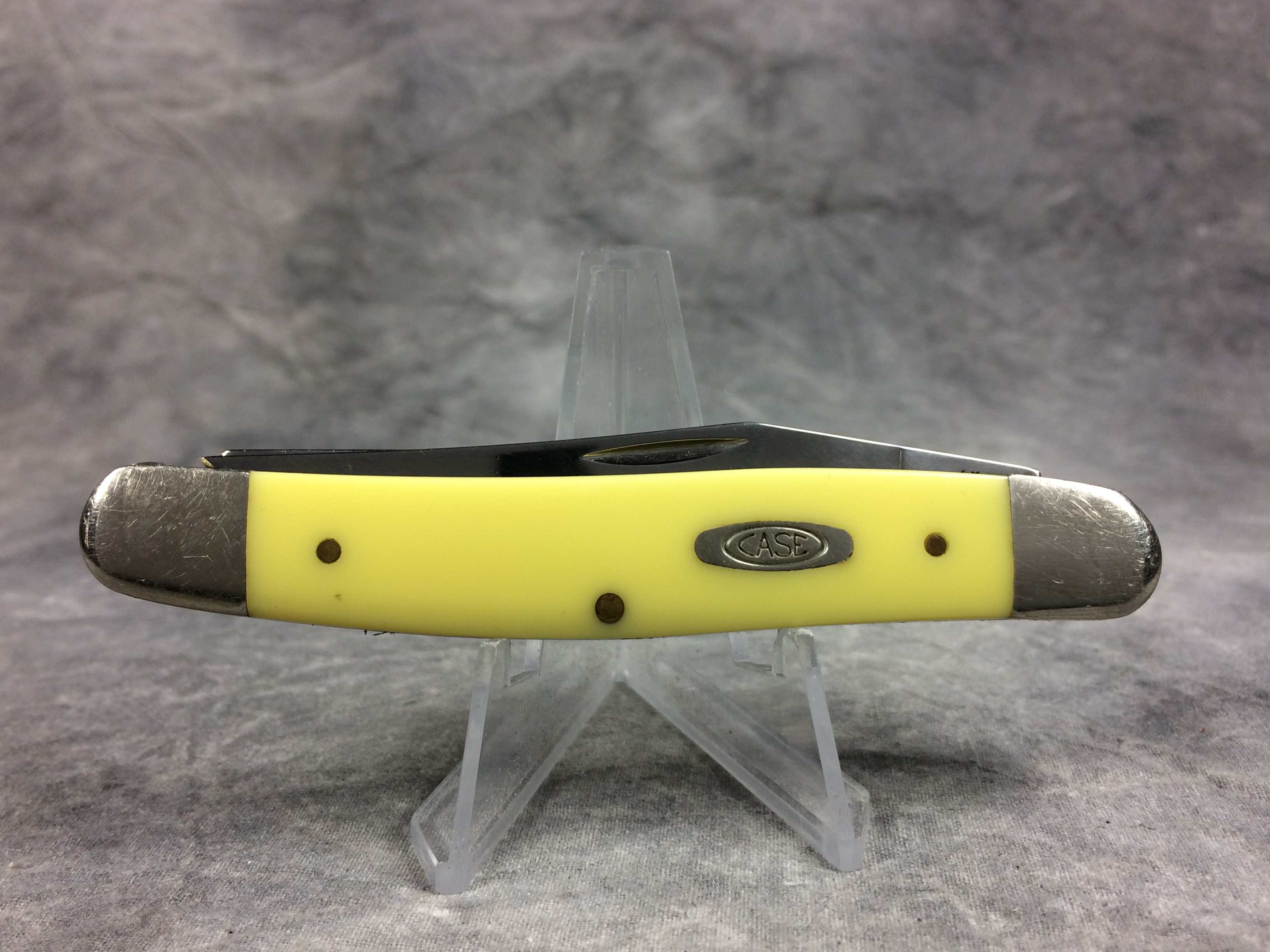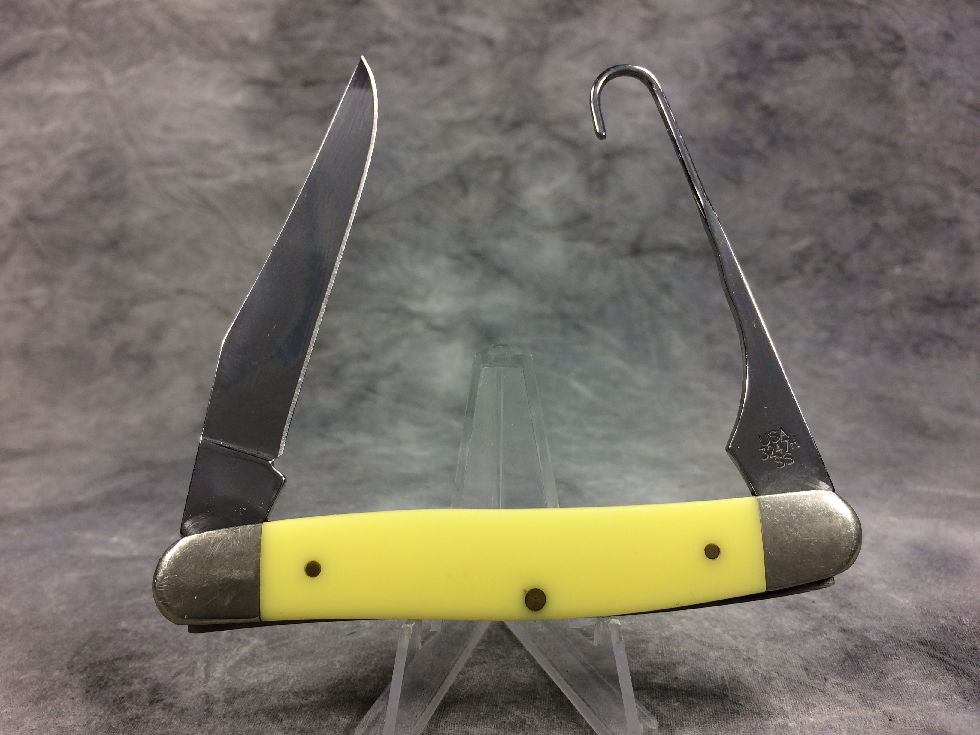 December 04, 2025 - 3-7/8 inches closed. 6-3/4 inches open. Made in USA. "   x  Case XX    x x  " (with lightning bolt S) and "USA 3247H SS" tang stamps. Double oval "open C" CASE shield. Stainless steel blades. Yellow composition handle. Nickel Silver bolsters. Brass liner.