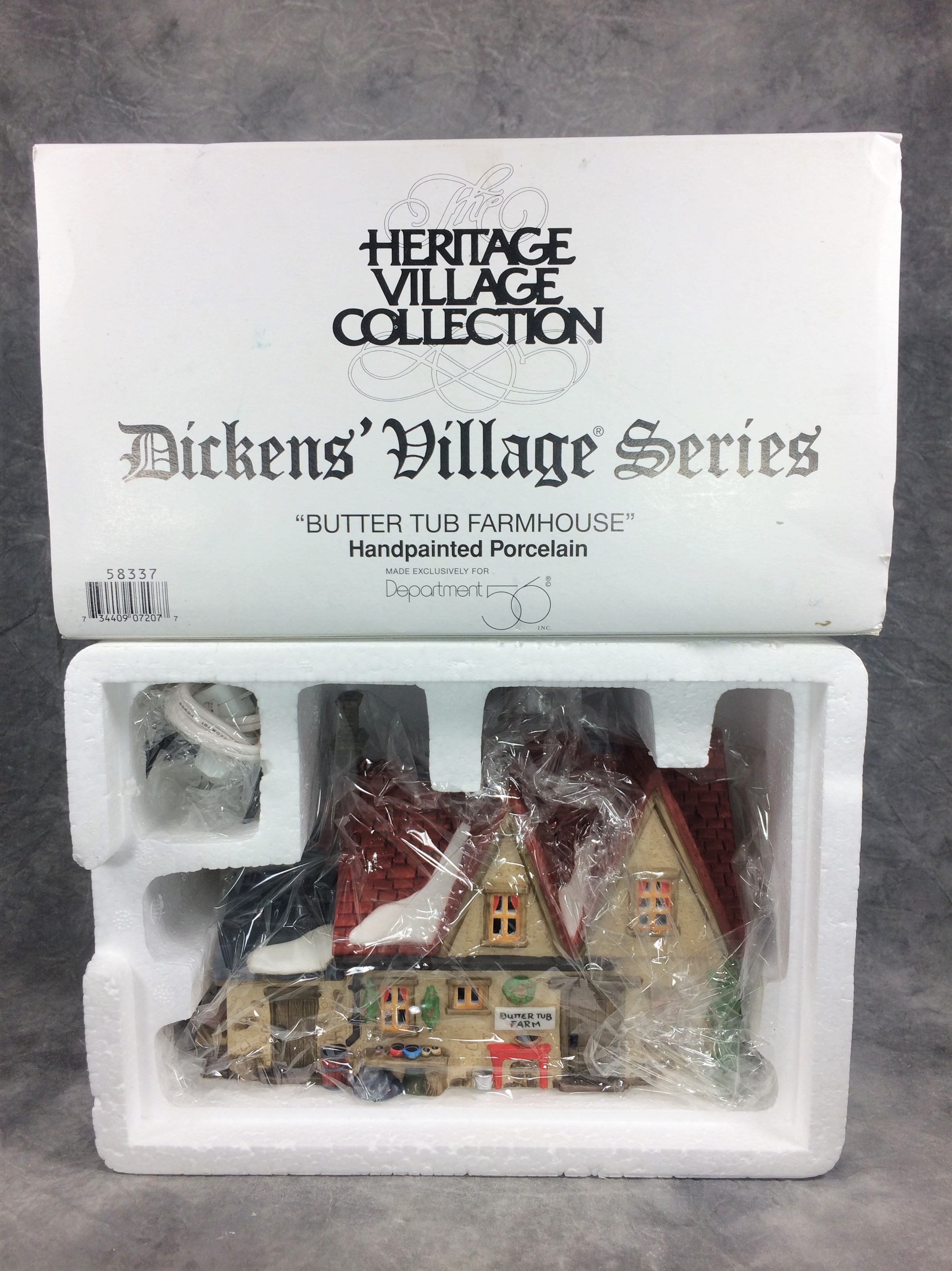 April 05, 2026 - 5-3/4 inches tall. Dickens' Village Series "BUTTER TUB FARMHOUSE". The Heritage Village Collection. Item number #58337. Made exclusively for Department 56. With light and power cord.