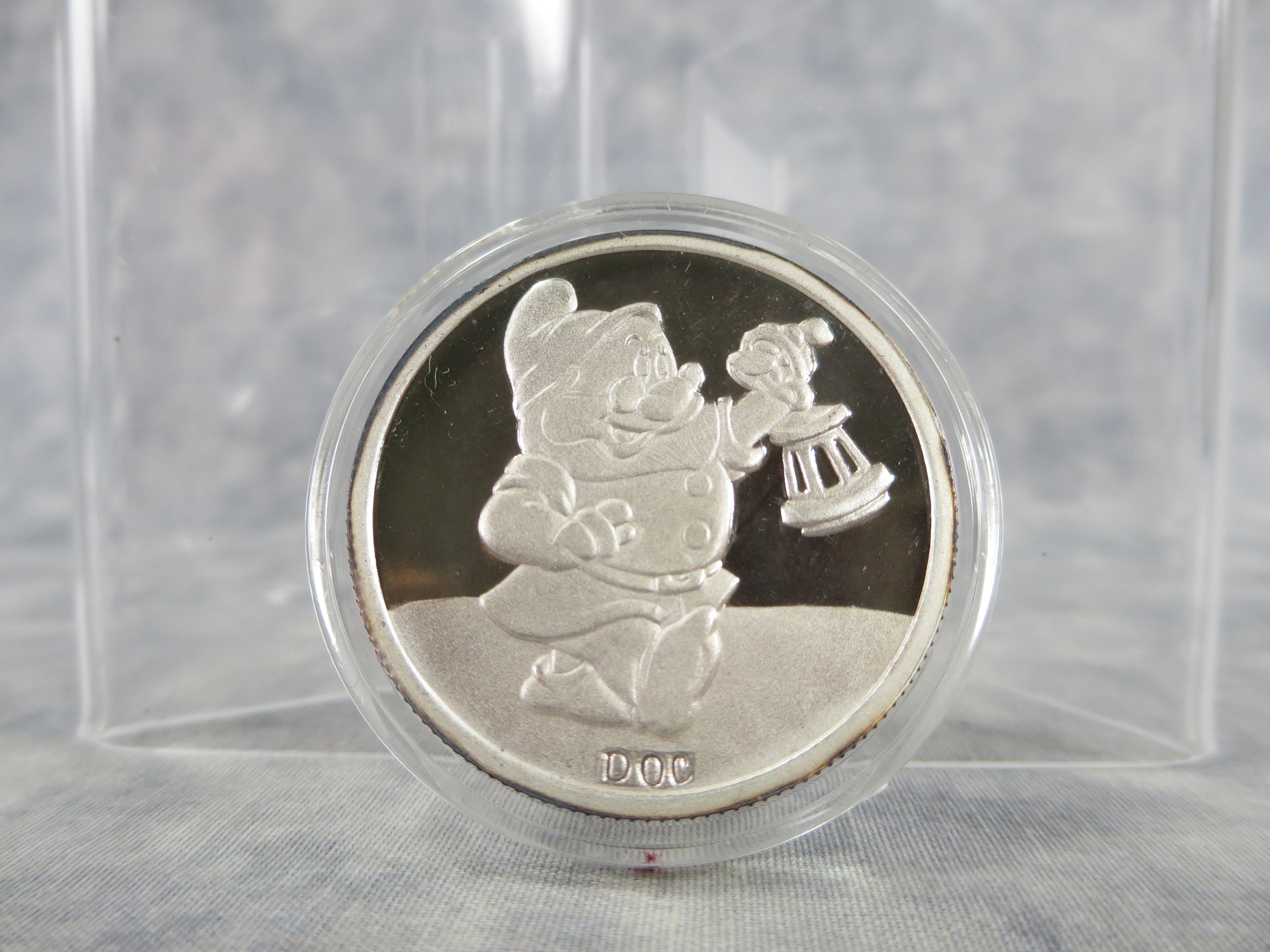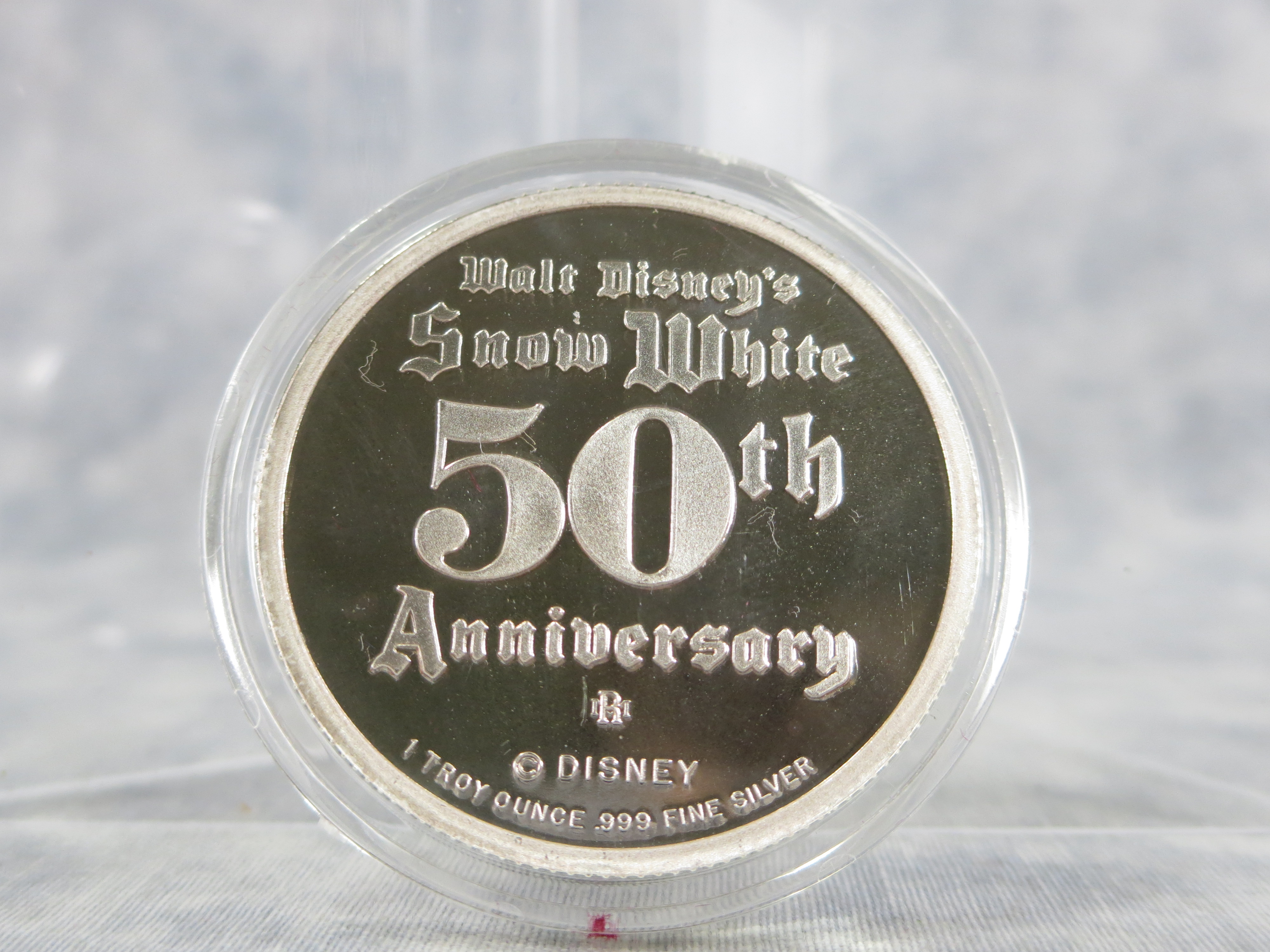 April 25, 2026 - Rarities Mint. Strictly Limited Edition of 20,000 medals. 1 troy ounce .999 Fine Silver proof Doc medal commemorating the 50th Anniversary of Walt Disney's Snow White and the Seven Dwarfs, released in 1937. 1-1/2 inch medal is encased in a hard plastic coin holder, housed inside a velvet display box with a serially numbered Certificate of Authenticity certified 6/1/87.
