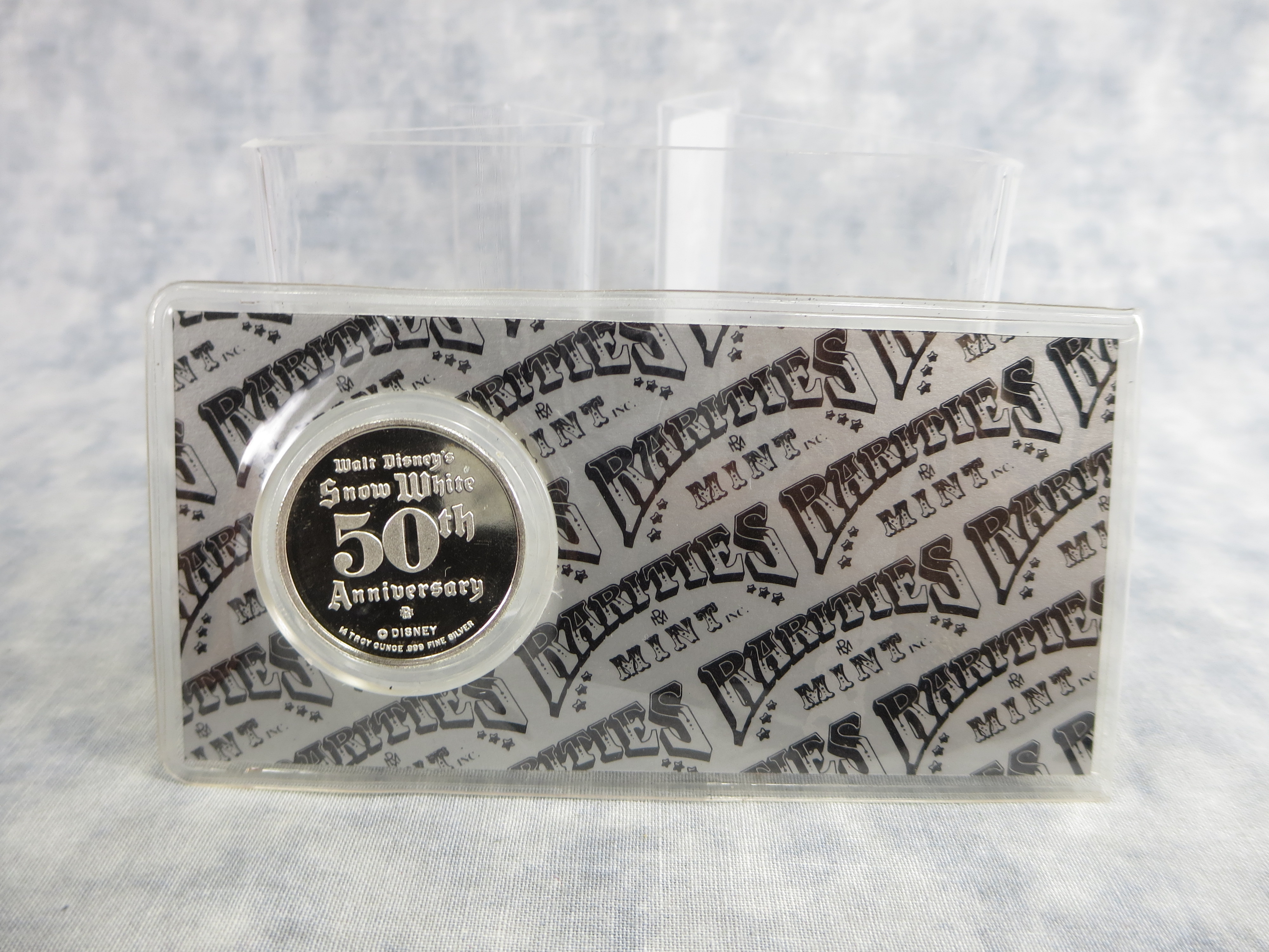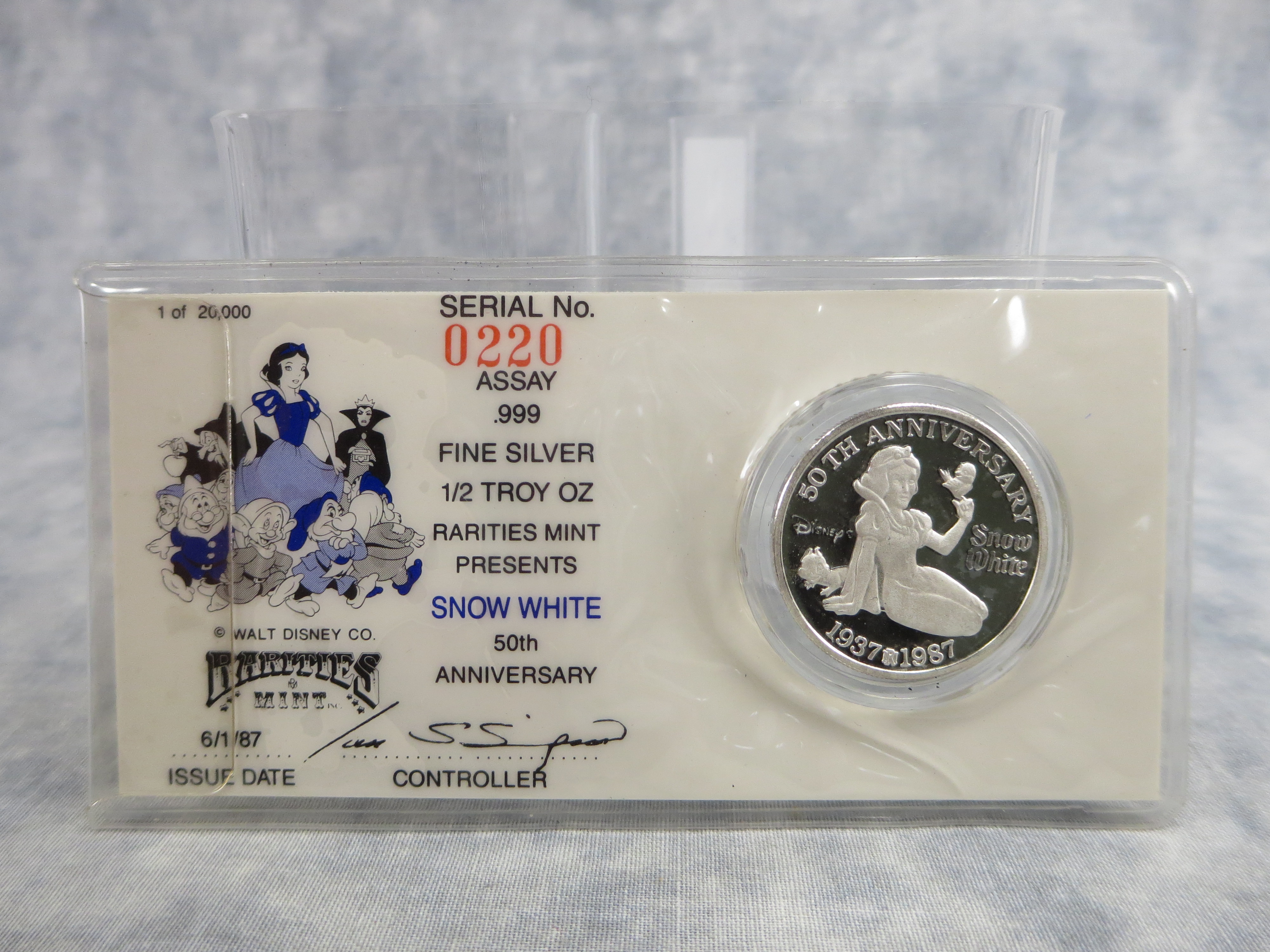 February 23, 2026 - Rarities Mint. Strictly Limited Edition of 20,000 medals. 1/2 troy ounce .999 Fine Silver proof medal commemorating the 50th Anniversary of Walt Disney's Snow White and the Seven Dwarfs, released in 1937. 30 mm medal is encased in a hard plastic coin holder on a serially numbered Certificate of Authenticity card, certified 6/1/87.