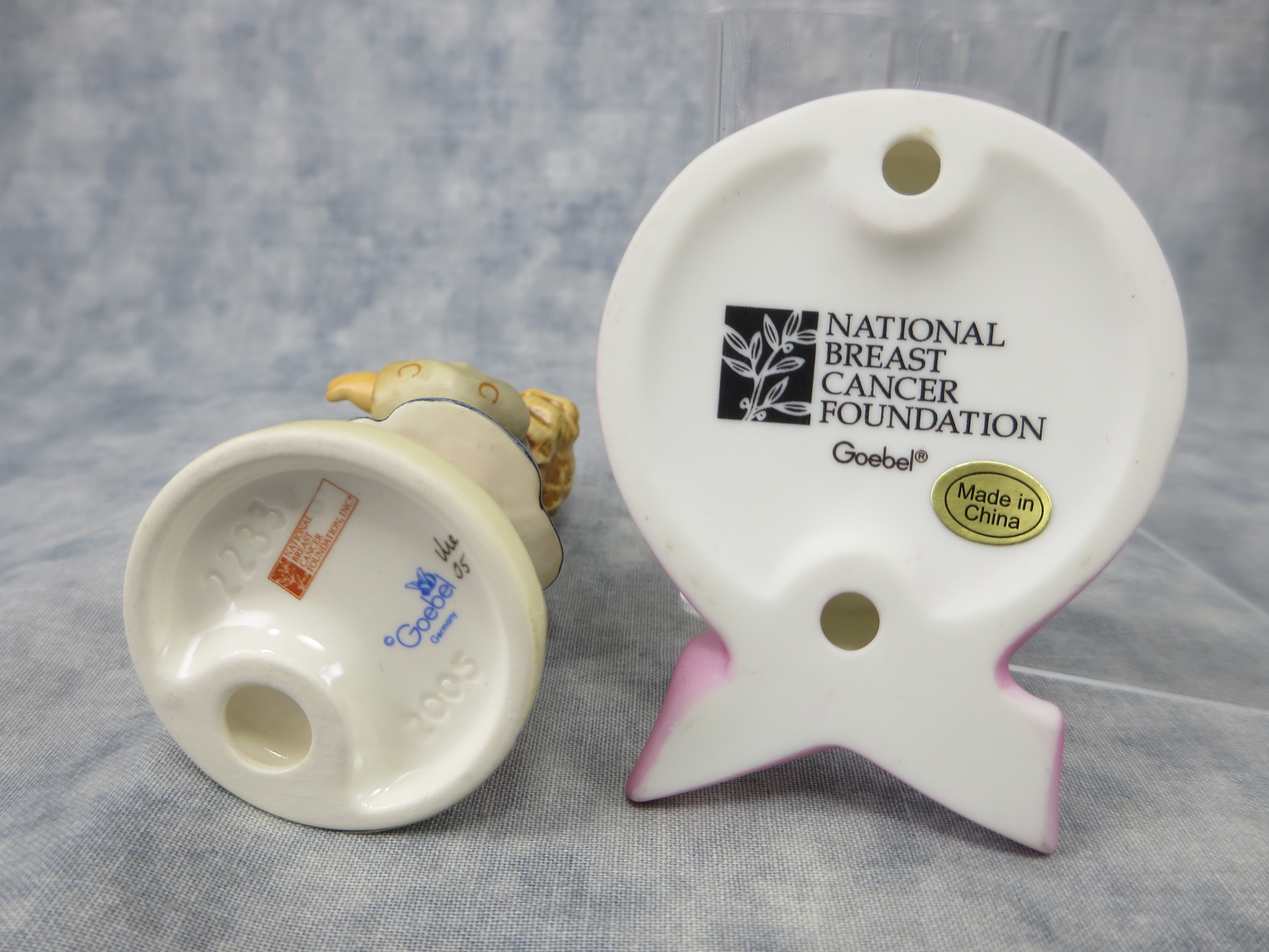April 05, 2026 - 3-1/2 inches tall. Base is incised 2233 and 2005. Goebel TMK 8 trademark imprinted in blue and NATIONAL BREAST CANER FOUNDATION, INC stamp imprinted in red on bottom of base. Painter hand-initialed and dated in black ink on bottom of base.