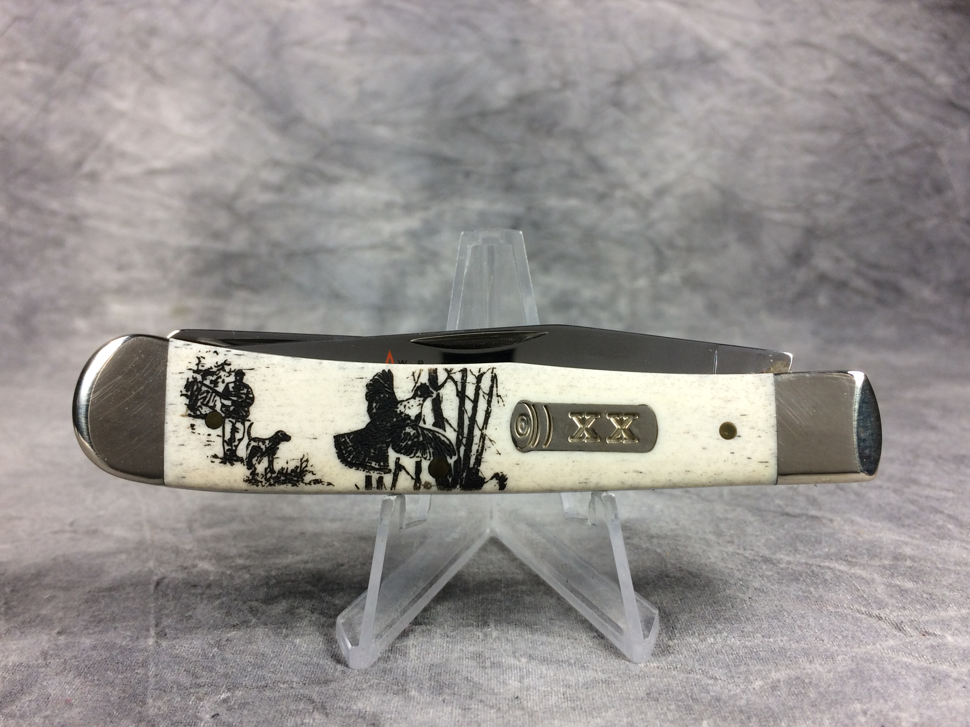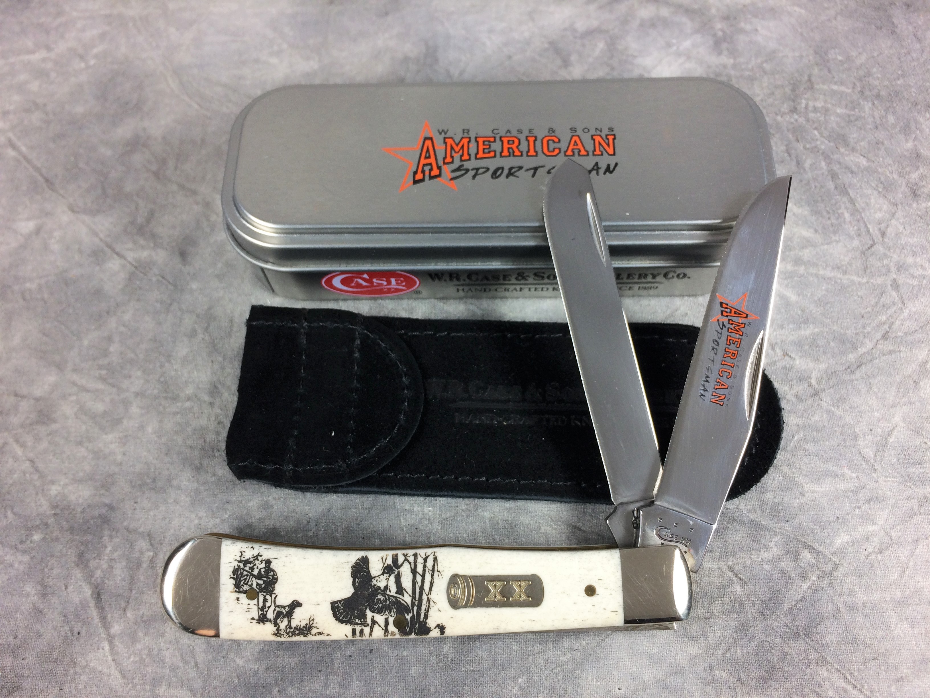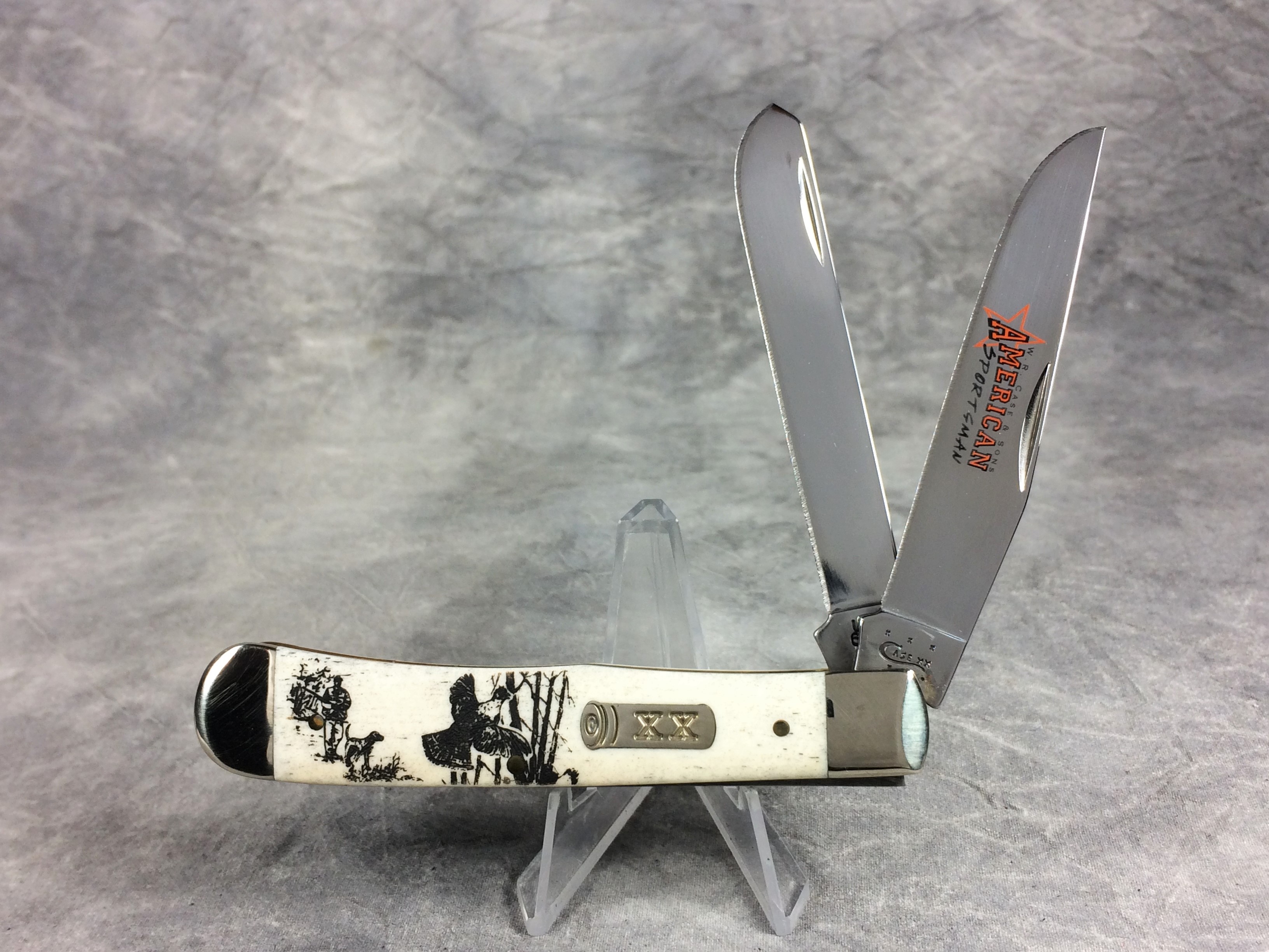 December 04, 2025 - 4-1/8 inches closed. 7-3/8 inches open. Made in USA. " x x x Case XX  x x* " (with lightning bolt S) and "USA 6254 SS" tang stamps. Tru-Sharp Surgical Steel blades. Main blade etched "W.R. CASE & SONS AMERICAN SPORTSMAN". Shotgun shell "XX" shield. Smooth natural bone handle etched with image of grouse and hunter. Nickel Silver bolsters. Brass liner.